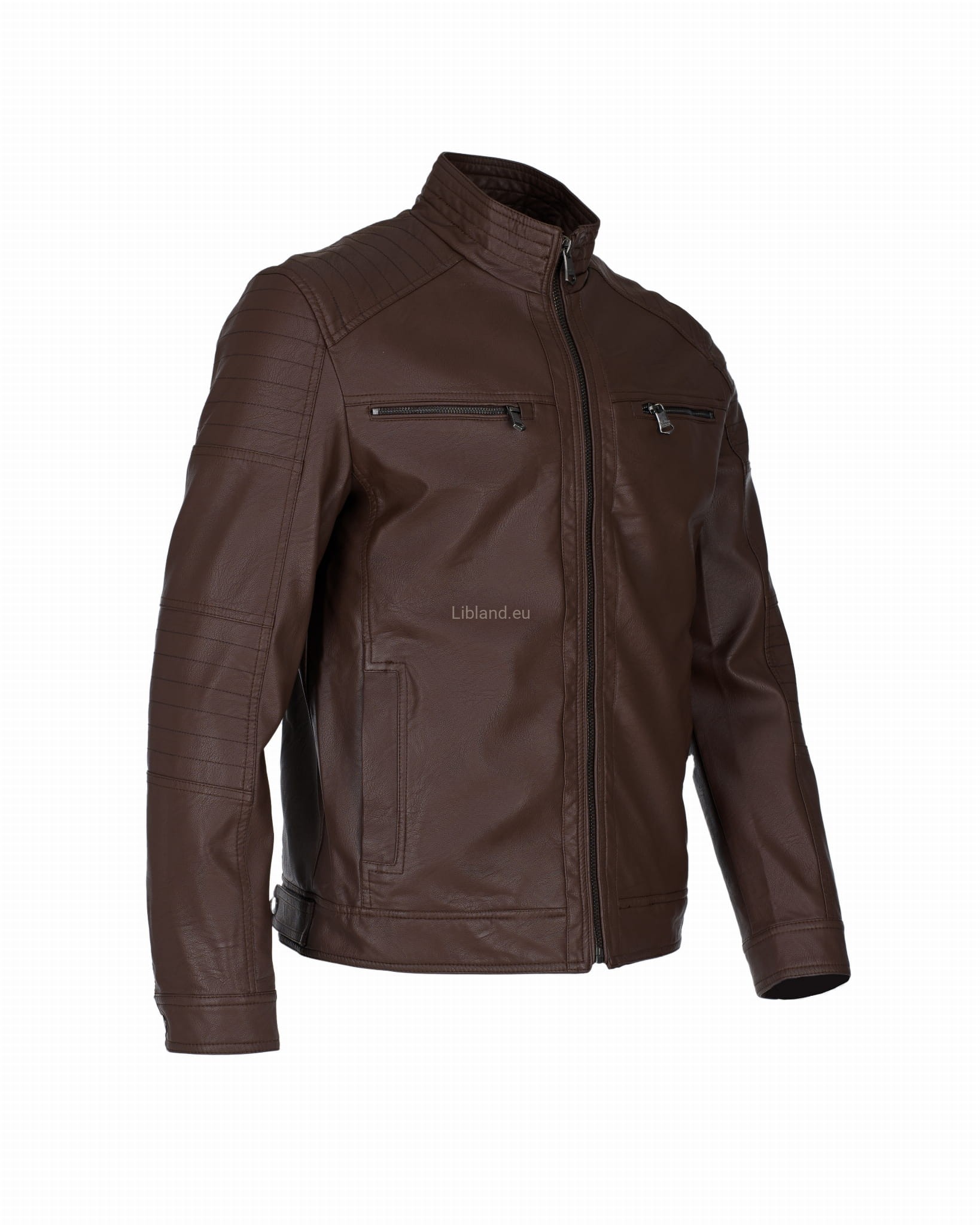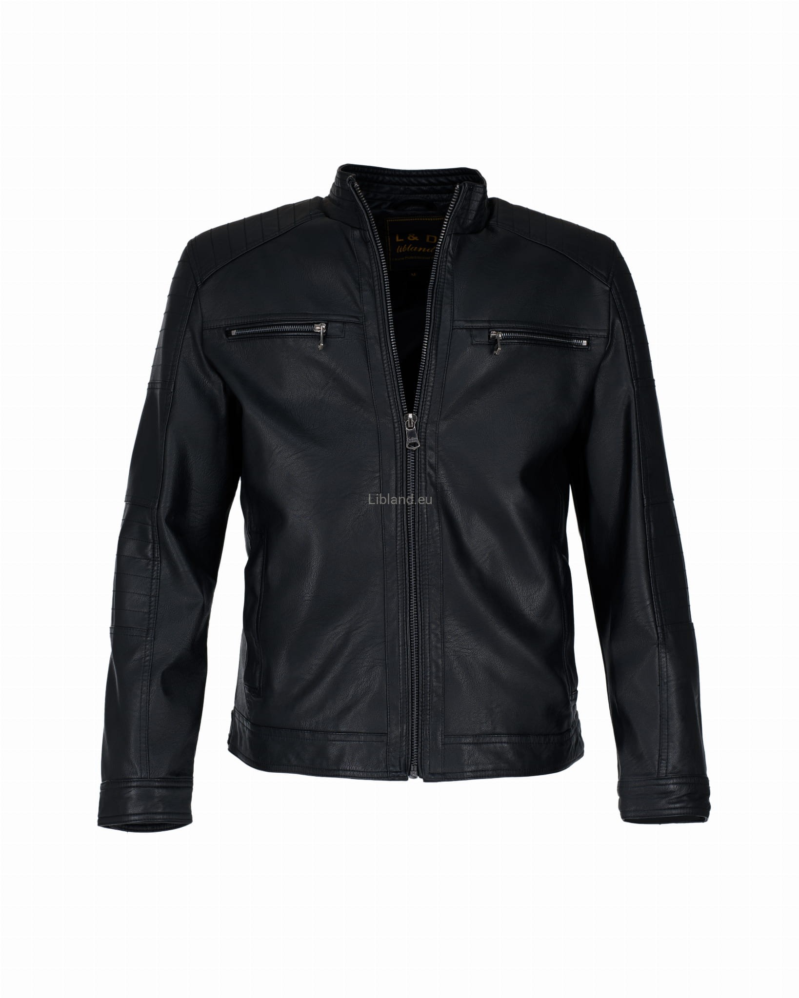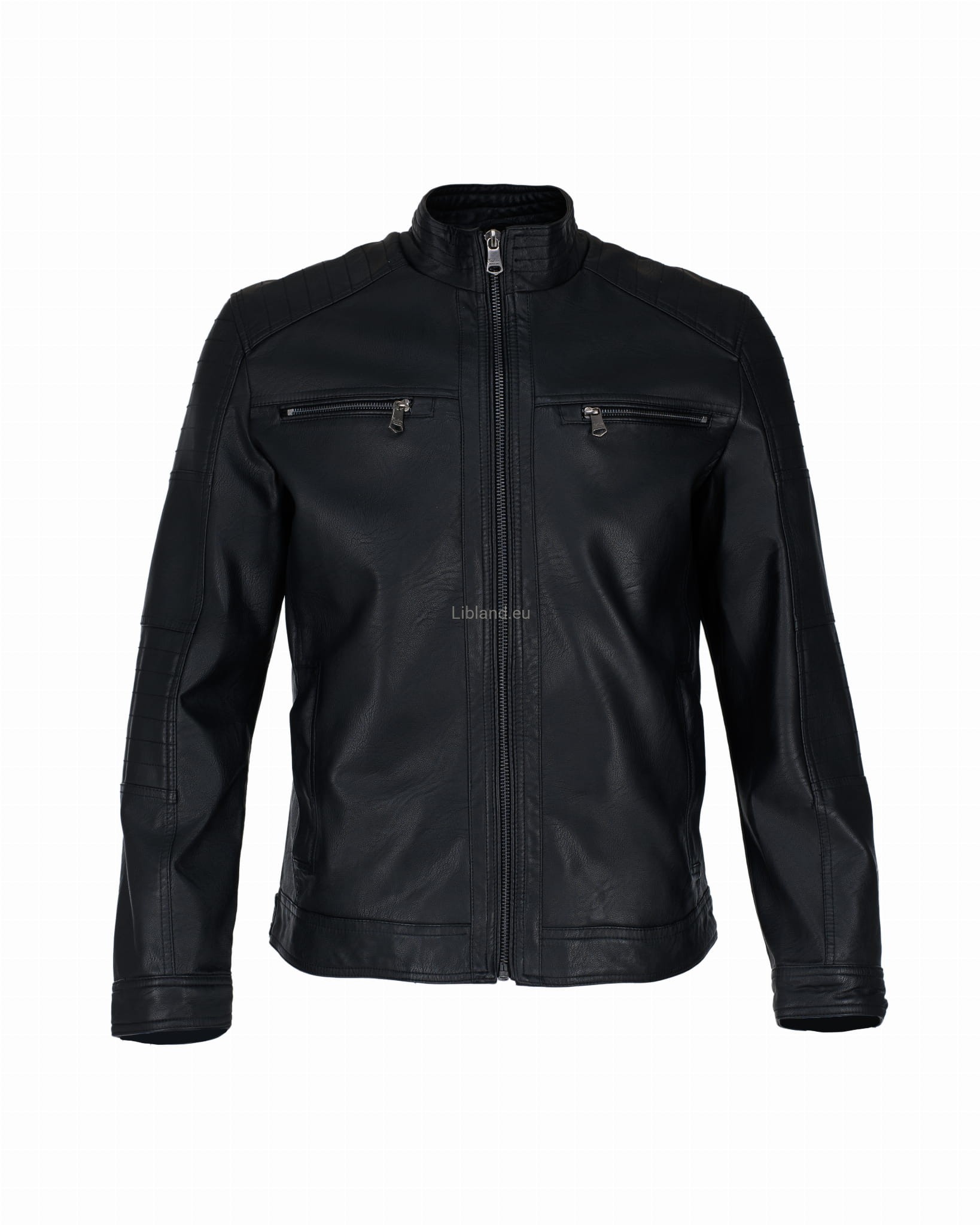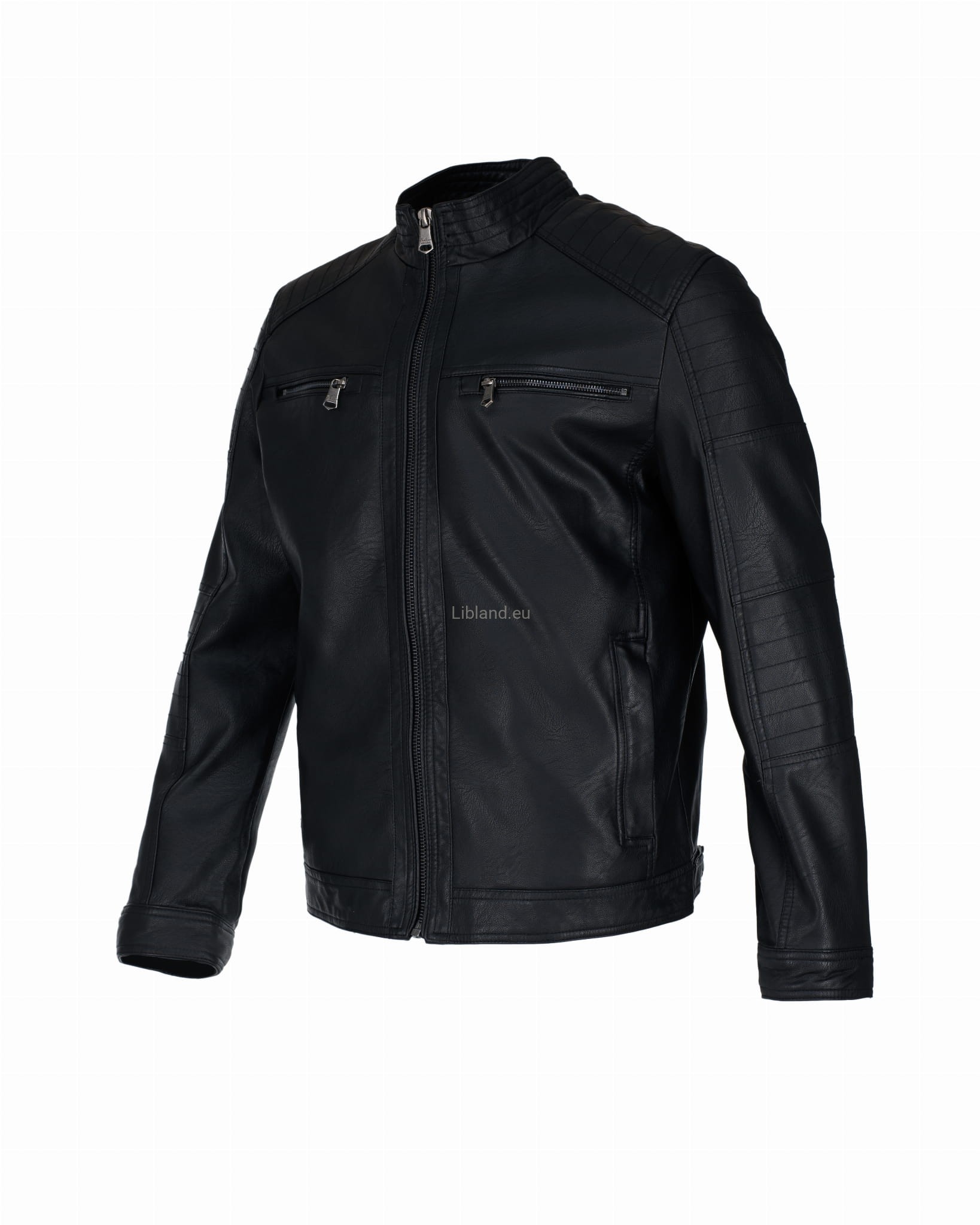 Męska kurtka z ekologicznej skóry ze stójką z czterema kieszeniami na suwaki i kieszeniami wewnętrznym.