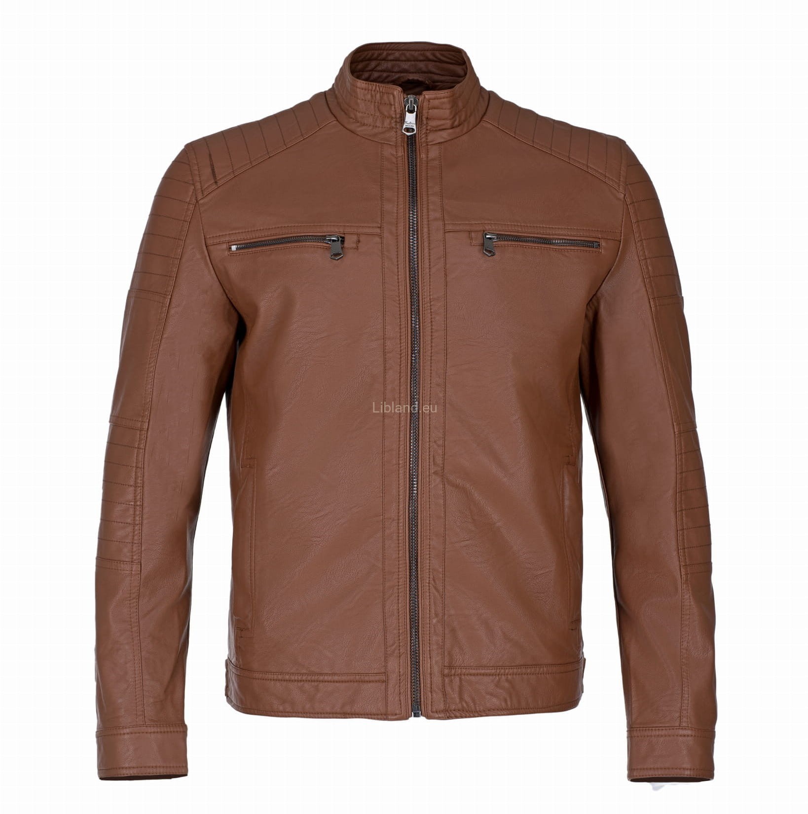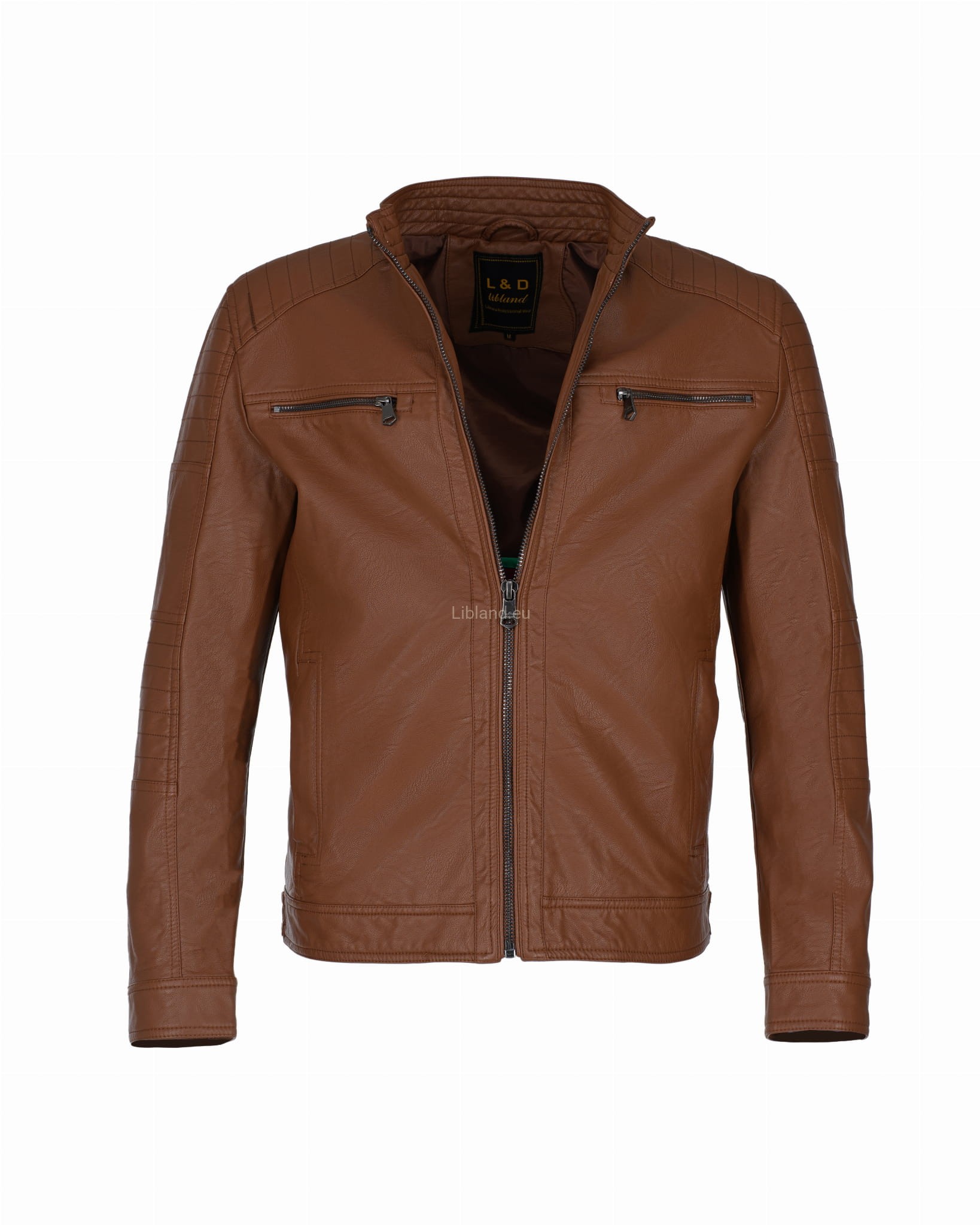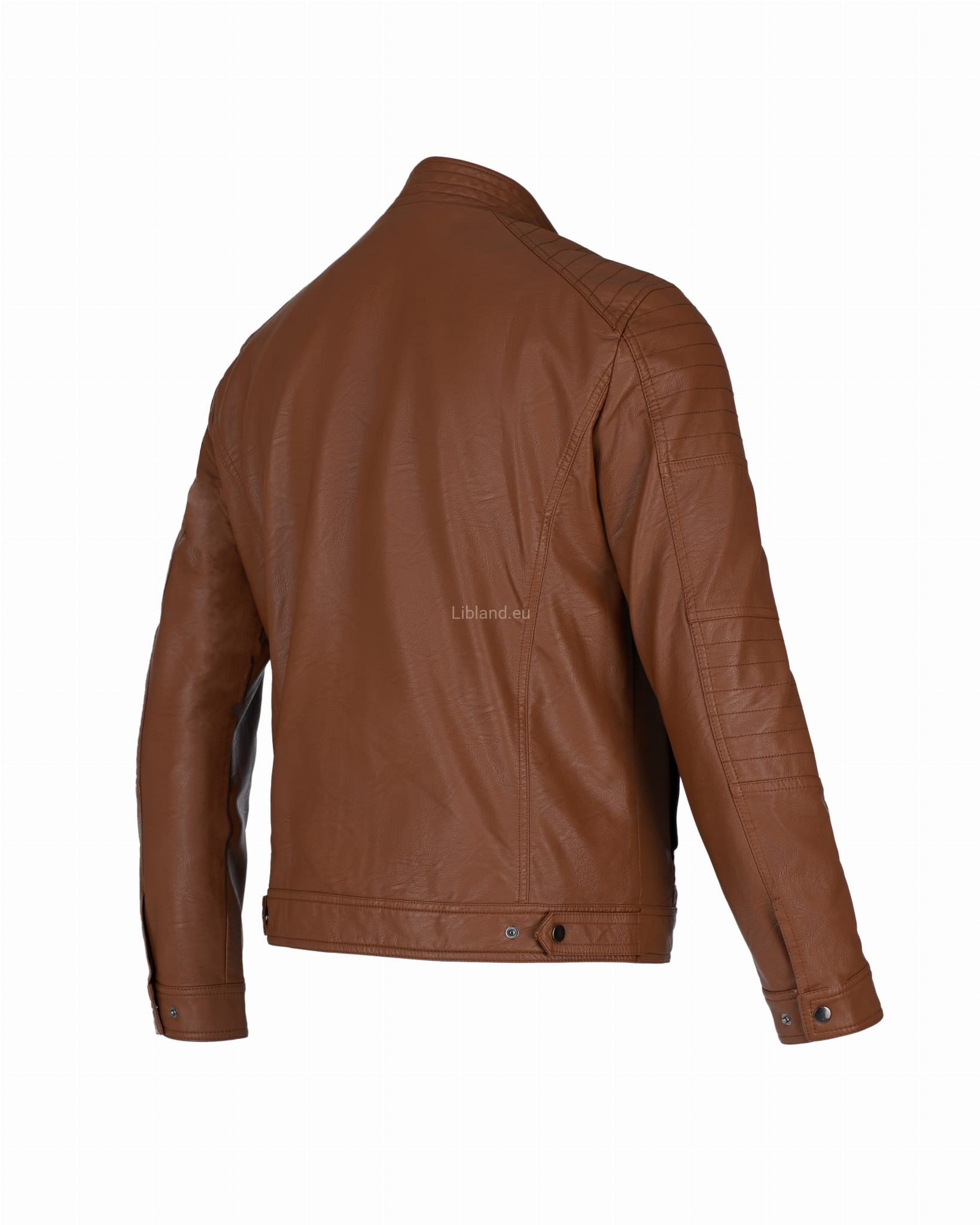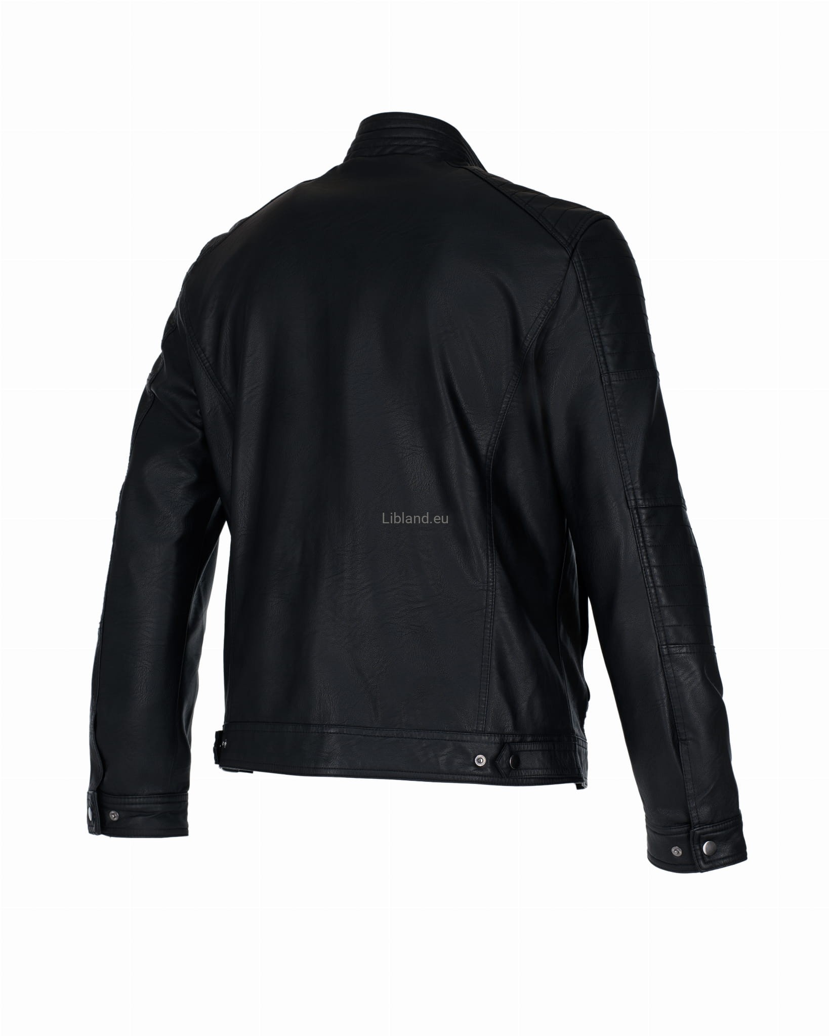 Męska kurtka z ekologicznej skóry ze stójką z czterema kieszeniami na suwaki i kieszeniami wewnętrznym.