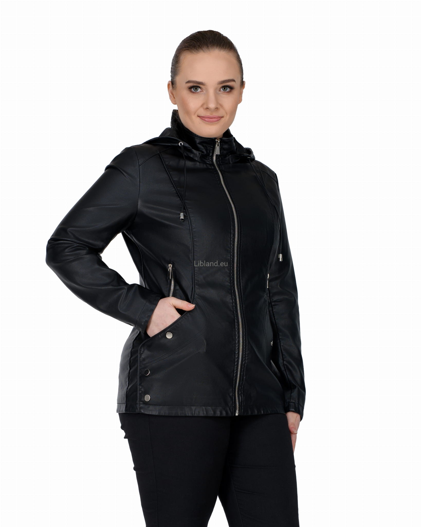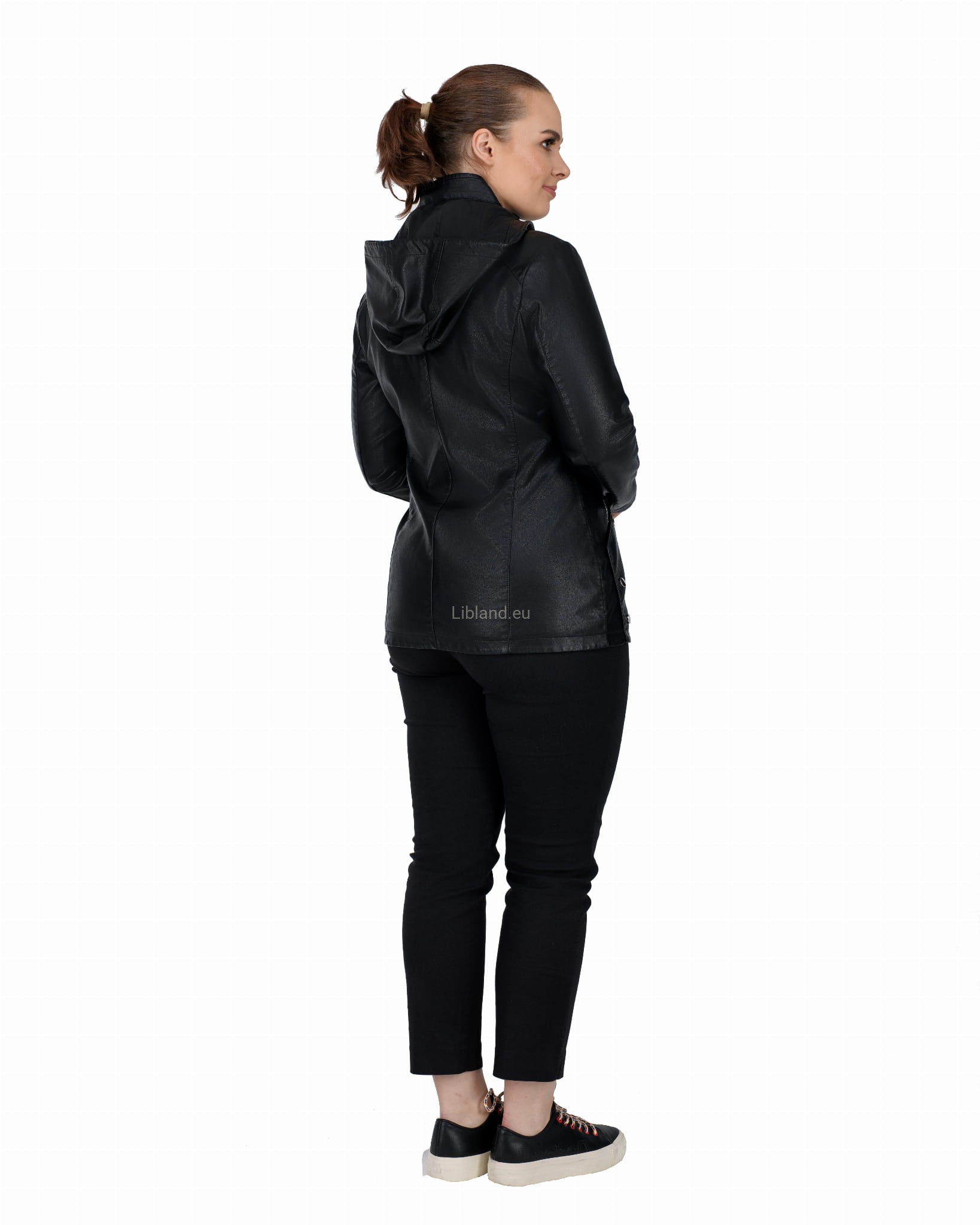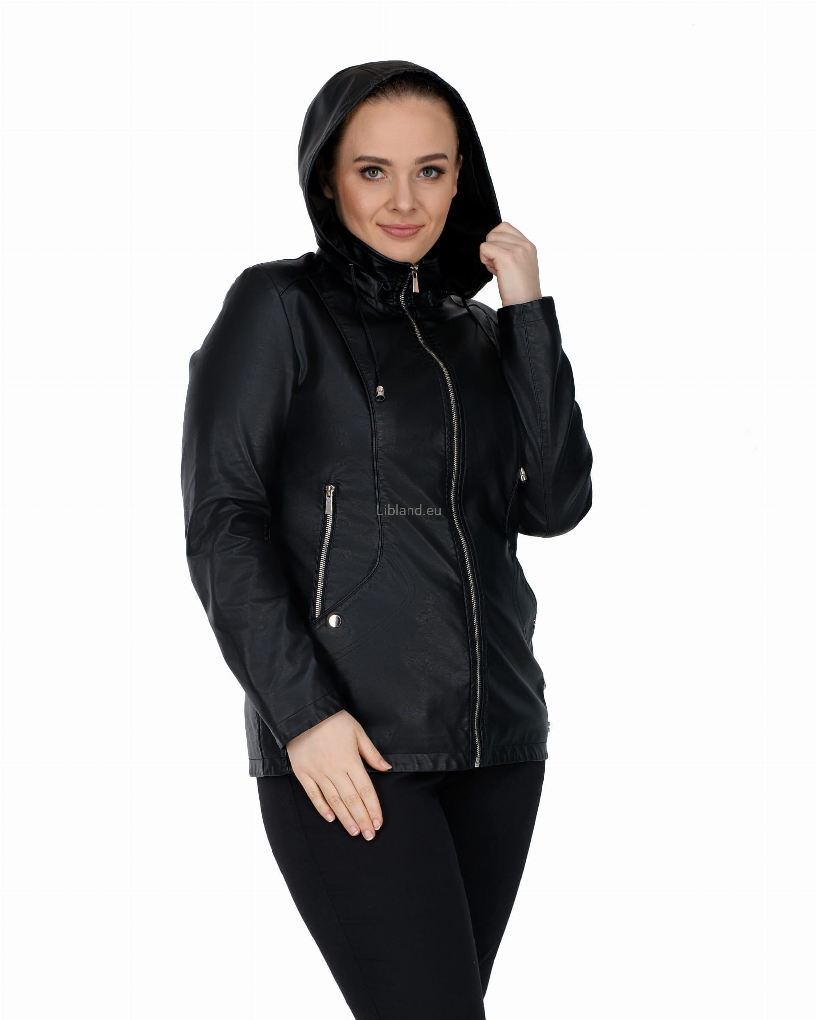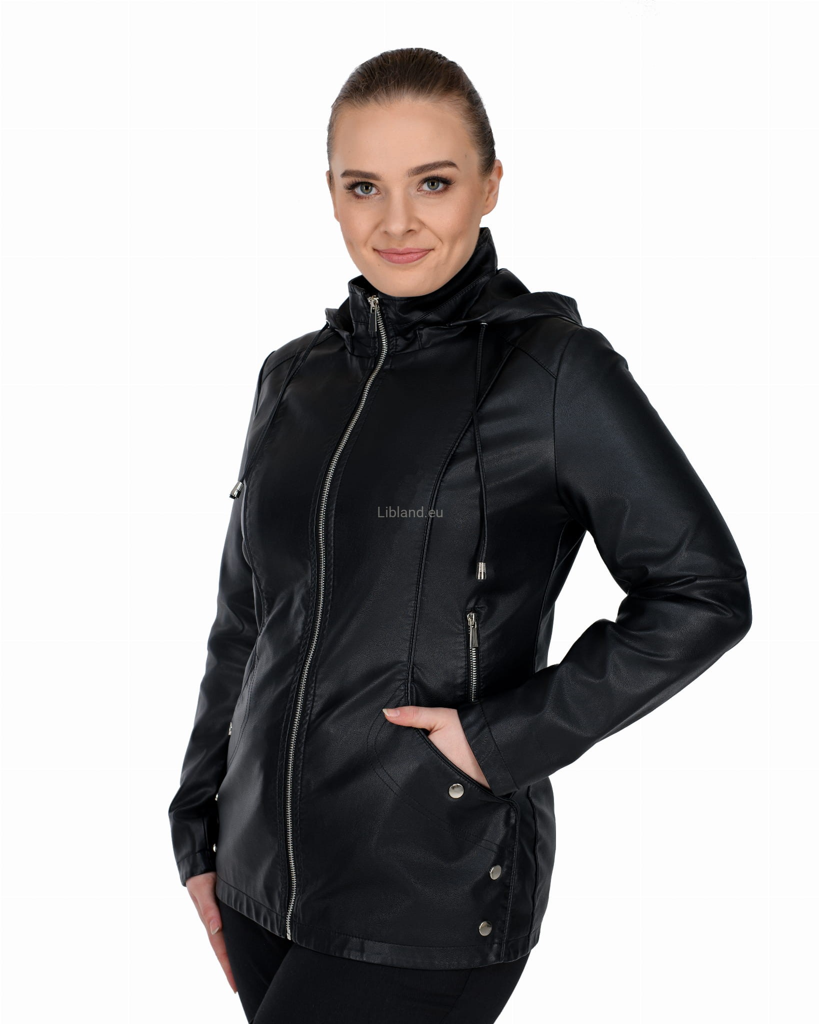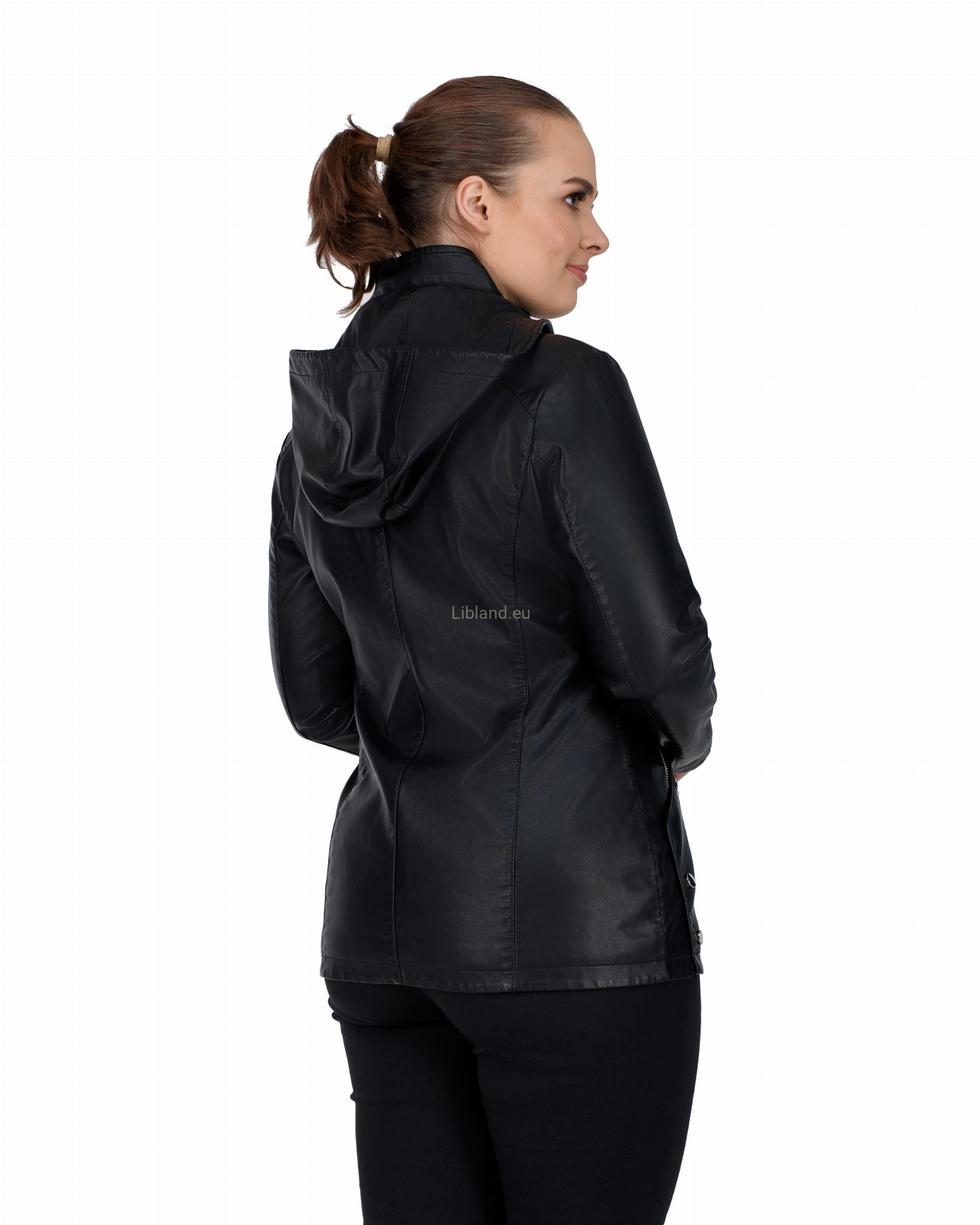 Krótki płaszcz z ekoskóry z odpinanym kapturem i kieszeniami ozdobionymi błyszczącymi napami.