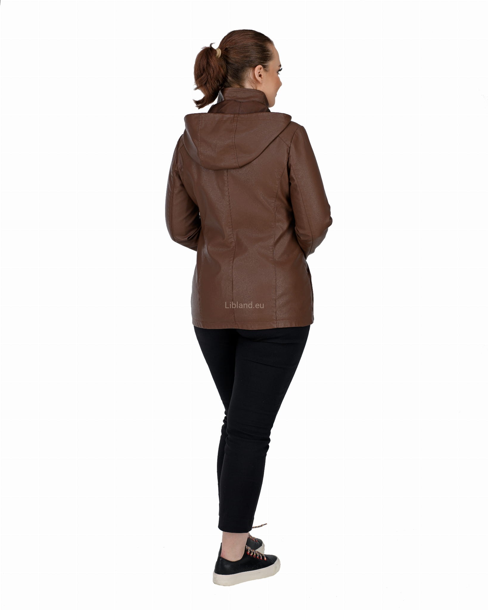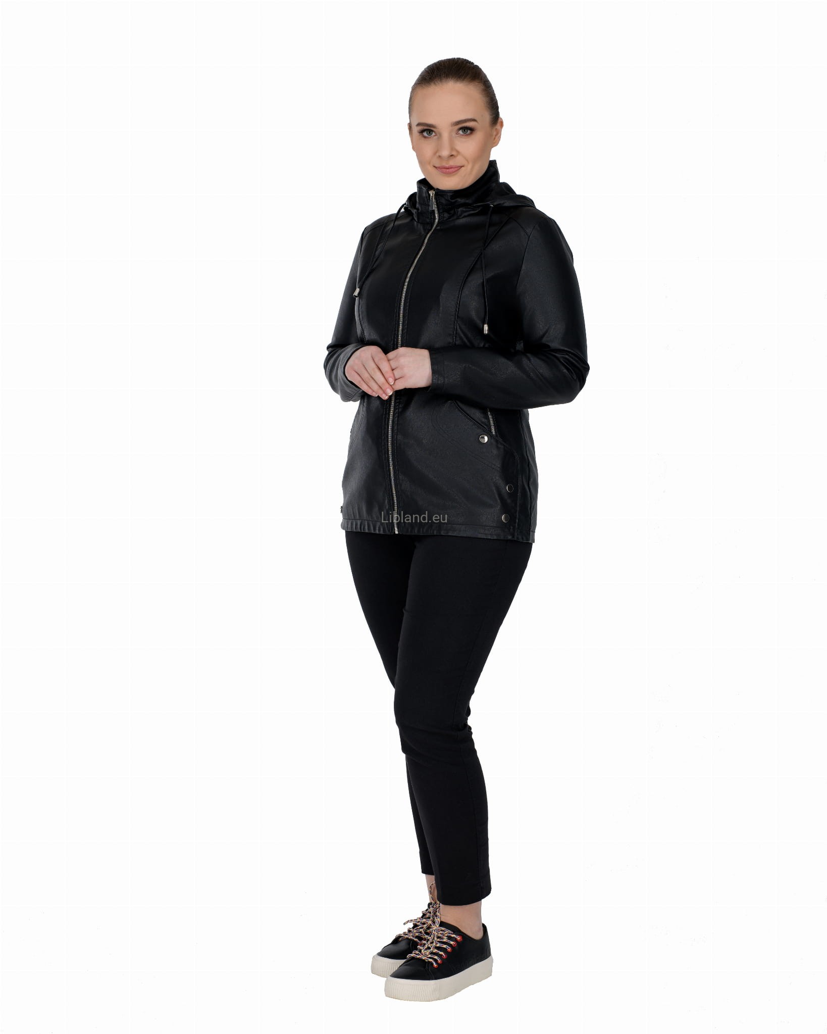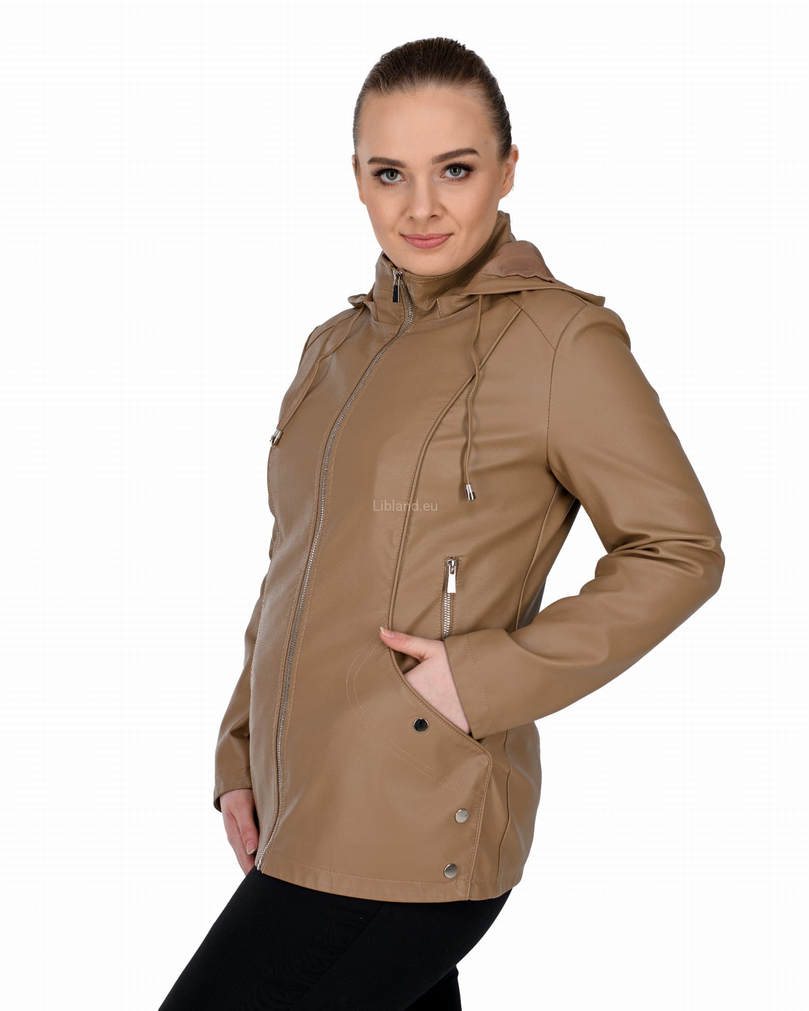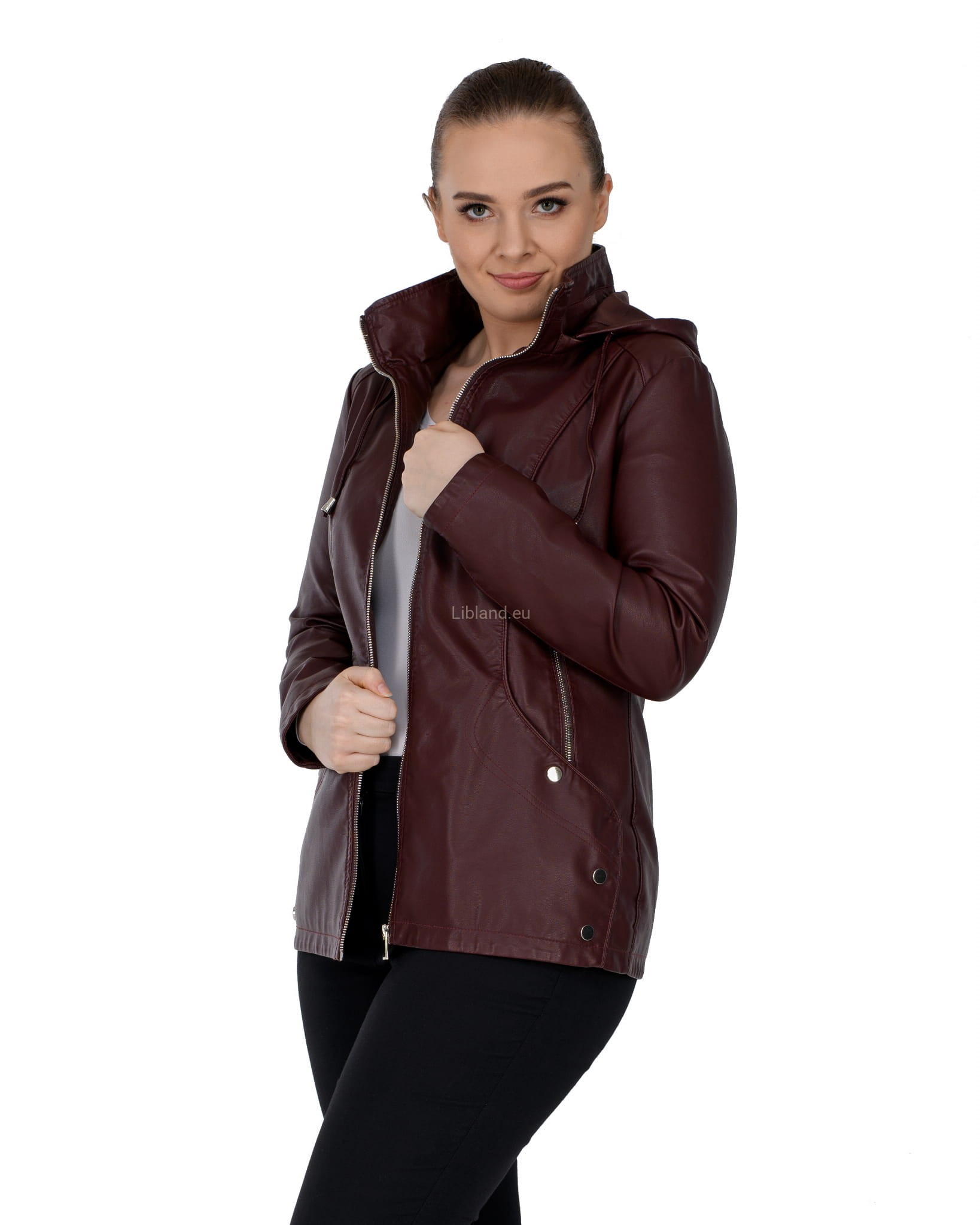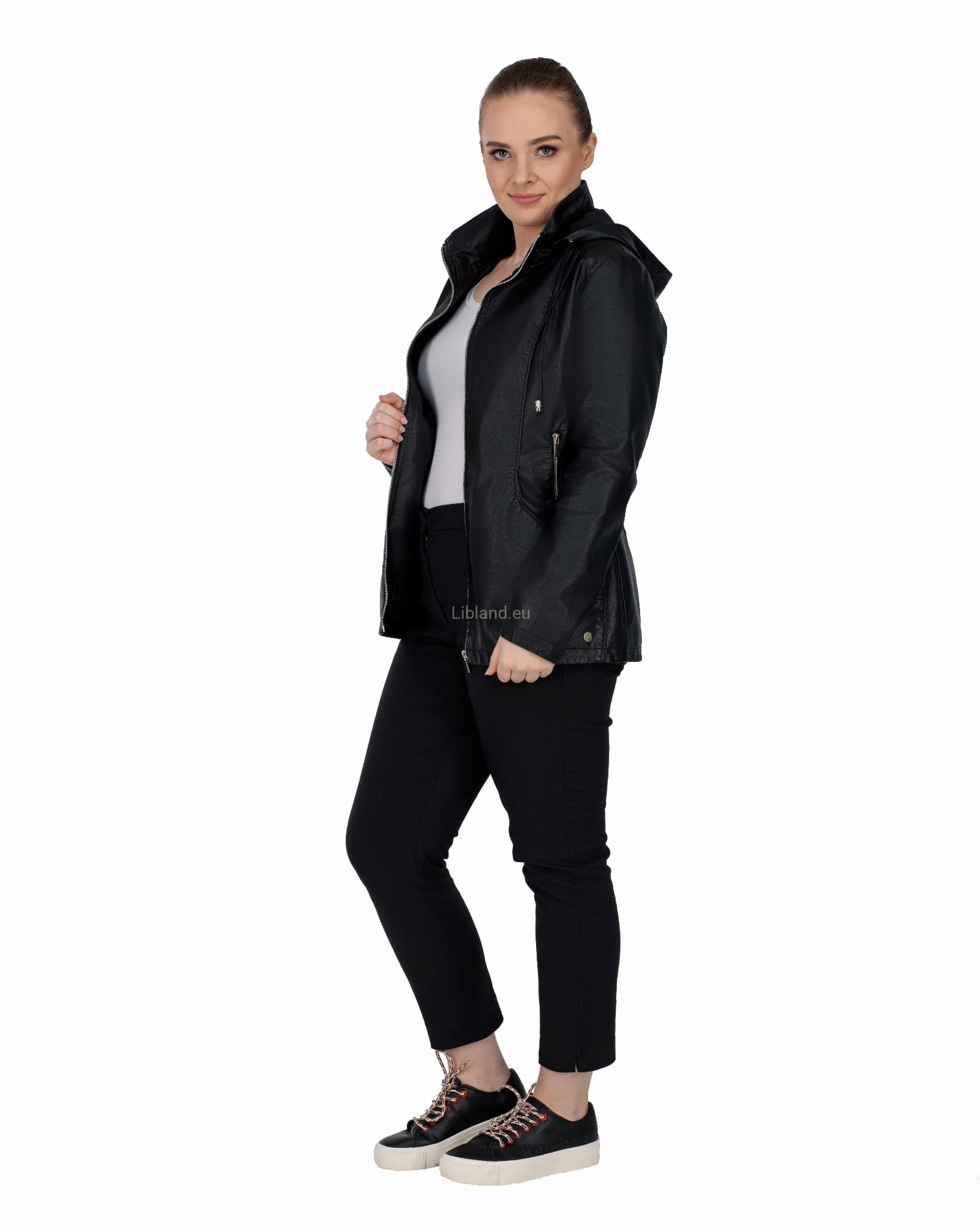 Krótki płaszcz z ekoskóry z odpinanym kapturem i kieszeniami ozdobionymi błyszczącymi napami.
