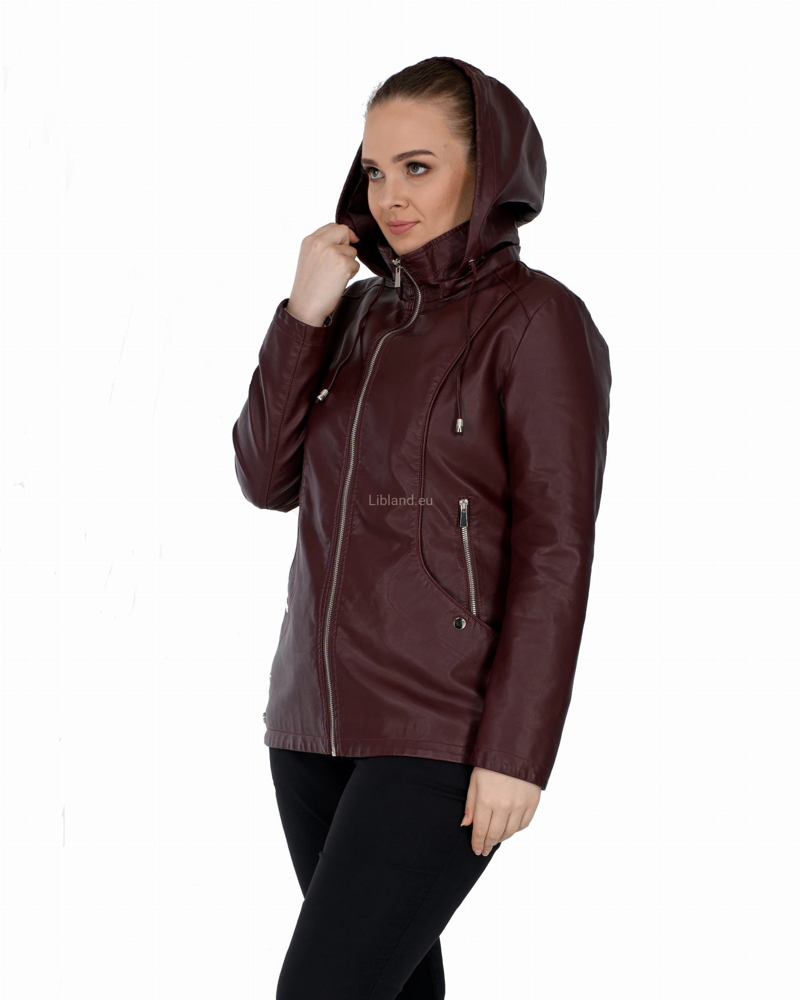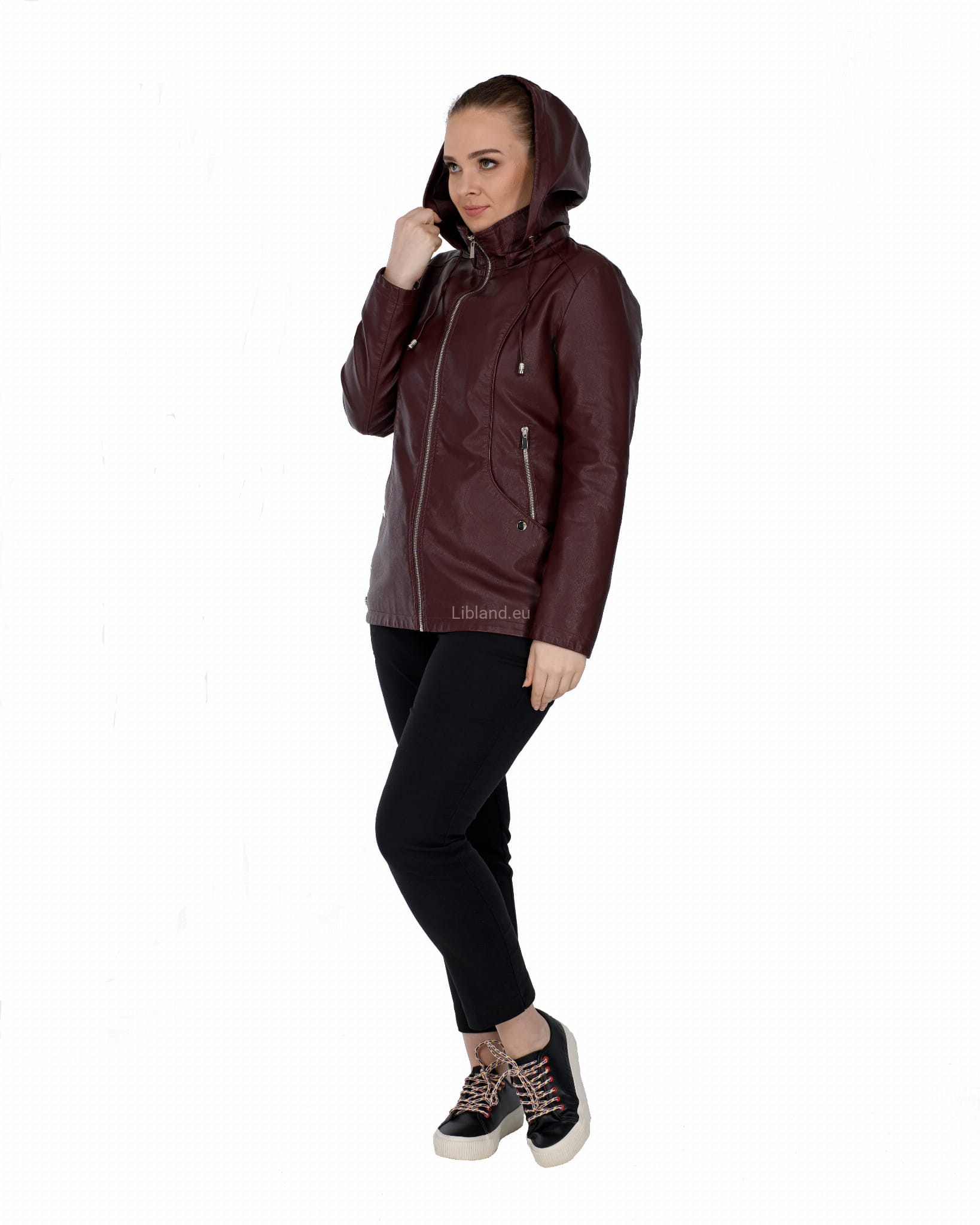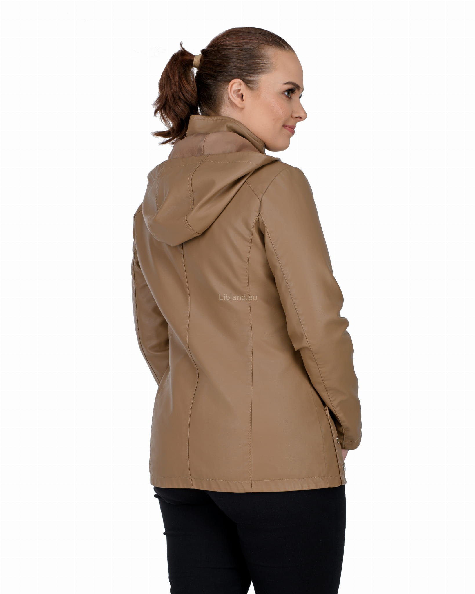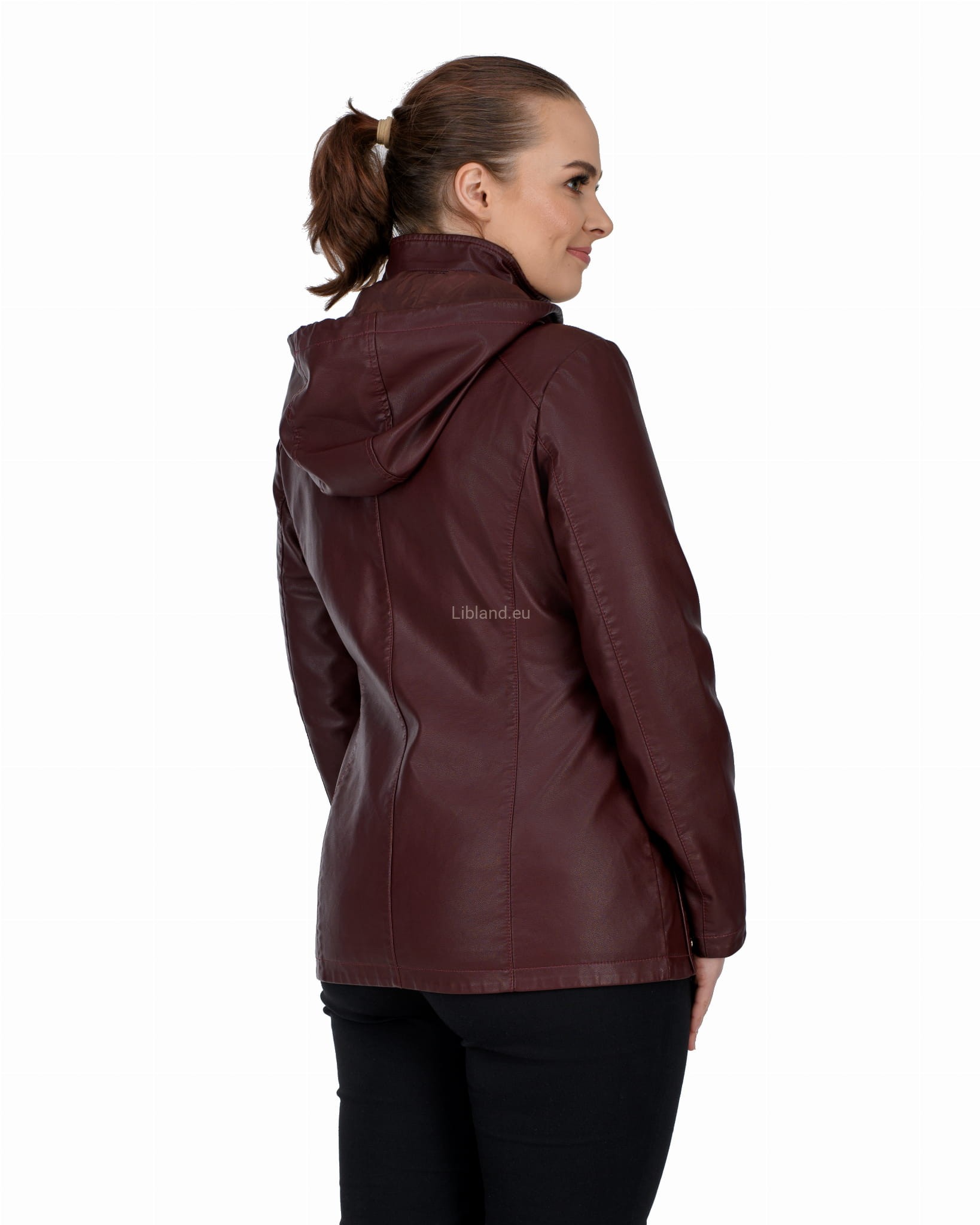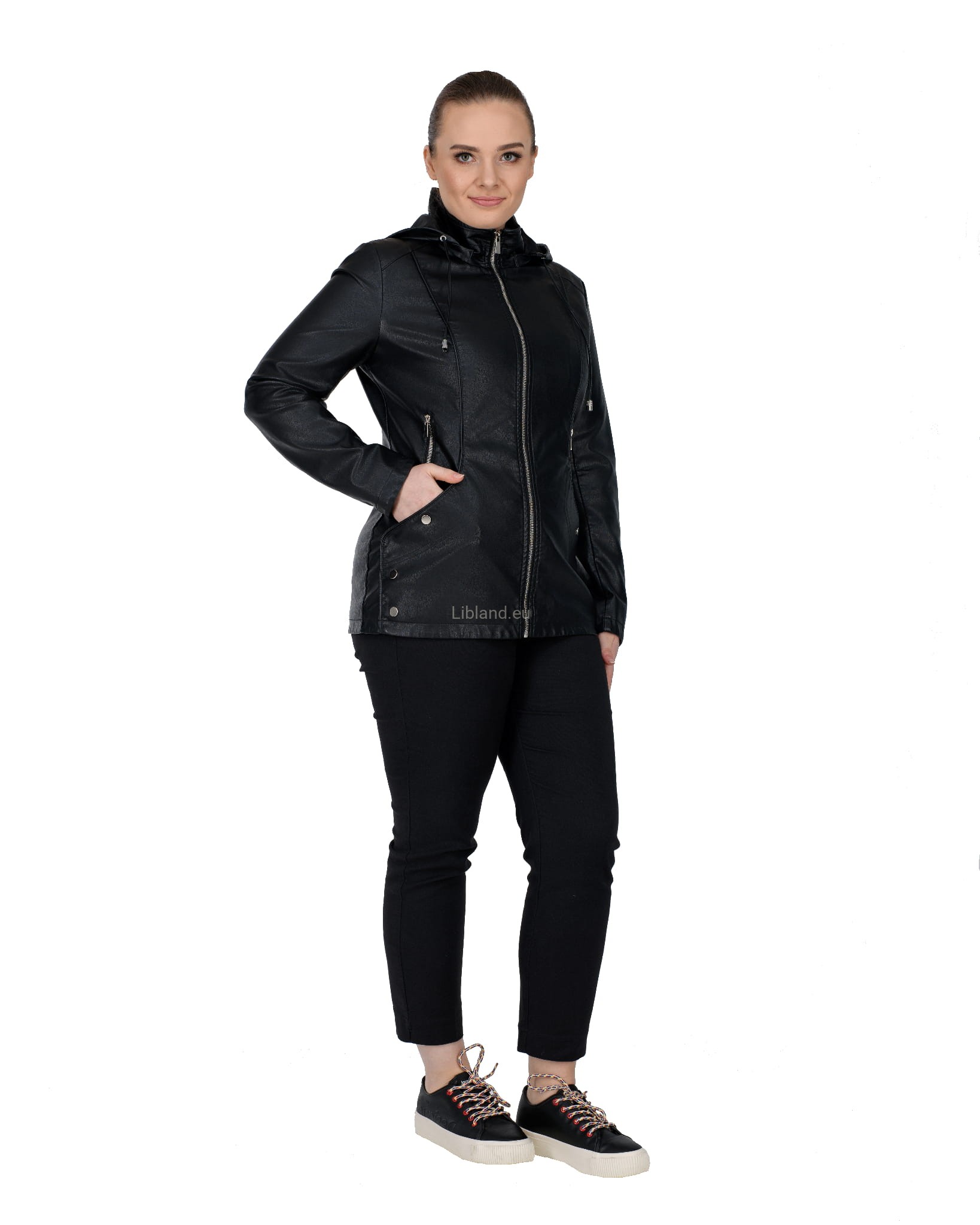 Krótki płaszcz z ekoskóry z odpinanym kapturem i kieszeniami ozdobionymi błyszczącymi napami.