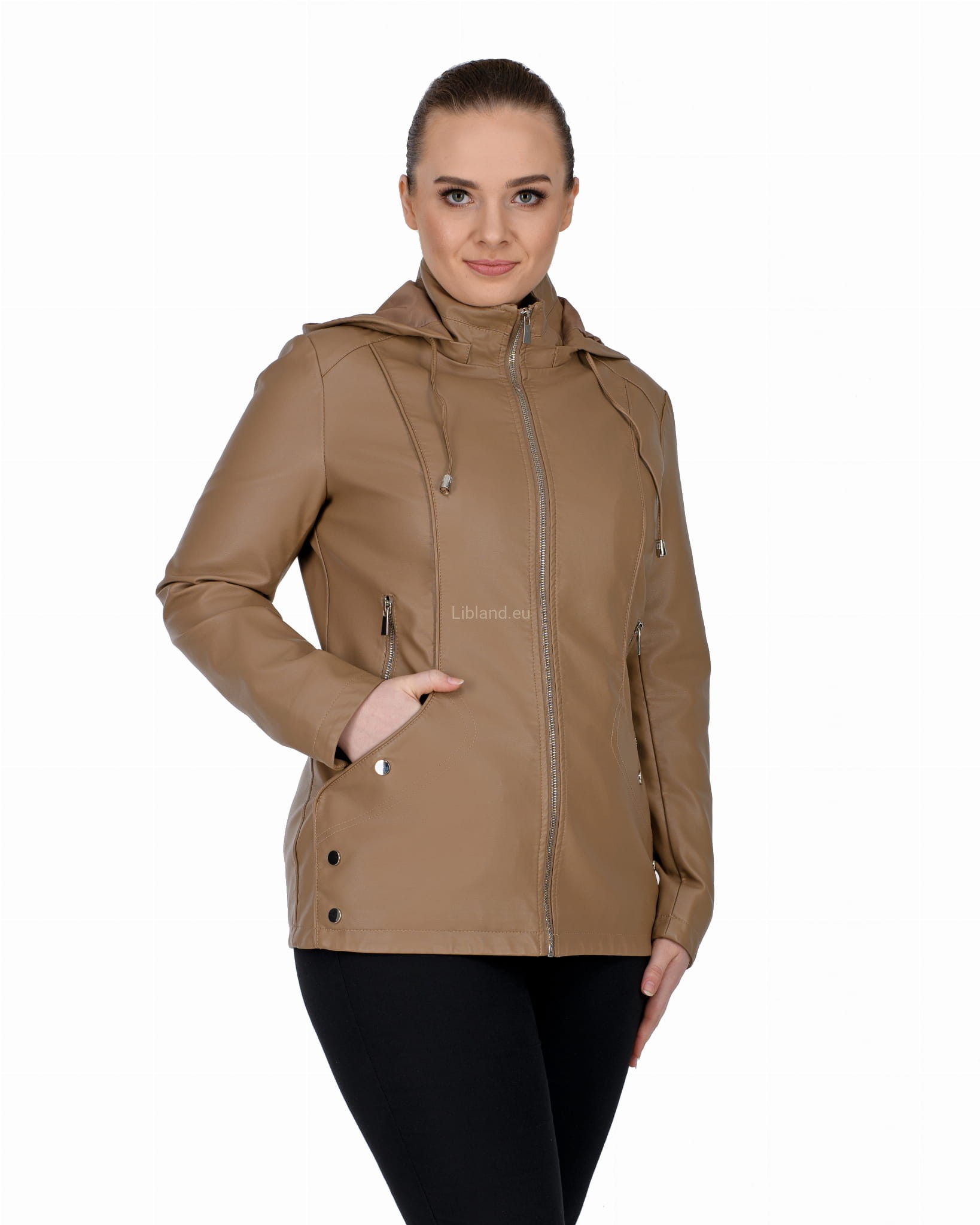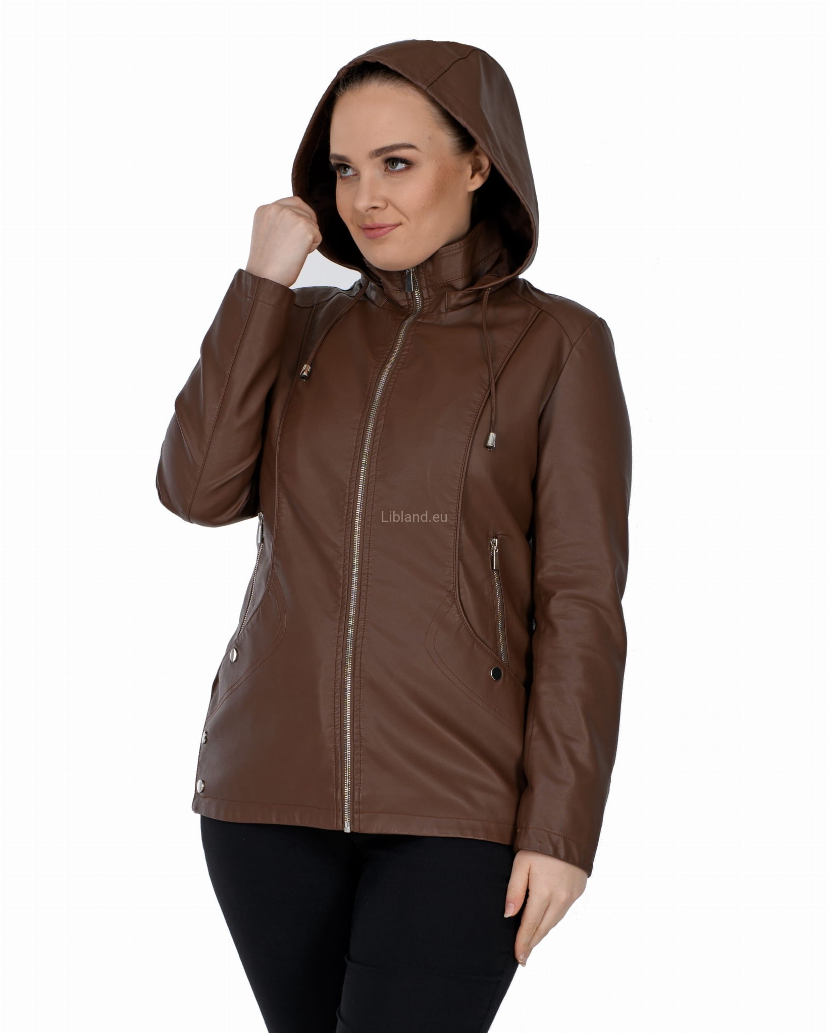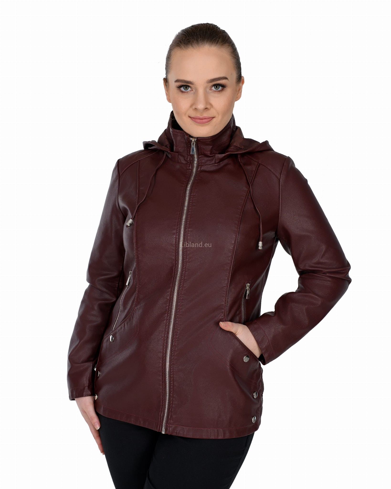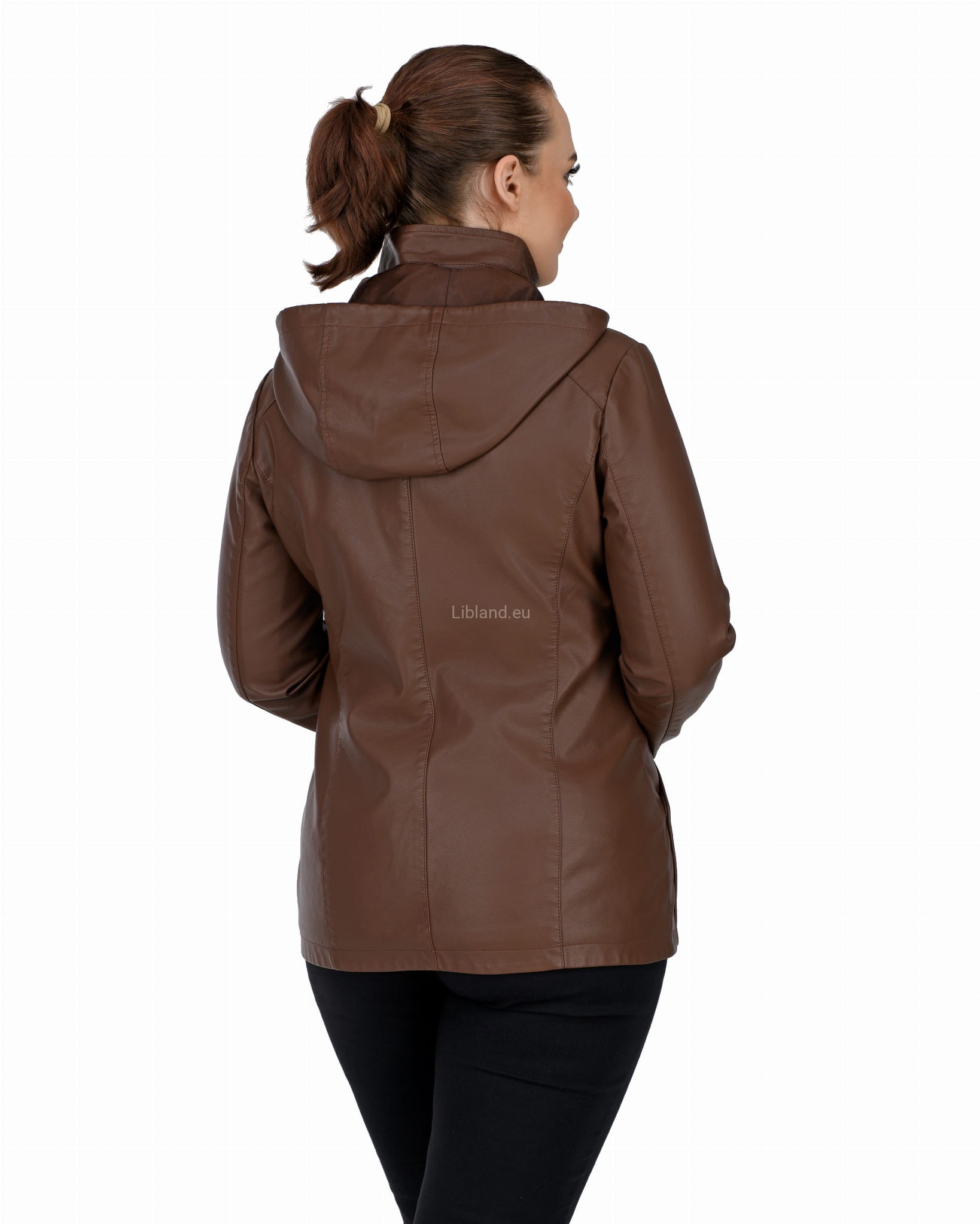 Krótki płaszcz z ekoskóry z odpinanym kapturem i kieszeniami ozdobionymi błyszczącymi napami.