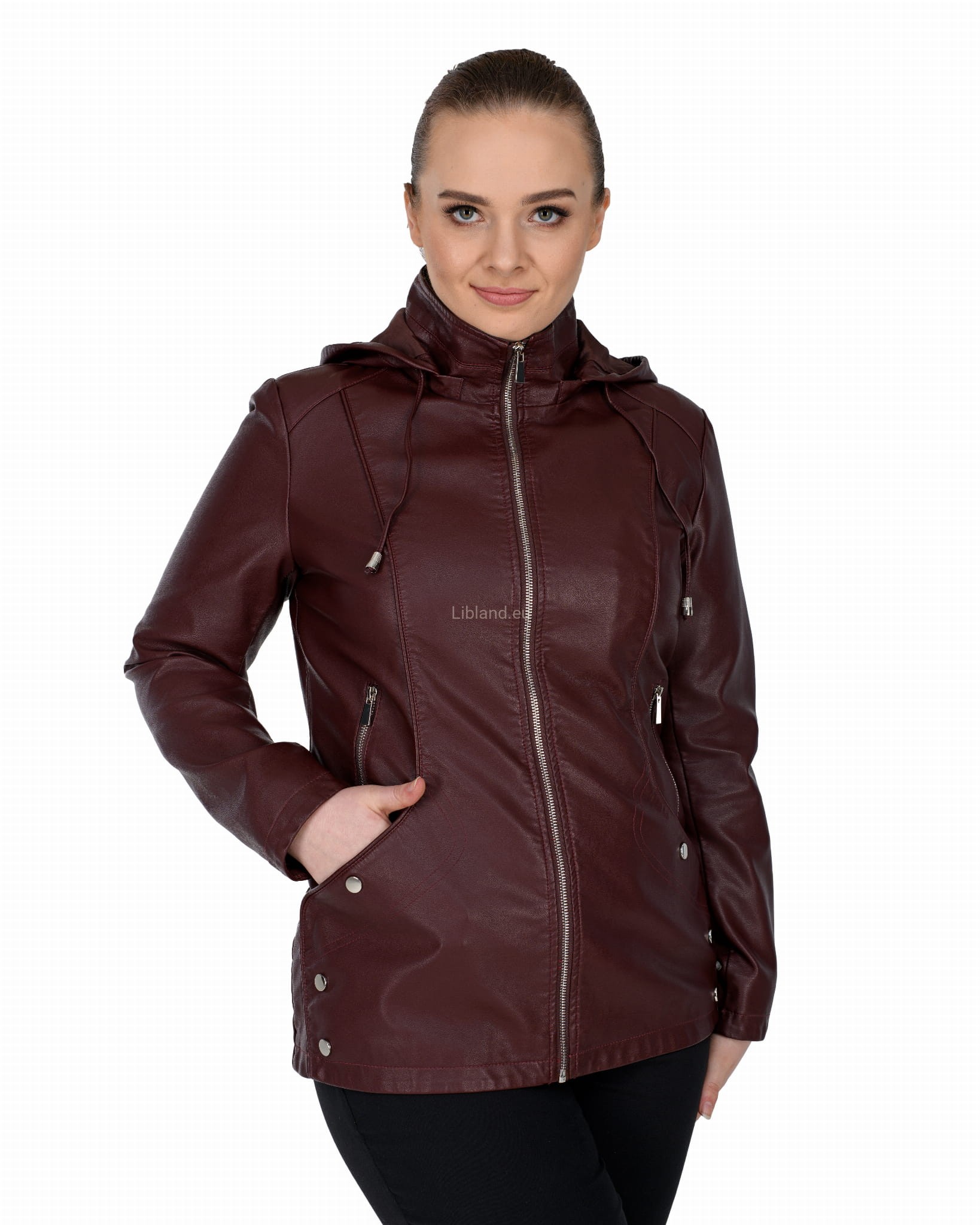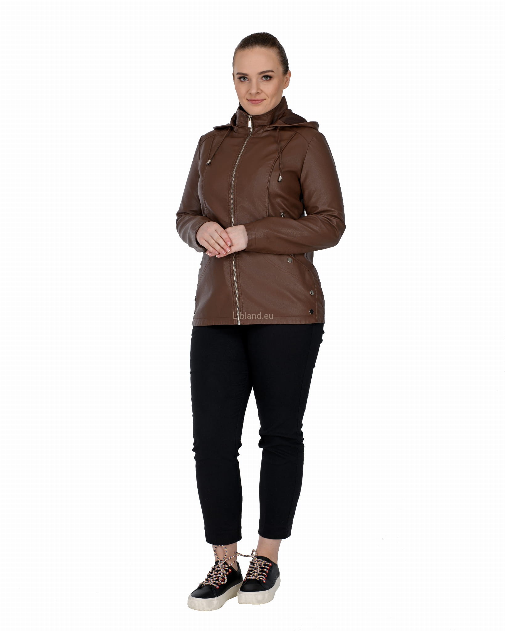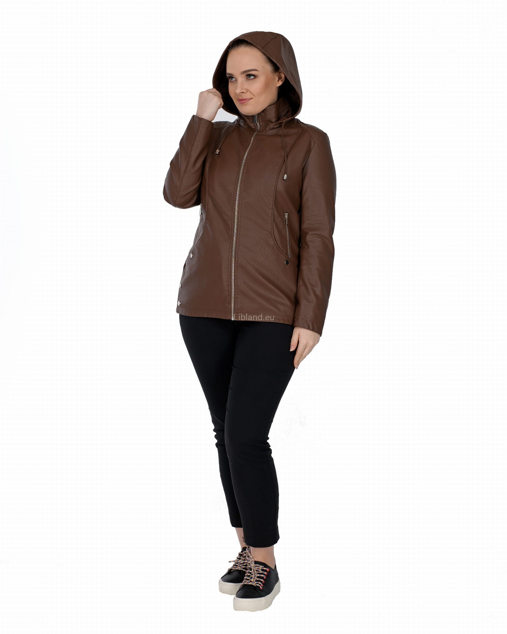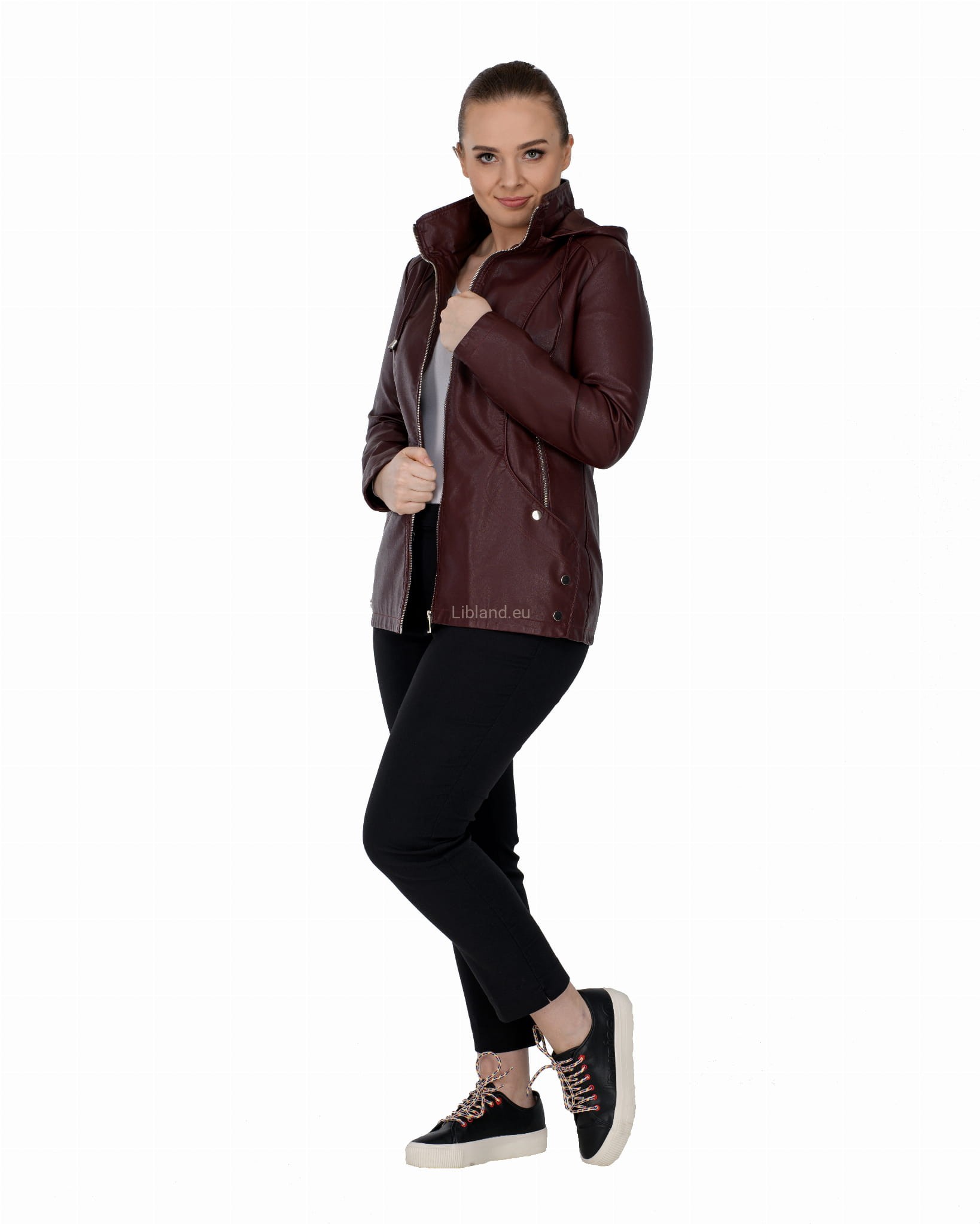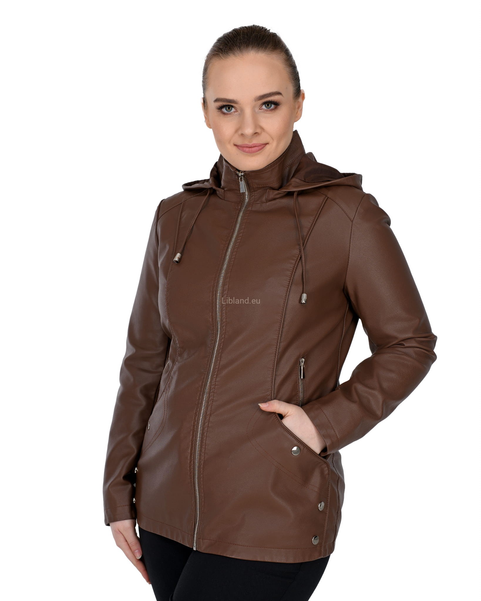 Krótki płaszcz z ekoskóry z odpinanym kapturem i kieszeniami ozdobionymi błyszczącymi napami.