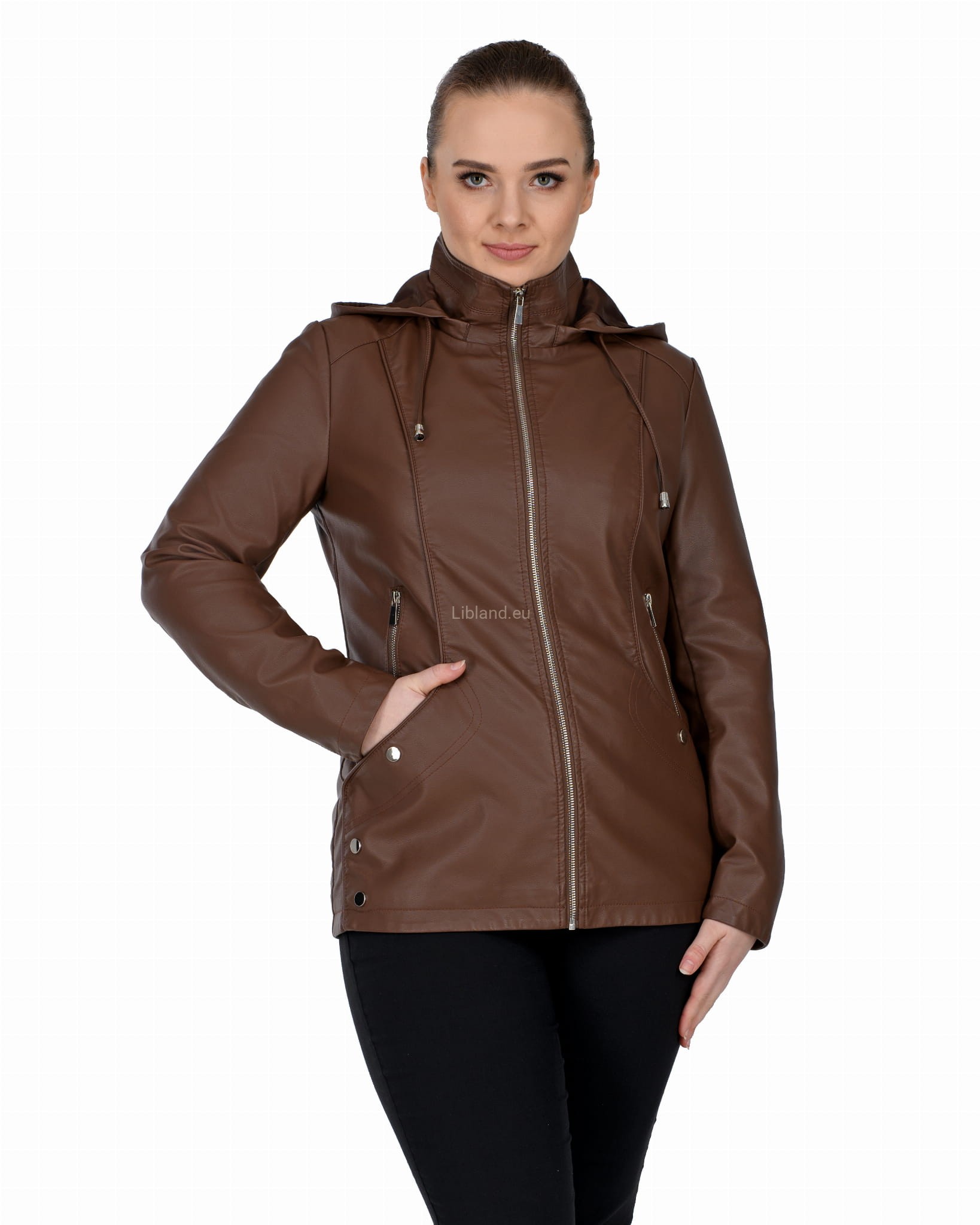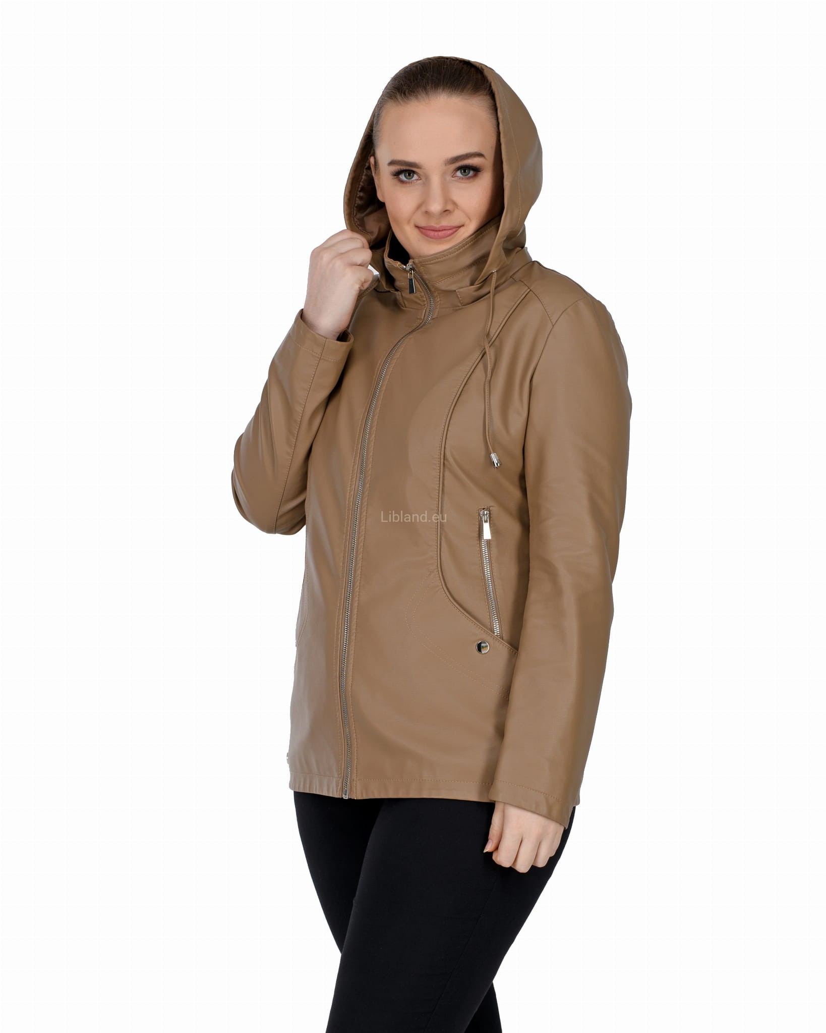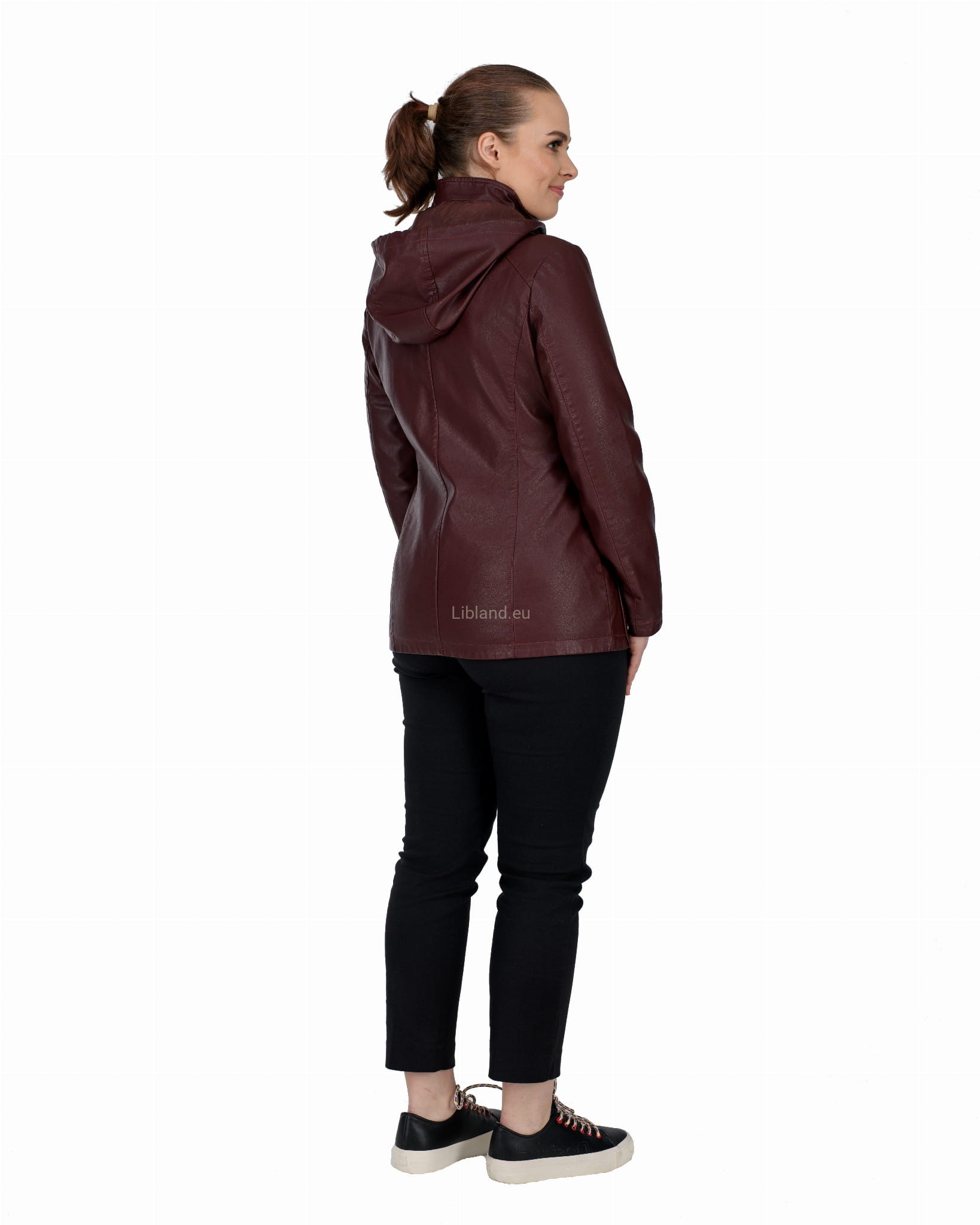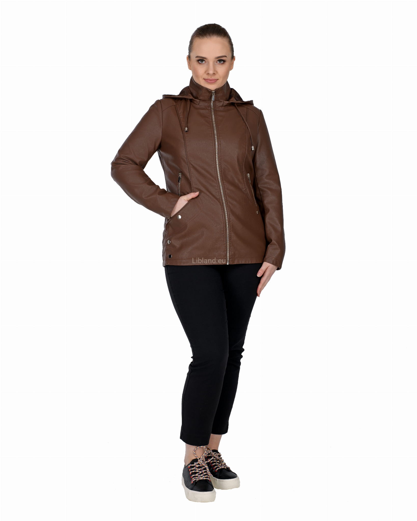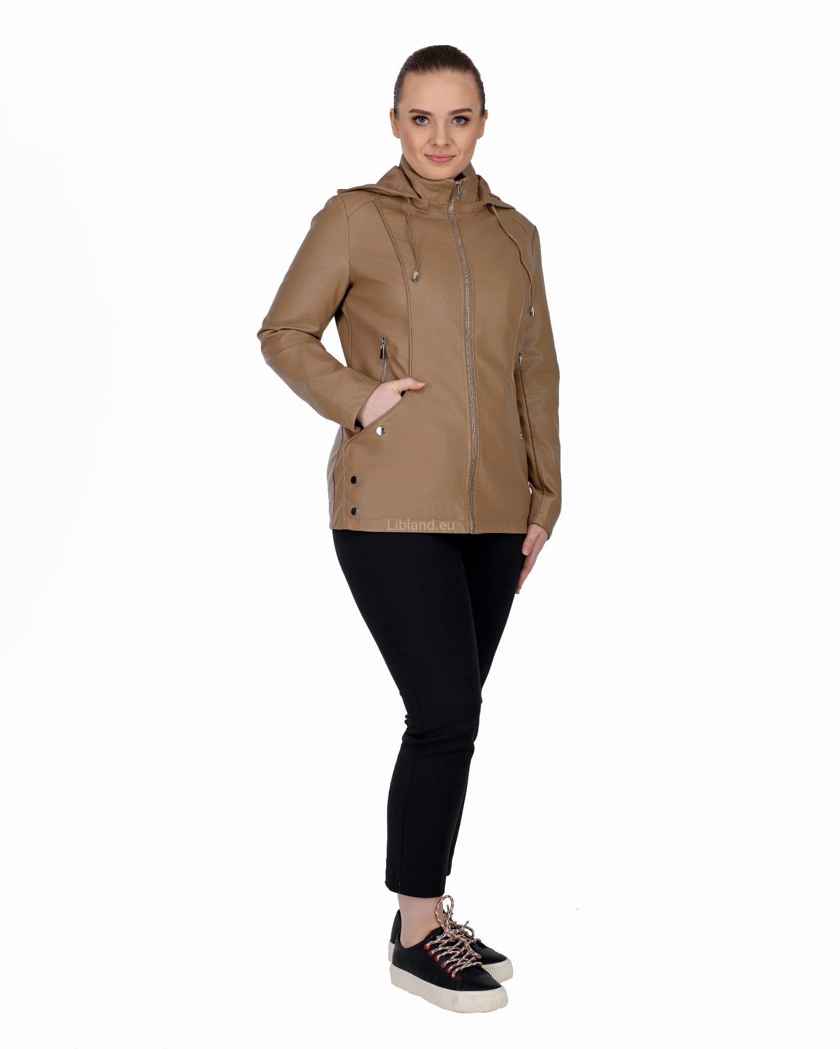 Krótki płaszcz z ekoskóry z odpinanym kapturem i kieszeniami ozdobionymi błyszczącymi napami.
