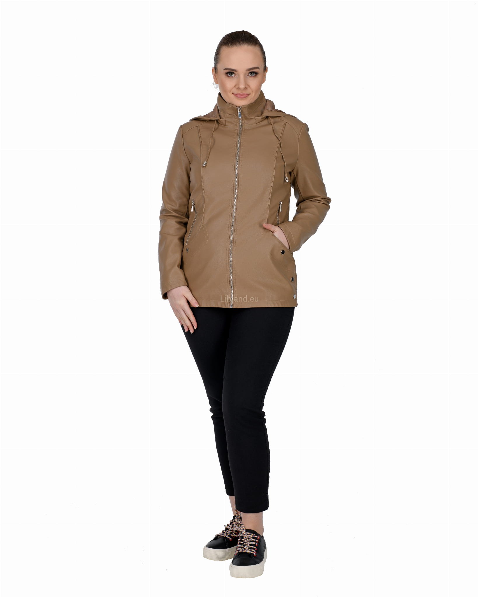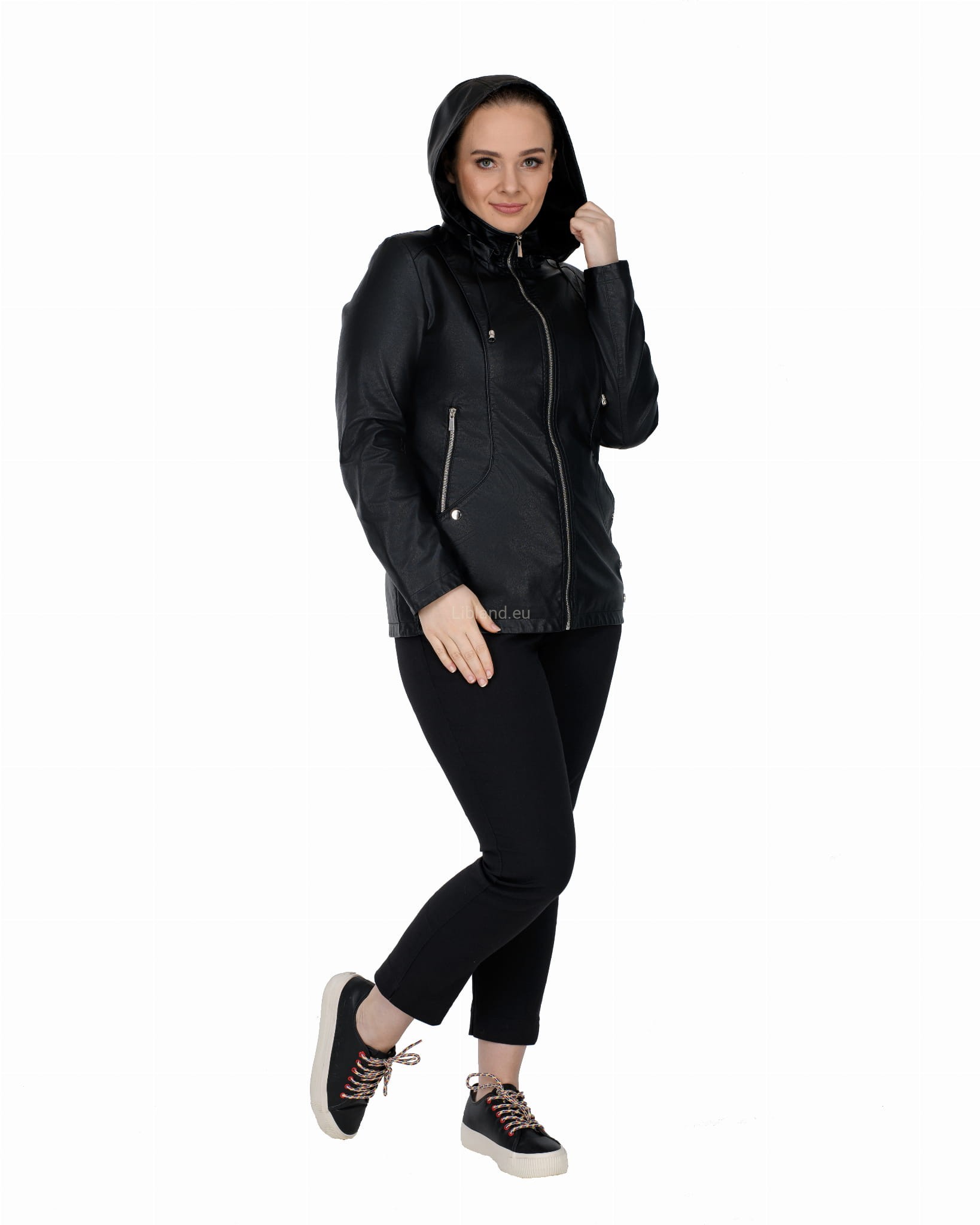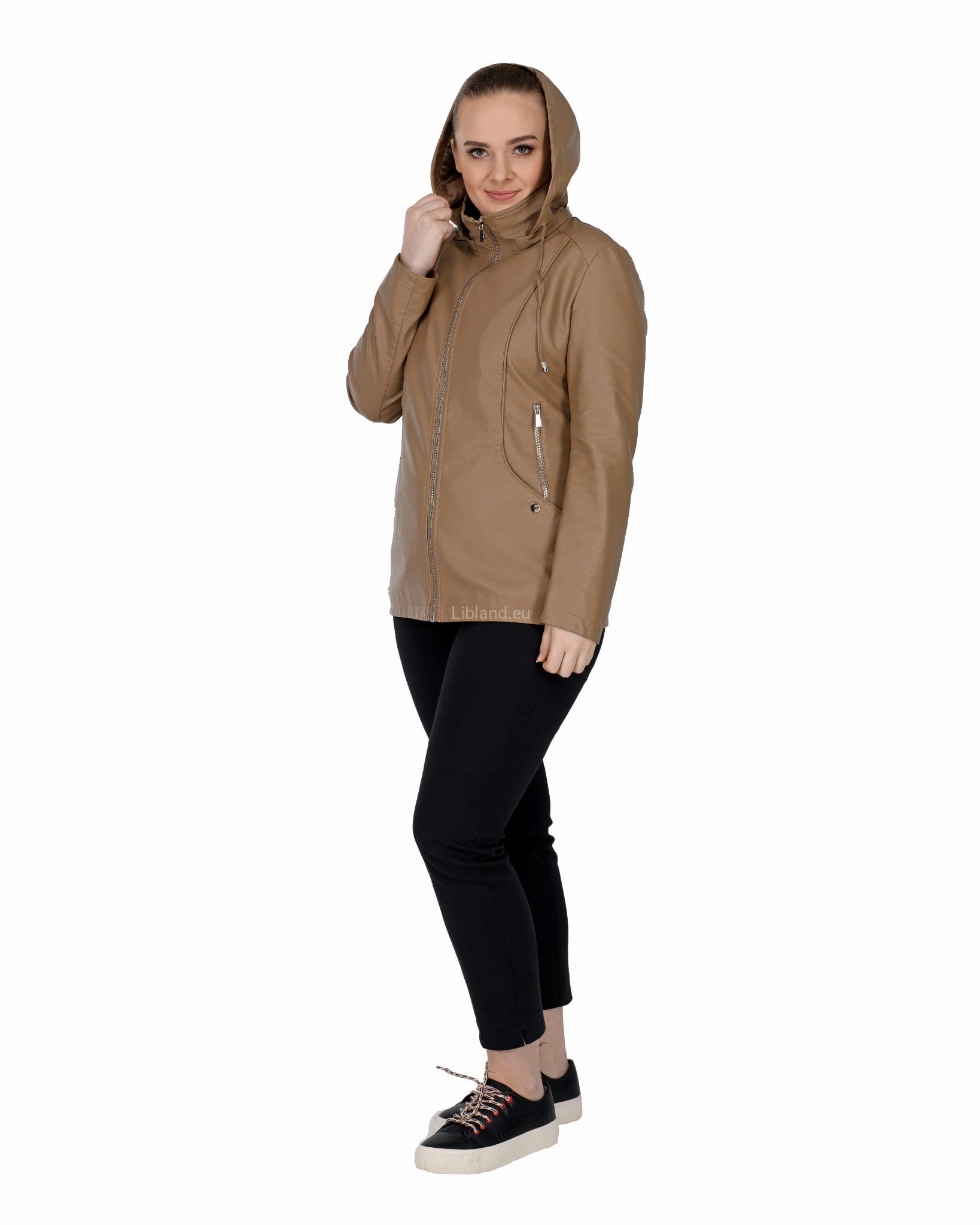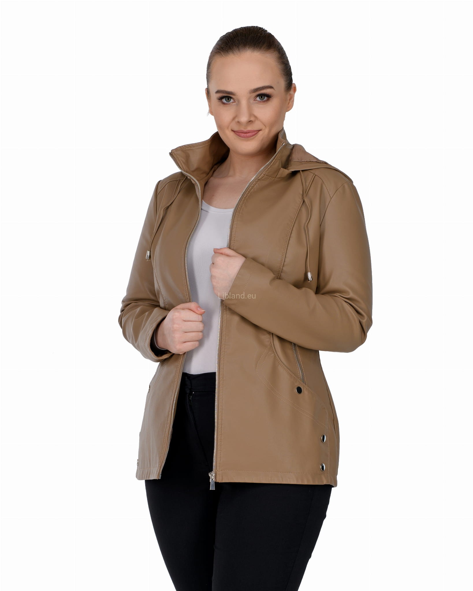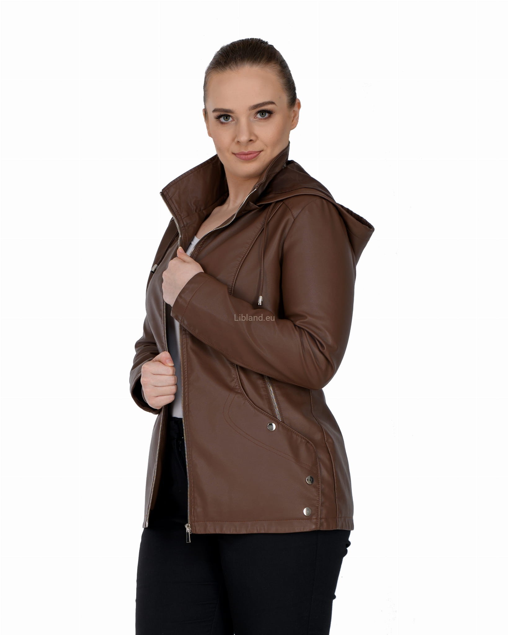 Krótki płaszcz z ekoskóry z odpinanym kapturem i kieszeniami ozdobionymi błyszczącymi napami.