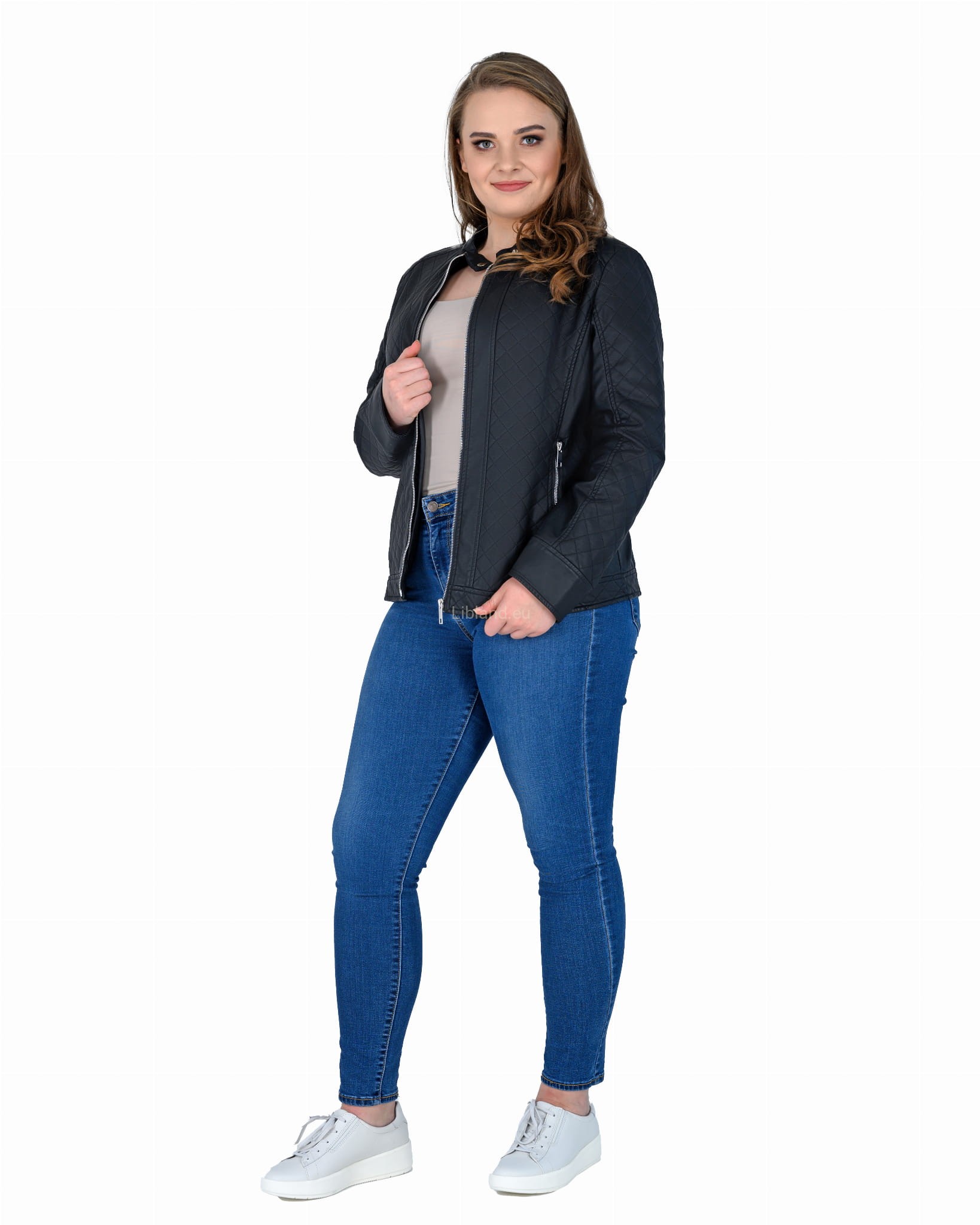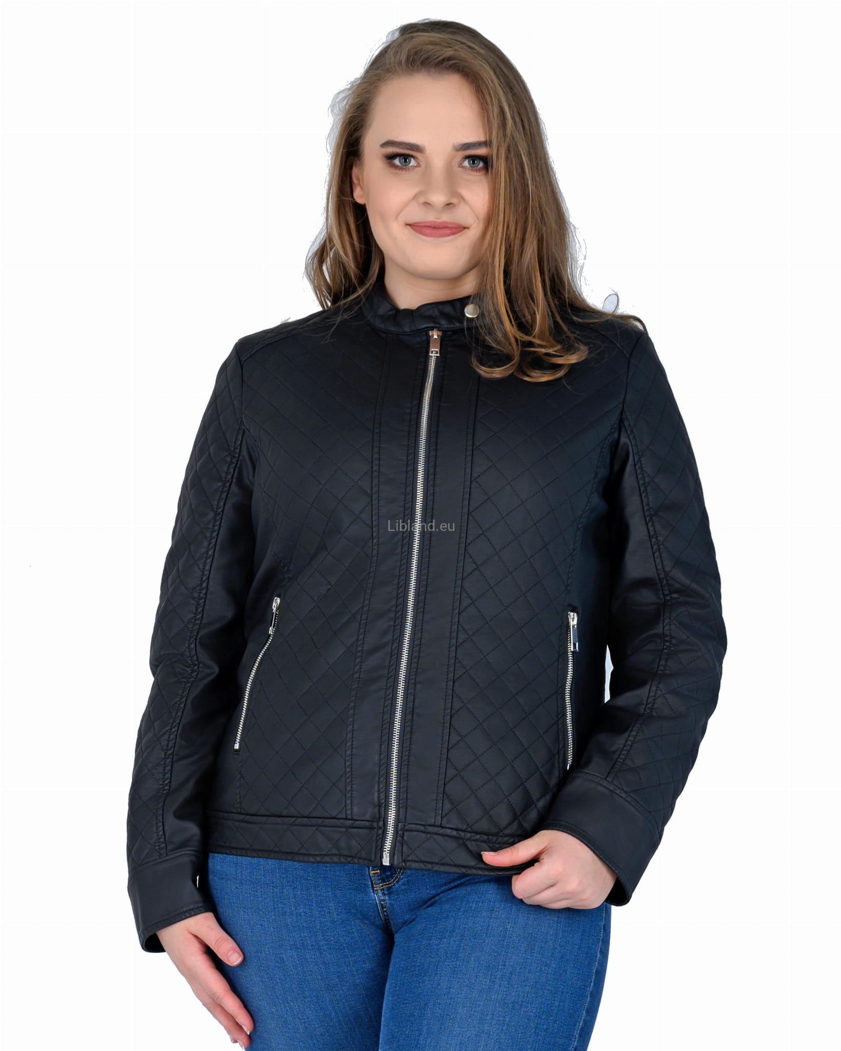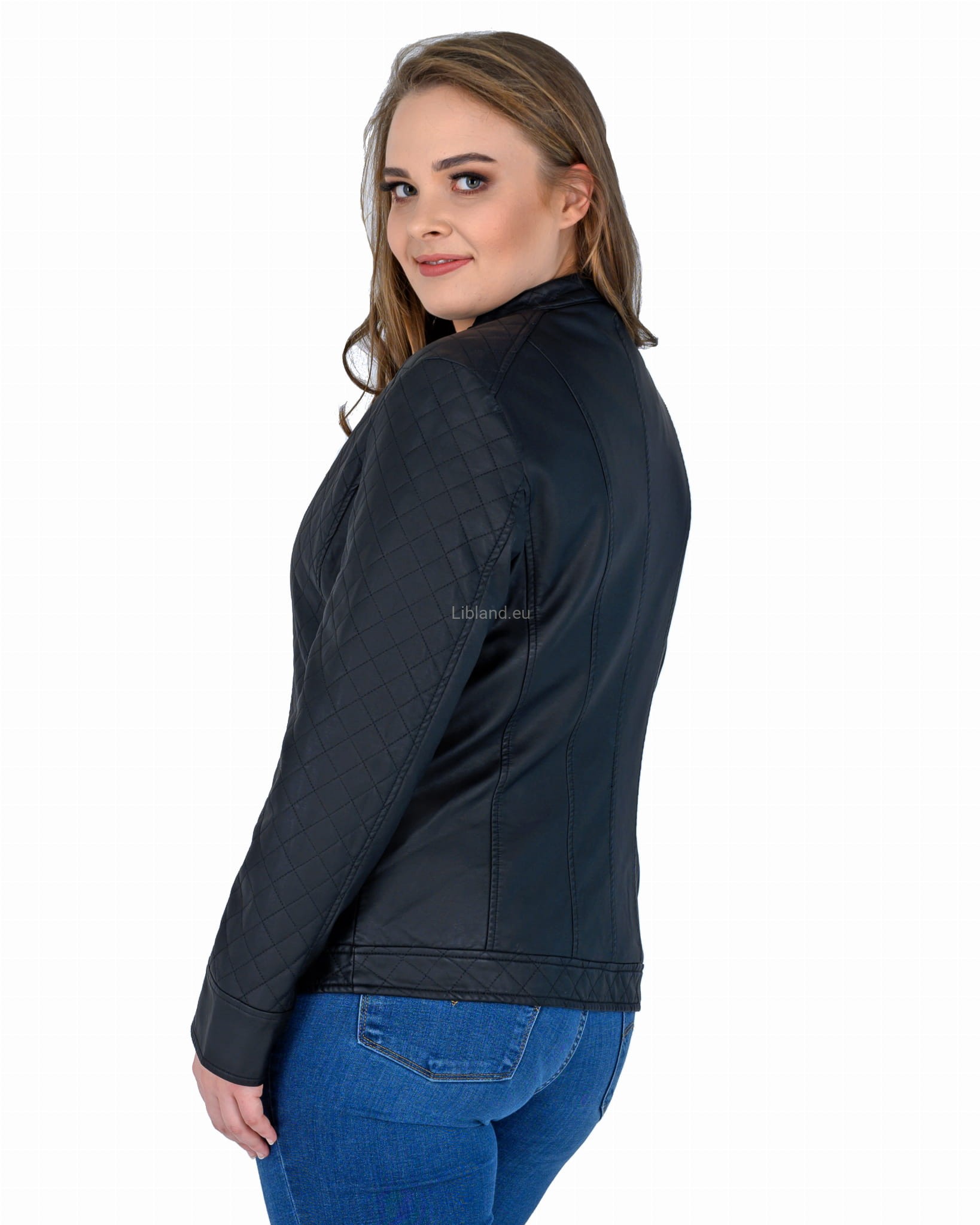 Krótka kurtka z ekologicznej skóry pikowana w skośna kratkę z błyszczącymi suwakami.