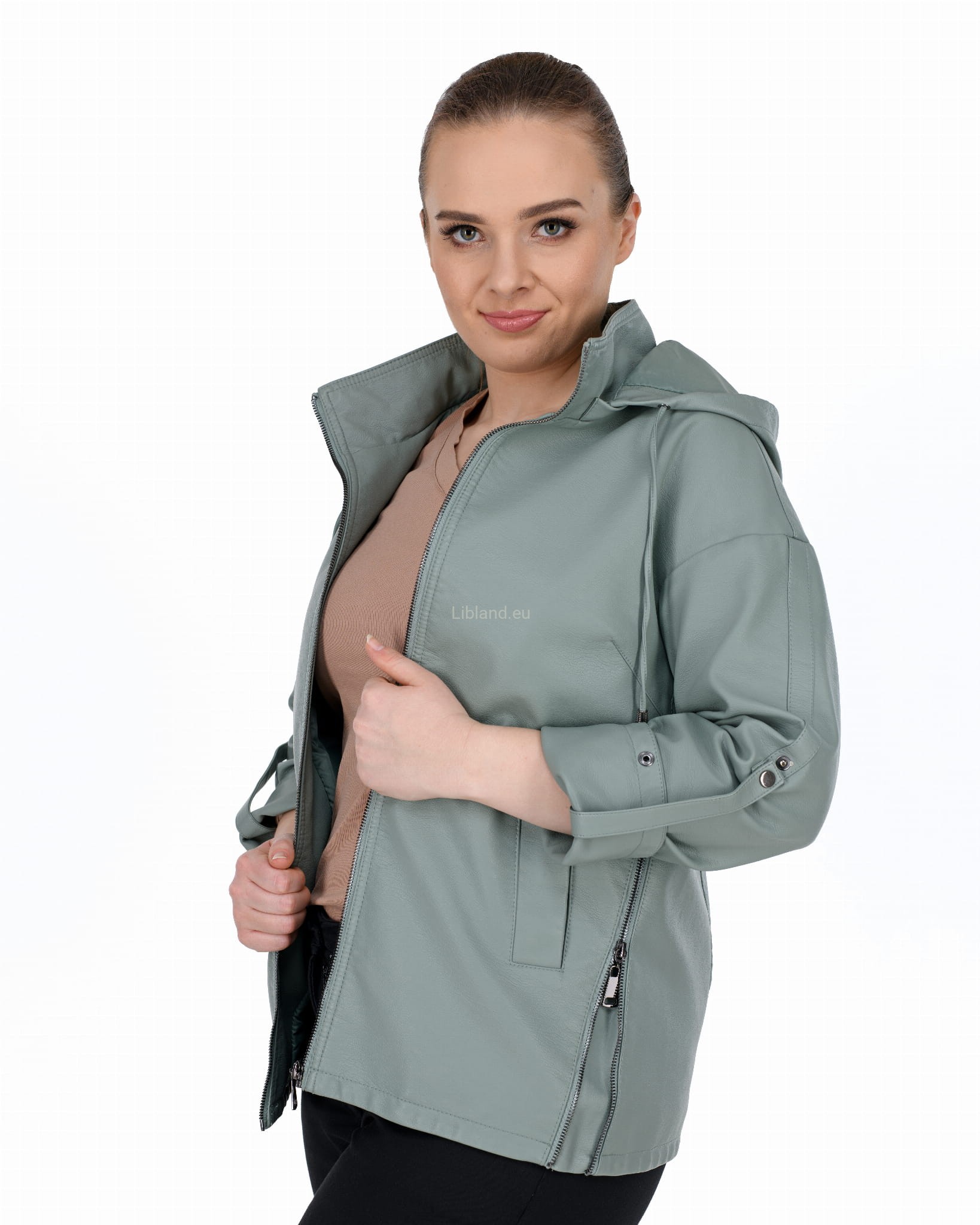 Krótki płaszczyk z ekoskóry z odpinanym kapturem i podwijanymi rękawami: