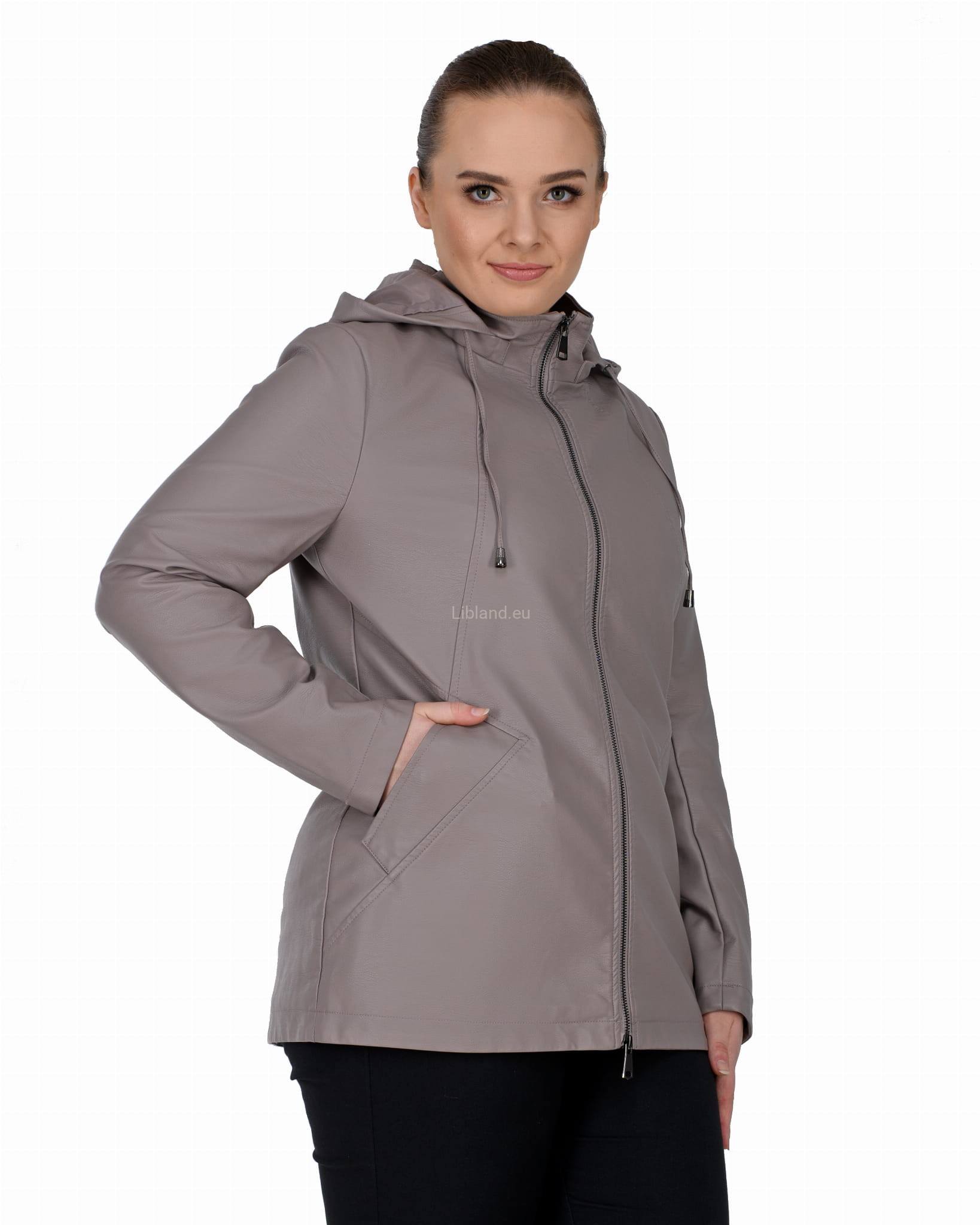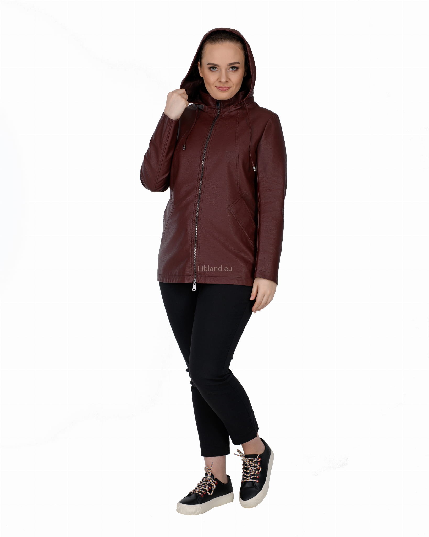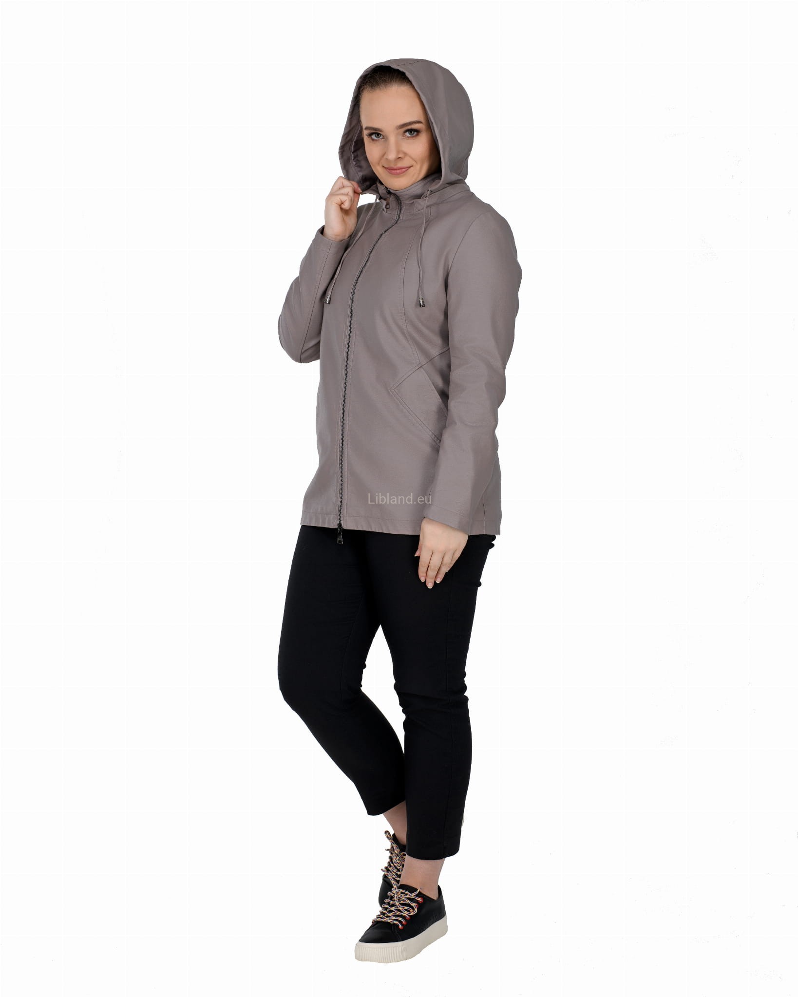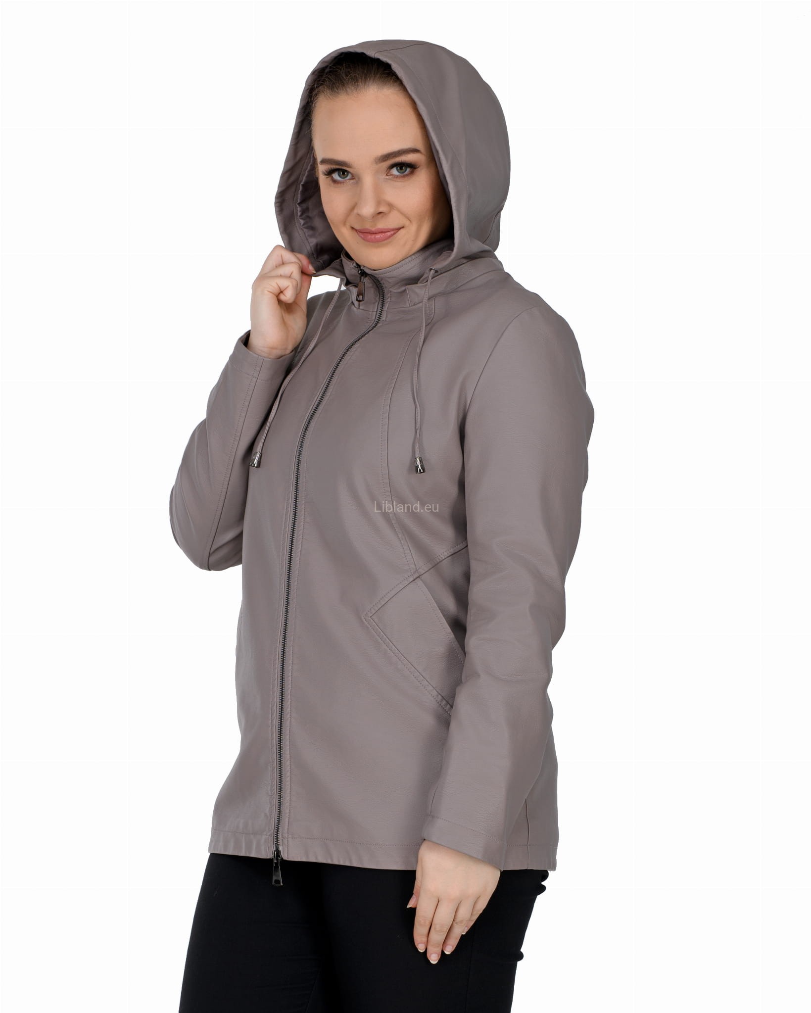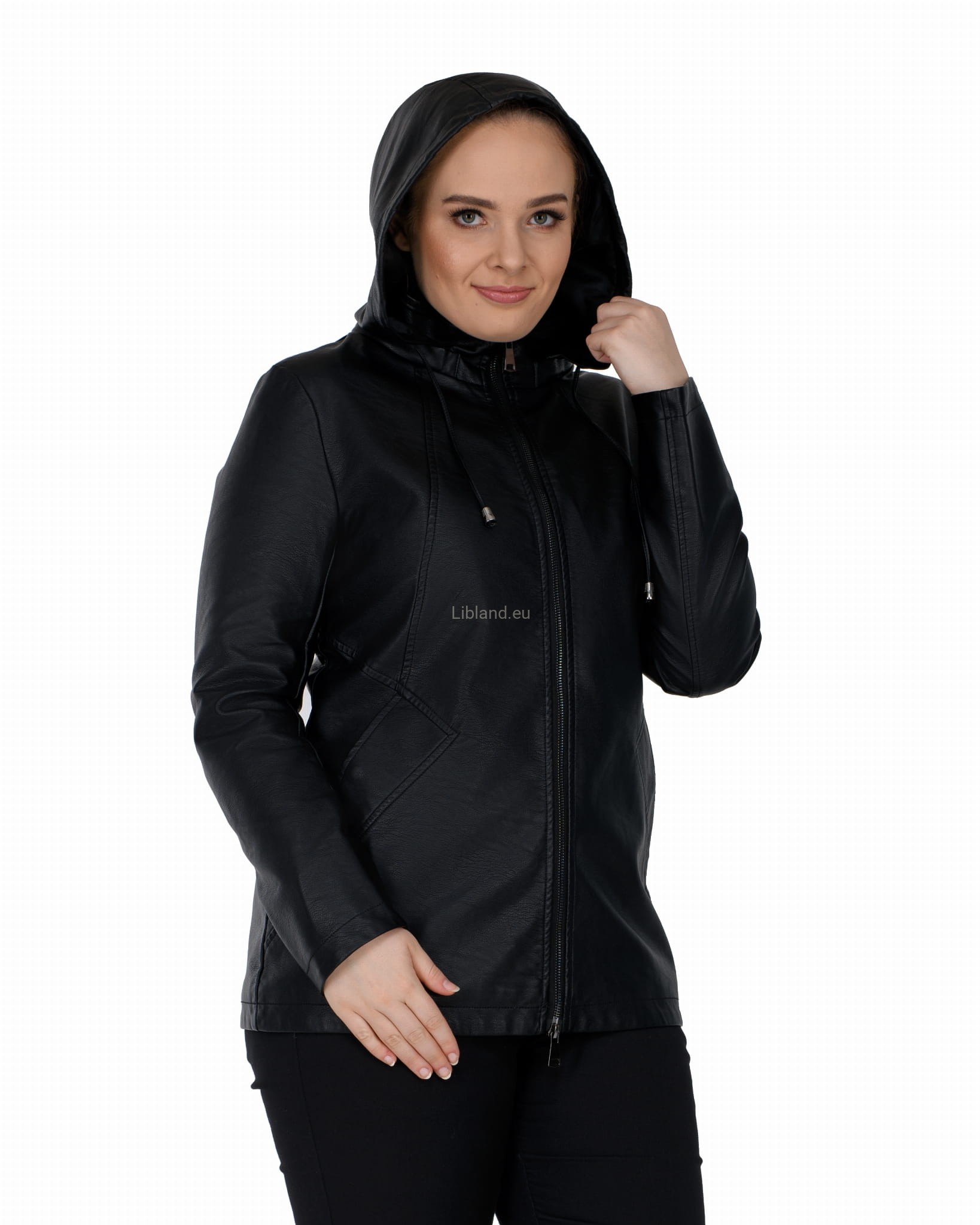 Krótki płaszczyk z ekoskóry zasuwany na dwustronny zamek błyskawiczny i z odpinanym kapturem.