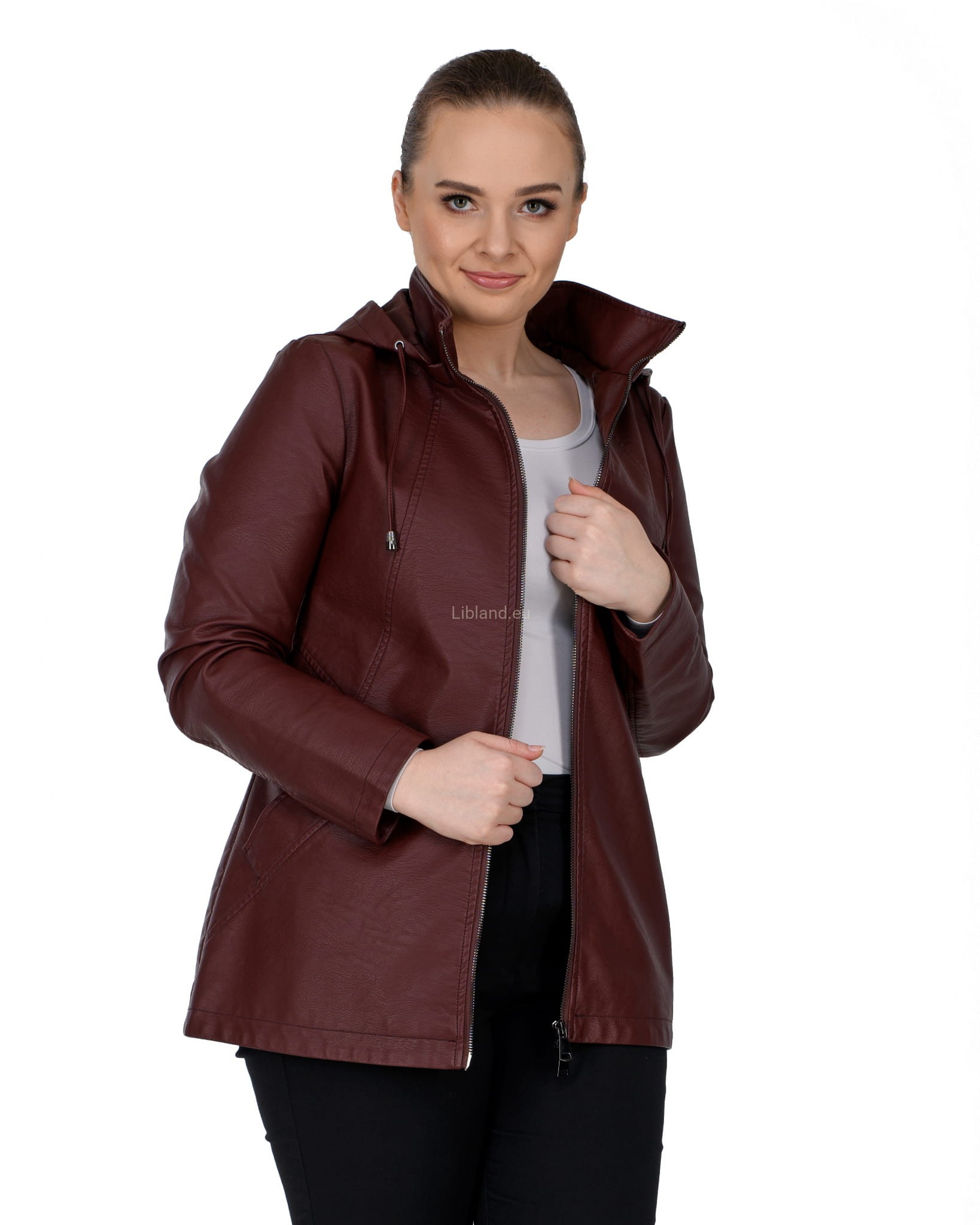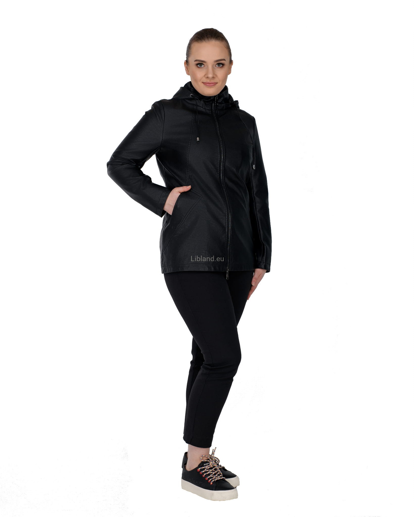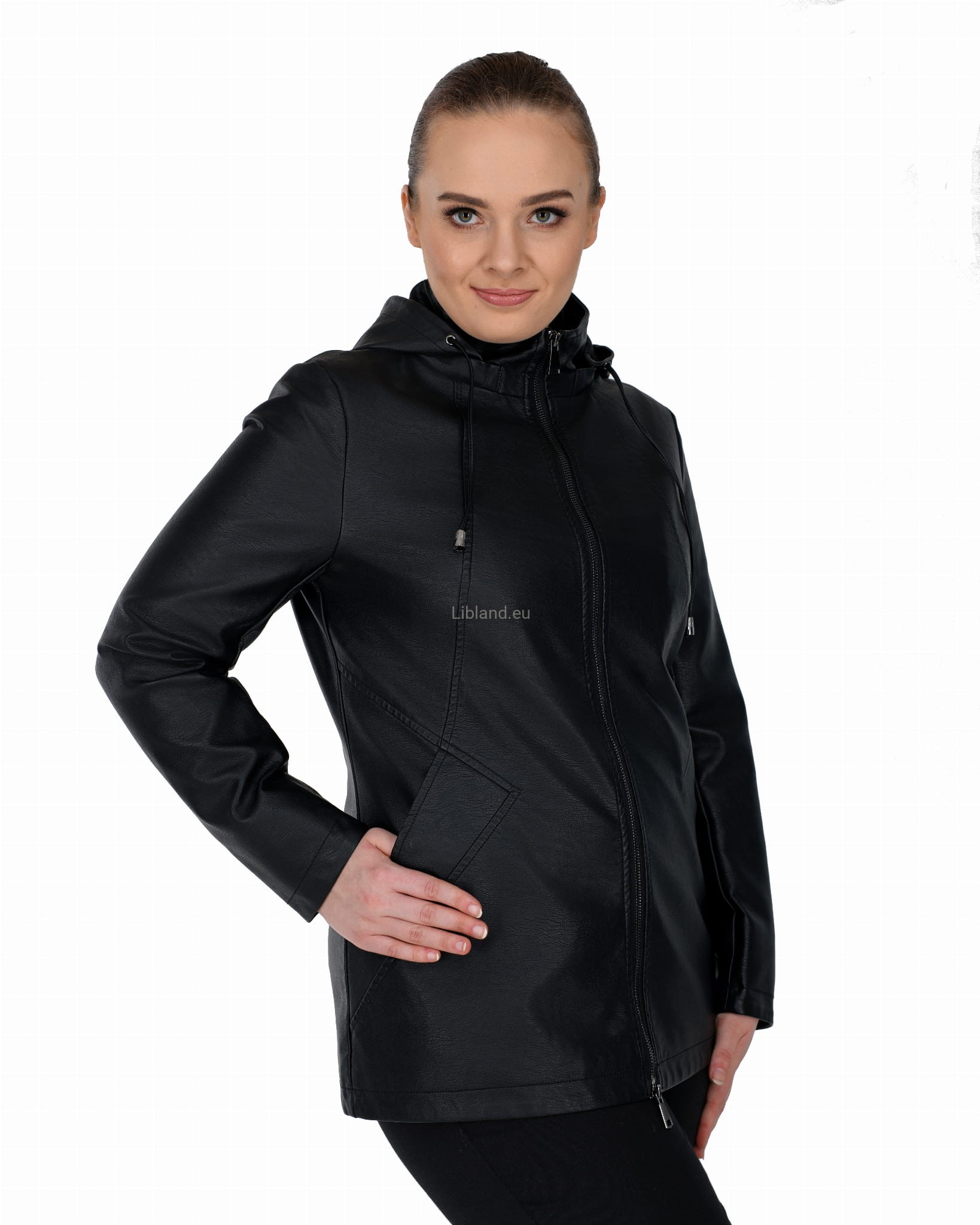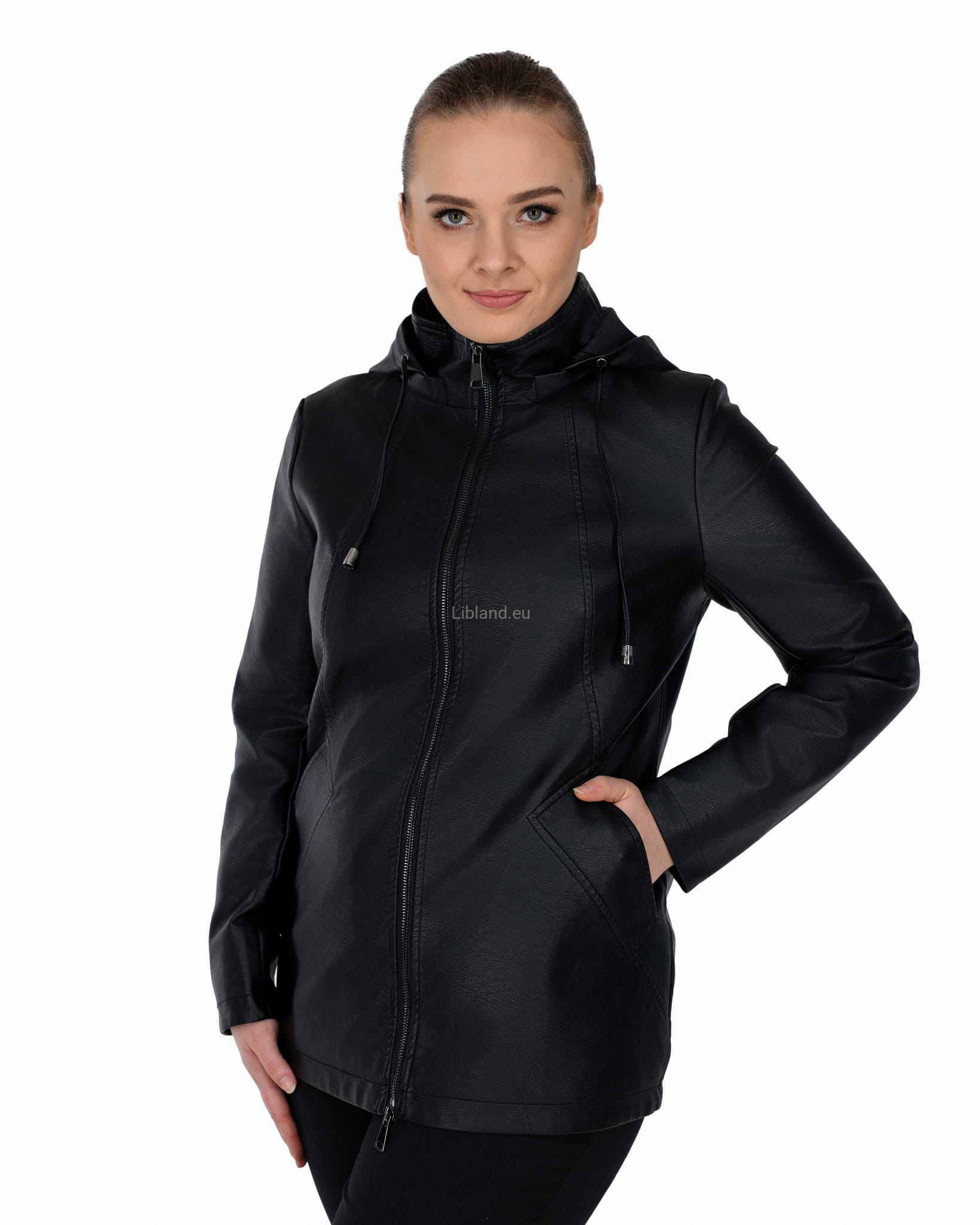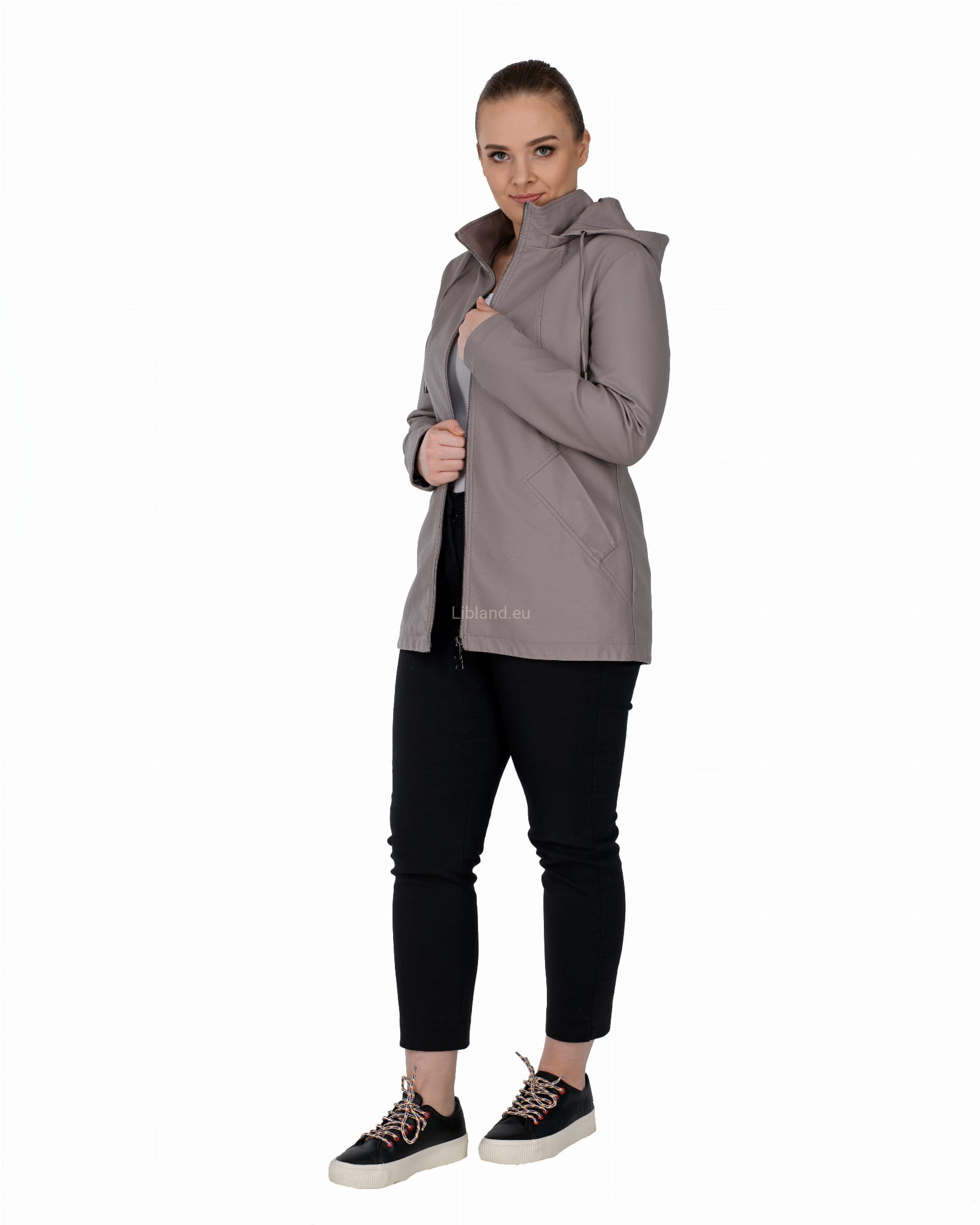 Krótki płaszczyk z ekoskóry zasuwany na dwustronny zamek błyskawiczny i z odpinanym kapturem.