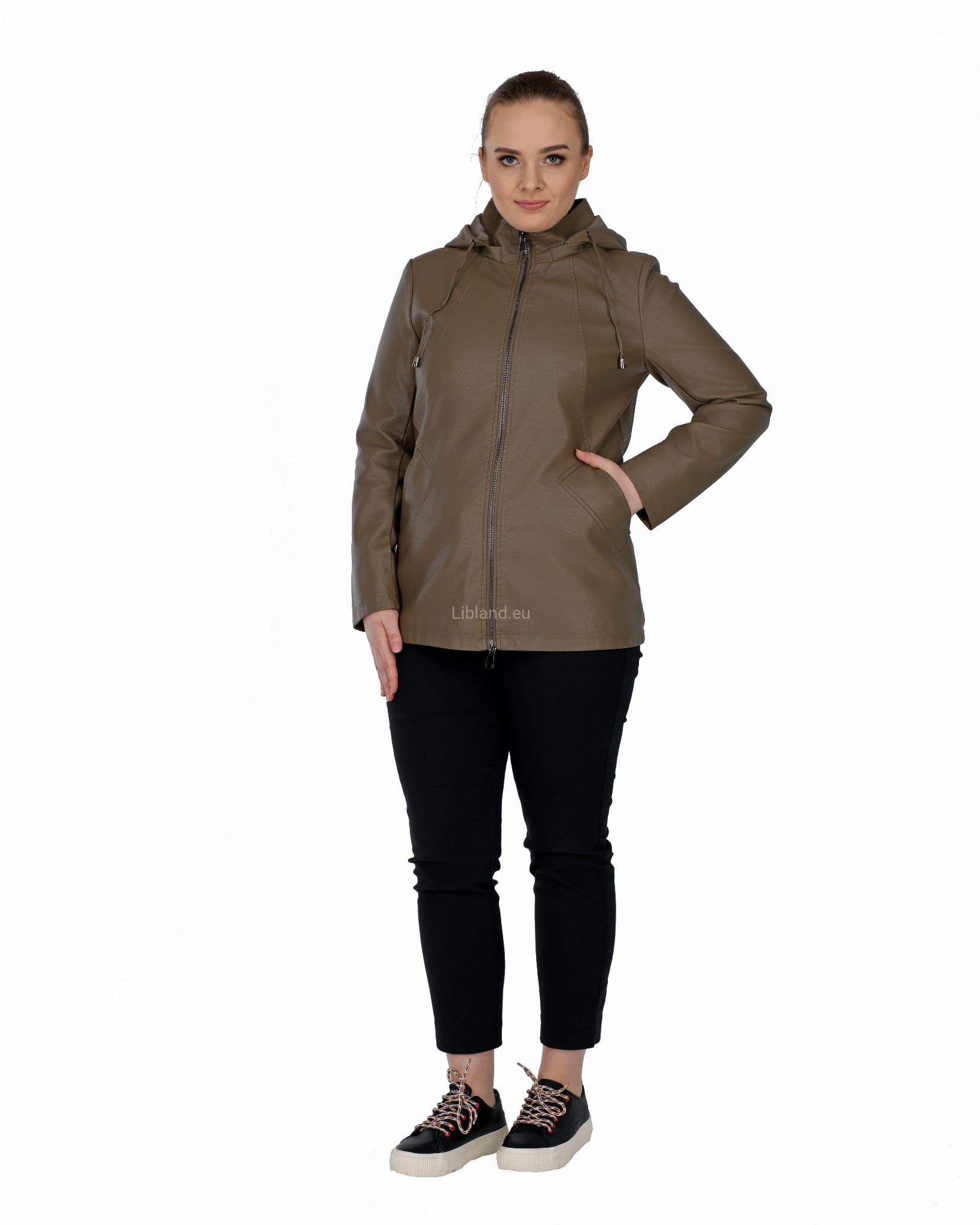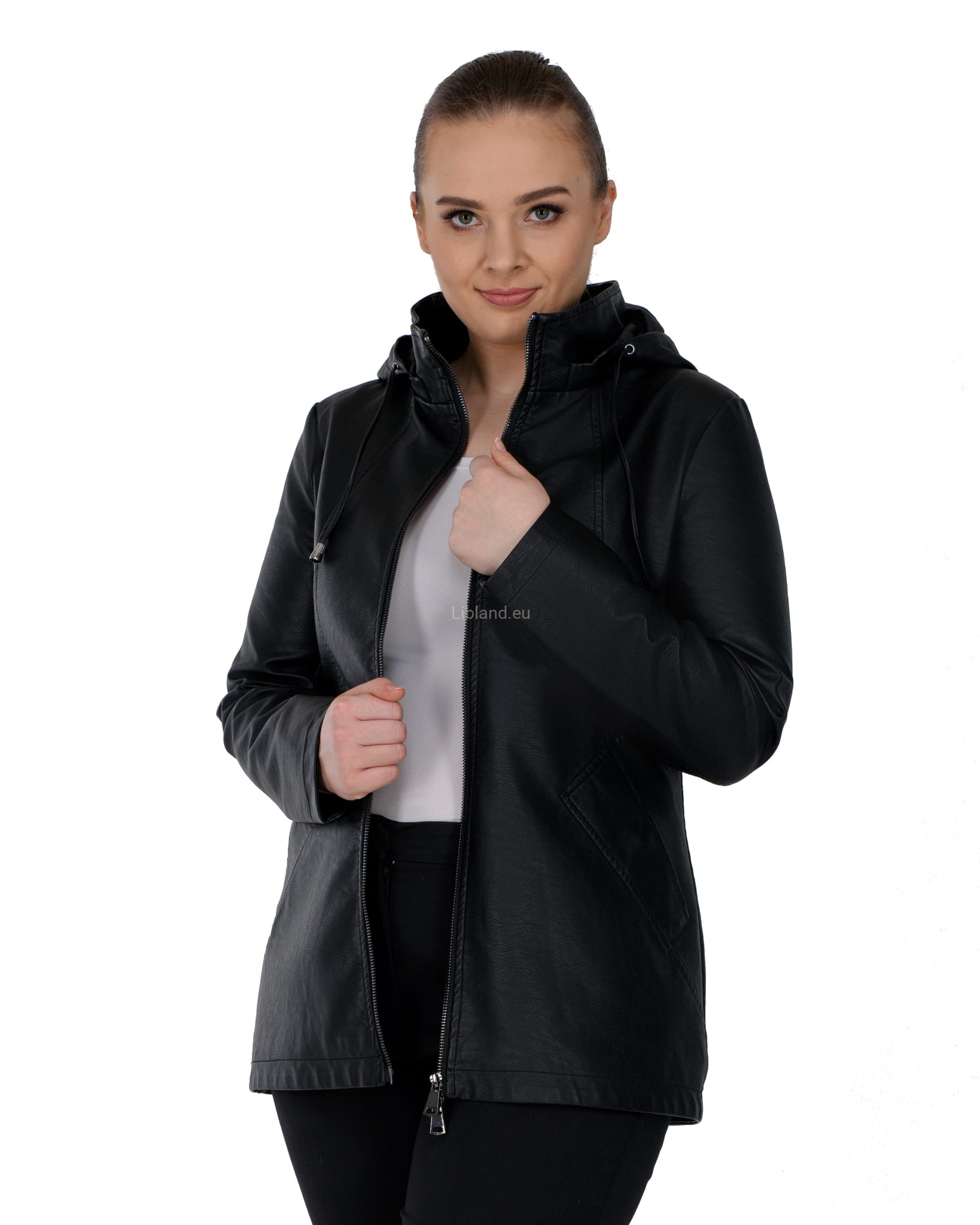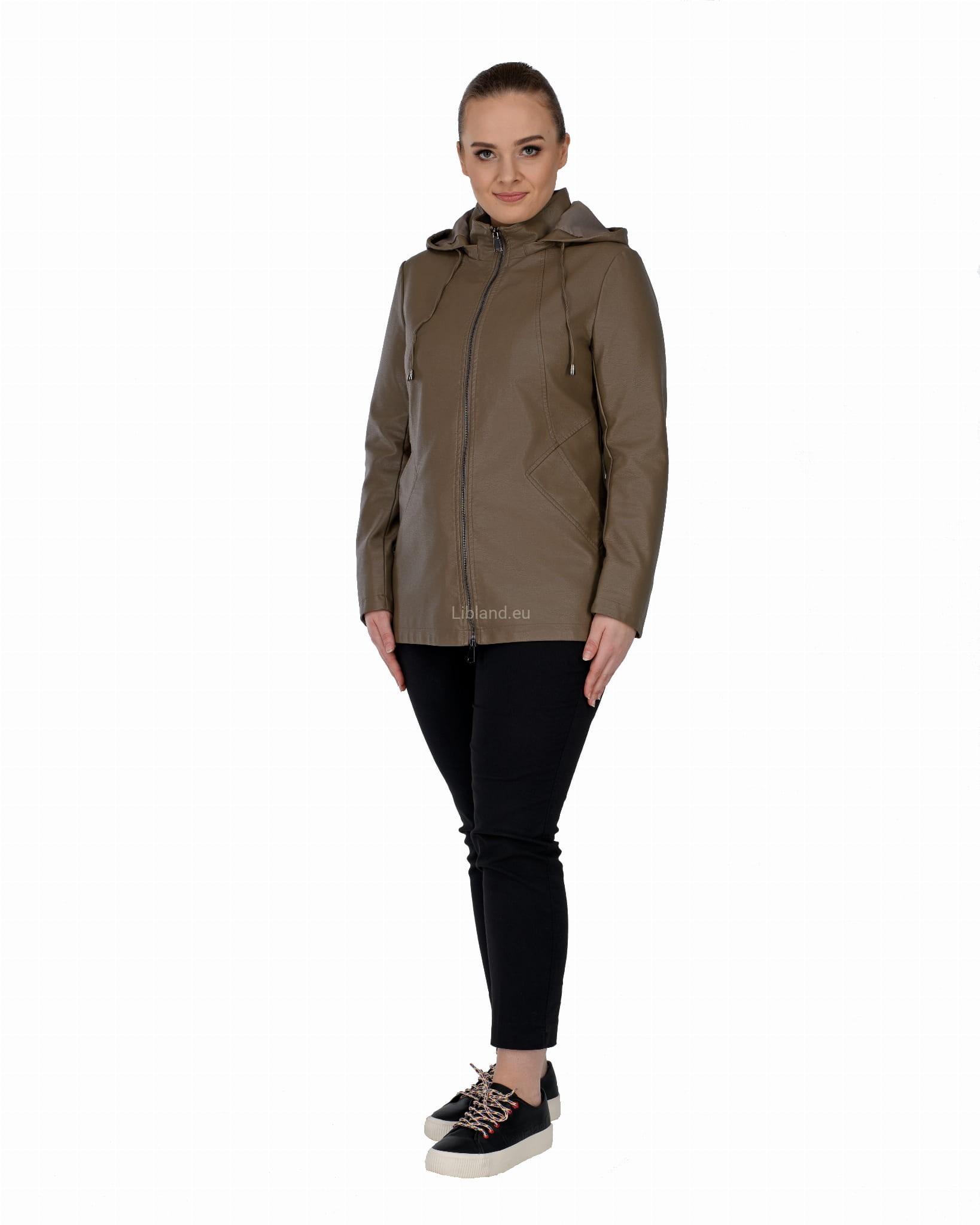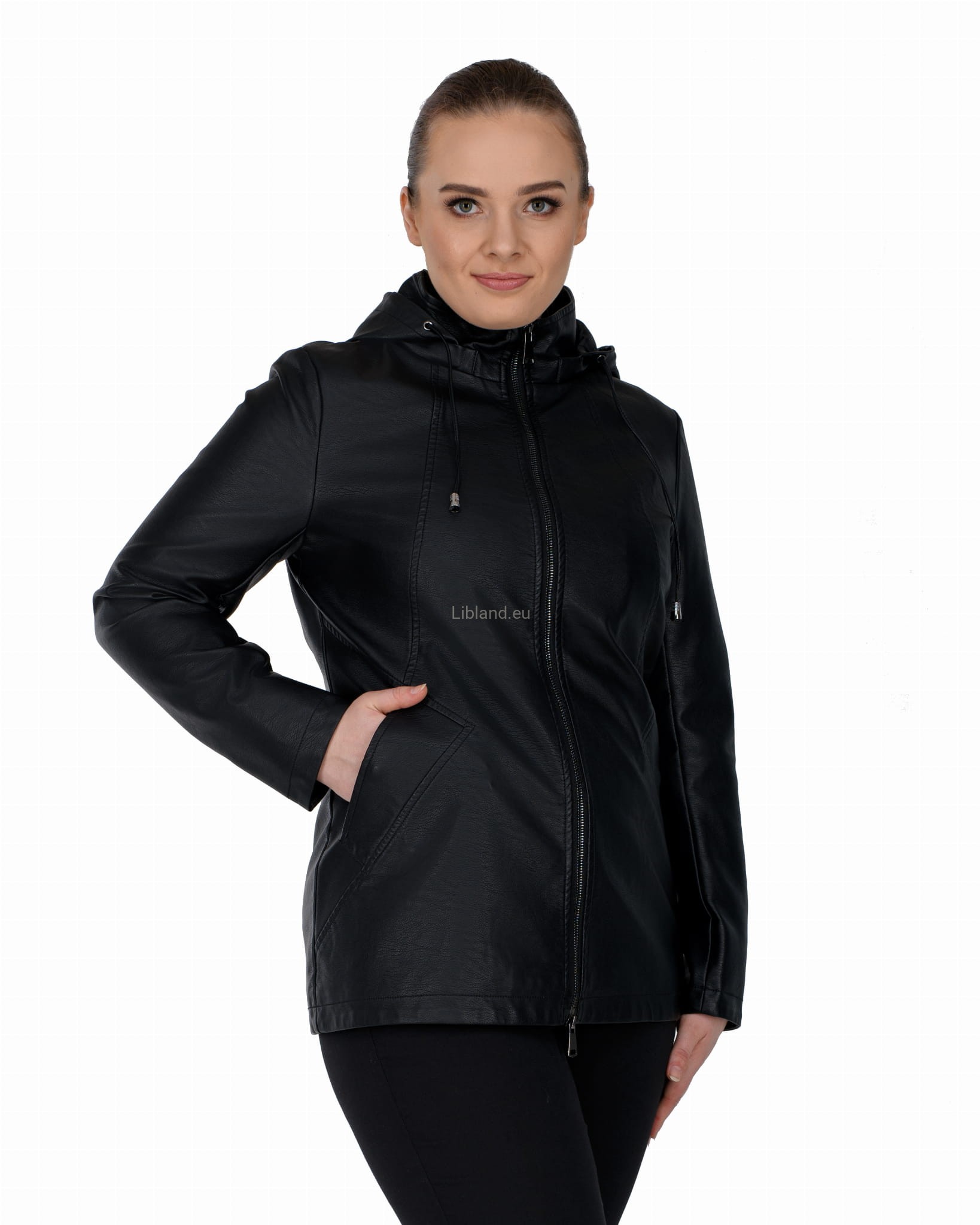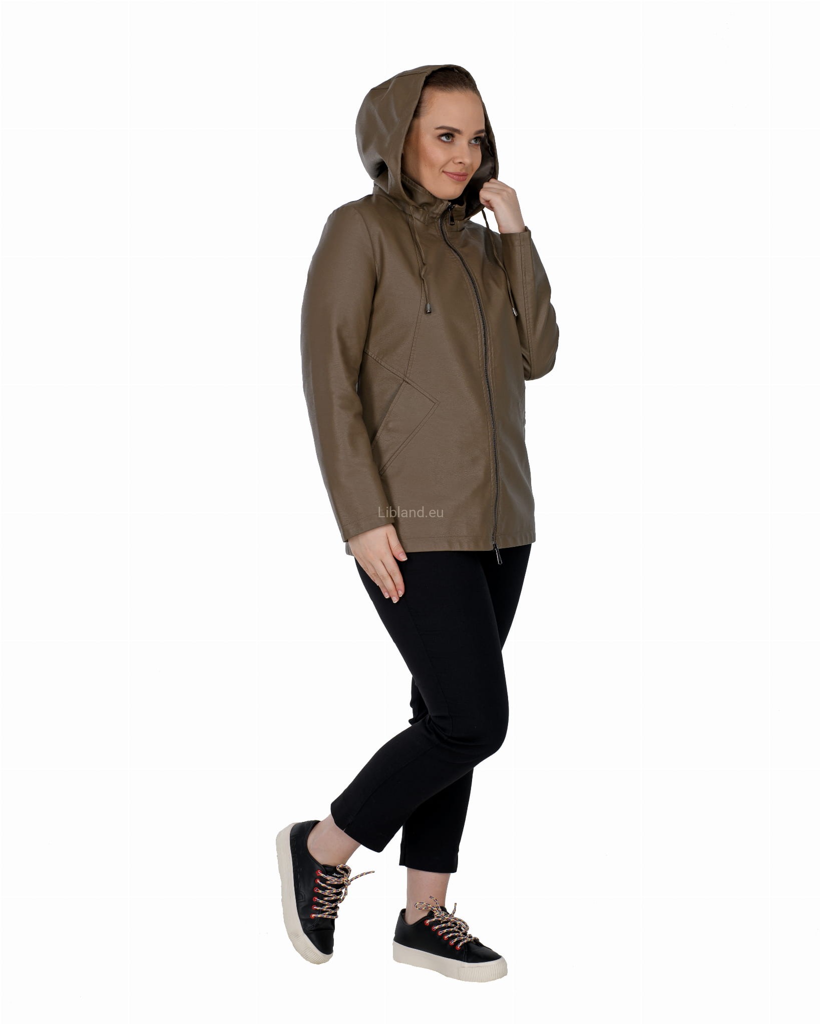 Krótki płaszczyk z ekoskóry zasuwany na dwustronny zamek błyskawiczny i z odpinanym kapturem.