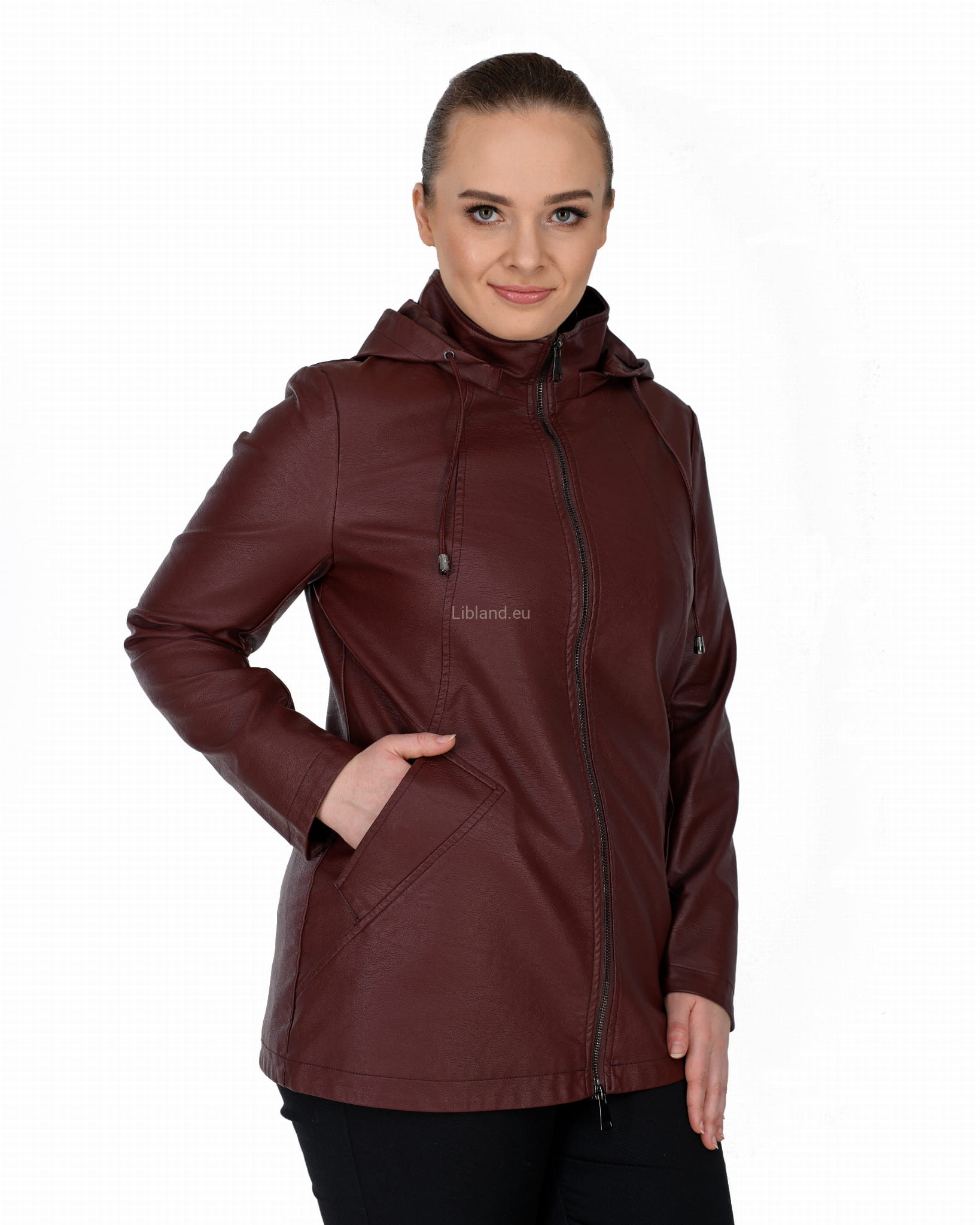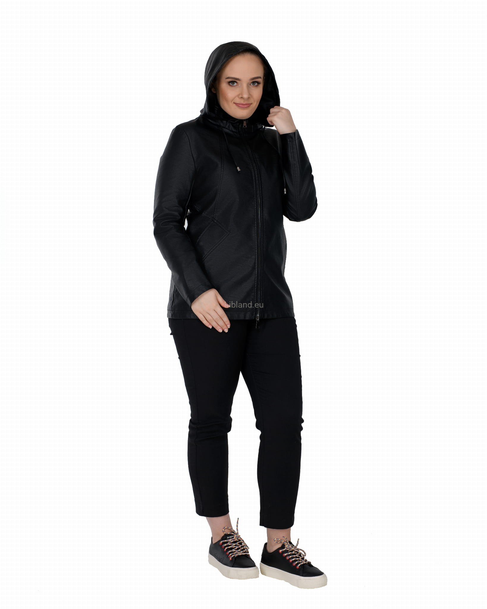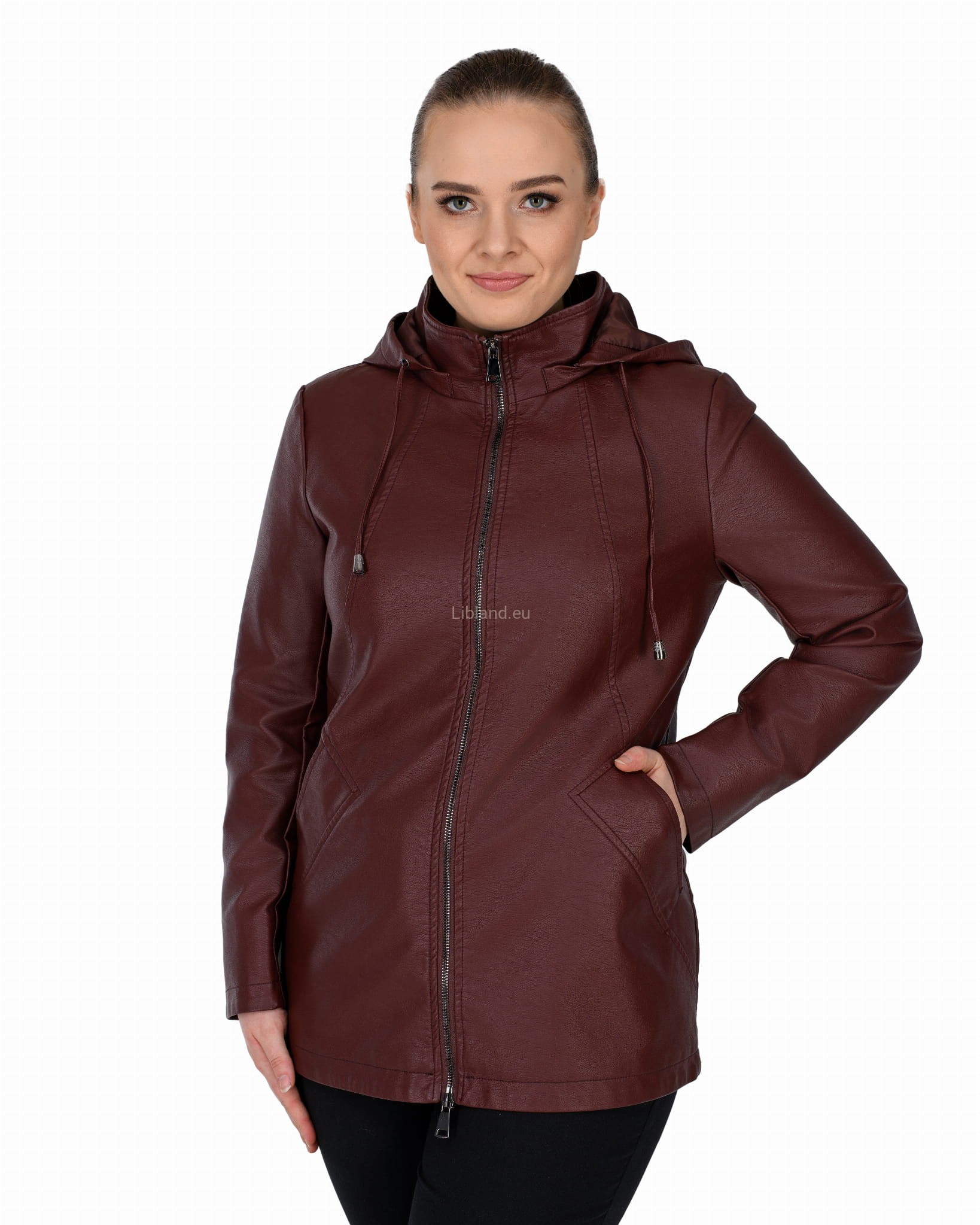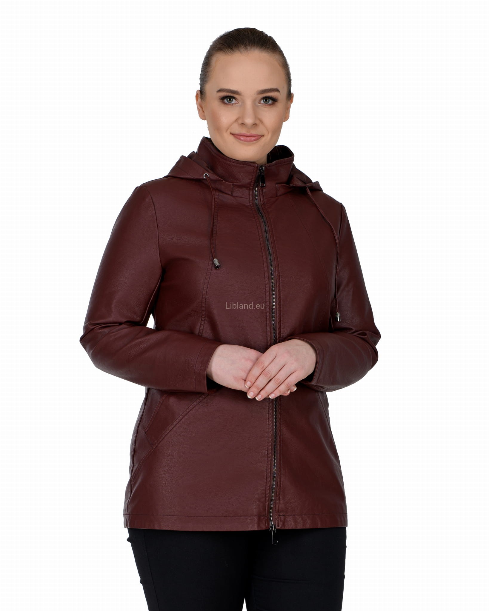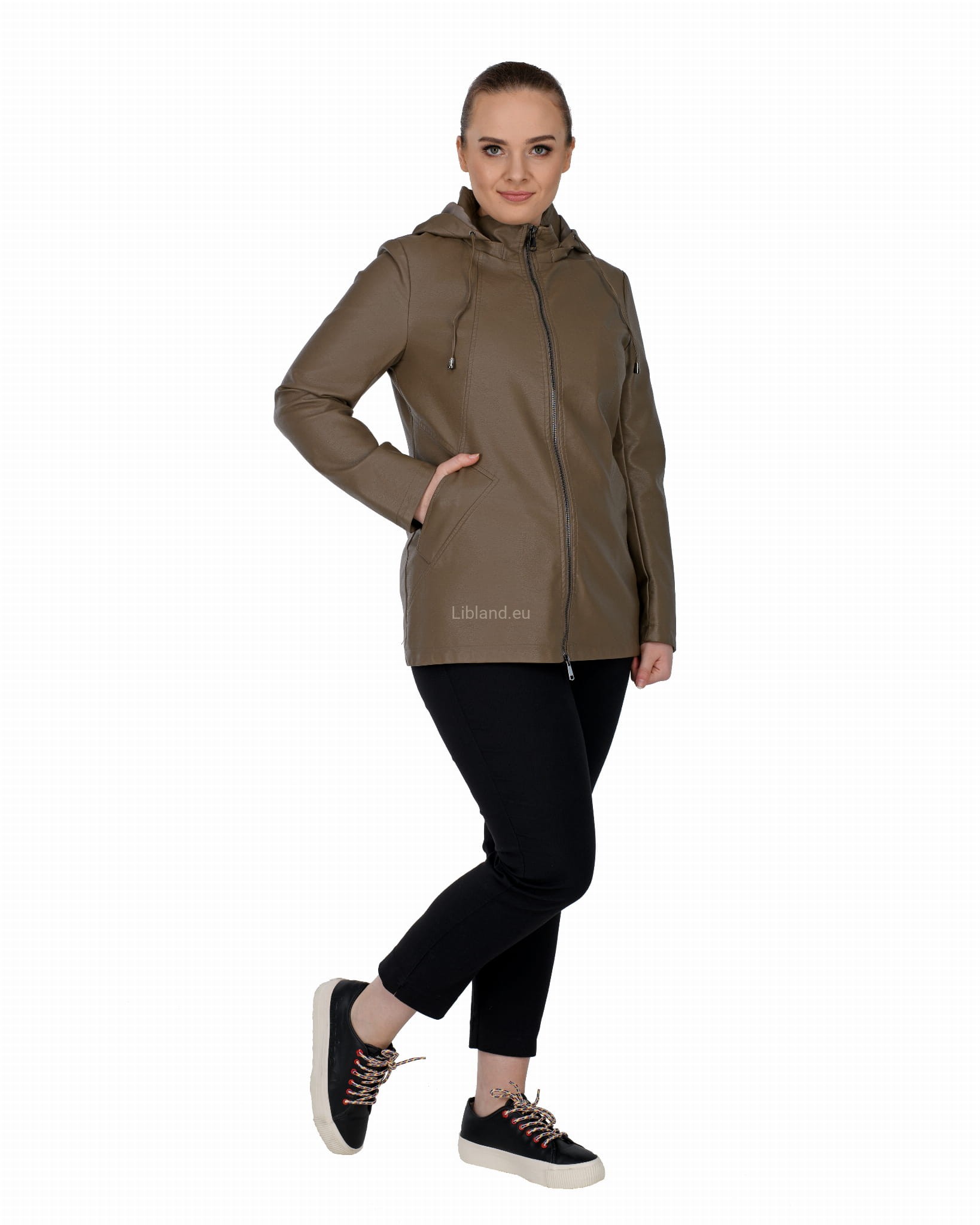 Krótki płaszczyk z ekoskóry zasuwany na dwustronny zamek błyskawiczny i z odpinanym kapturem.