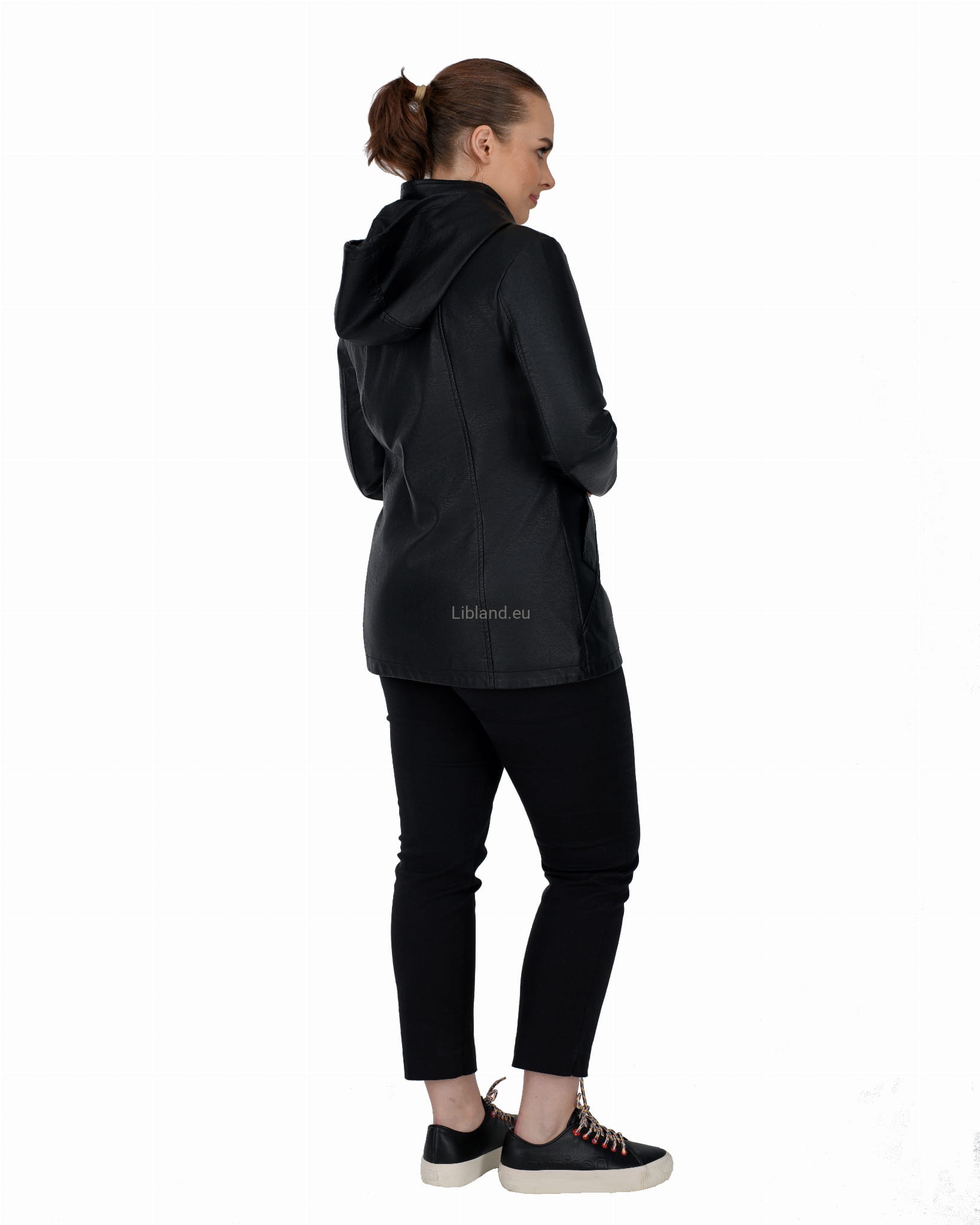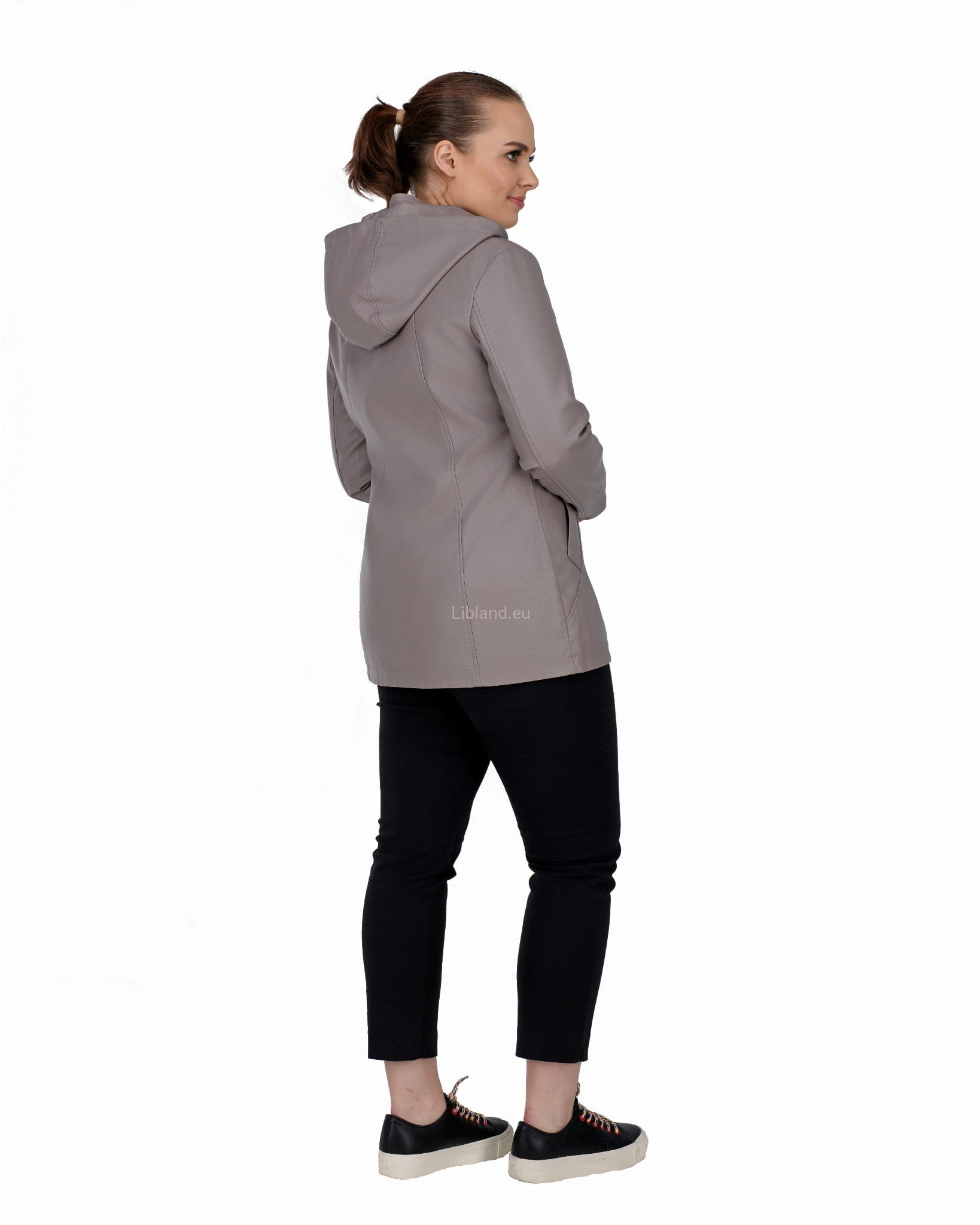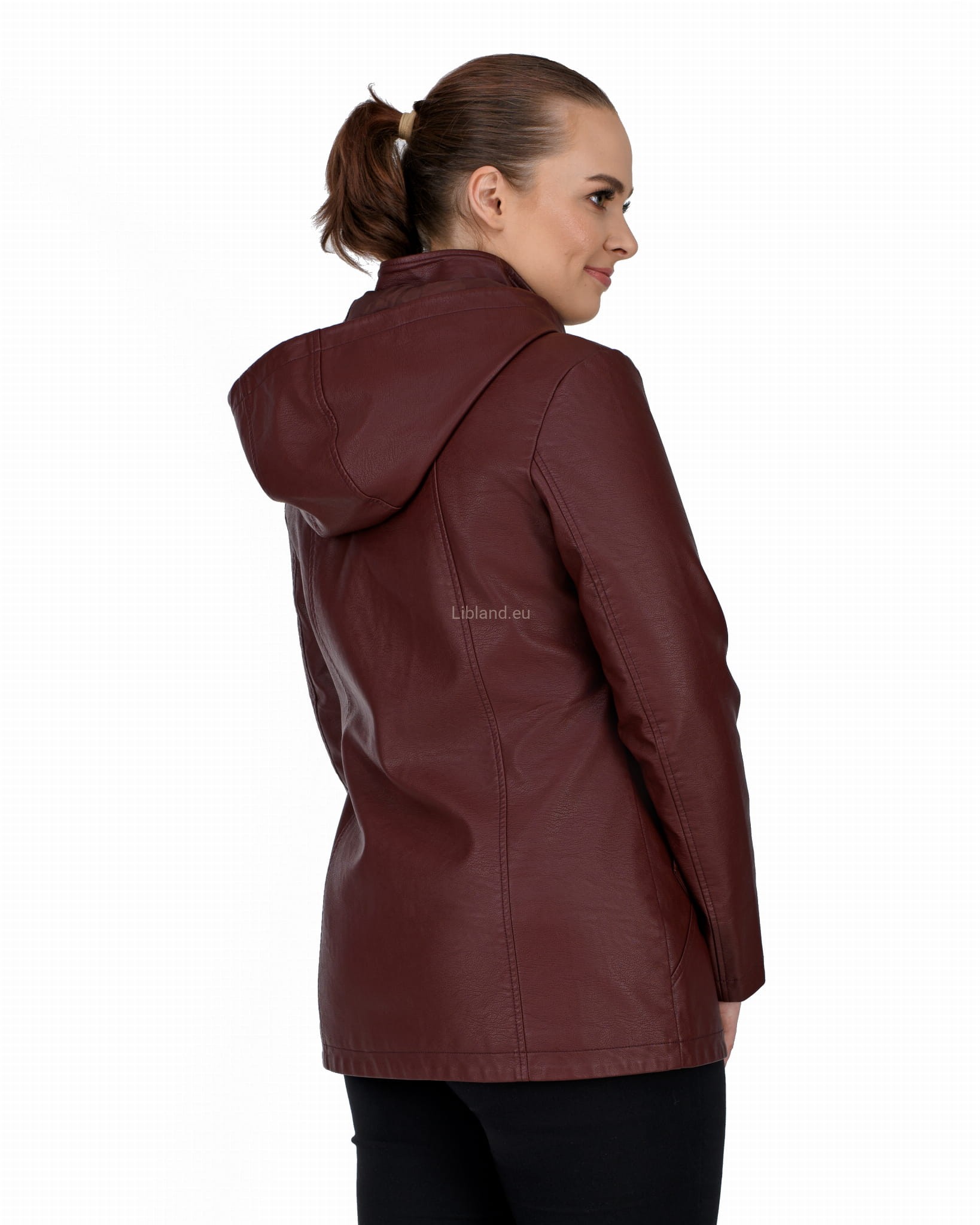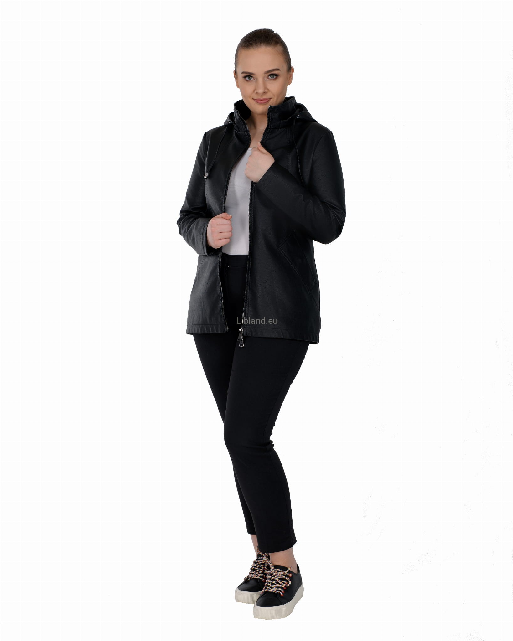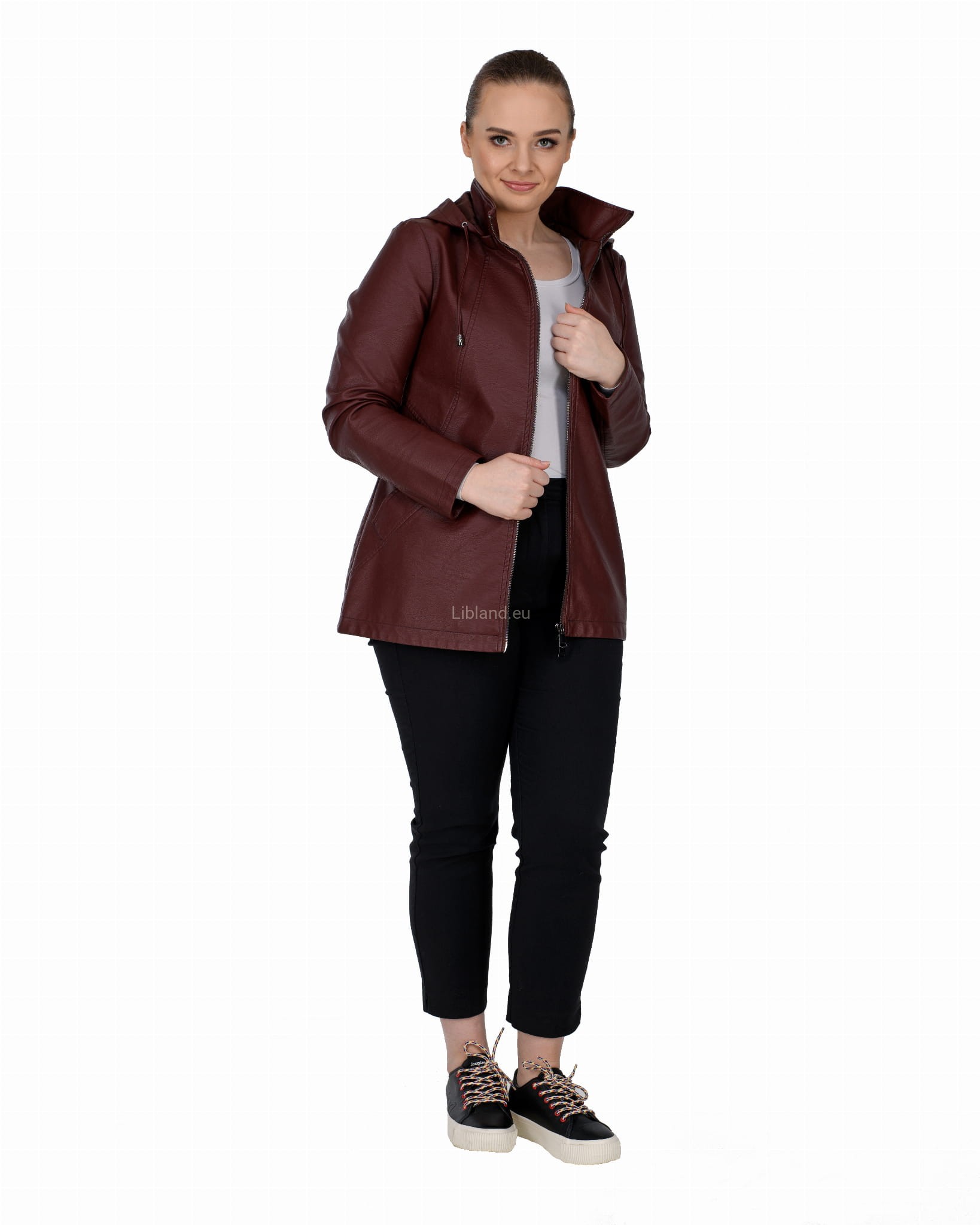 Krótki płaszczyk z ekoskóry zasuwany na dwustronny zamek błyskawiczny i z odpinanym kapturem.