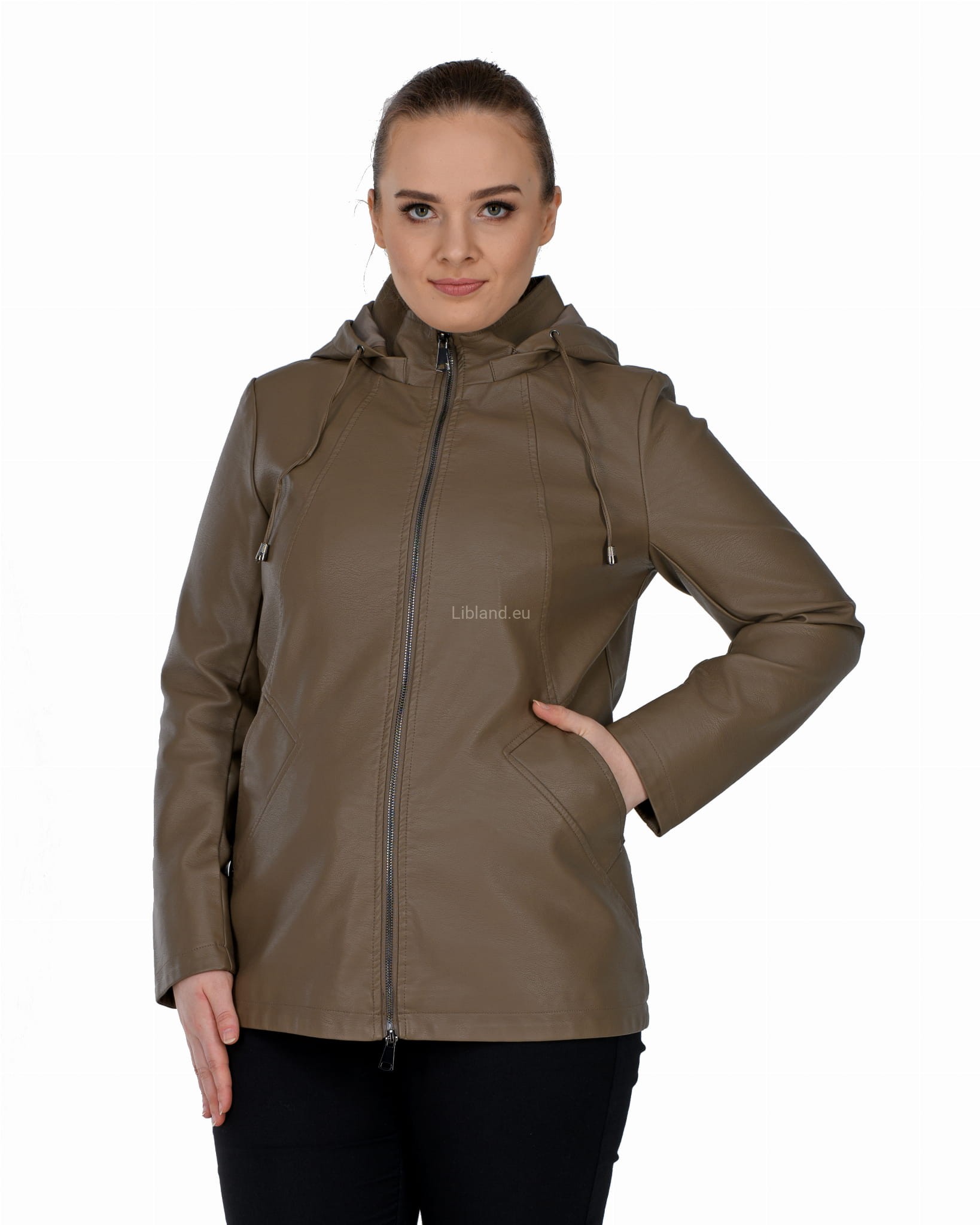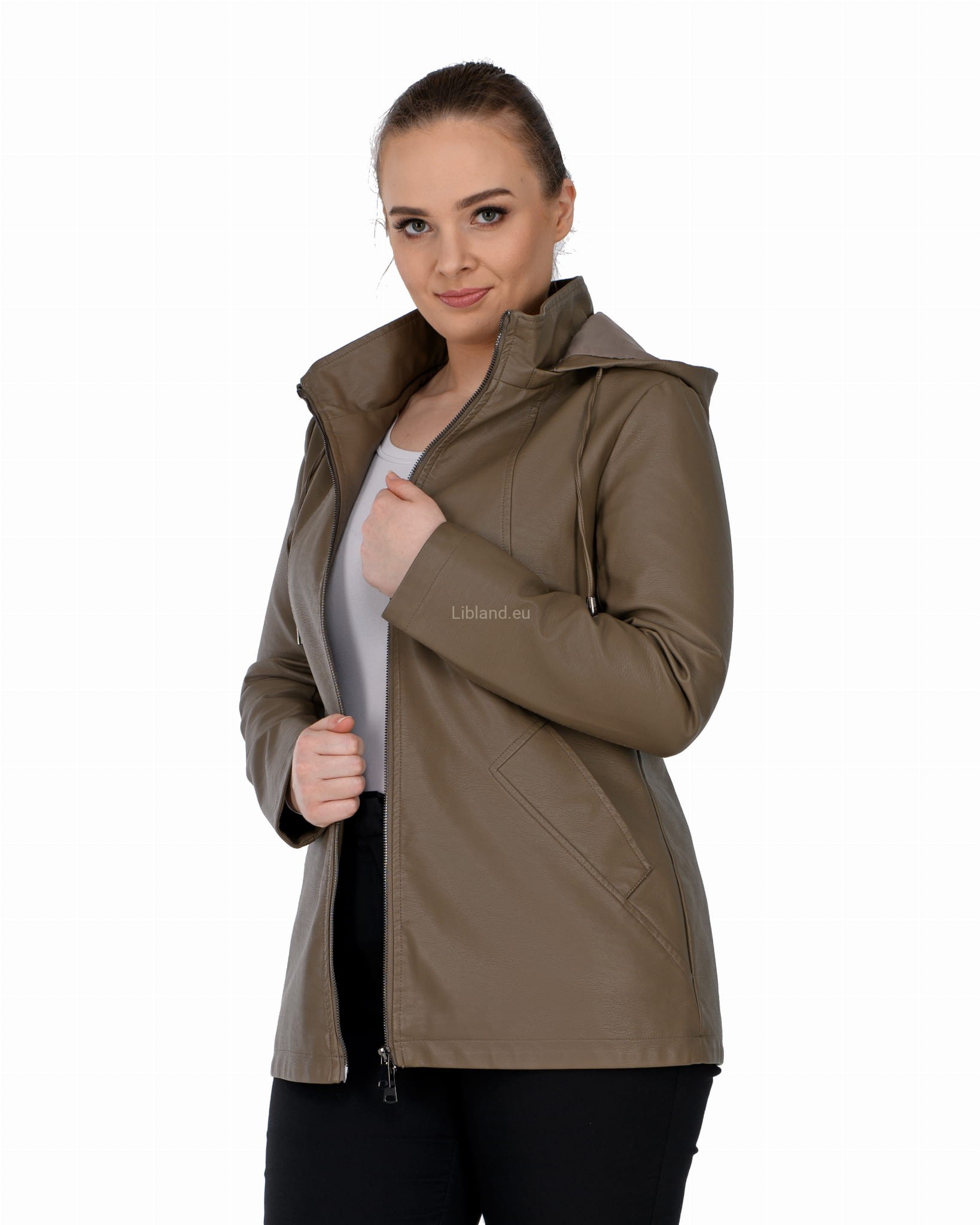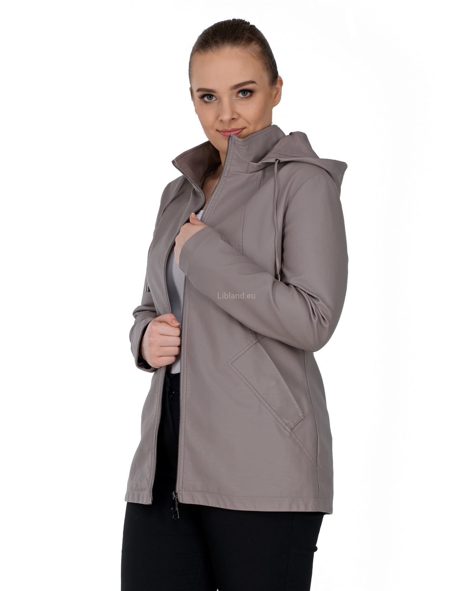 Krótki płaszczyk z ekoskóry zasuwany na dwustronny zamek błyskawiczny i z odpinanym kapturem: