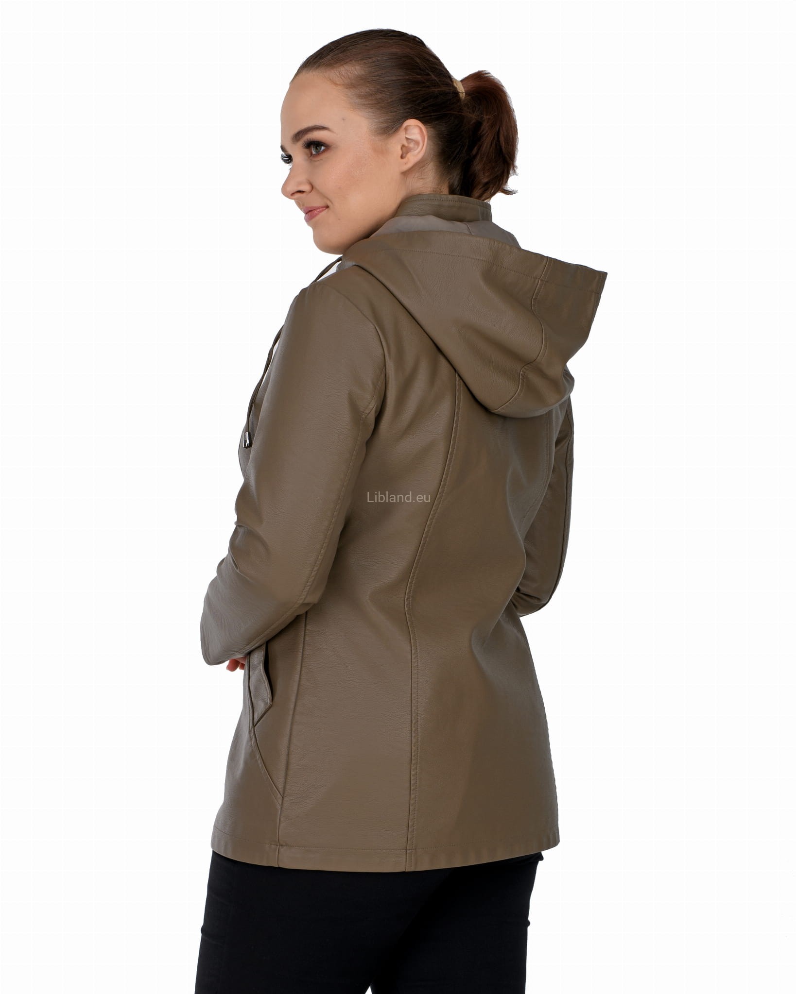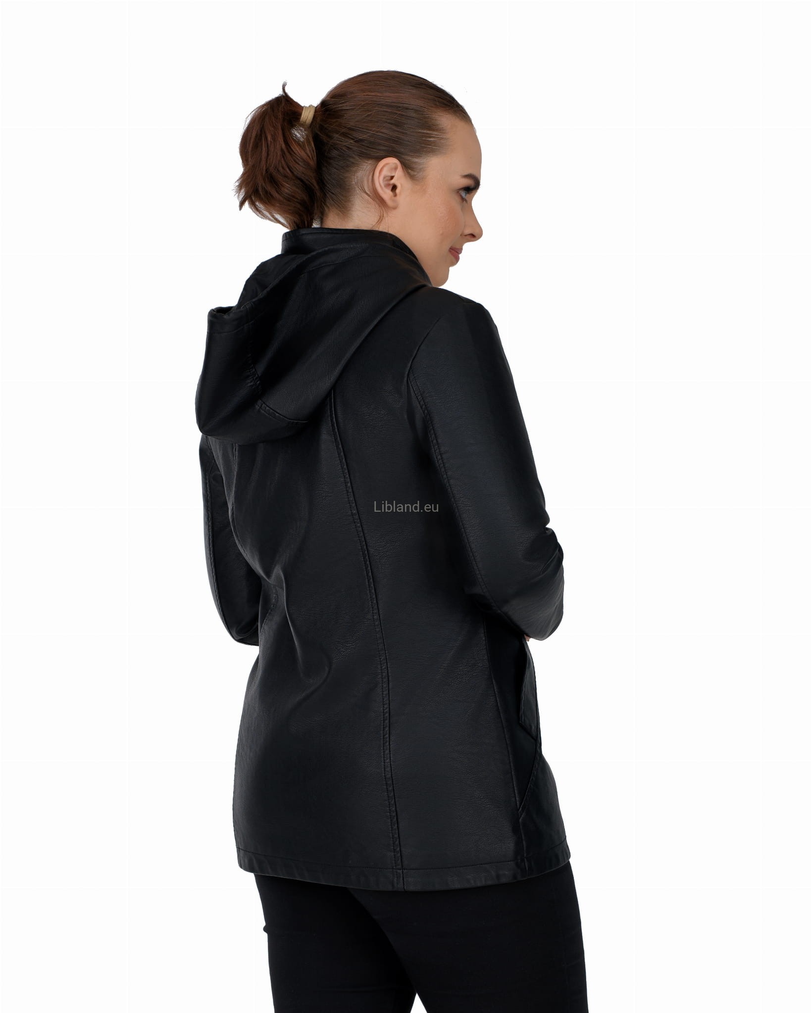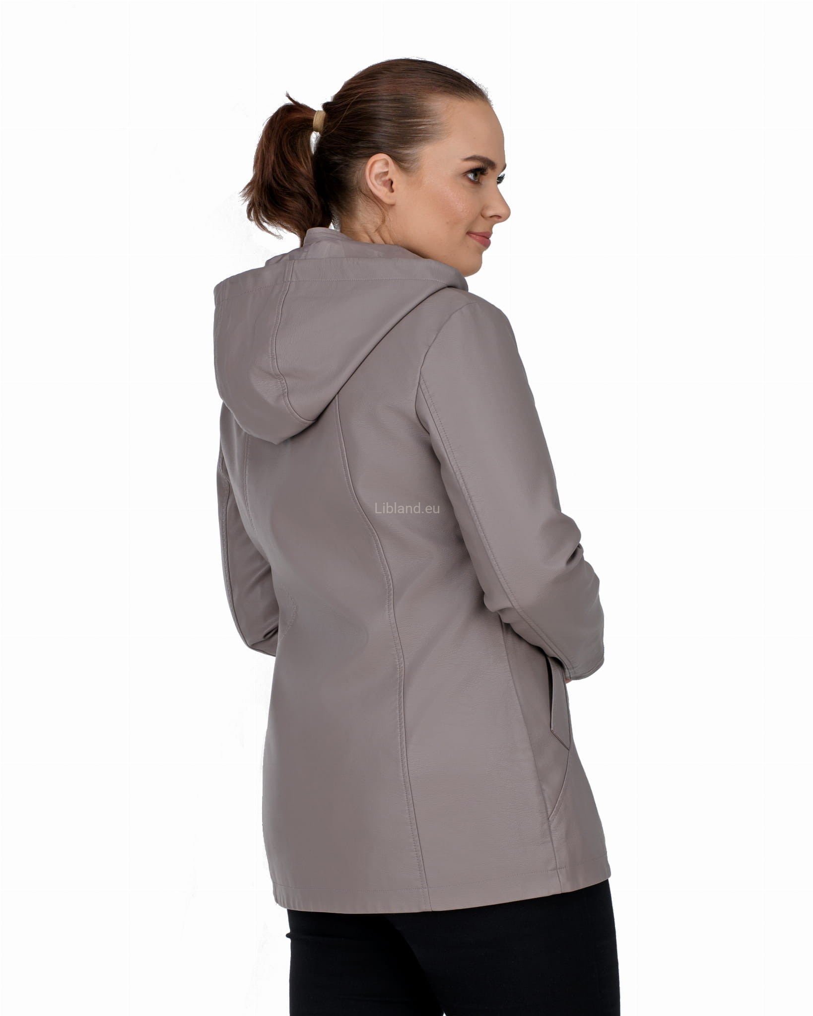 Krótki płaszczyk z ekoskóry zasuwany na dwustronny zamek błyskawiczny i z odpinanym kapturem: