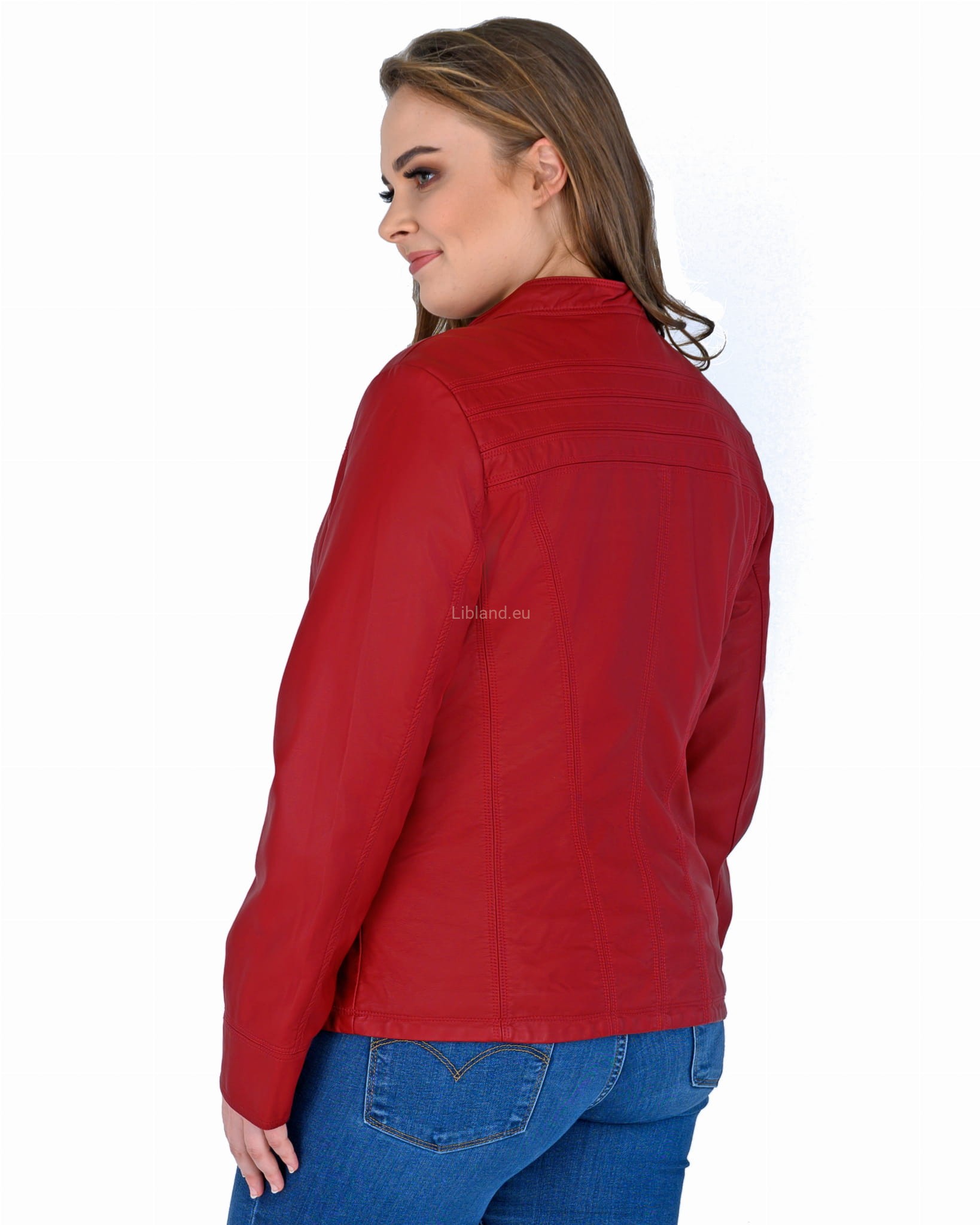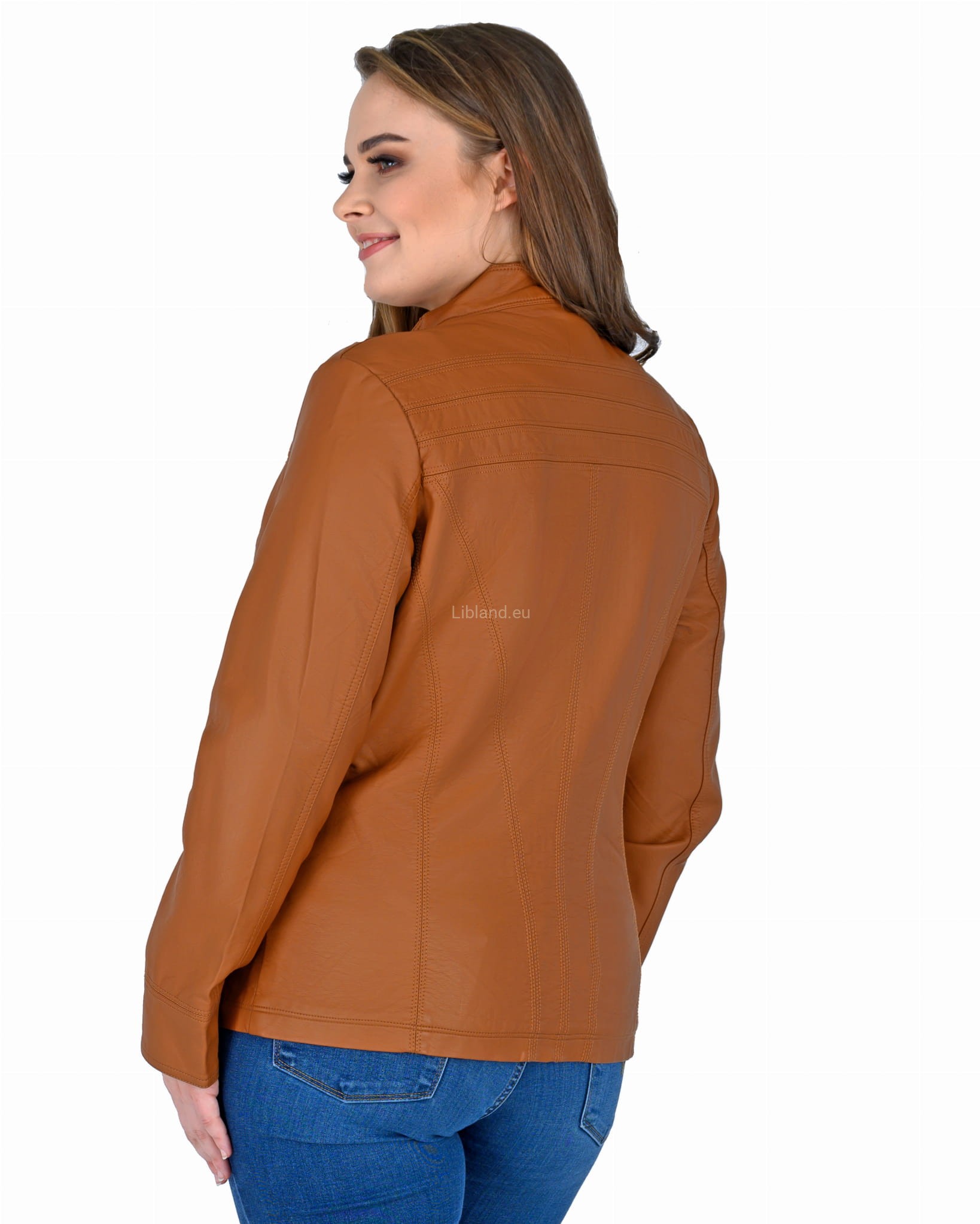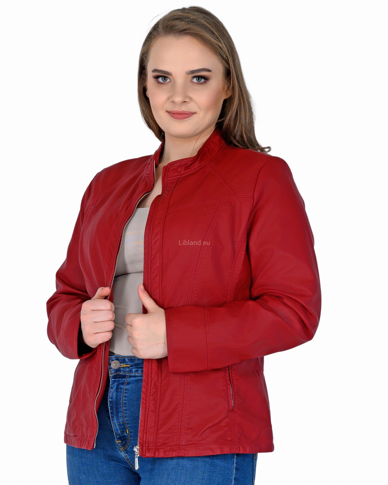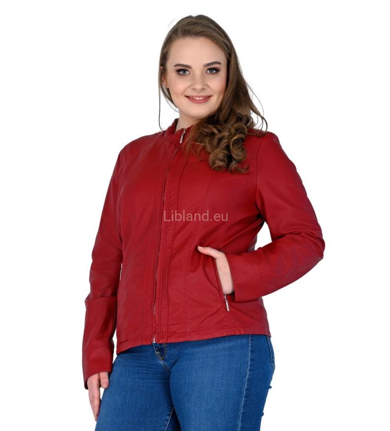 Kurtka z ekologicznej skóry ze stójką i krytym suwakiem.