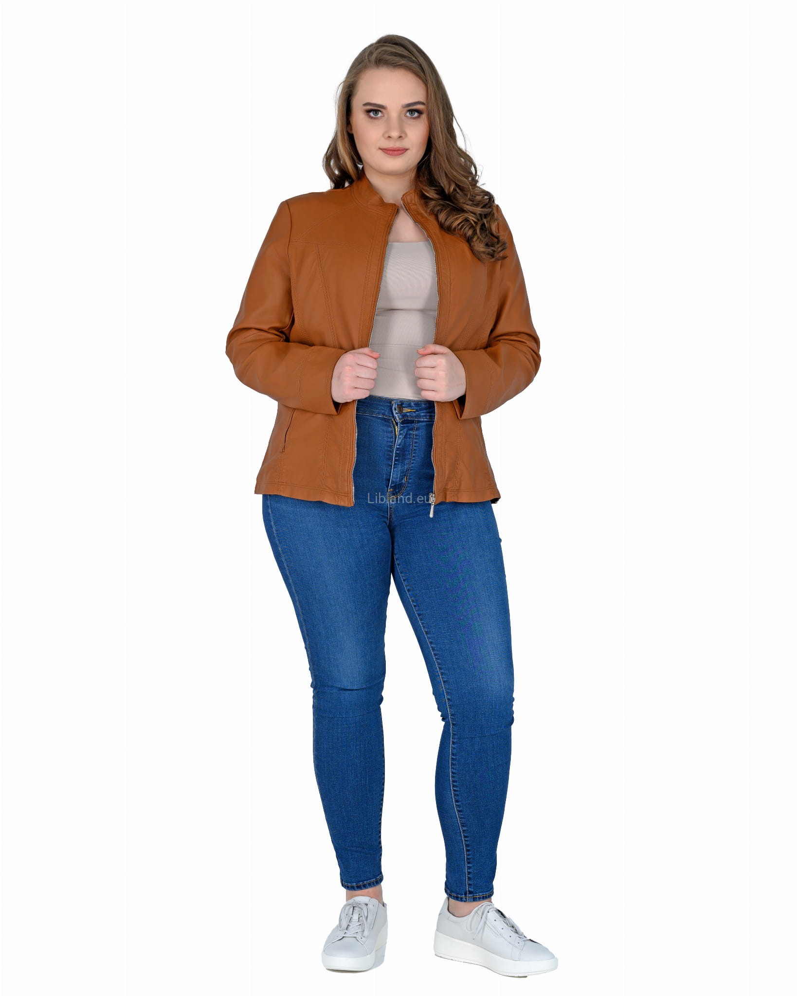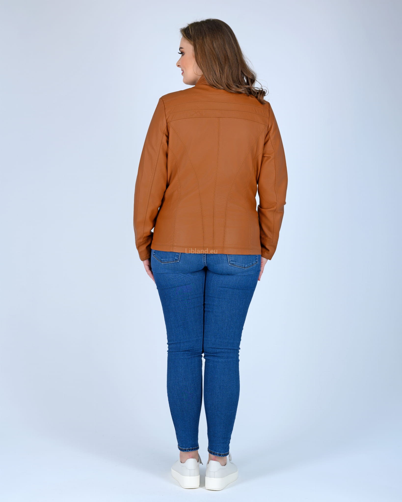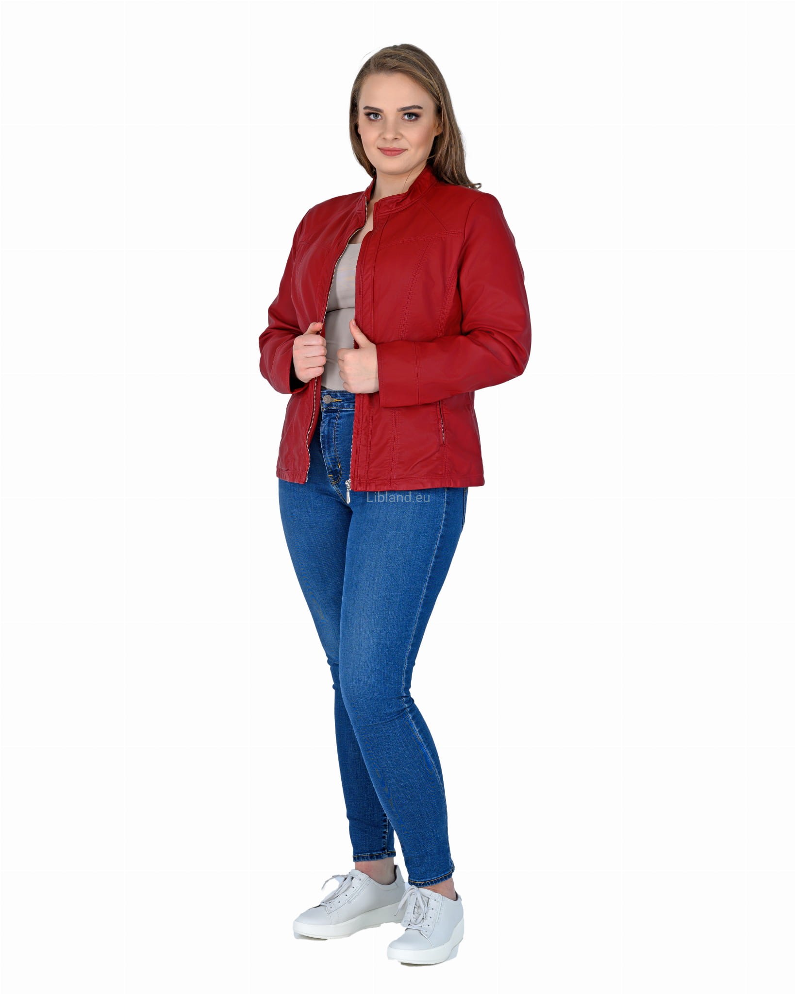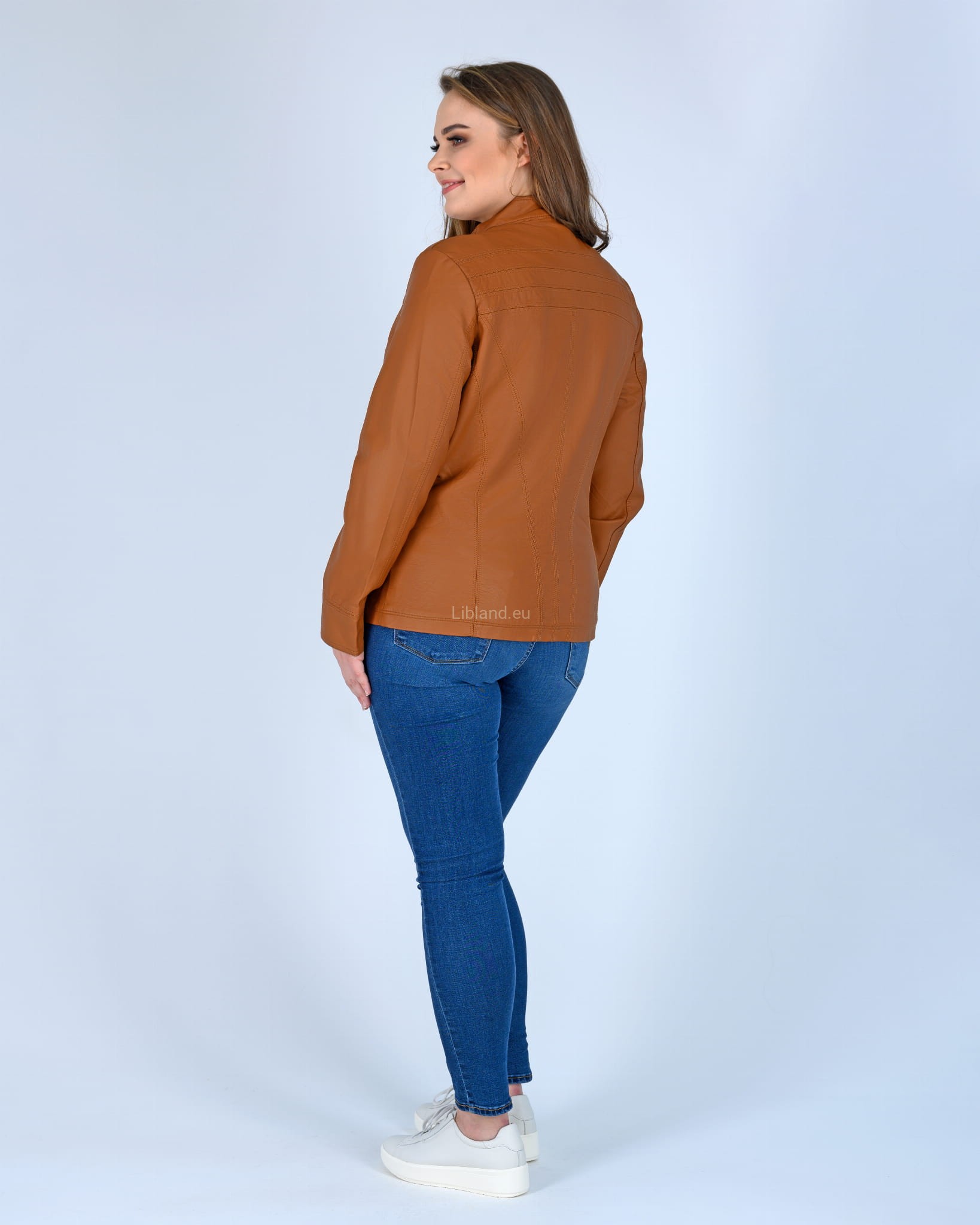 Kurtka z ekologicznej skóry ze stójką i krytym suwakiem.