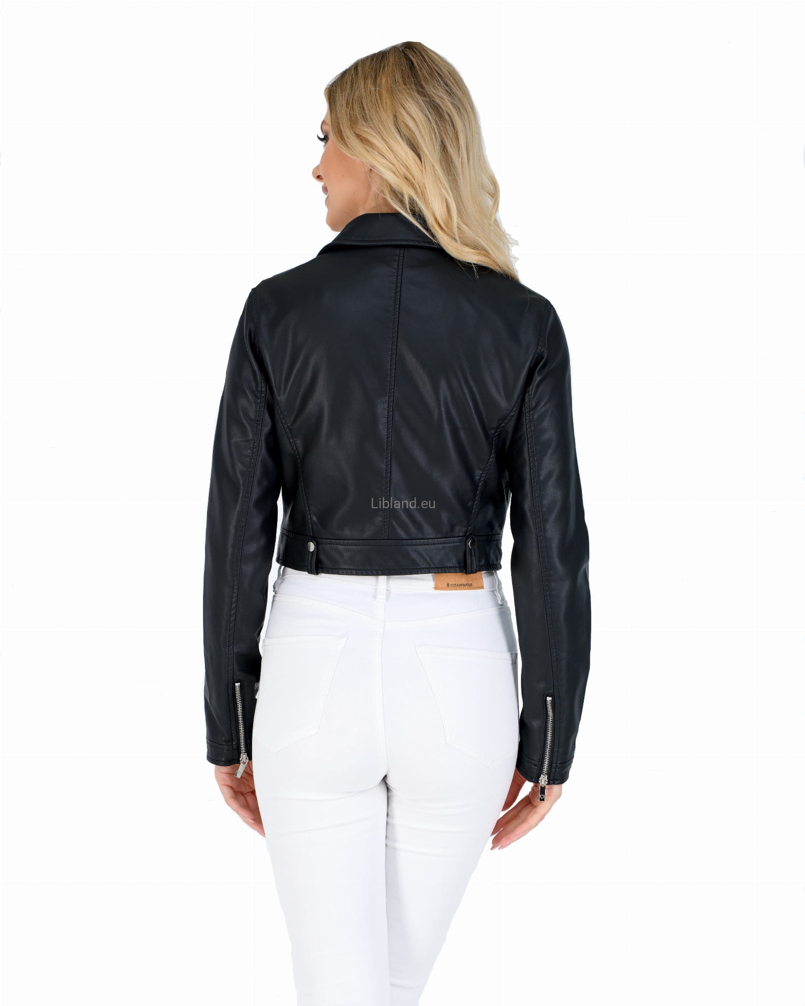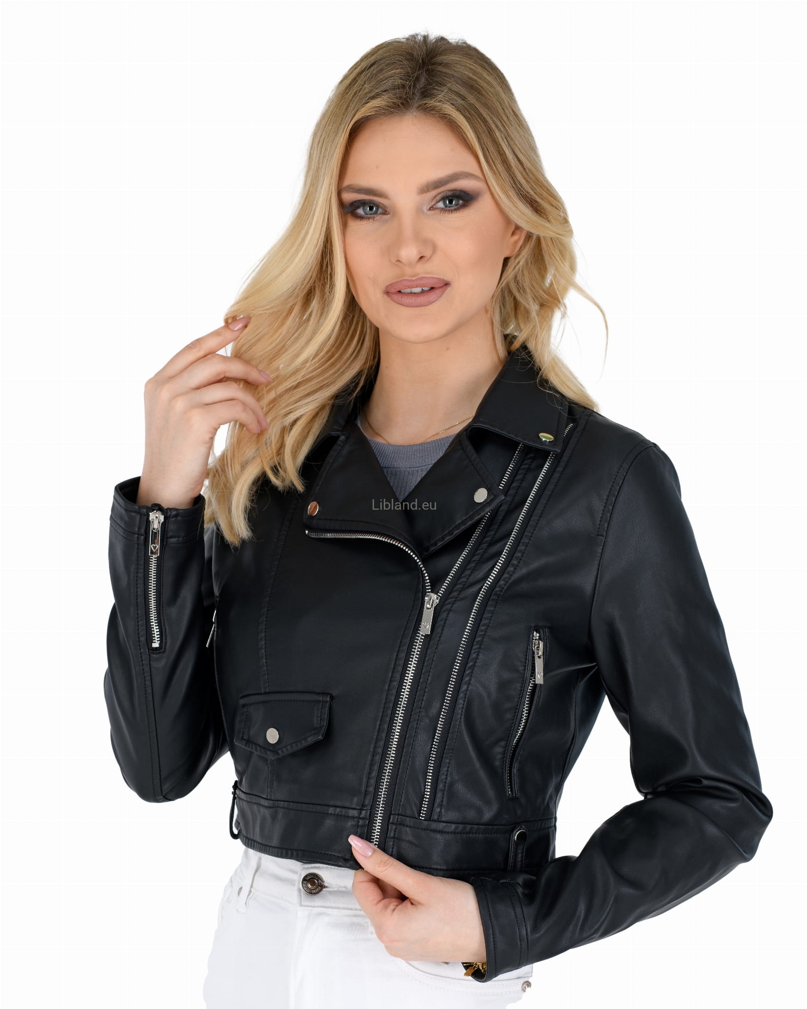 Krótka kurtka ramoneska asymetrycznie zasuwana z podwójnymi suwakami na przodzie.