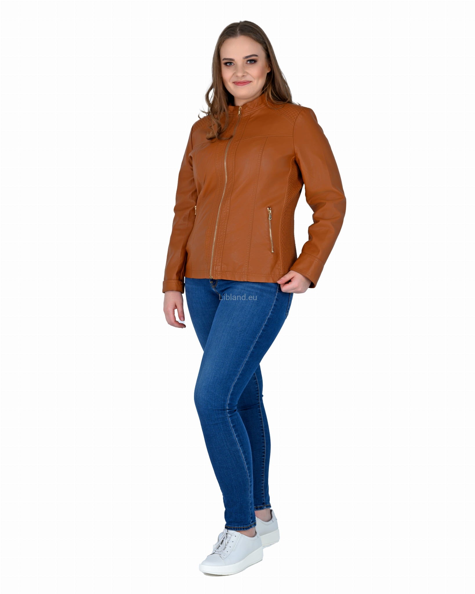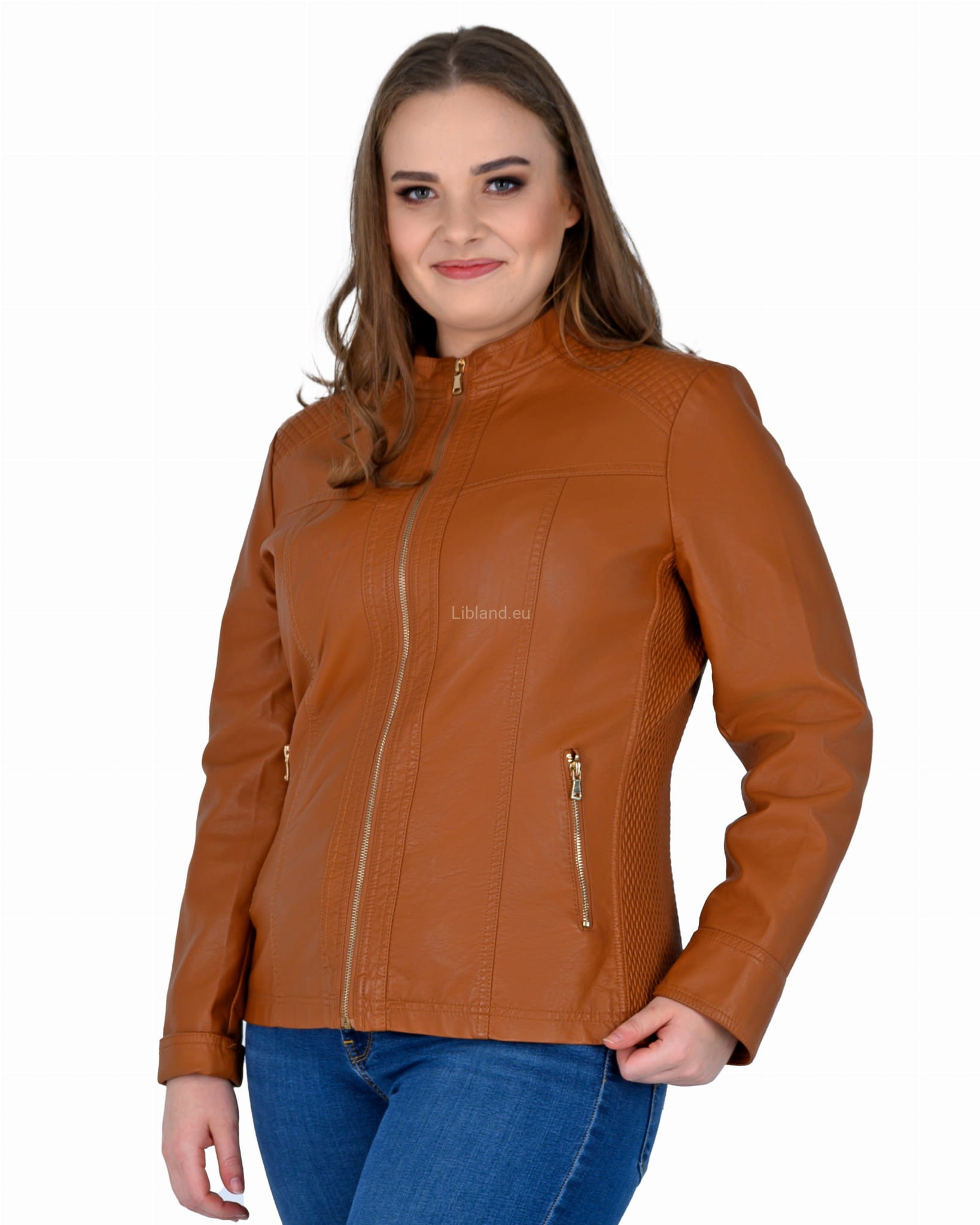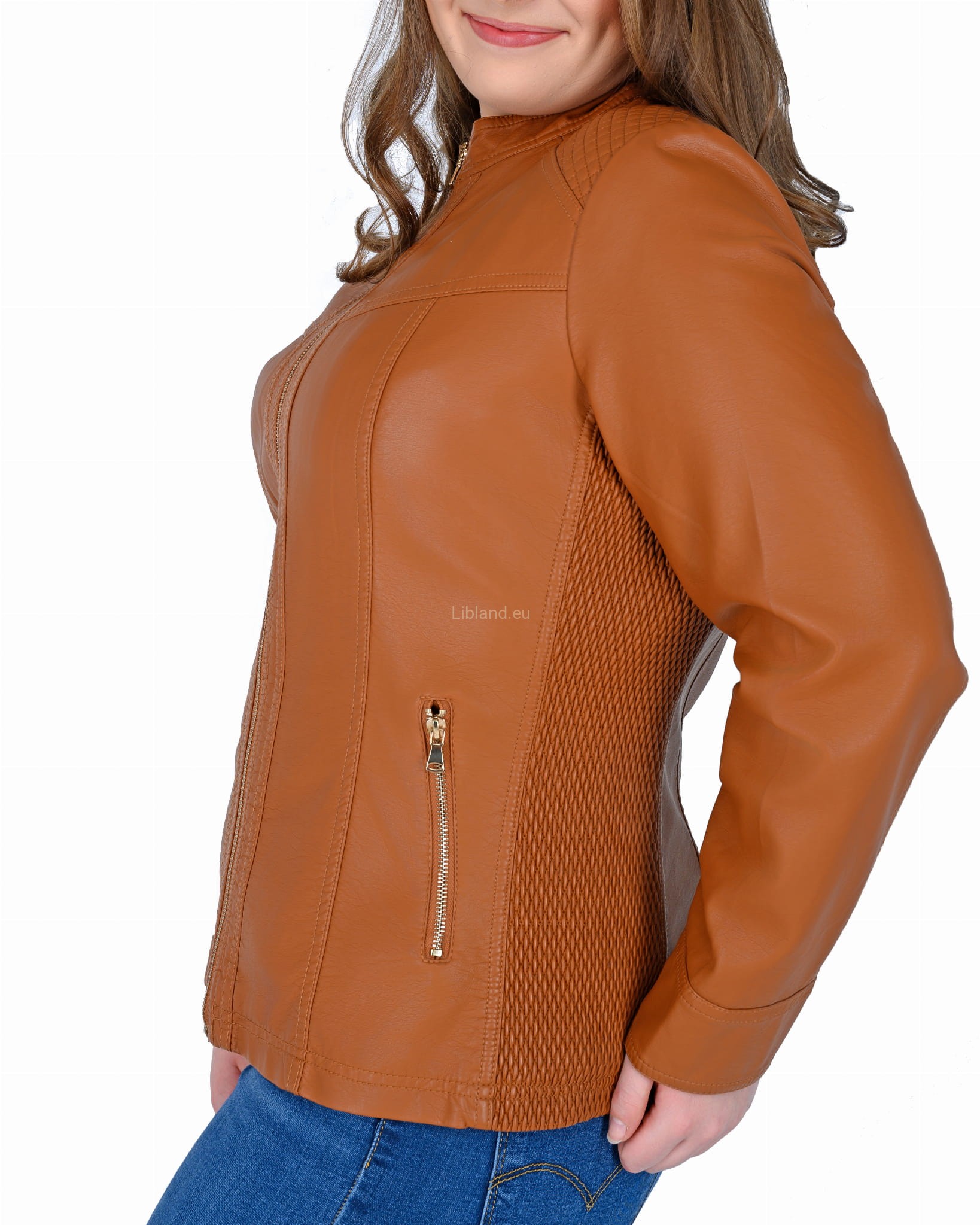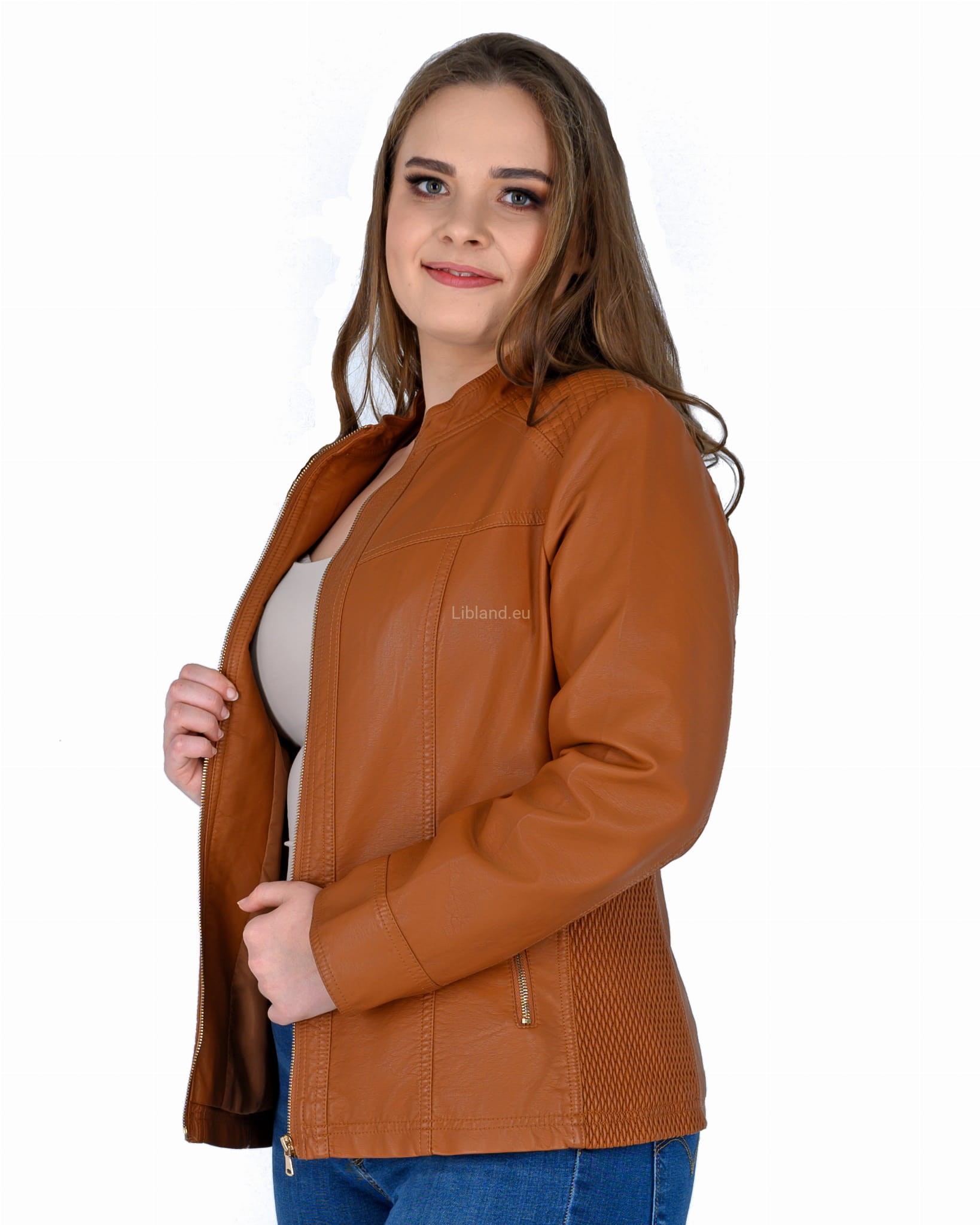 Krótka kurtka z ekologicznej skóry z metalowymi suwakami i ściągaczami po bokach: