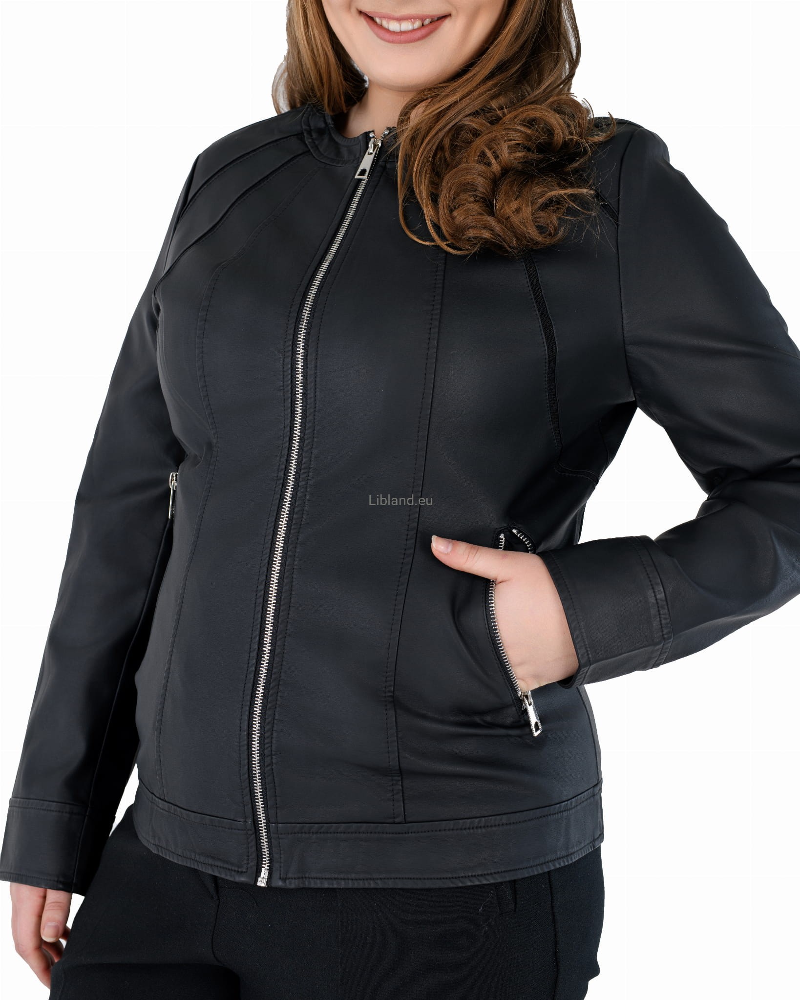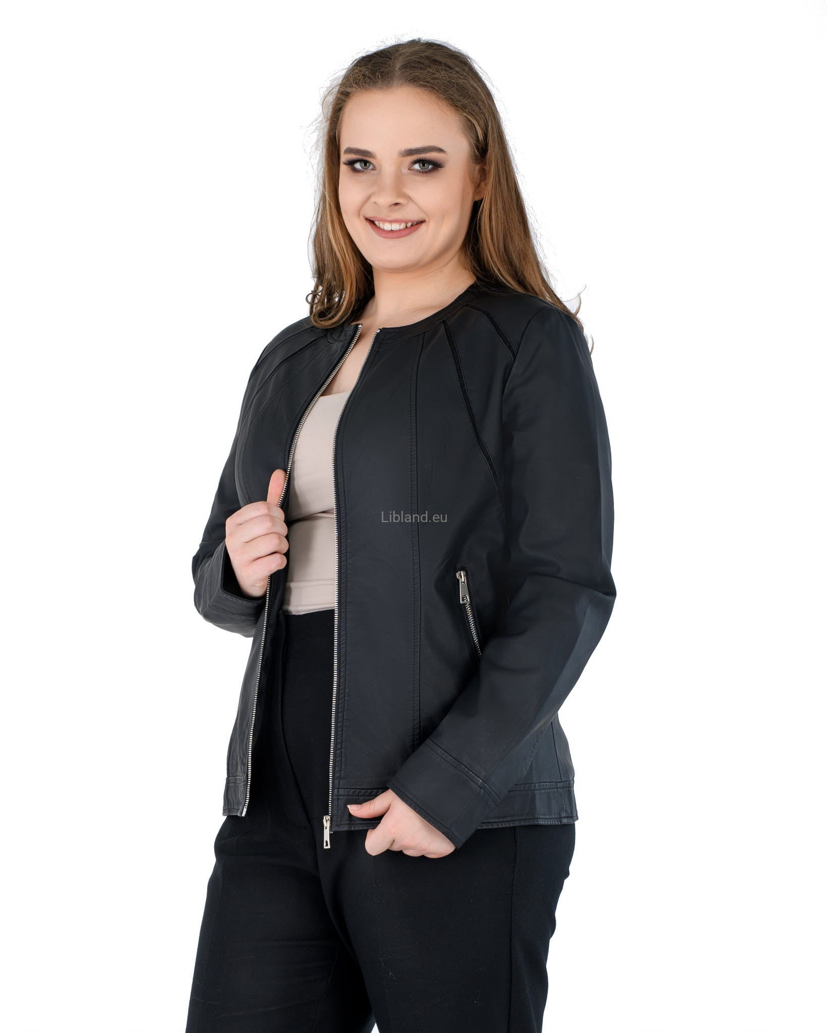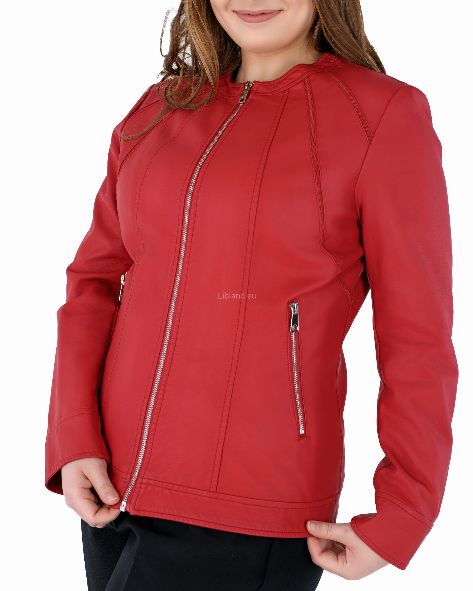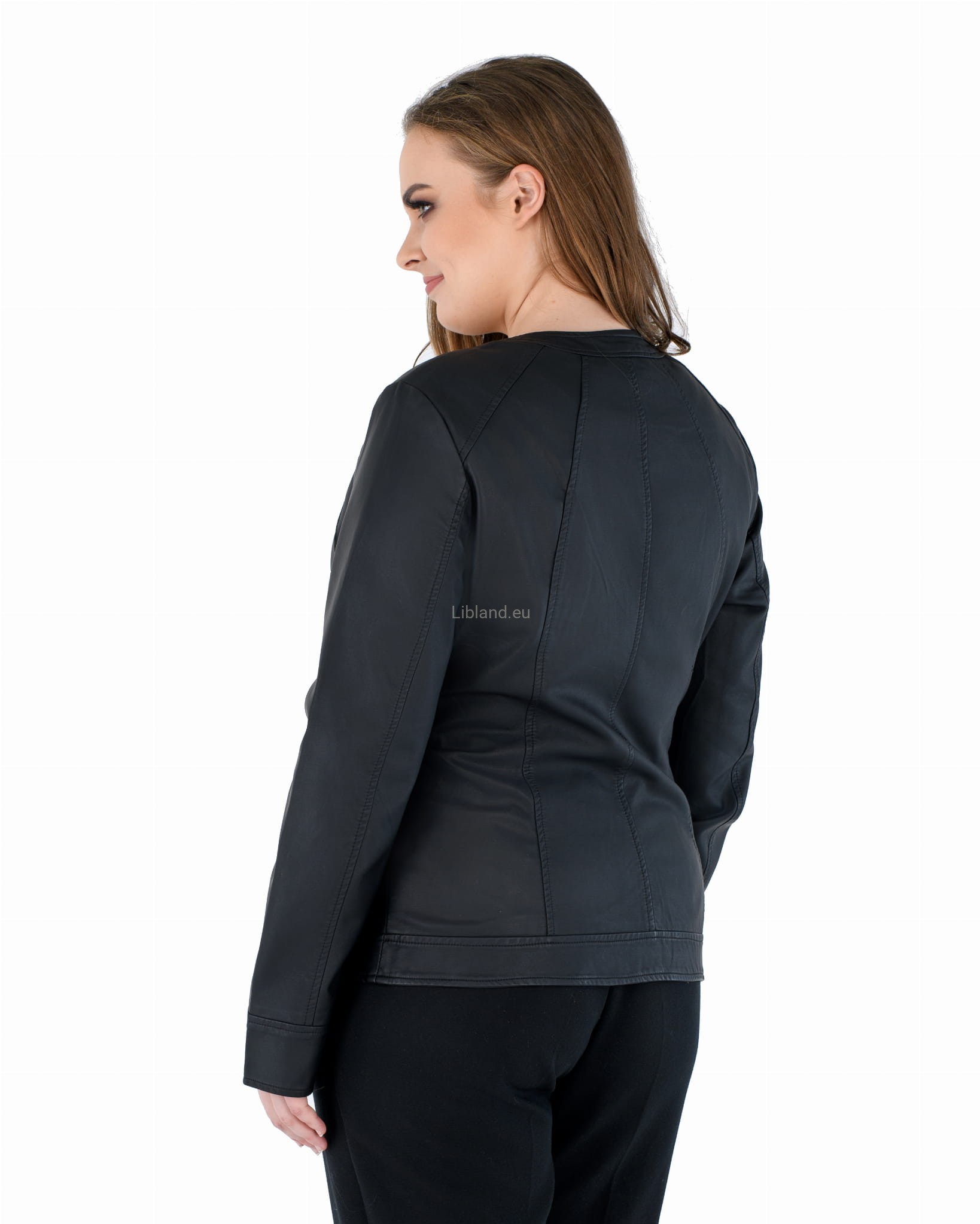 Kurtka z ekologicznej skóry zasuwana na suwak i z okrągłym wykończeniem pod szyją.