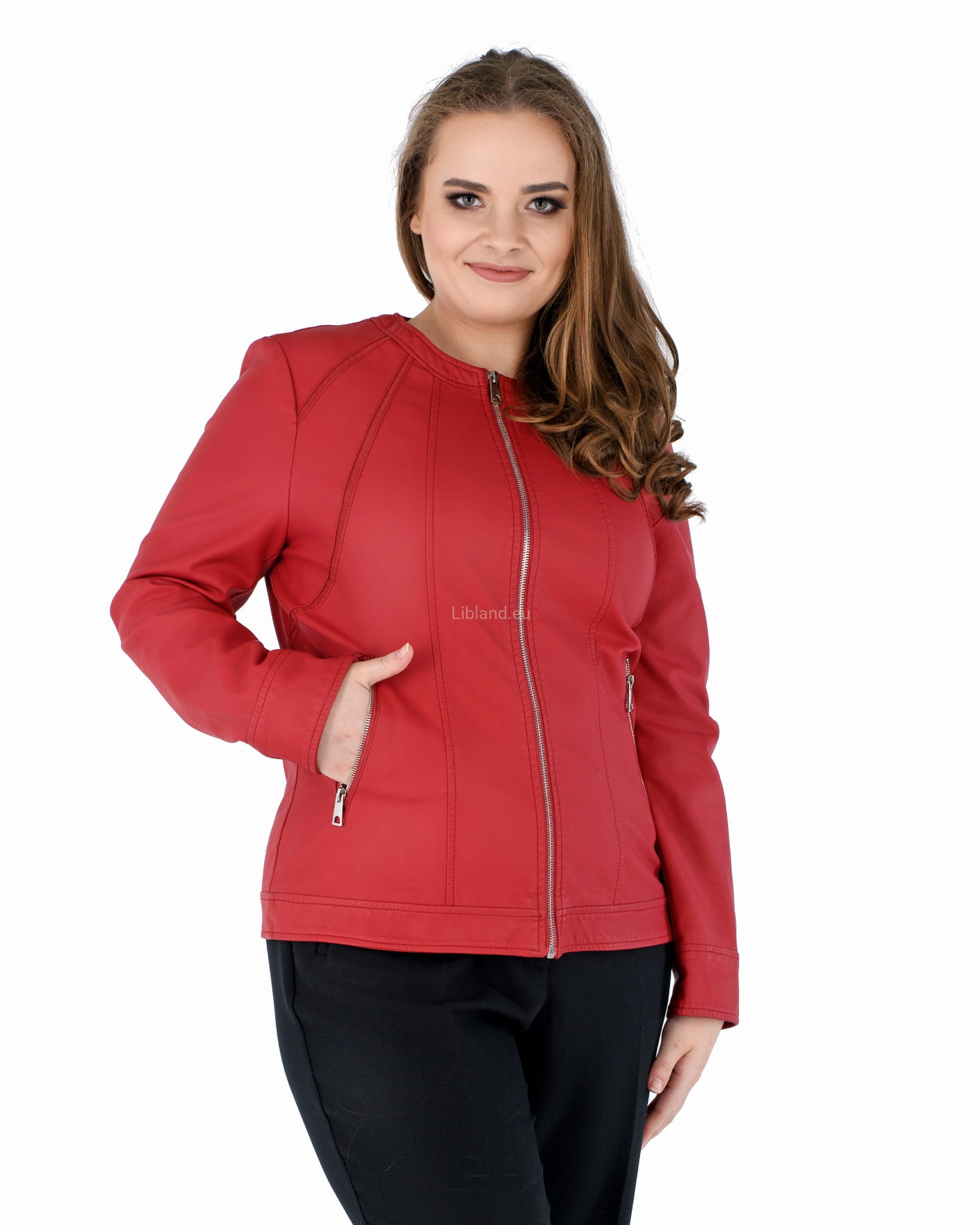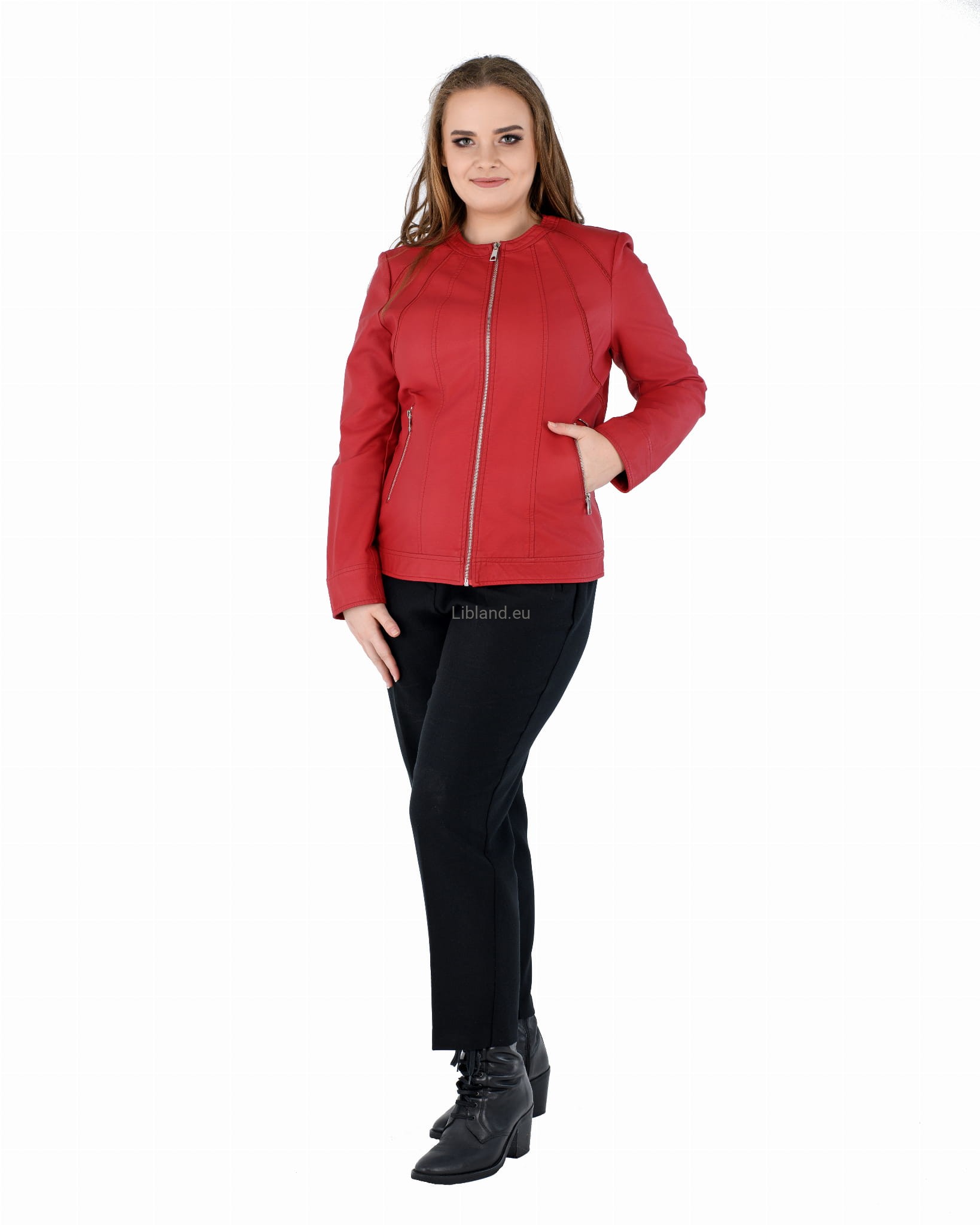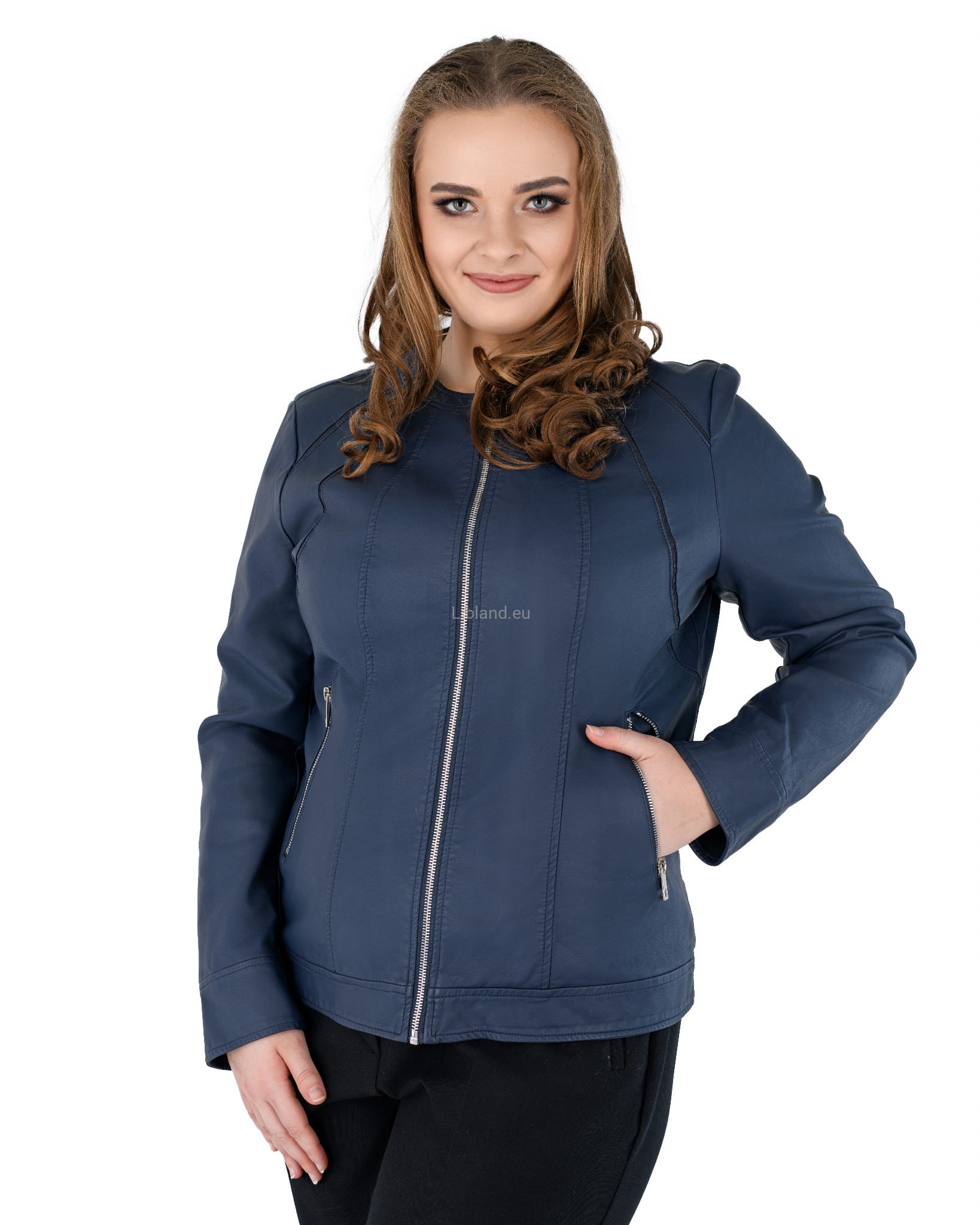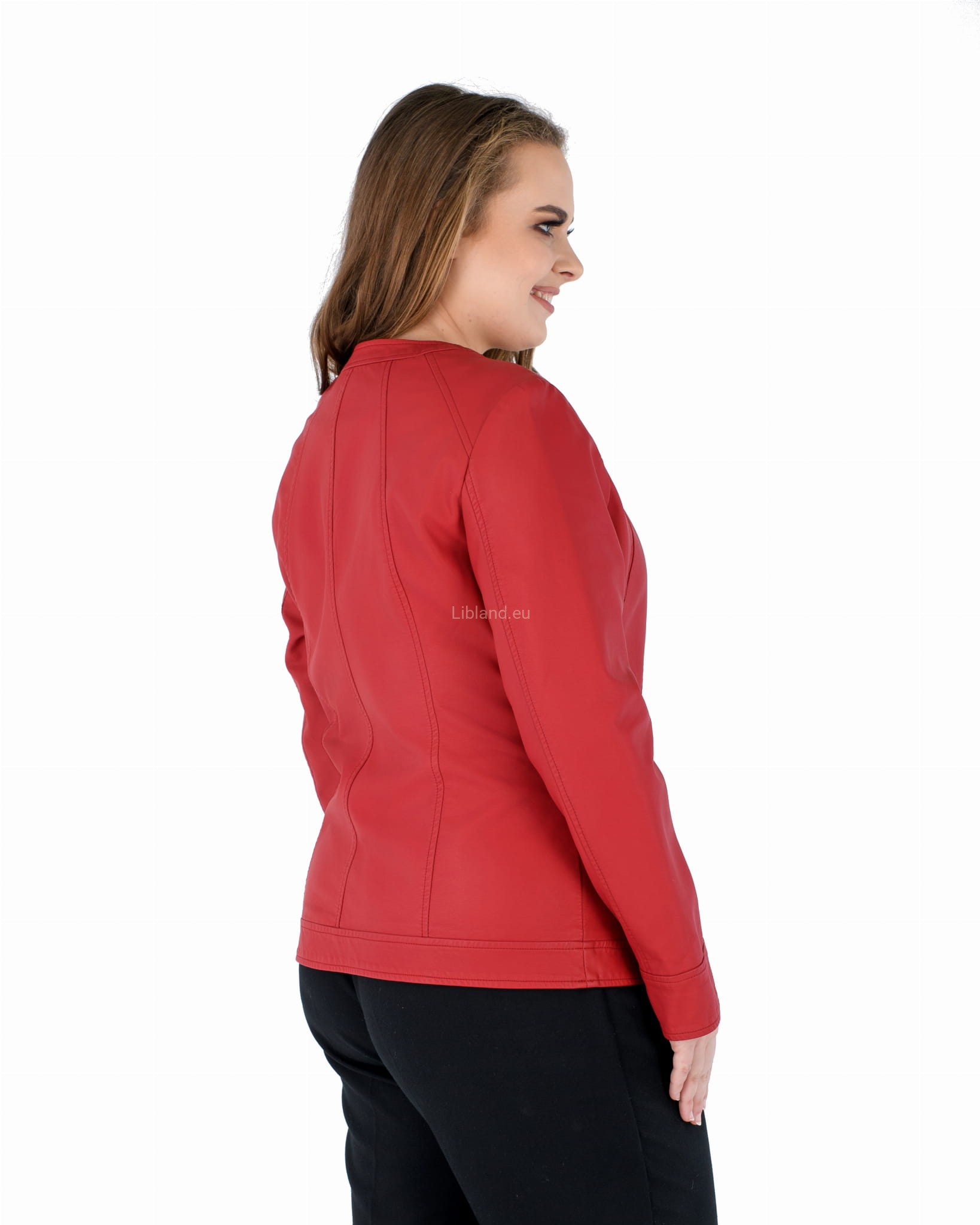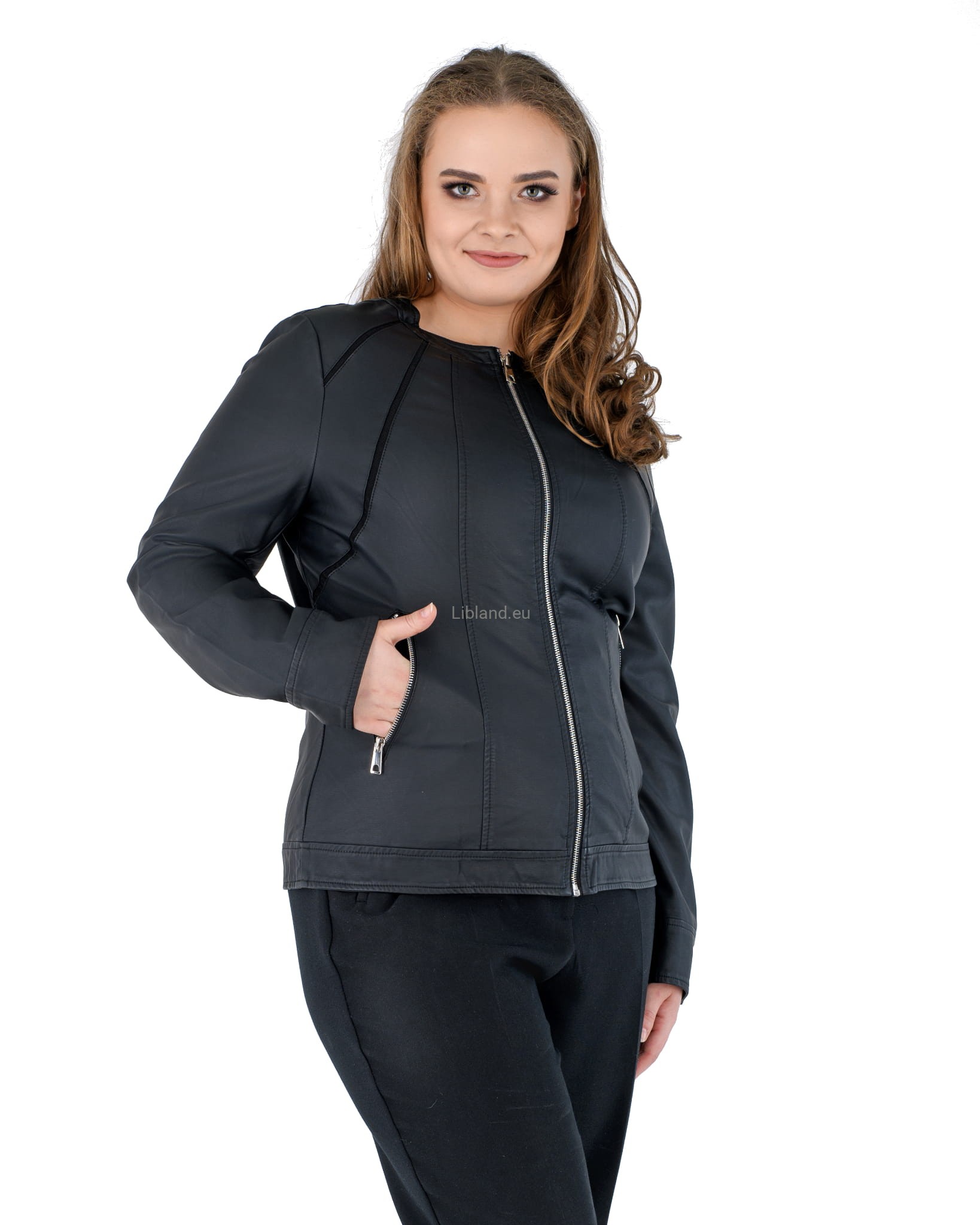 Kurtka z ekologicznej skóry zasuwana na suwak i z okrągłym wykończeniem pod szyją.