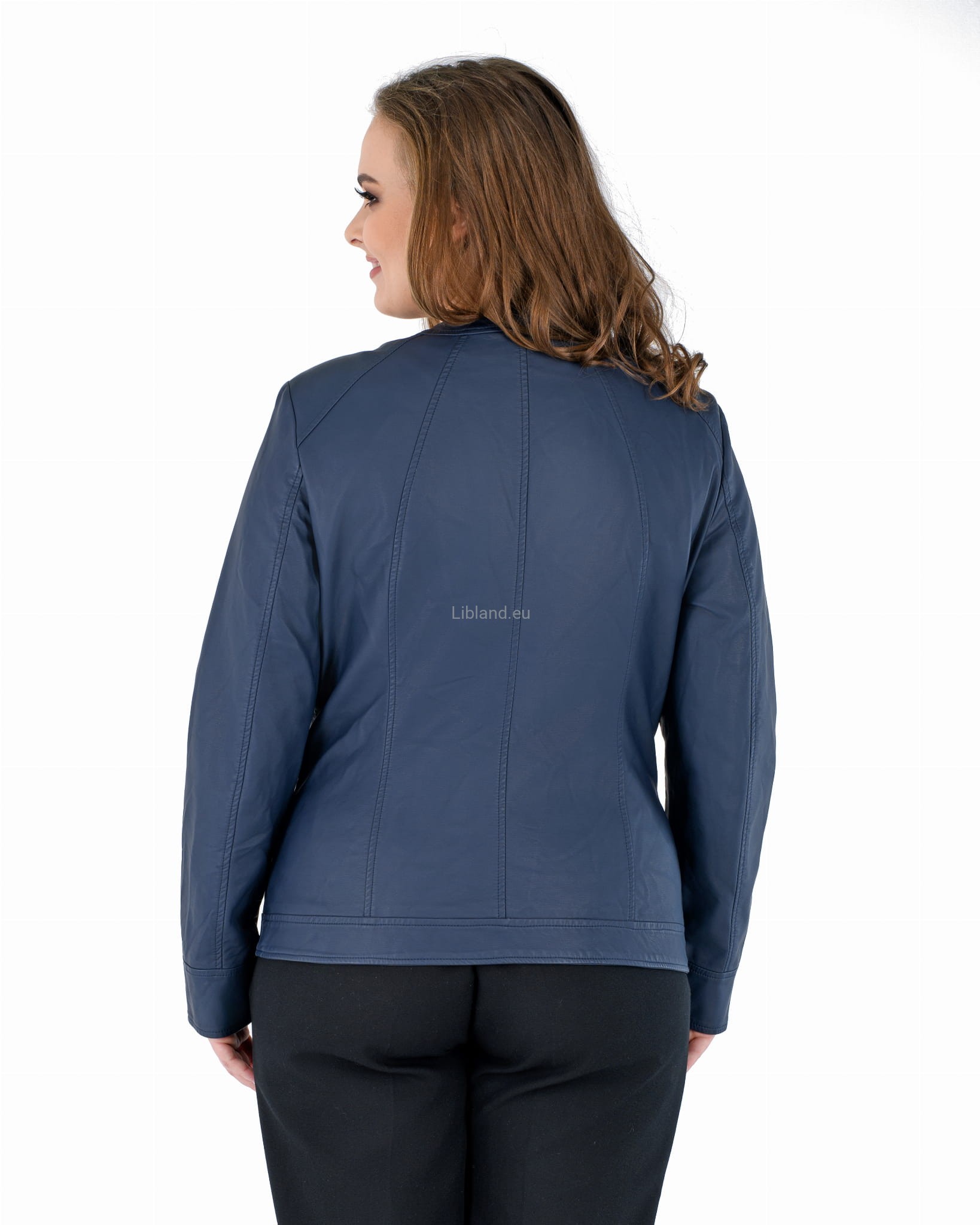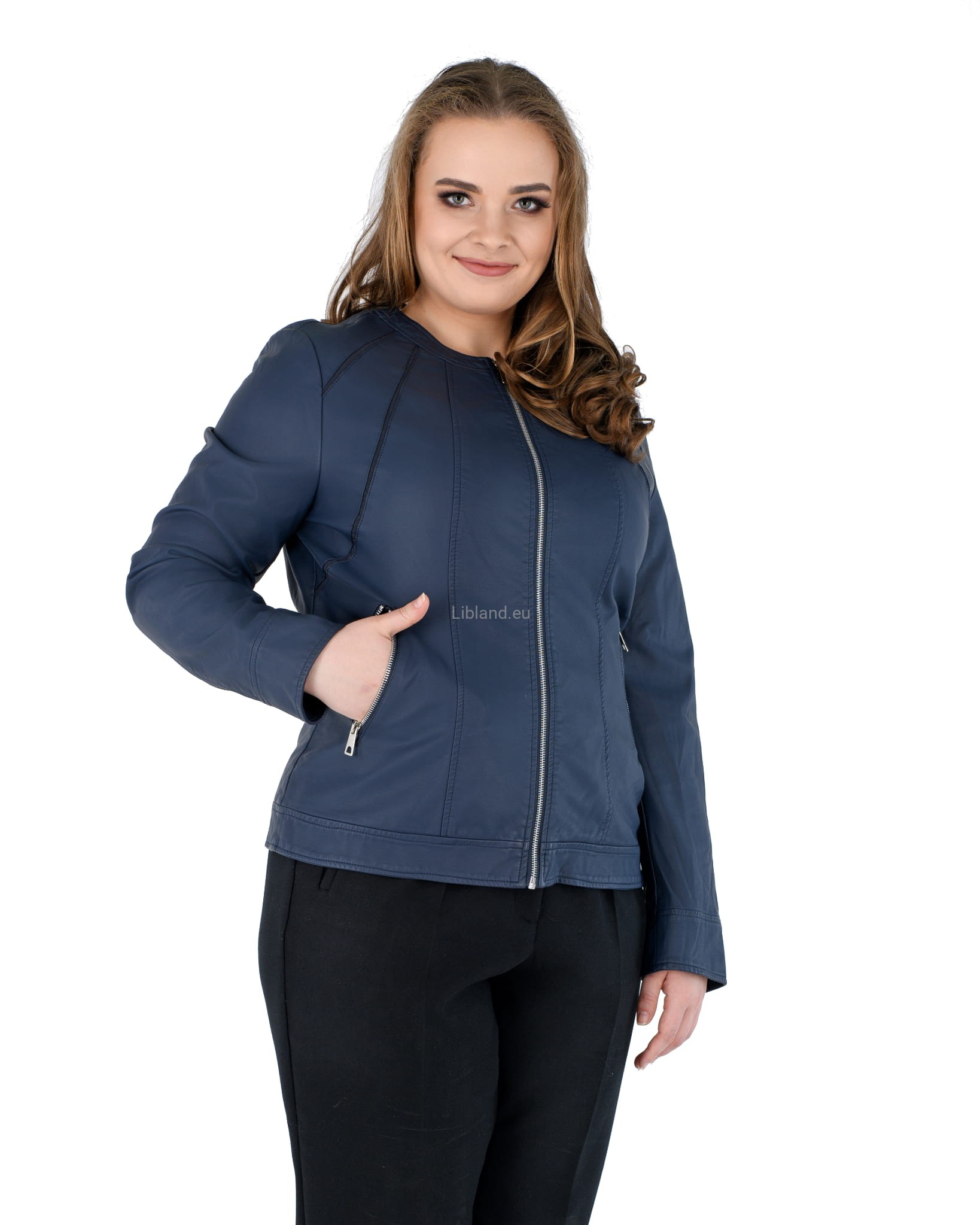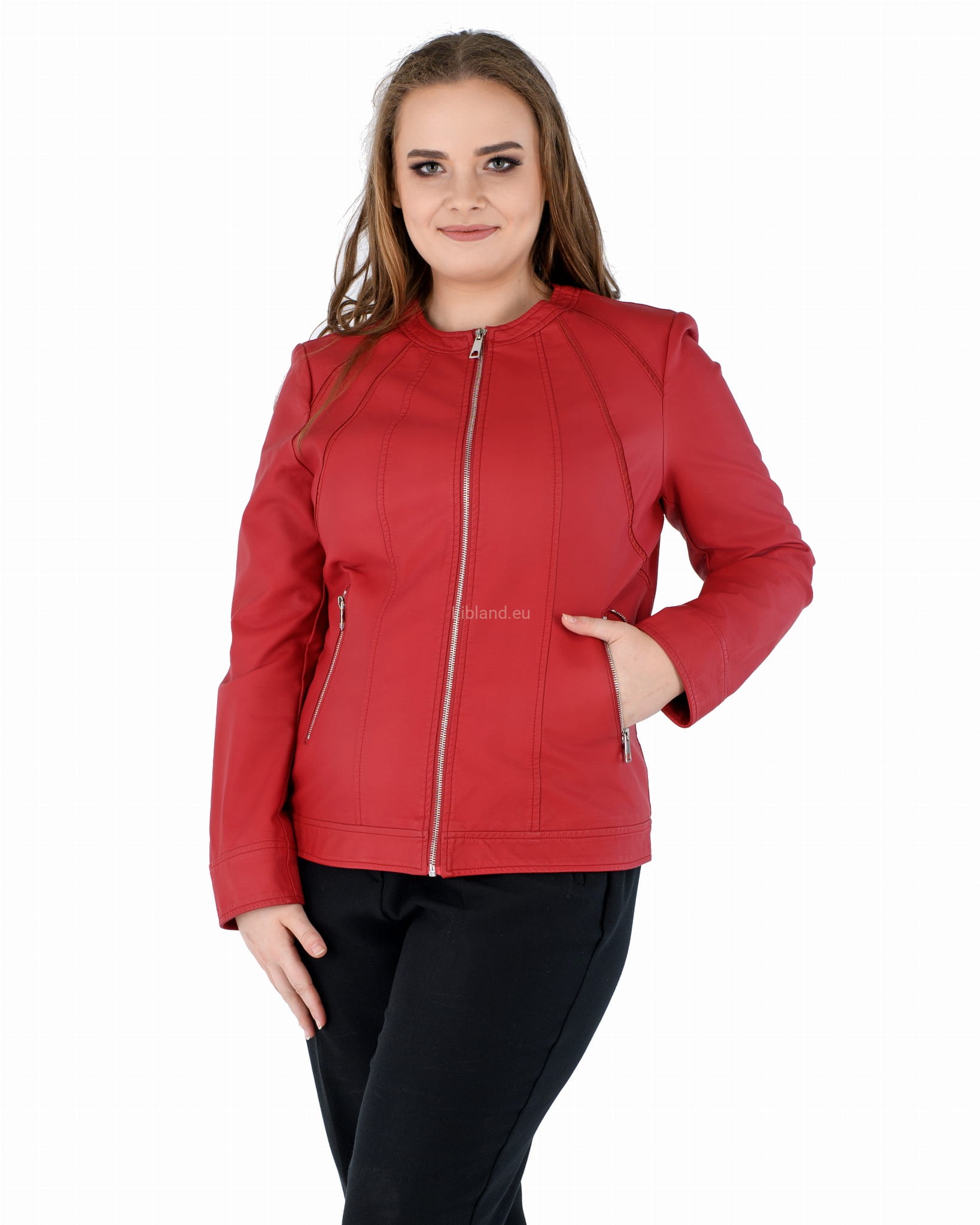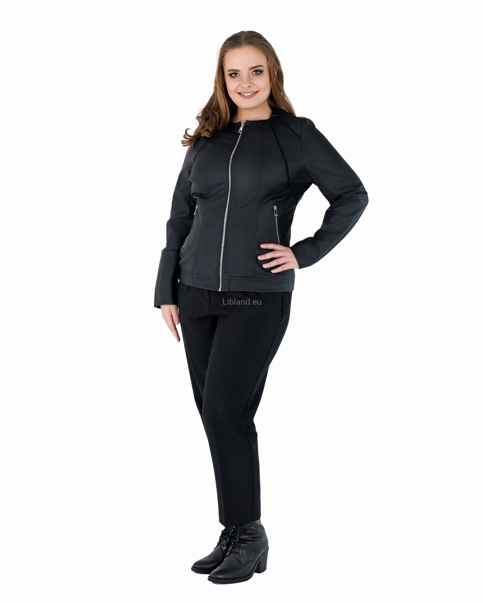Kurtka z ekologicznej skóry zasuwana na suwak i z okrągłym wykończeniem pod szyją.