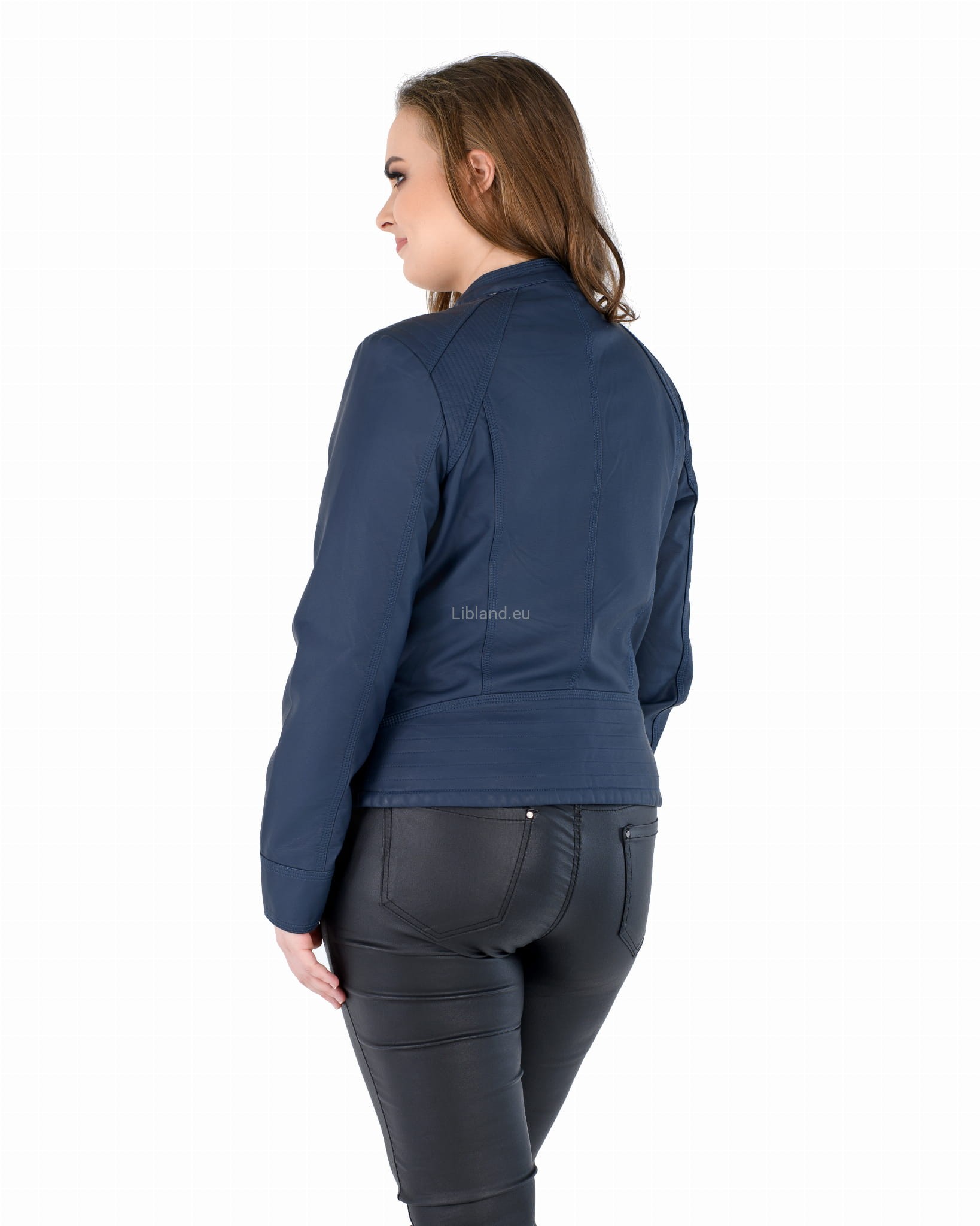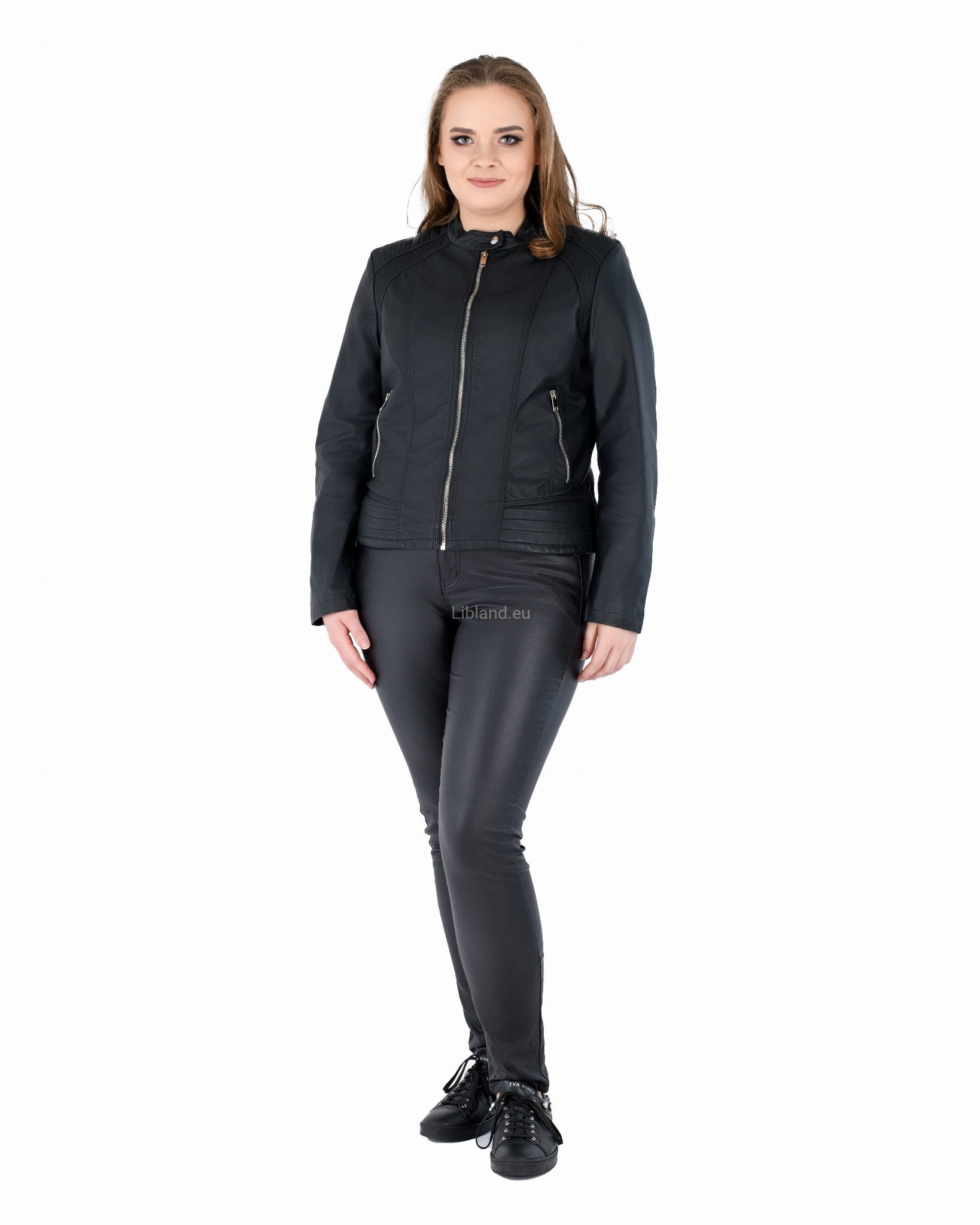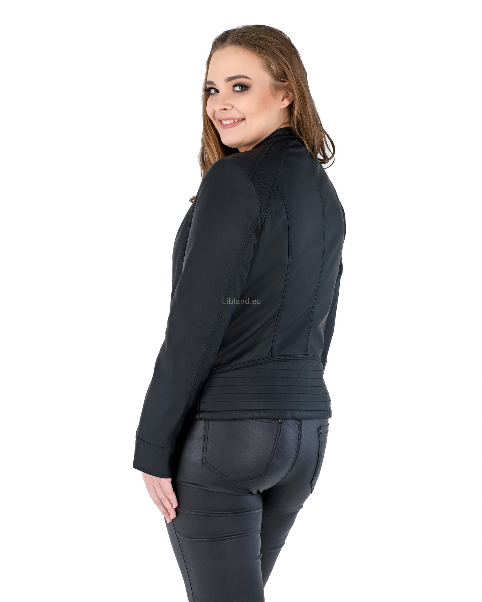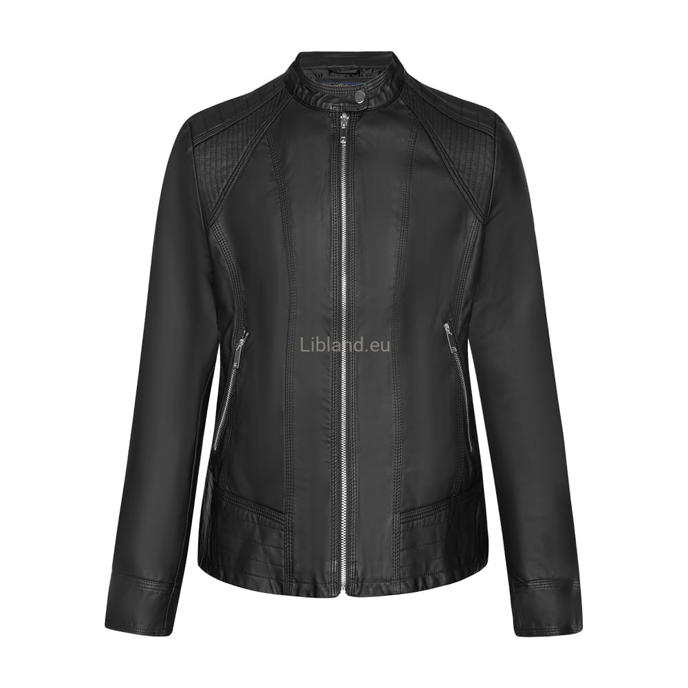 Kurtka ze skóry ekologicznej z szeroką pikowana listwą na dole i zapinaną stójką: