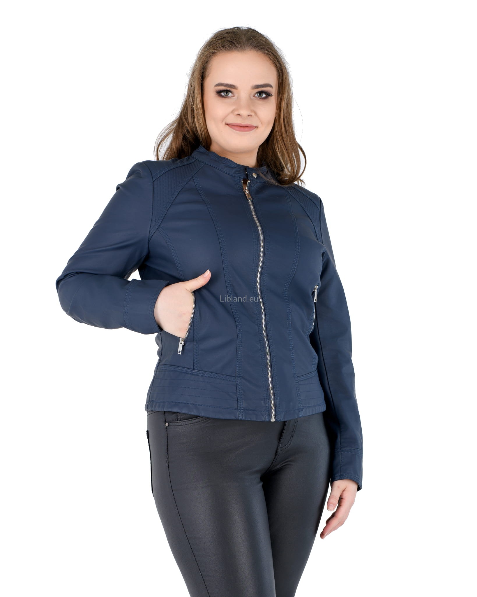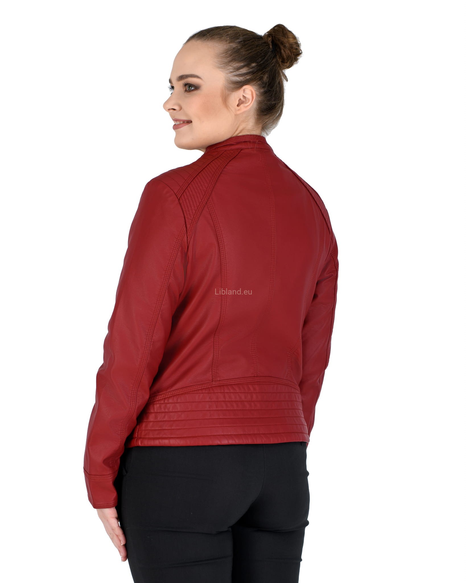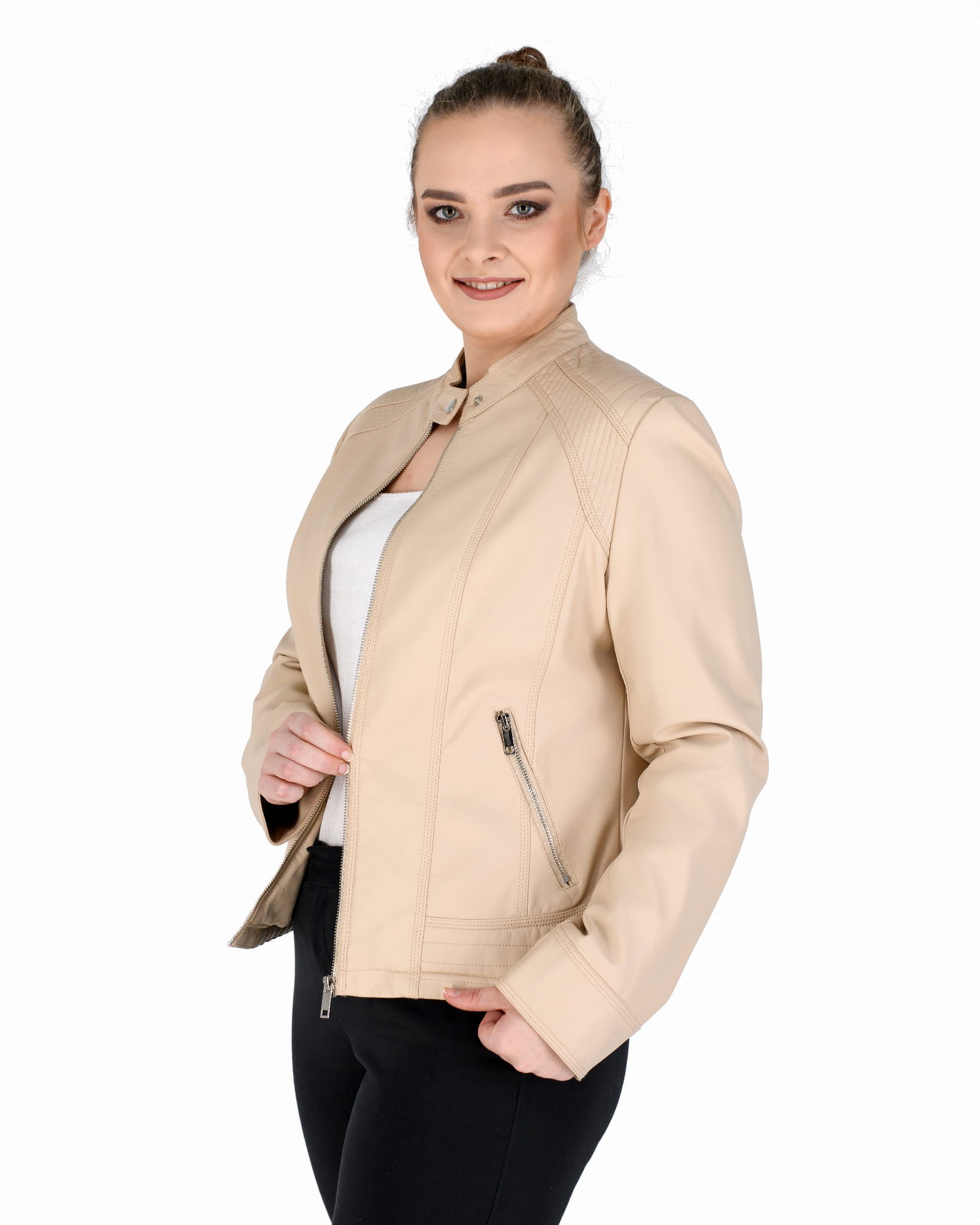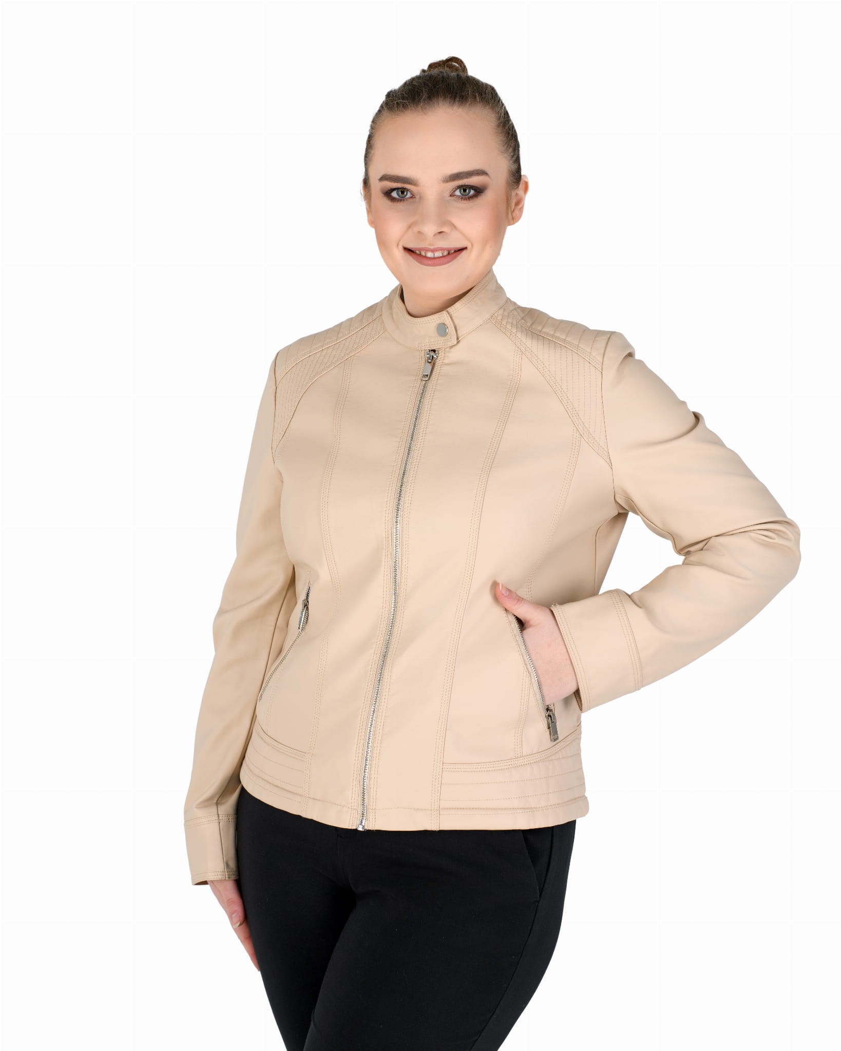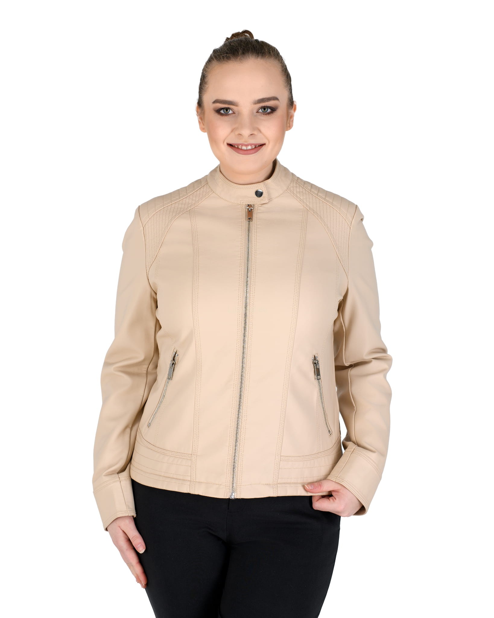 Kurtka ze skóry ekologicznej z szeroką pikowana listwą na dole i zapinaną stójką: