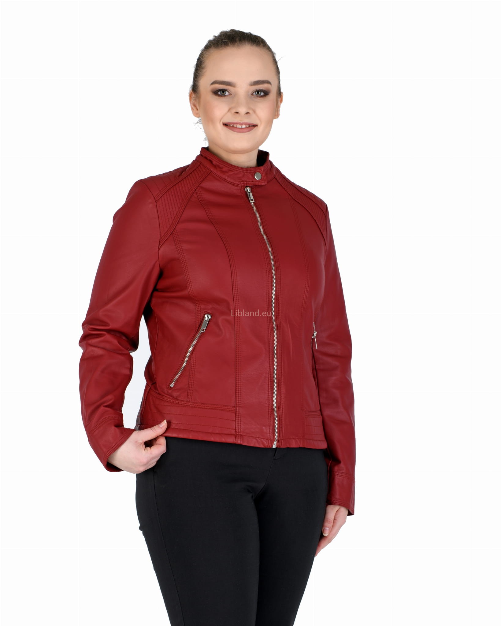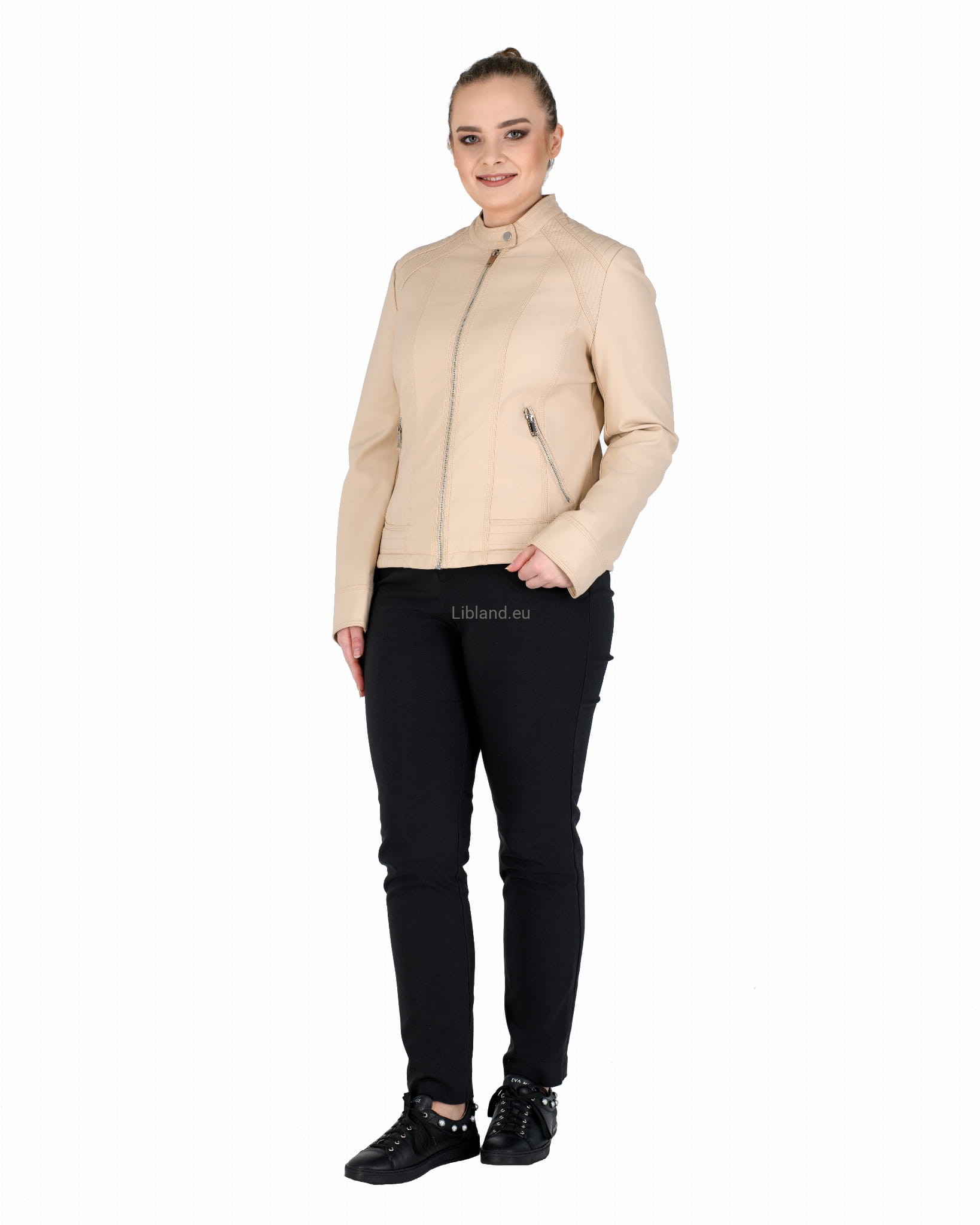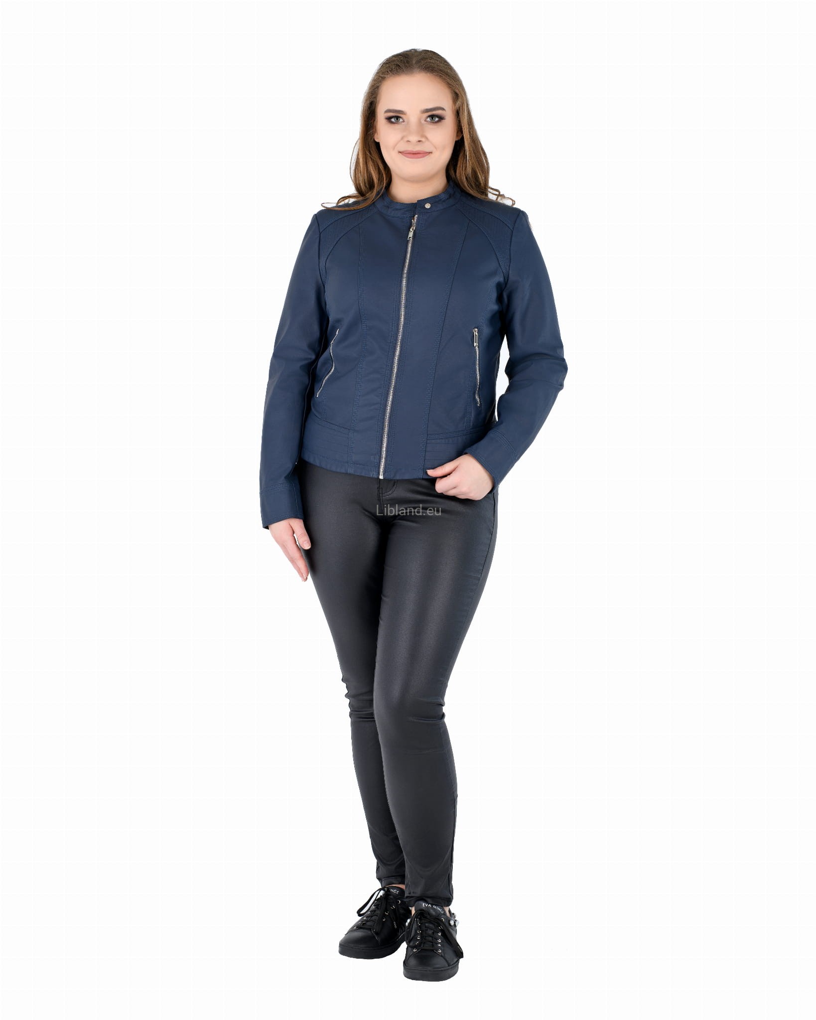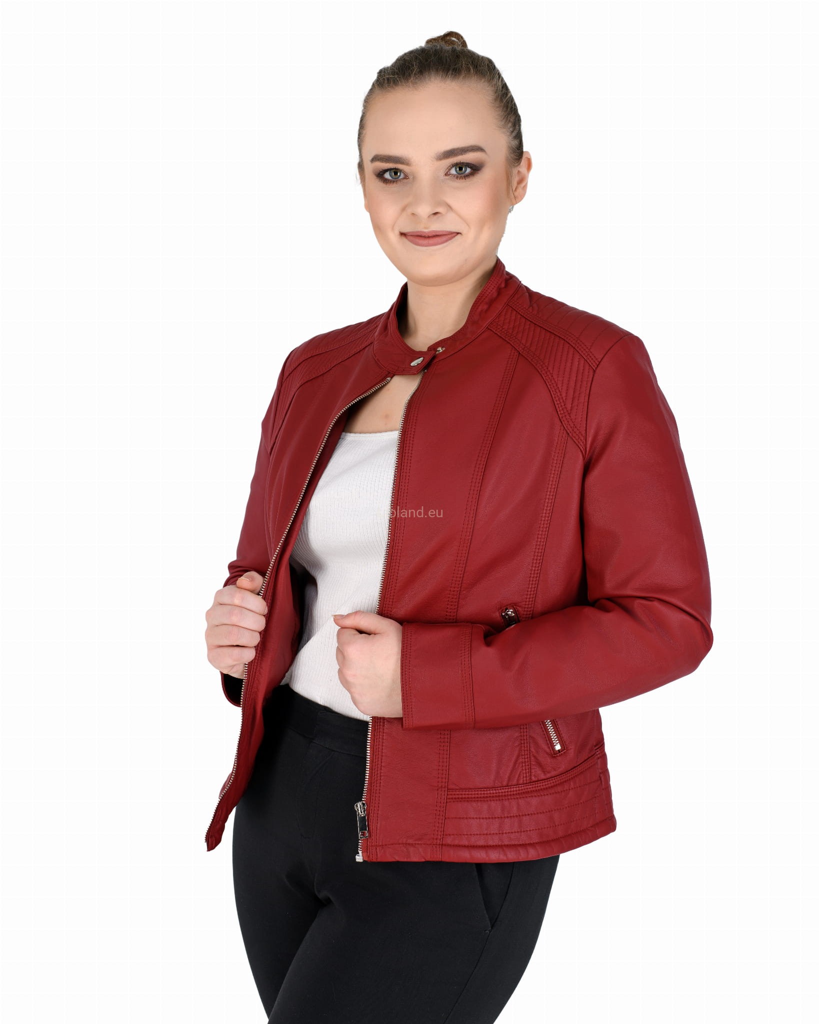 Kurtka ze skóry ekologicznej z szeroką pikowana listwą na dole i zapinaną stójką: