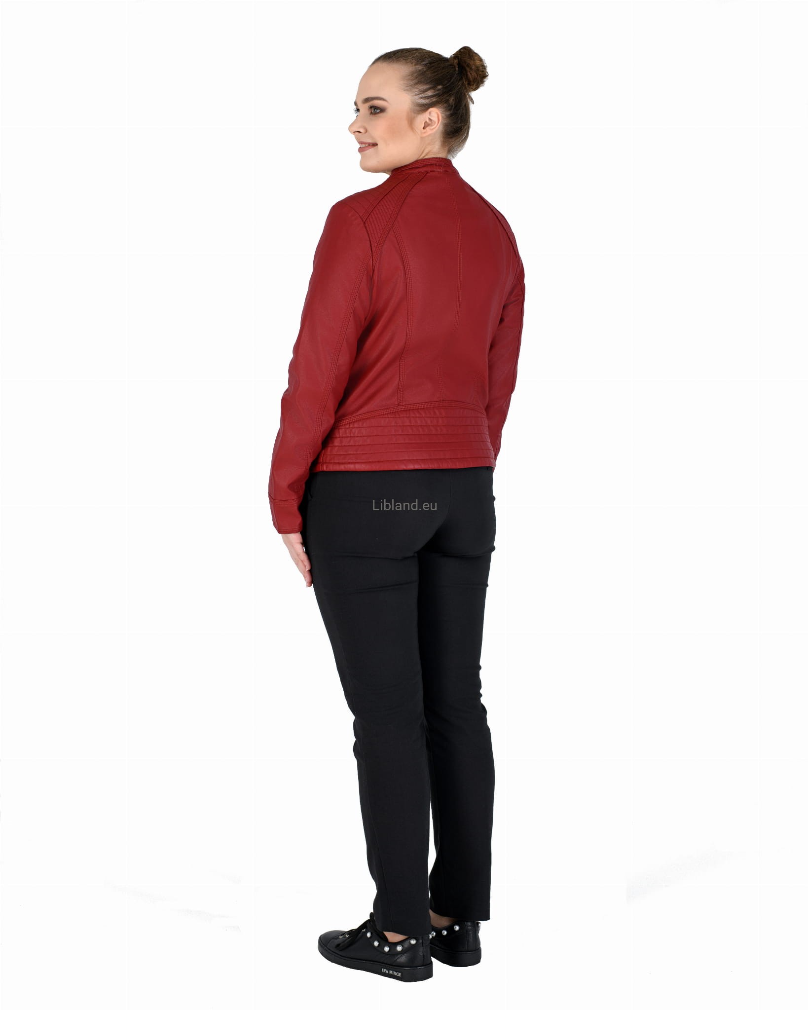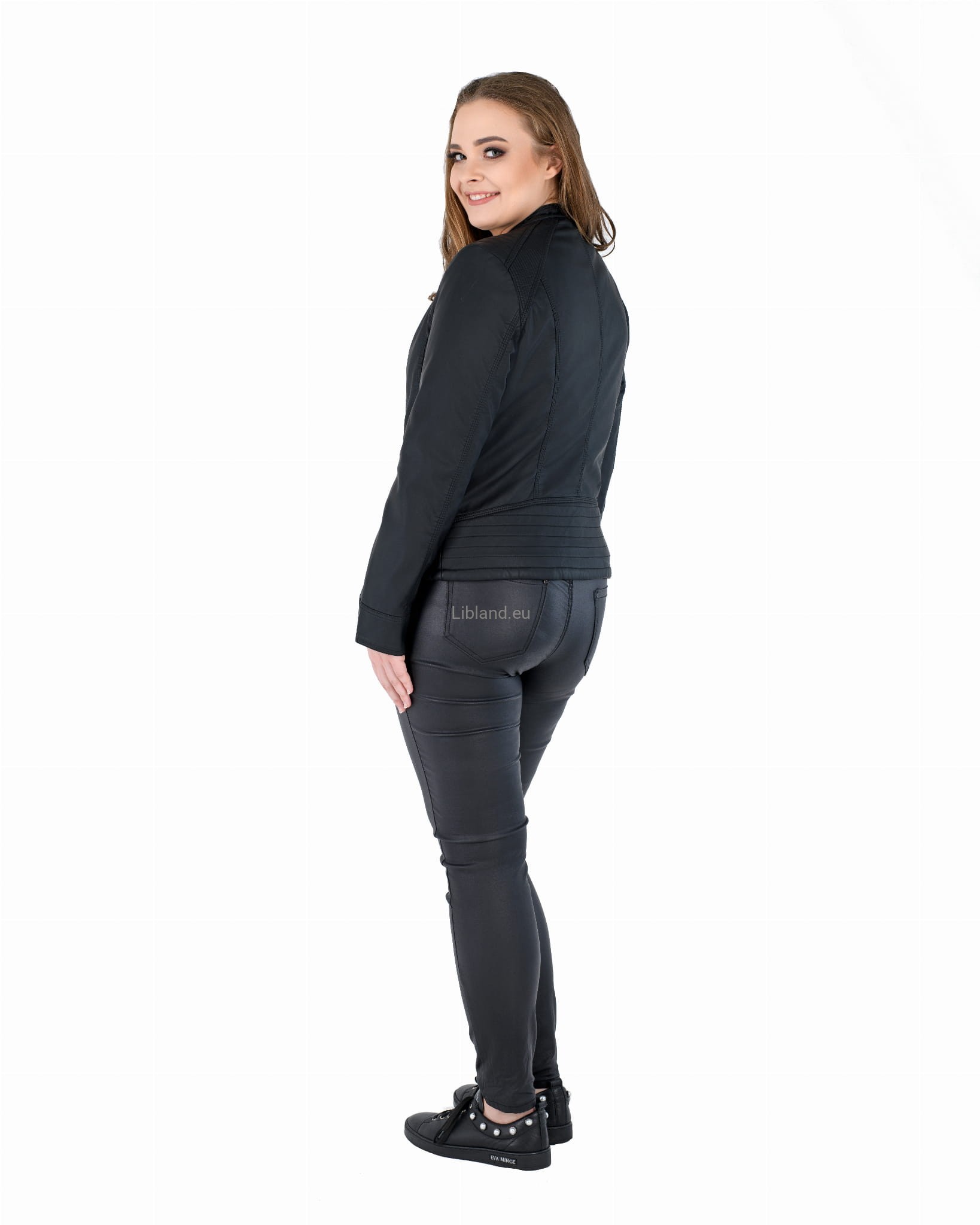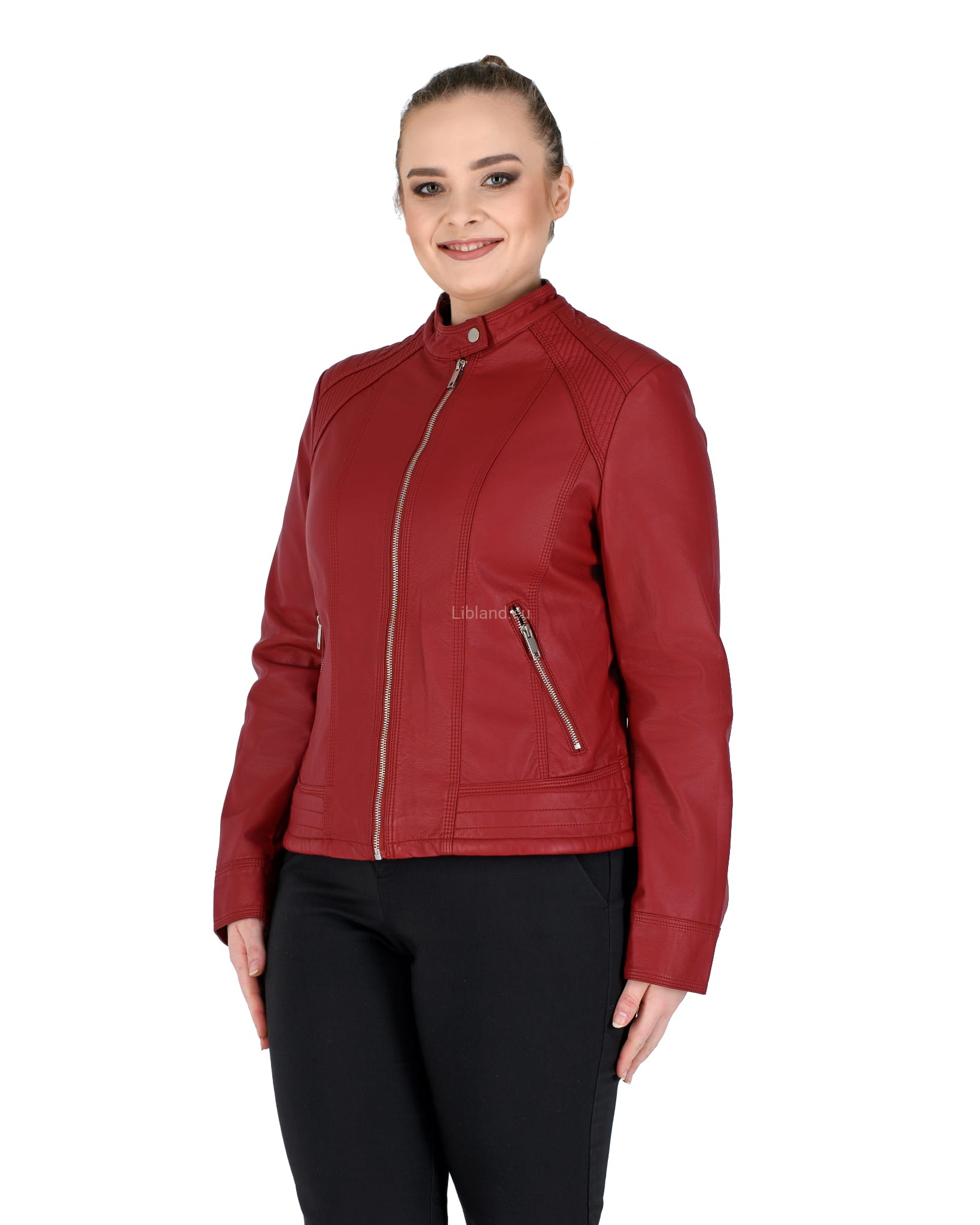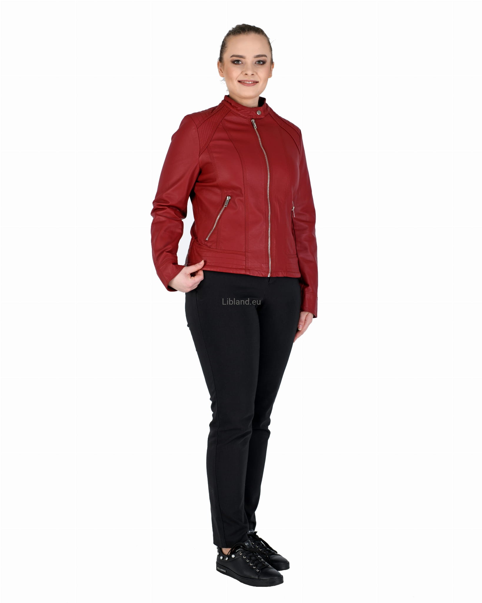 Kurtka ze skóry ekologicznej z szeroką pikowana listwą na dole i zapinaną stójką: