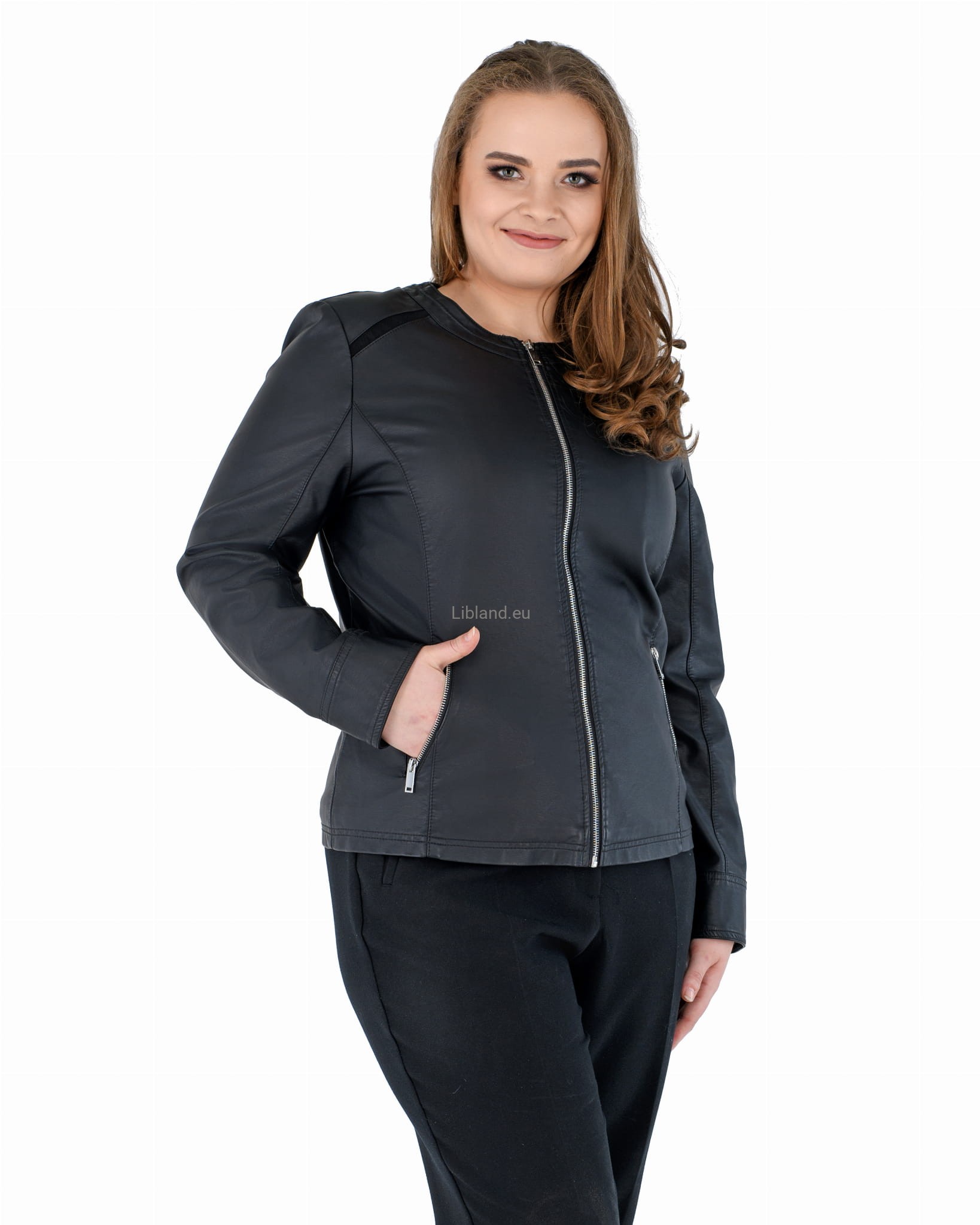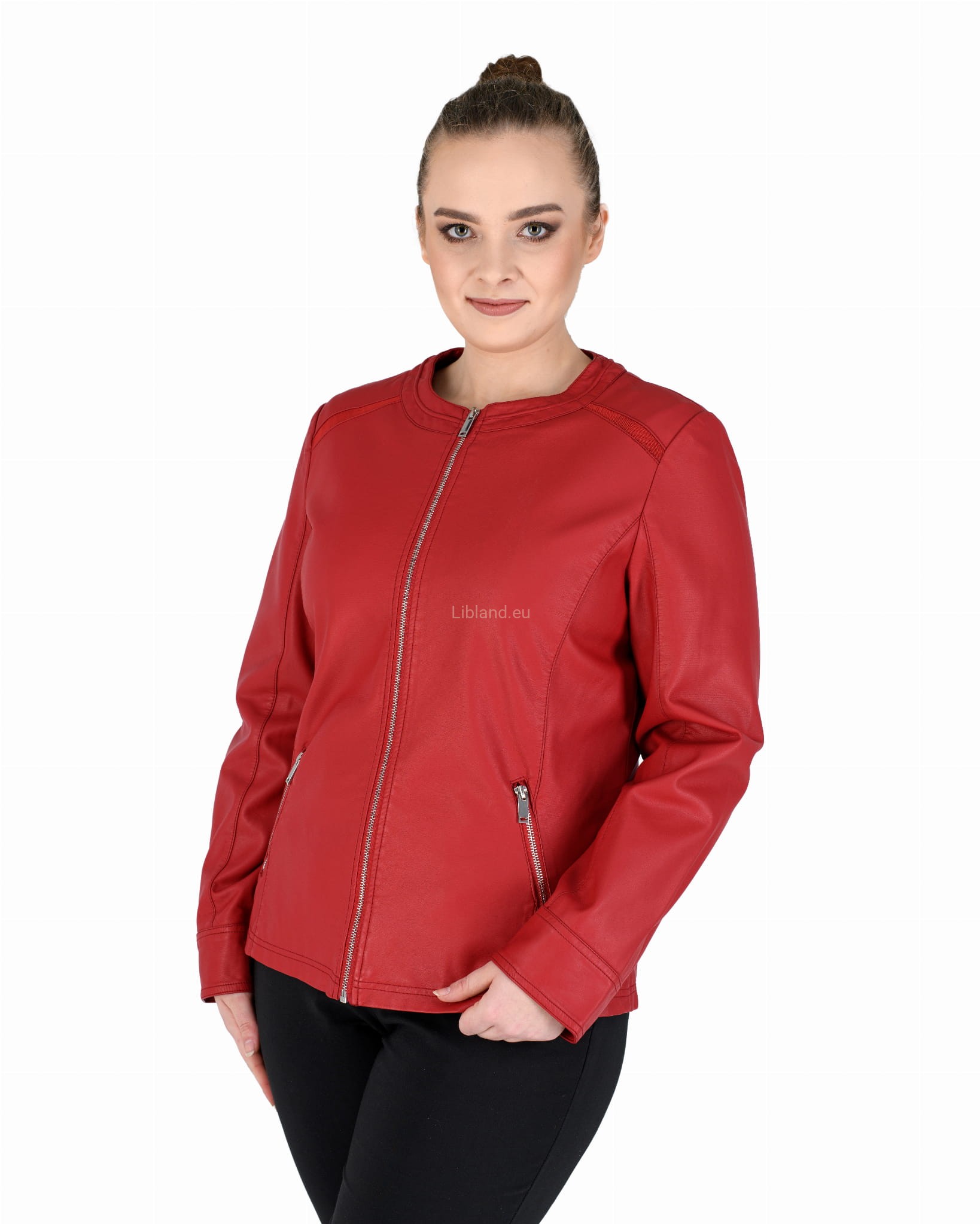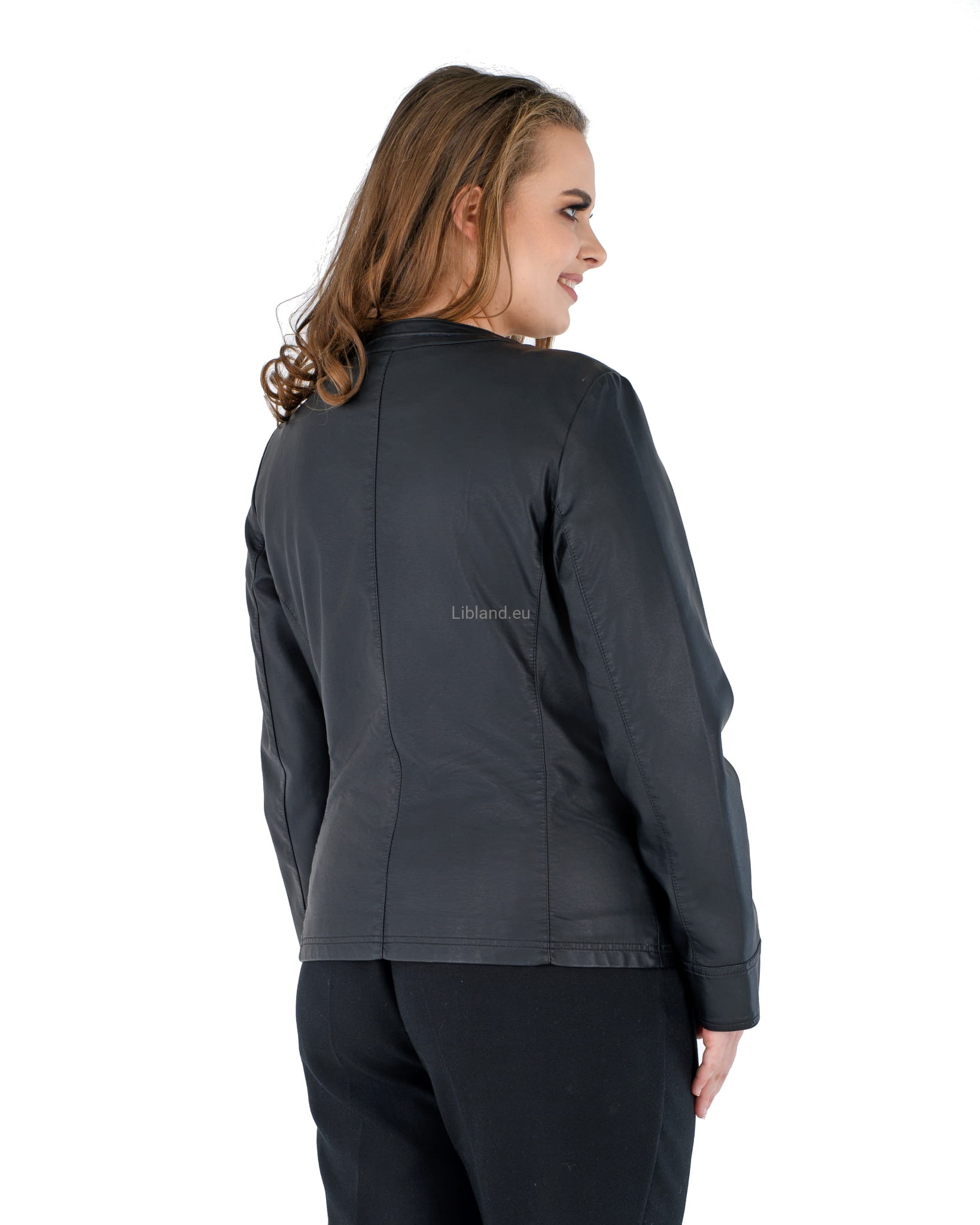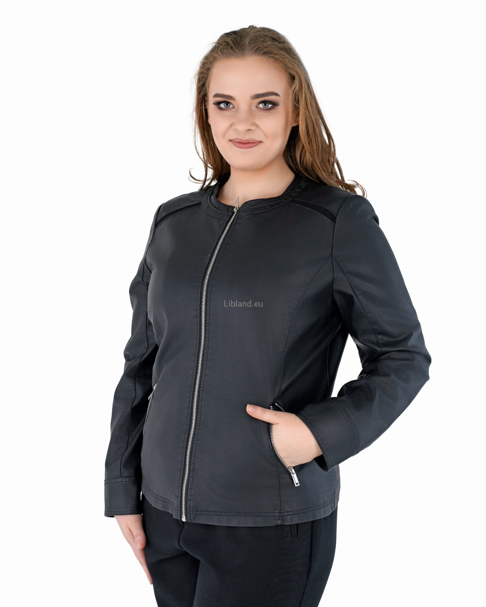 Damska kurtka z ekologicznej skóry z okrągłym wykończeniem pod szyją i wstawkami z siatki na ramionach: