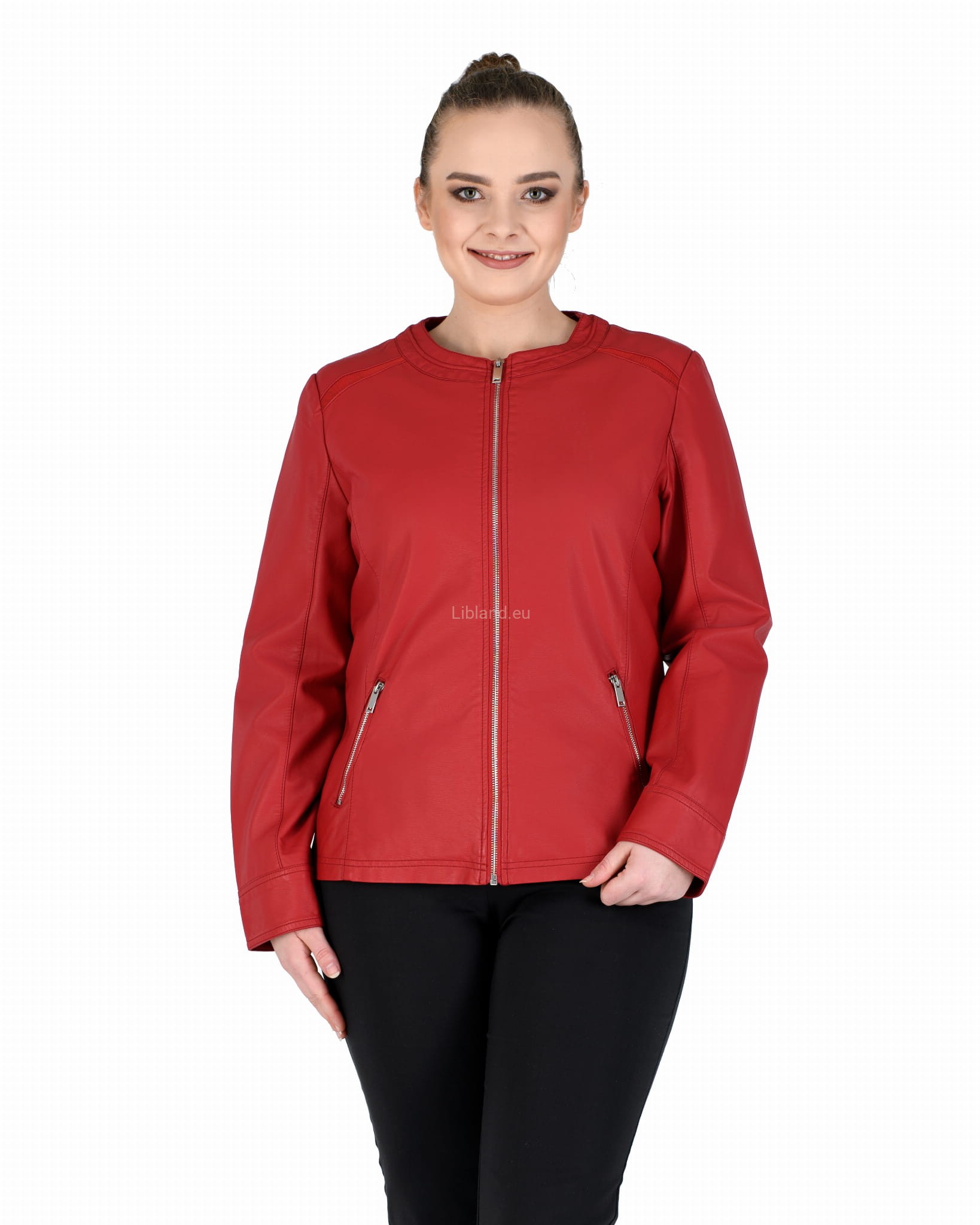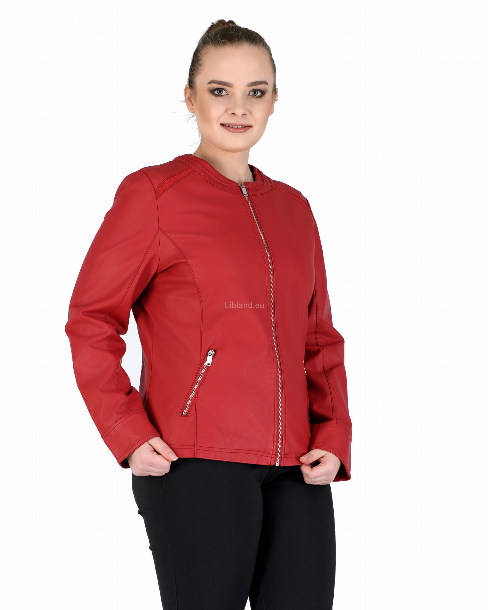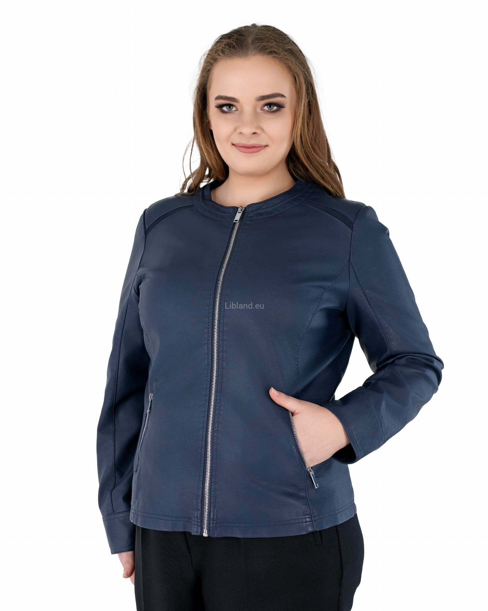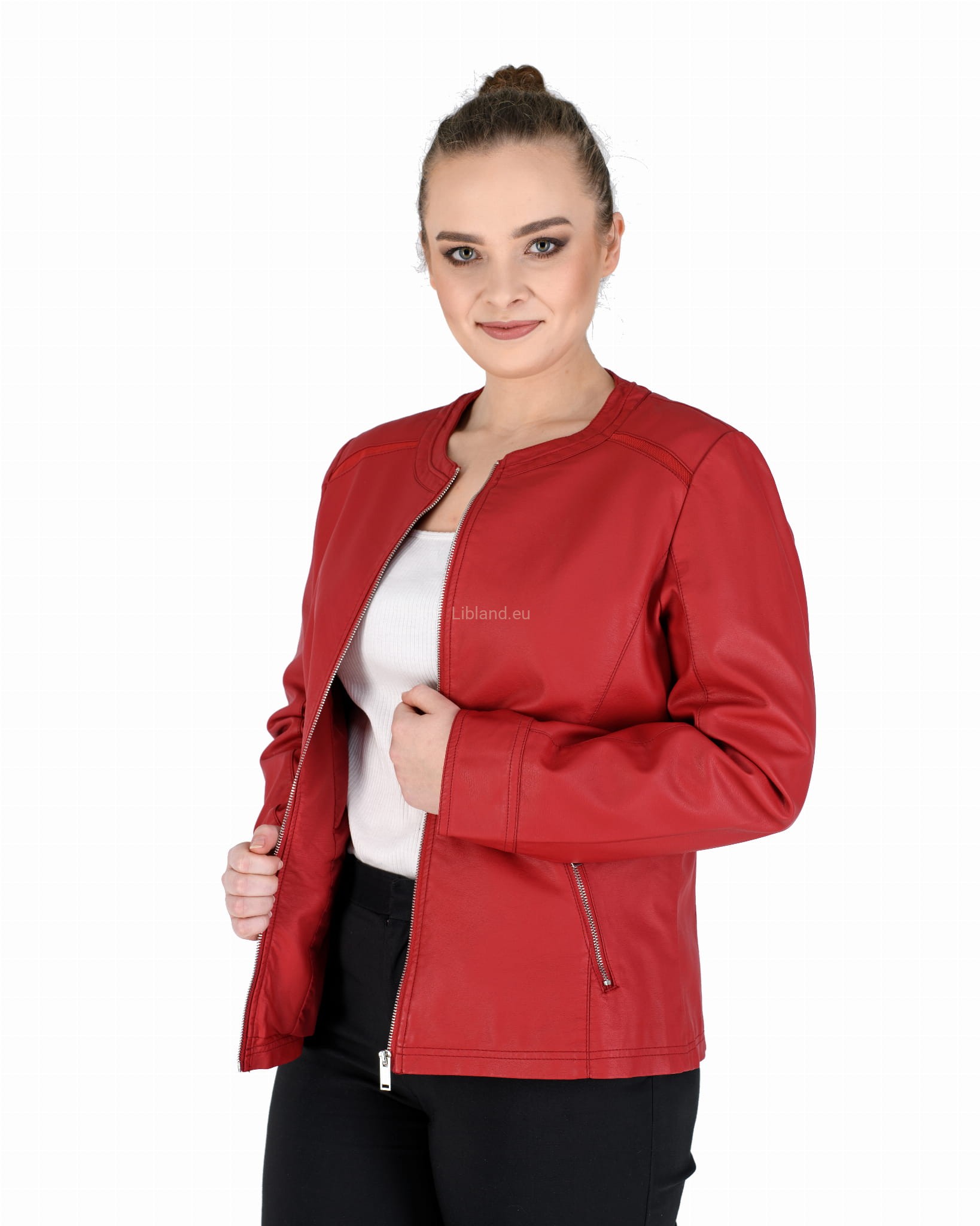 Damska kurtka z ekologicznej skóry z okrągłym wykończeniem pod szyją i wstawkami z siatki na ramionach:
