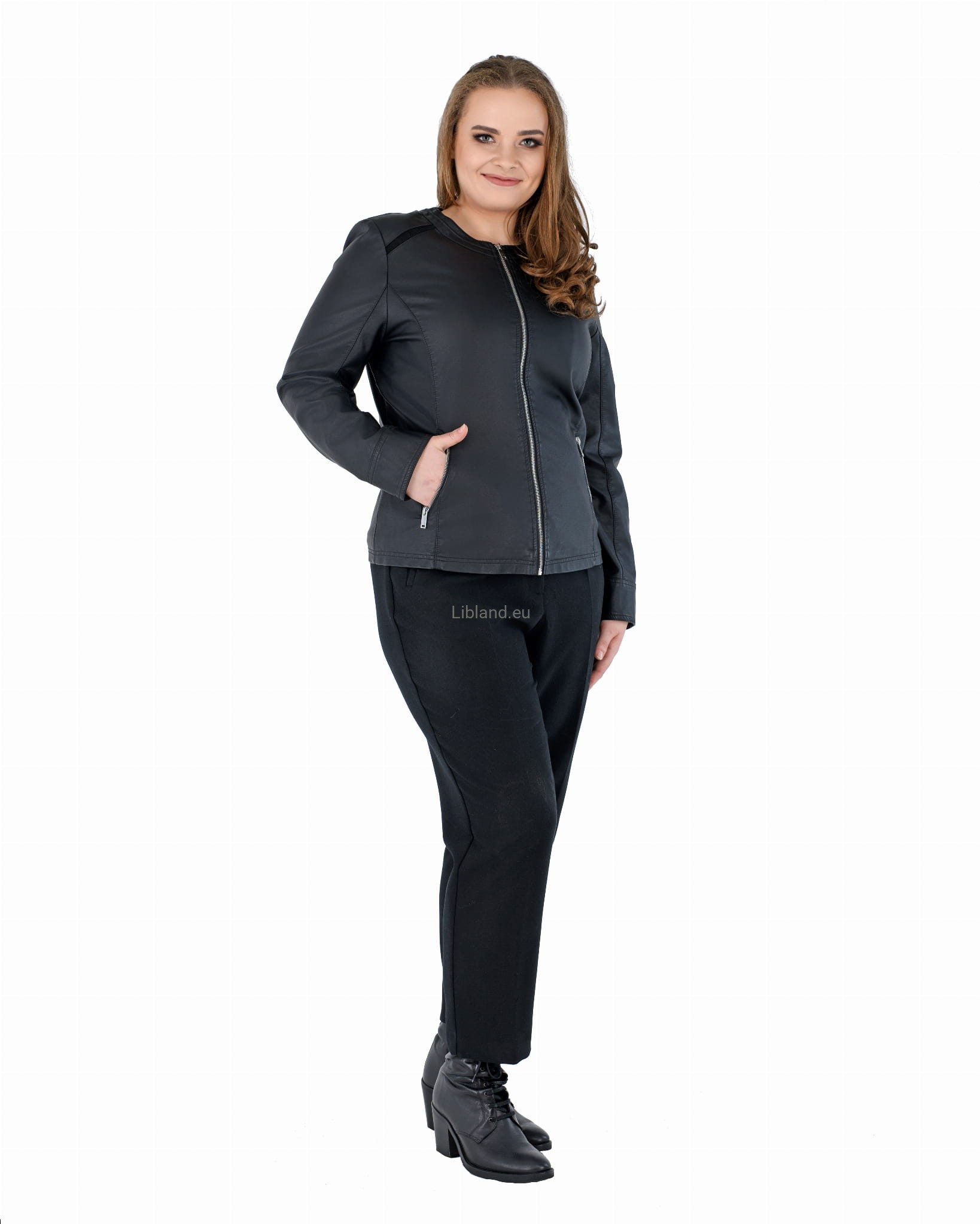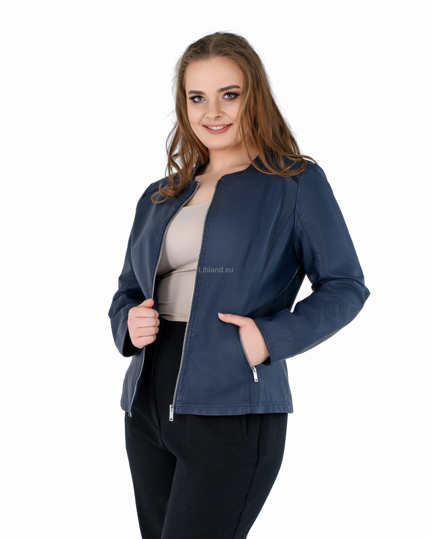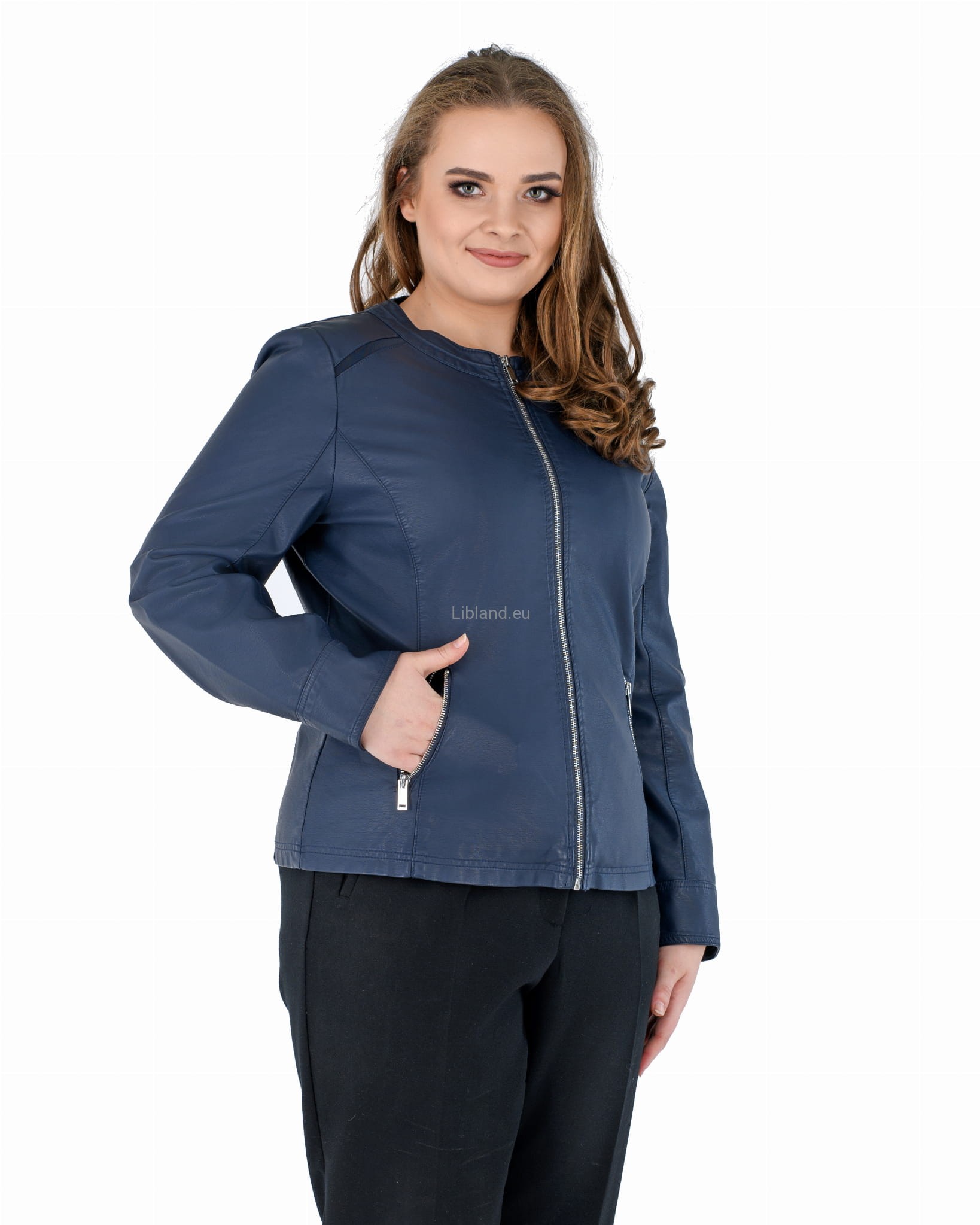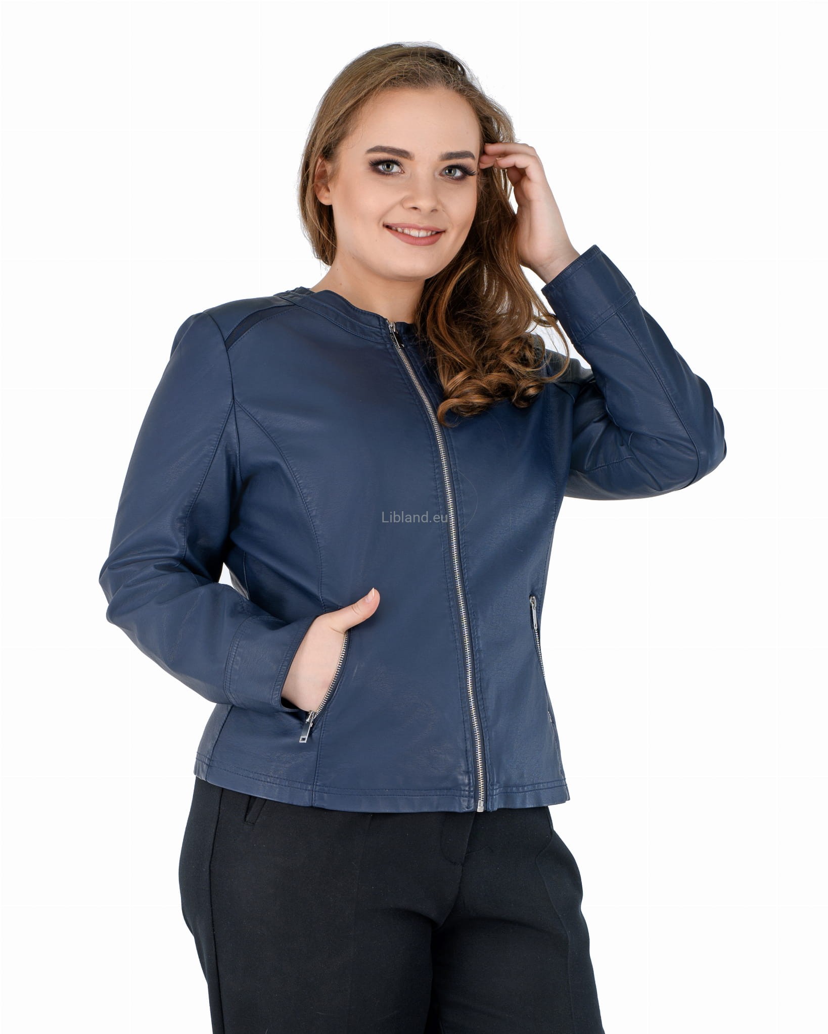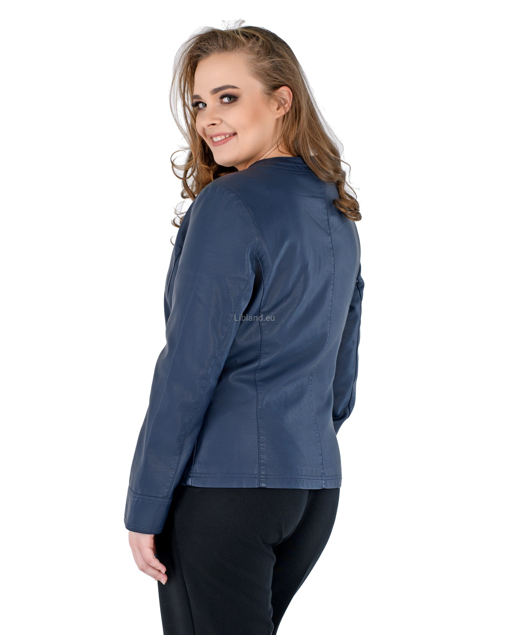Damska kurtka z ekologicznej skóry z okrągłym wykończeniem pod szyją i wstawkami z siatki na ramionach:
