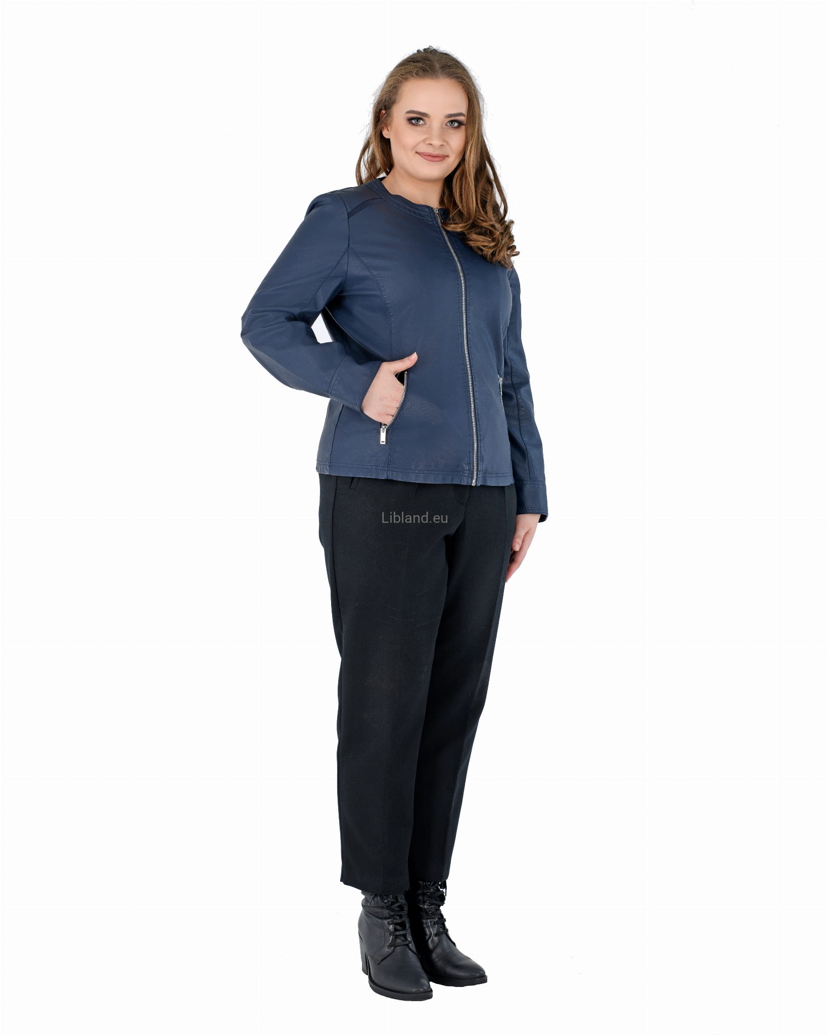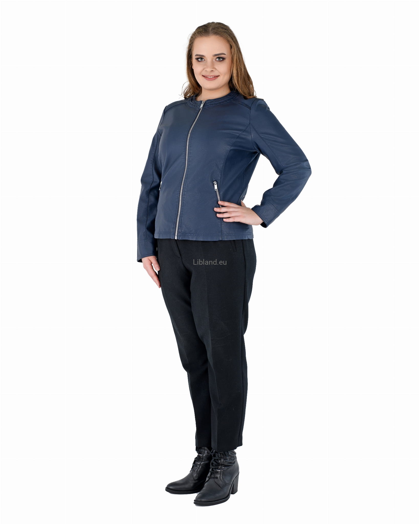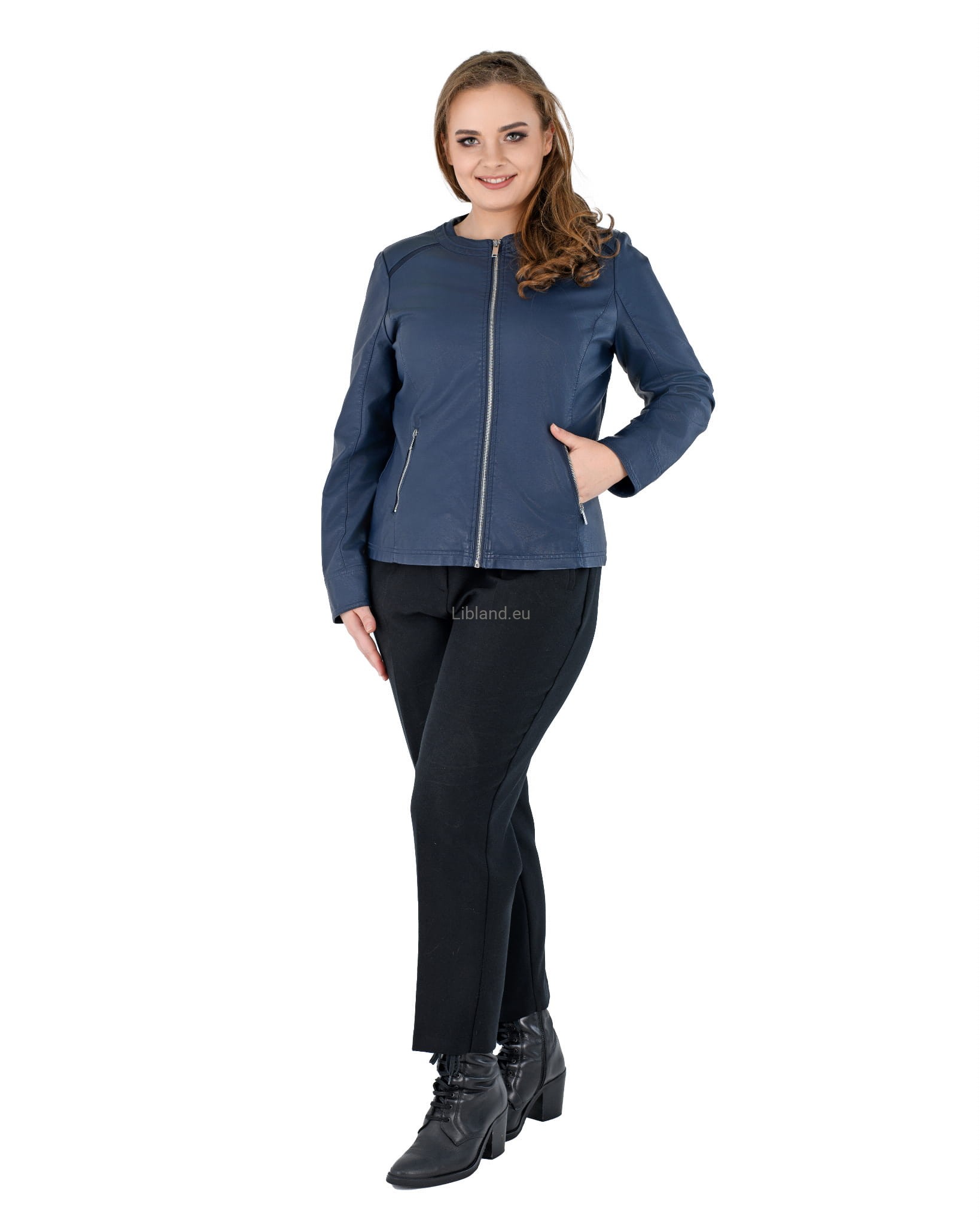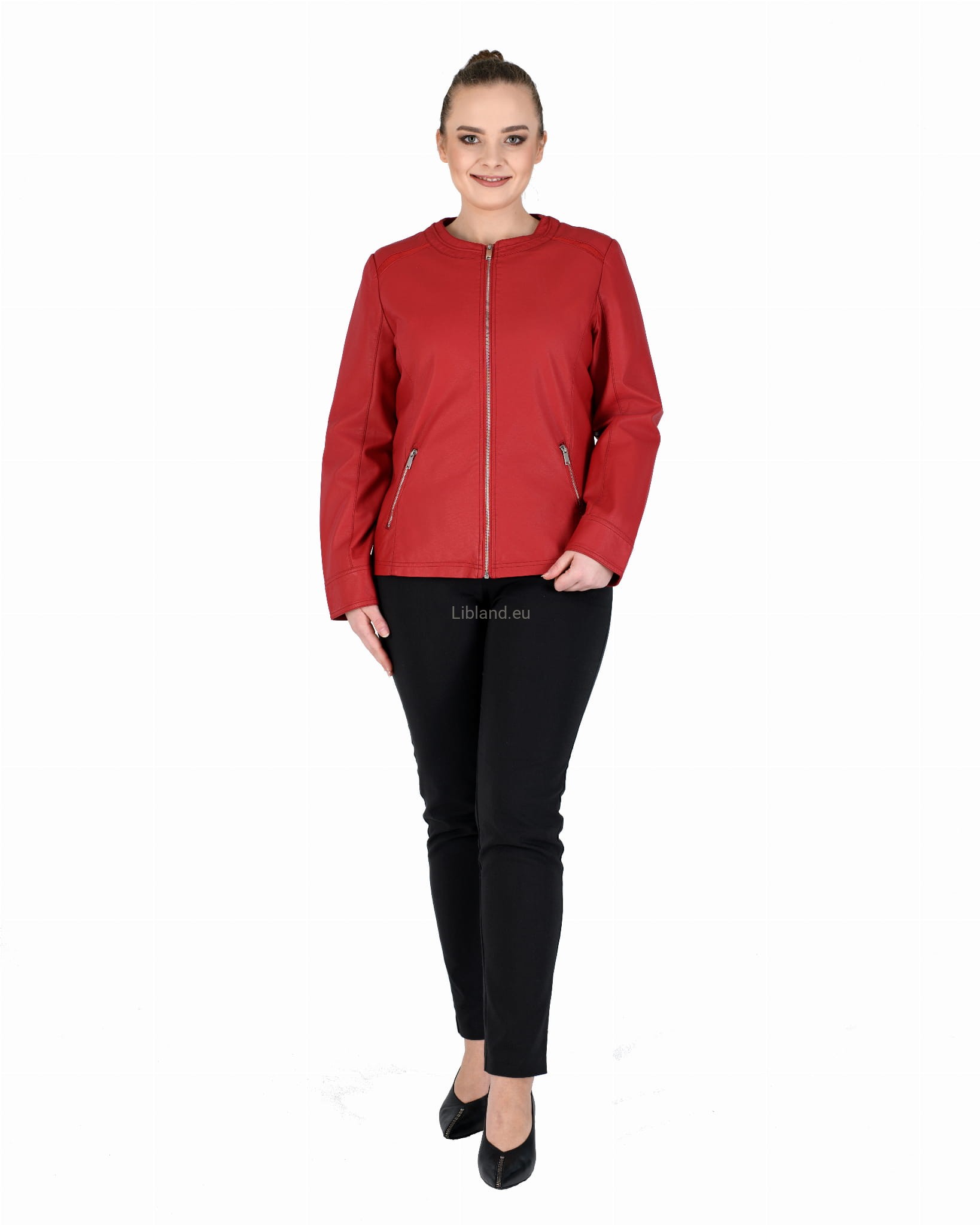 Damska kurtka z ekologicznej skóry z okrągłym wykończeniem pod szyją i wstawkami z siatki na ramionach:
