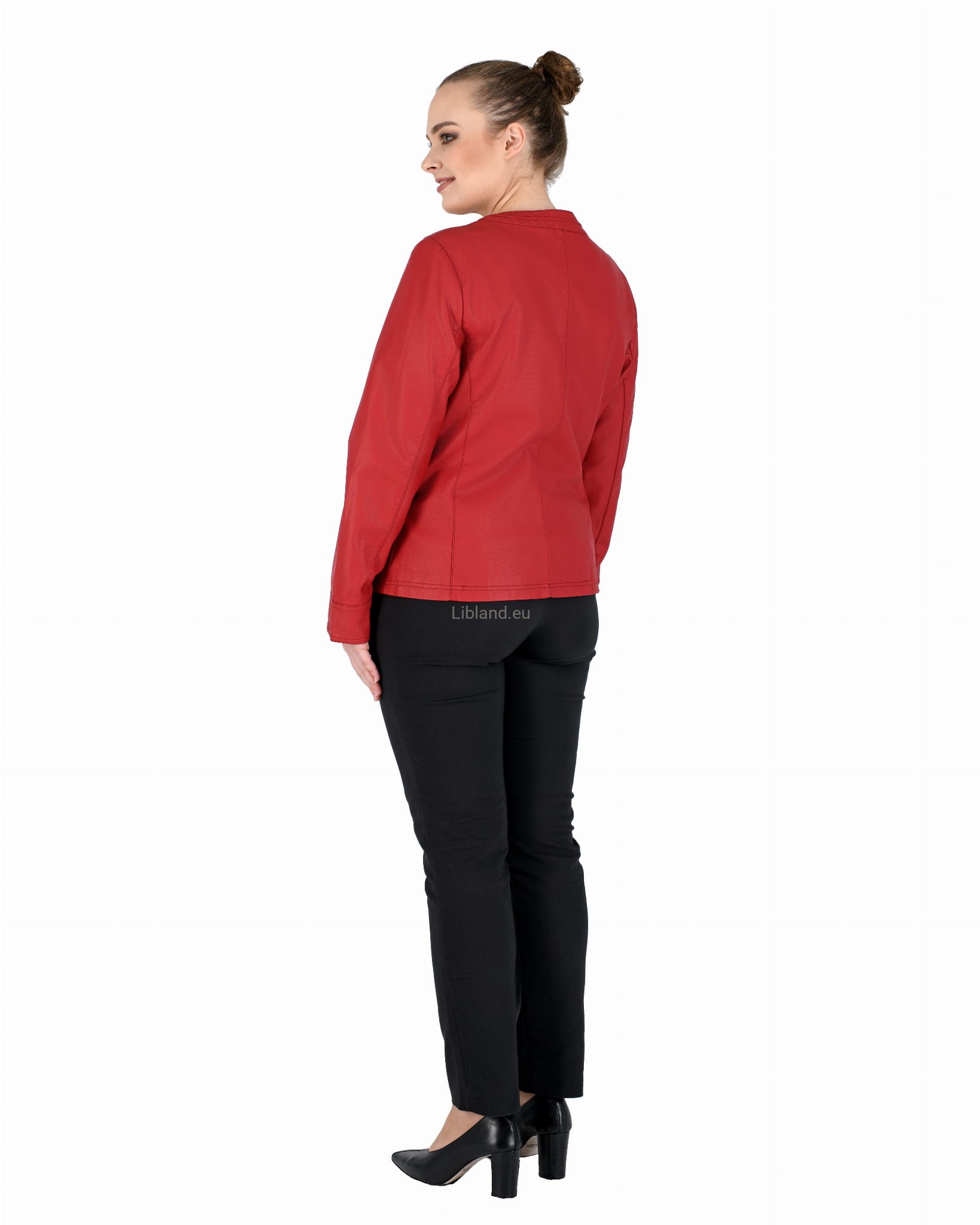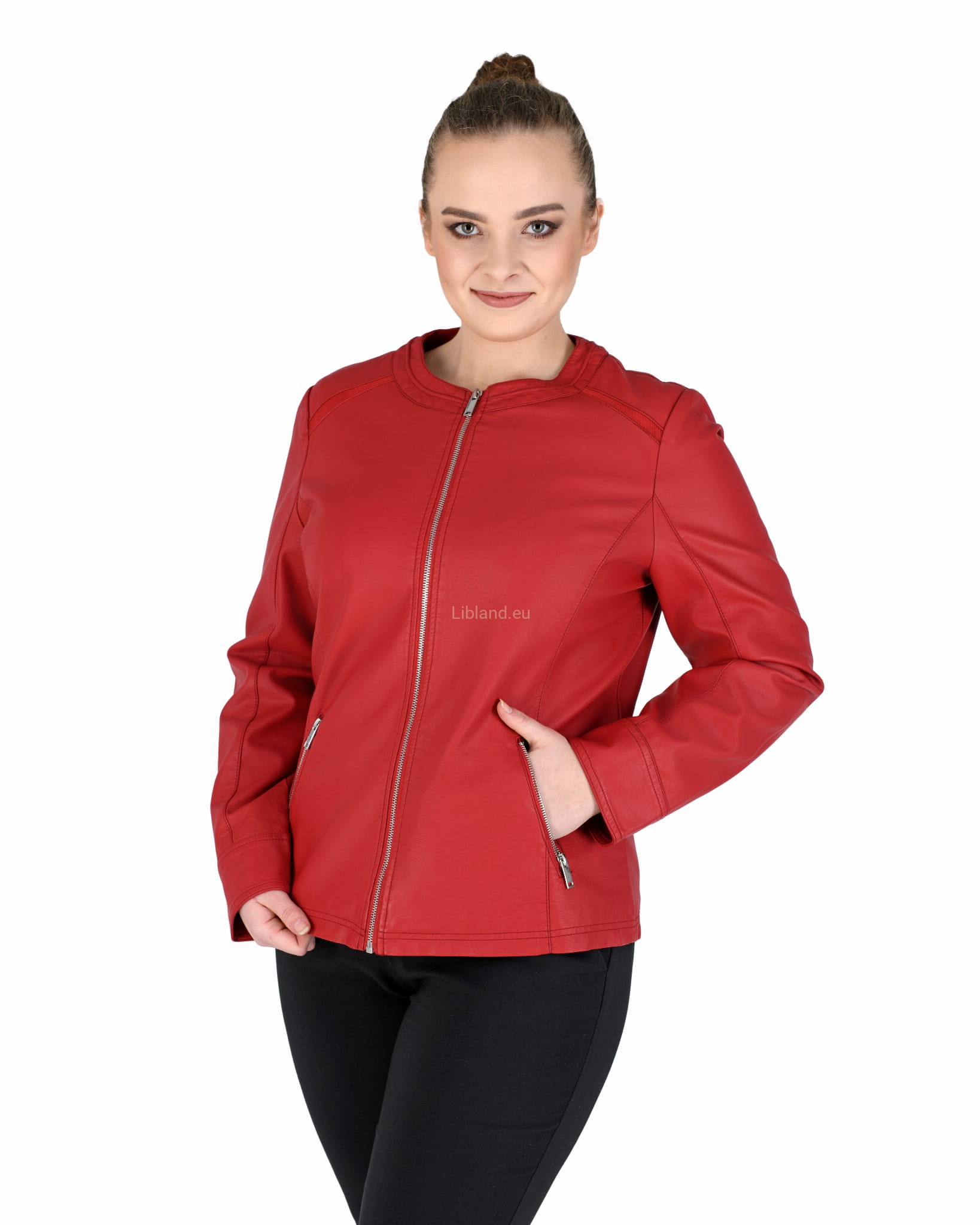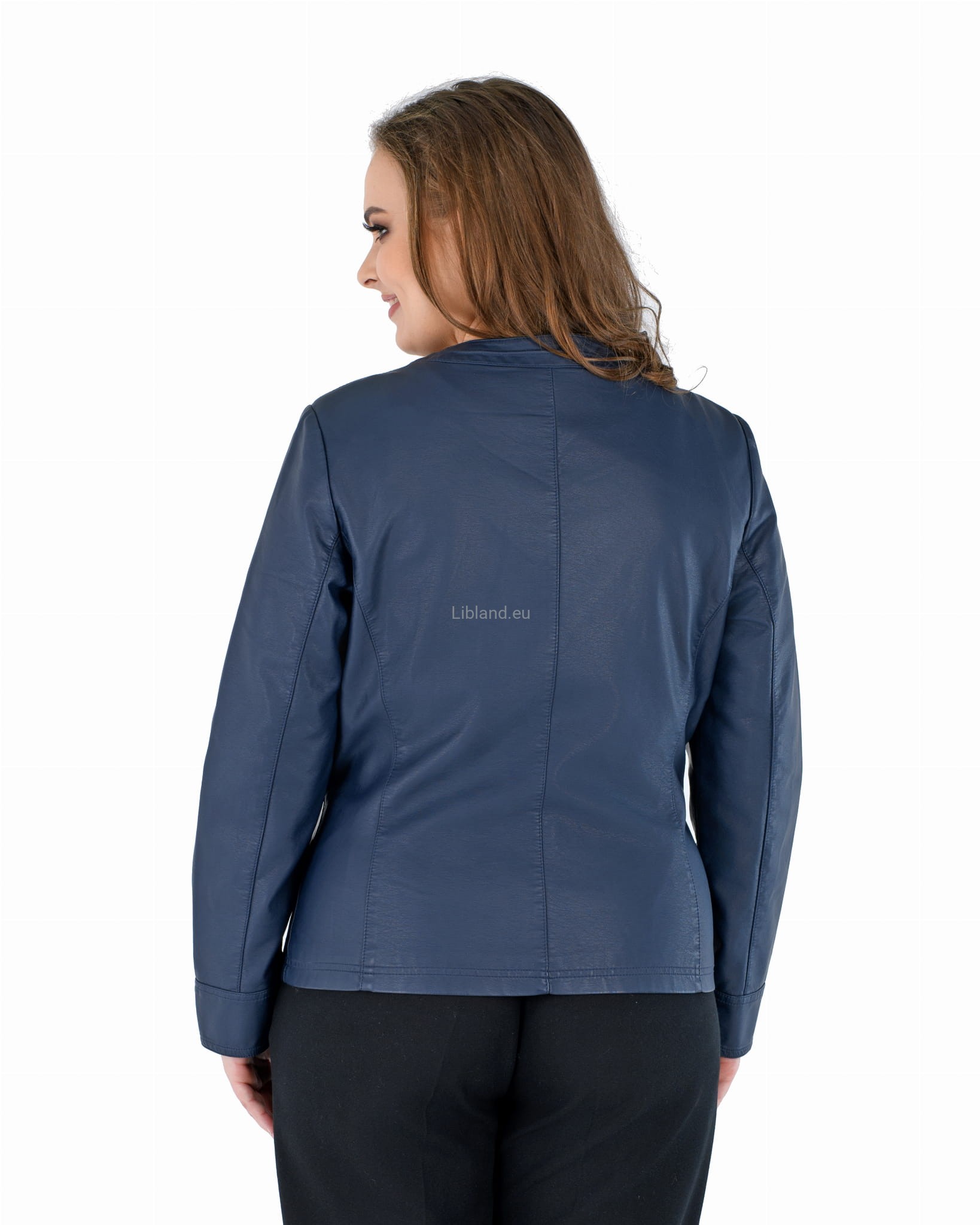 Damska kurtka z ekologicznej skóry z okrągłym wykończeniem pod szyją i wstawkami z siatki na ramionach.