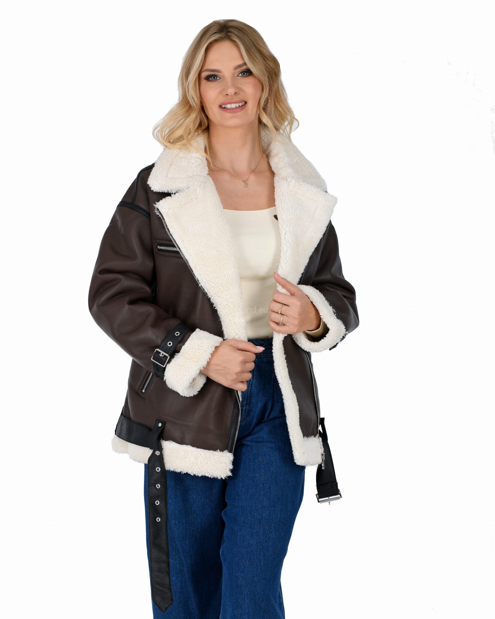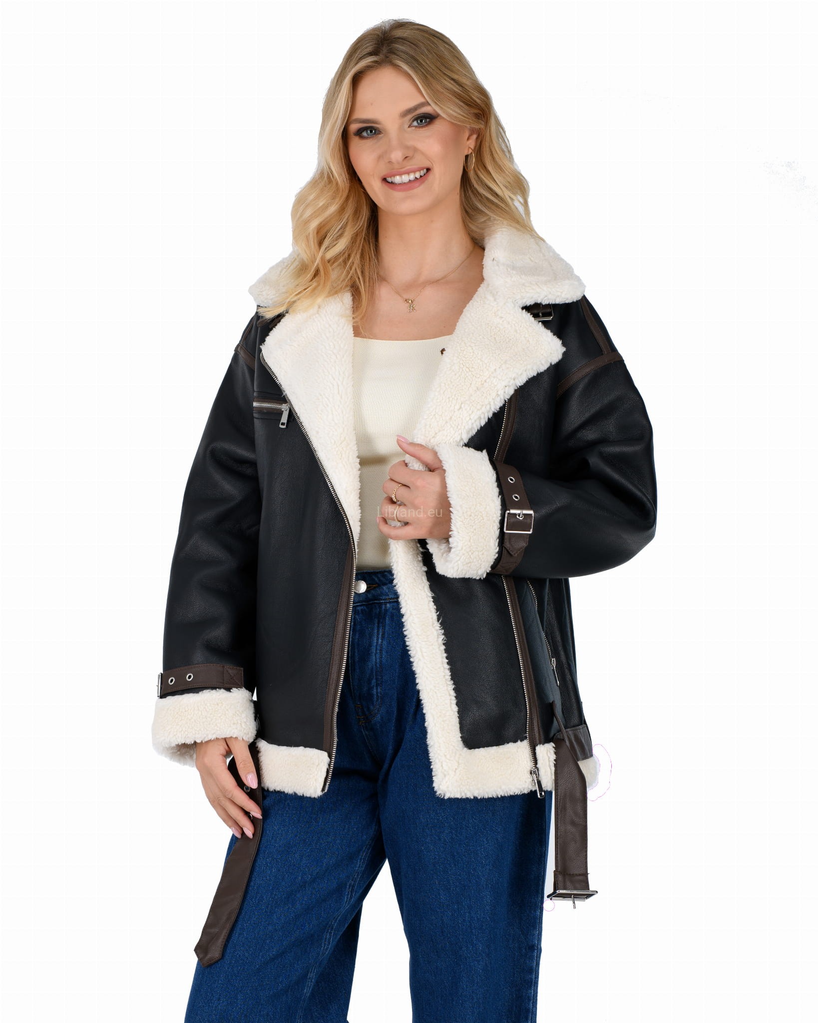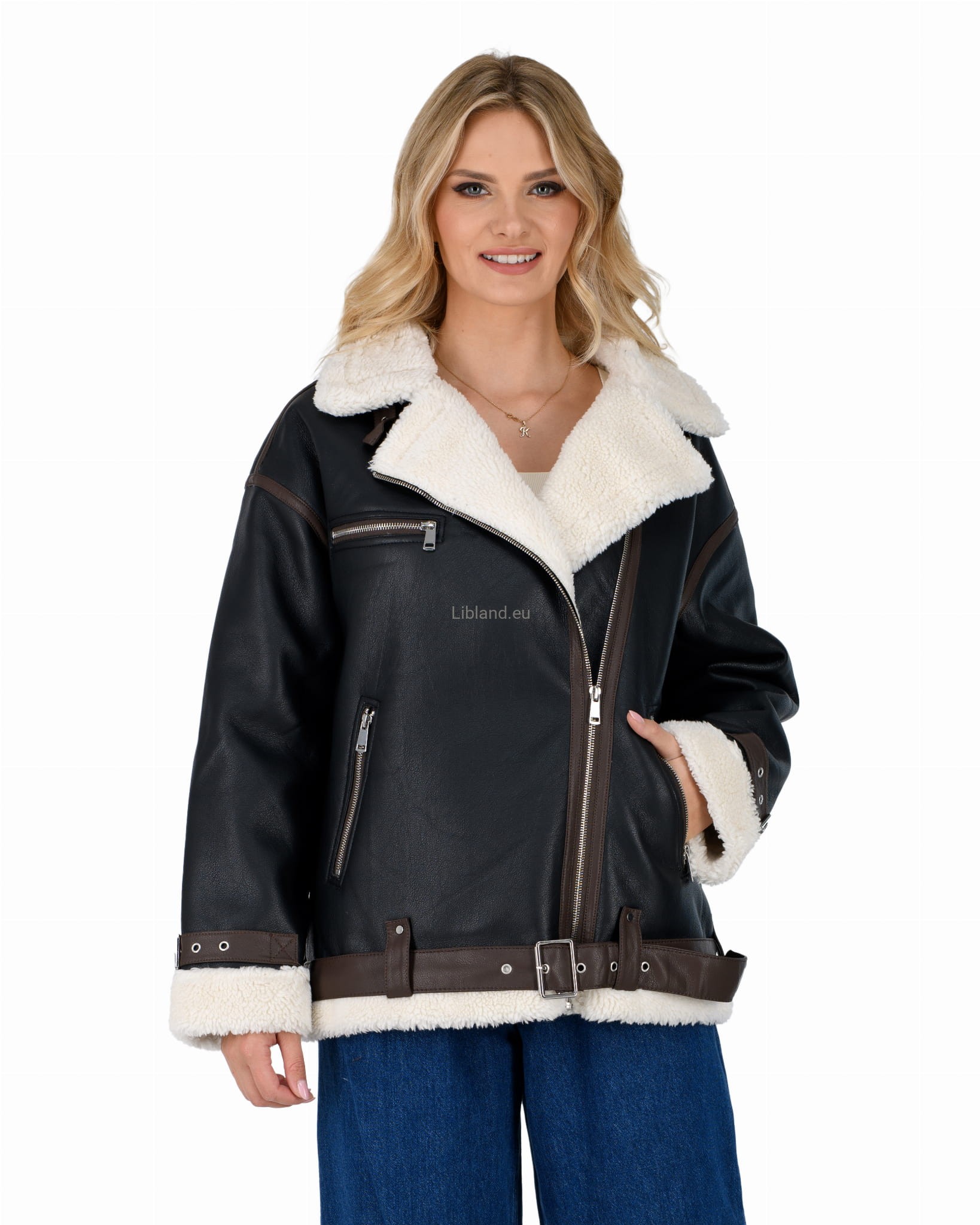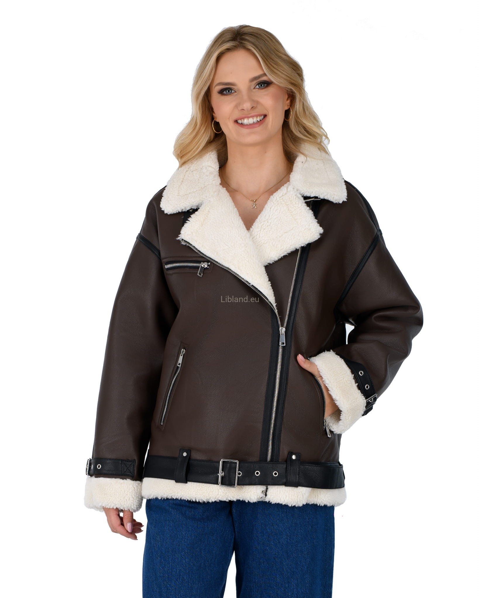 Damski kożuszek z eko-skóry zasuwany na suwak z paskiem i klamerką- oversize: