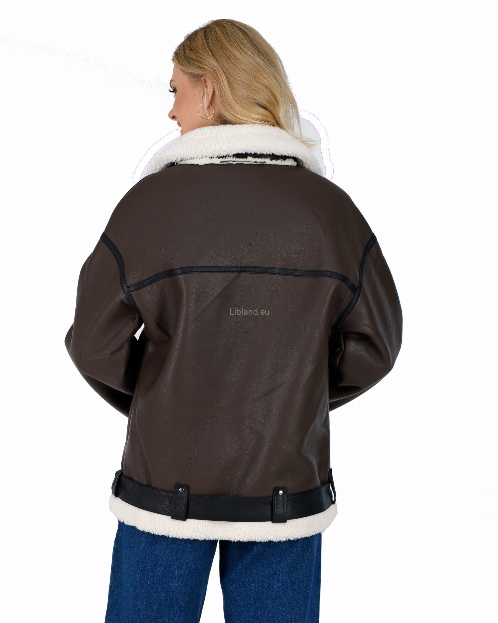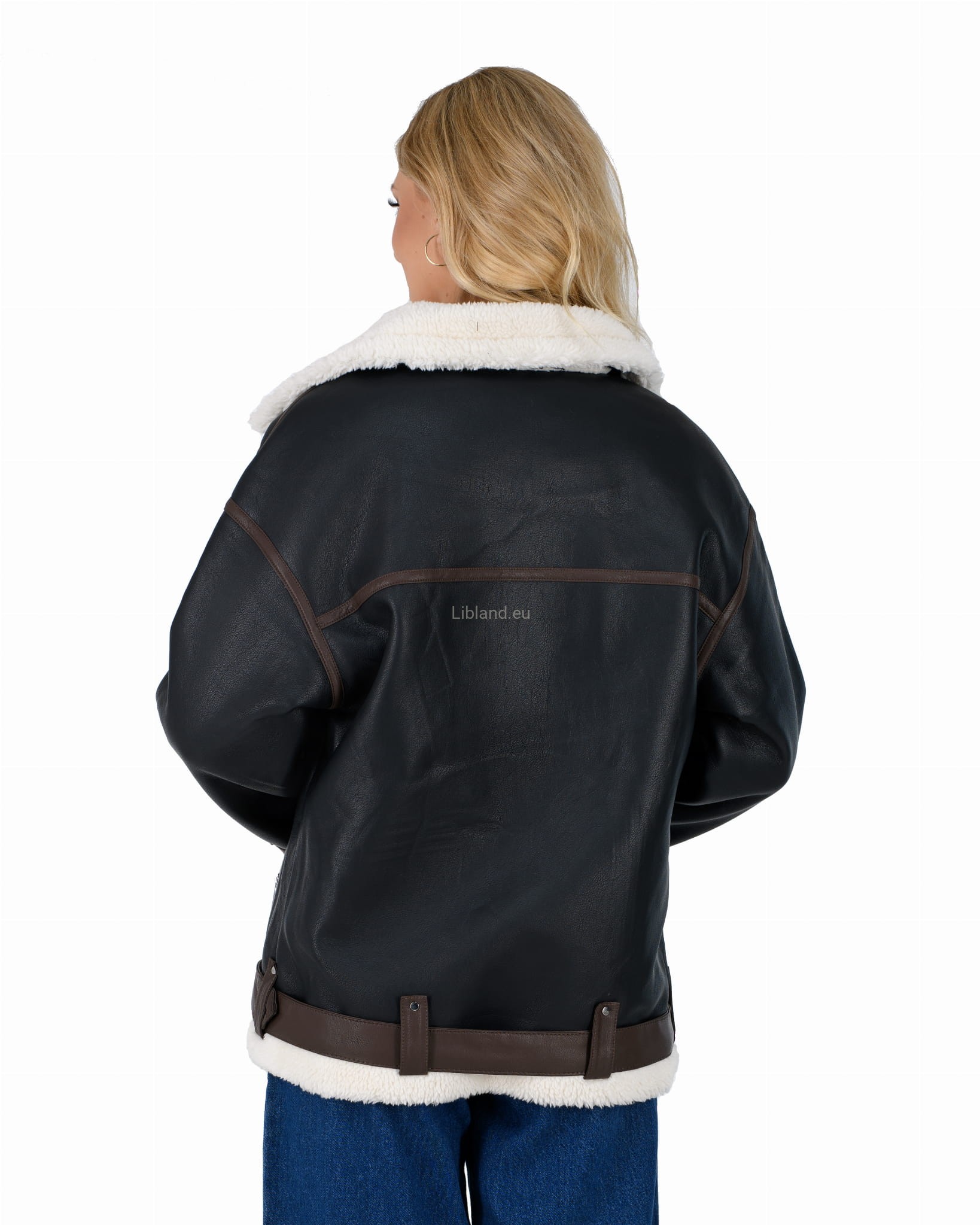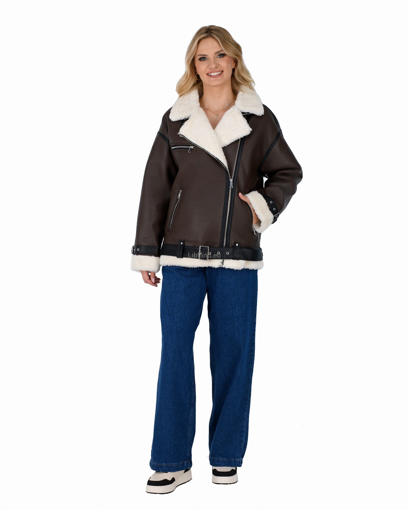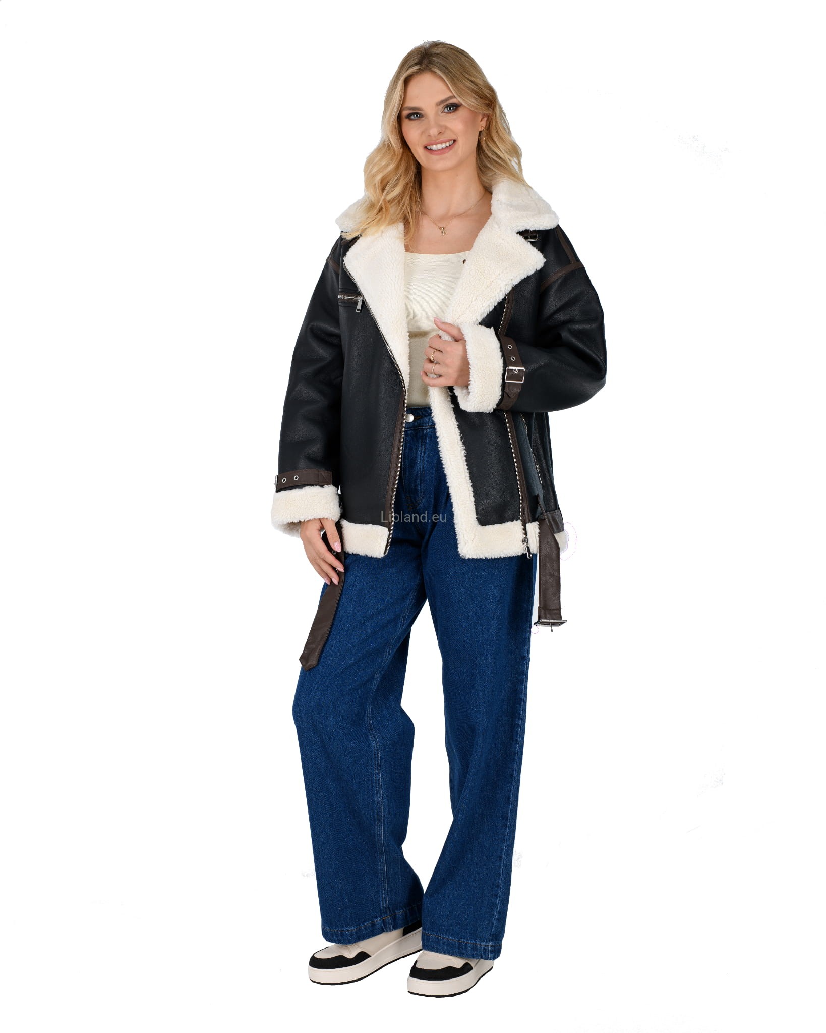 Damski kożuszek z eko-skóry zasuwany na suwak z paskiem i klamerką- oversize: