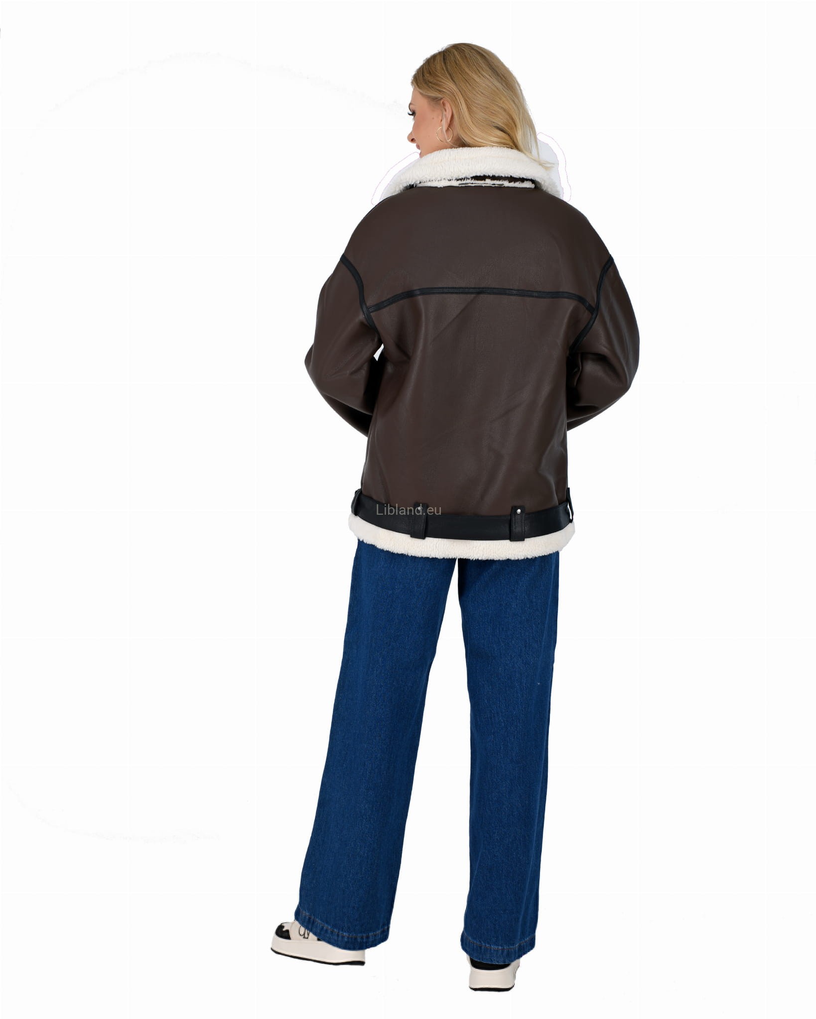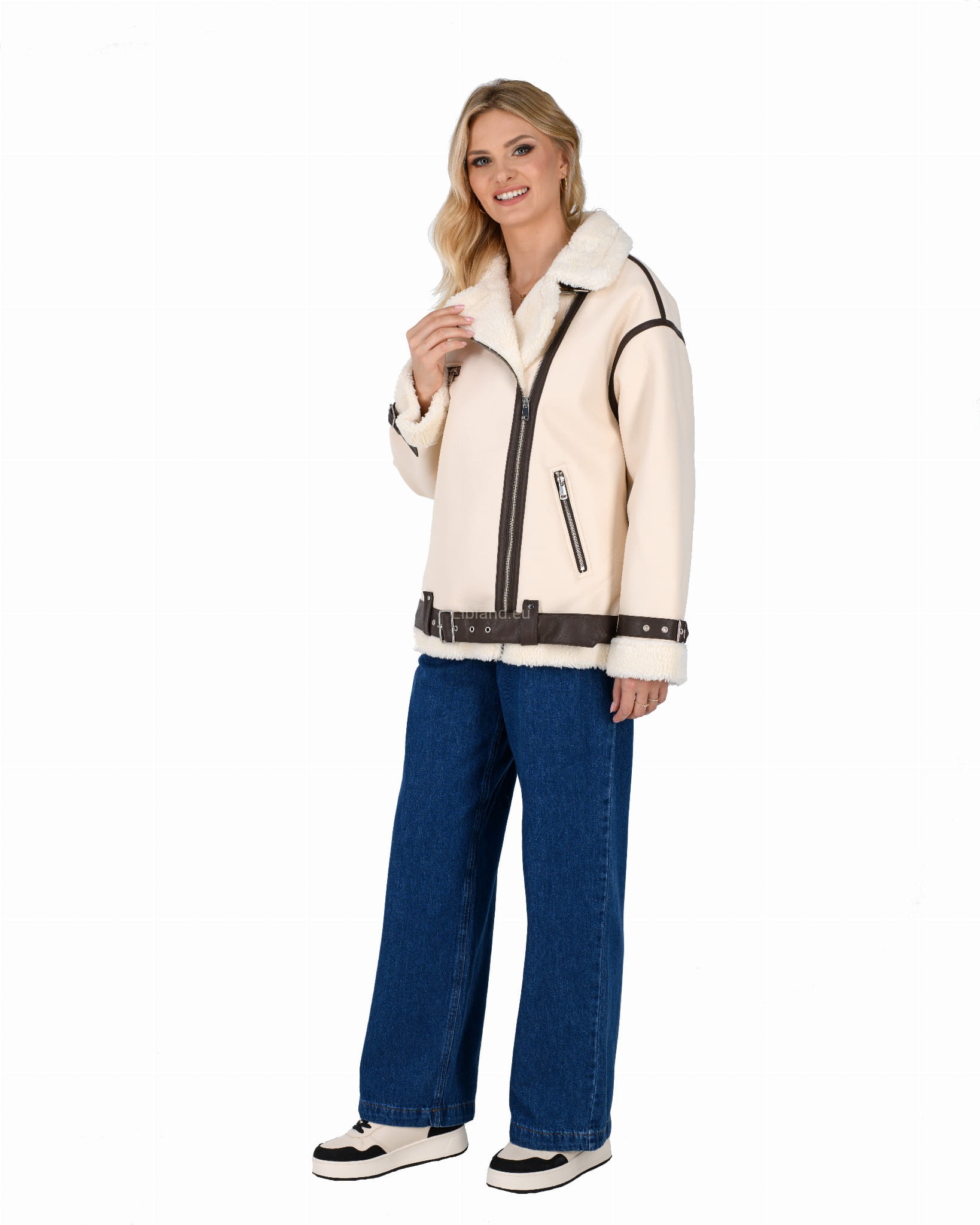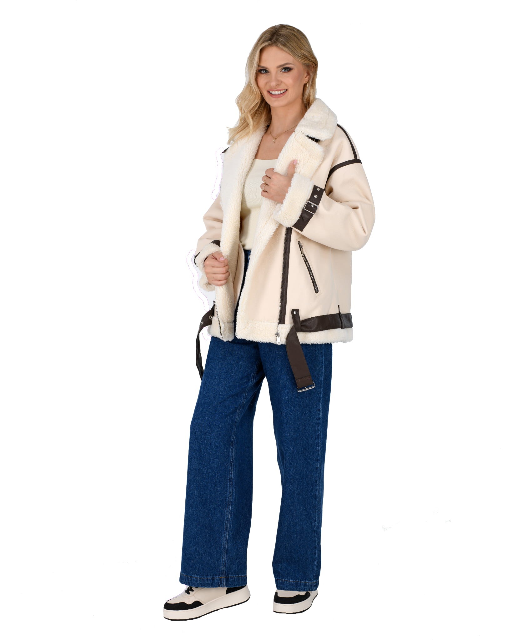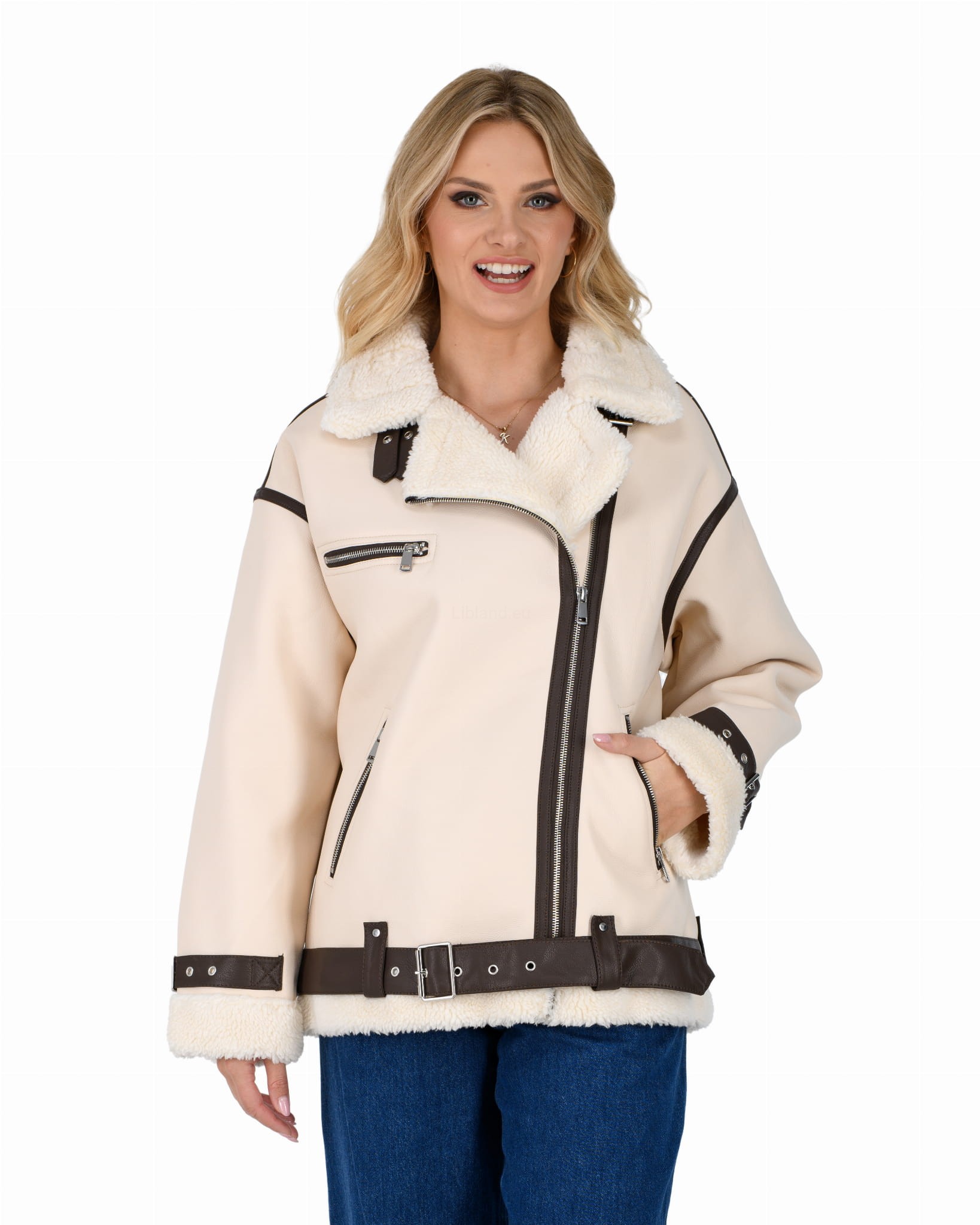 Damski kożuszek z eko-skóry zasuwany na suwak z paskiem i klamerką- oversize: