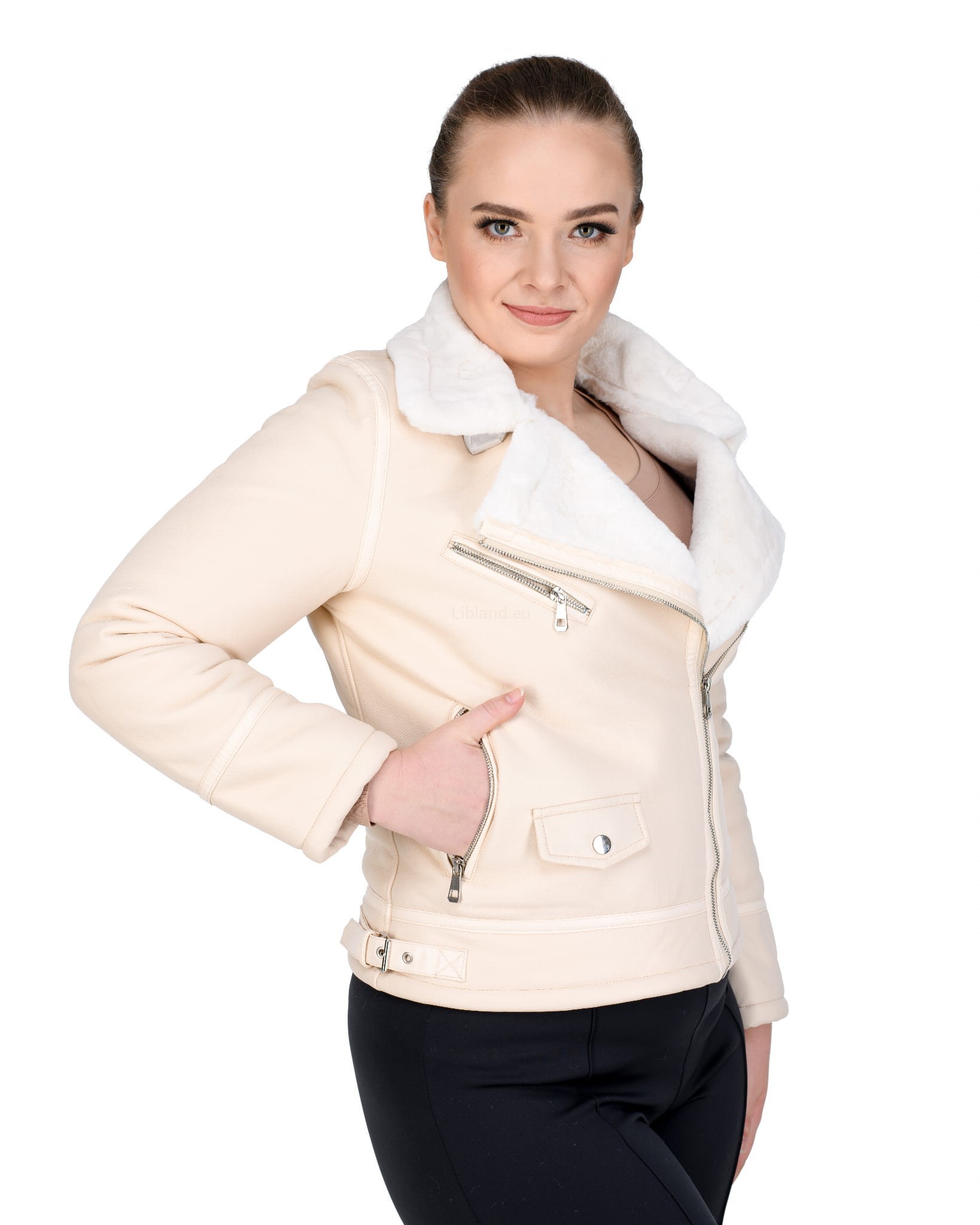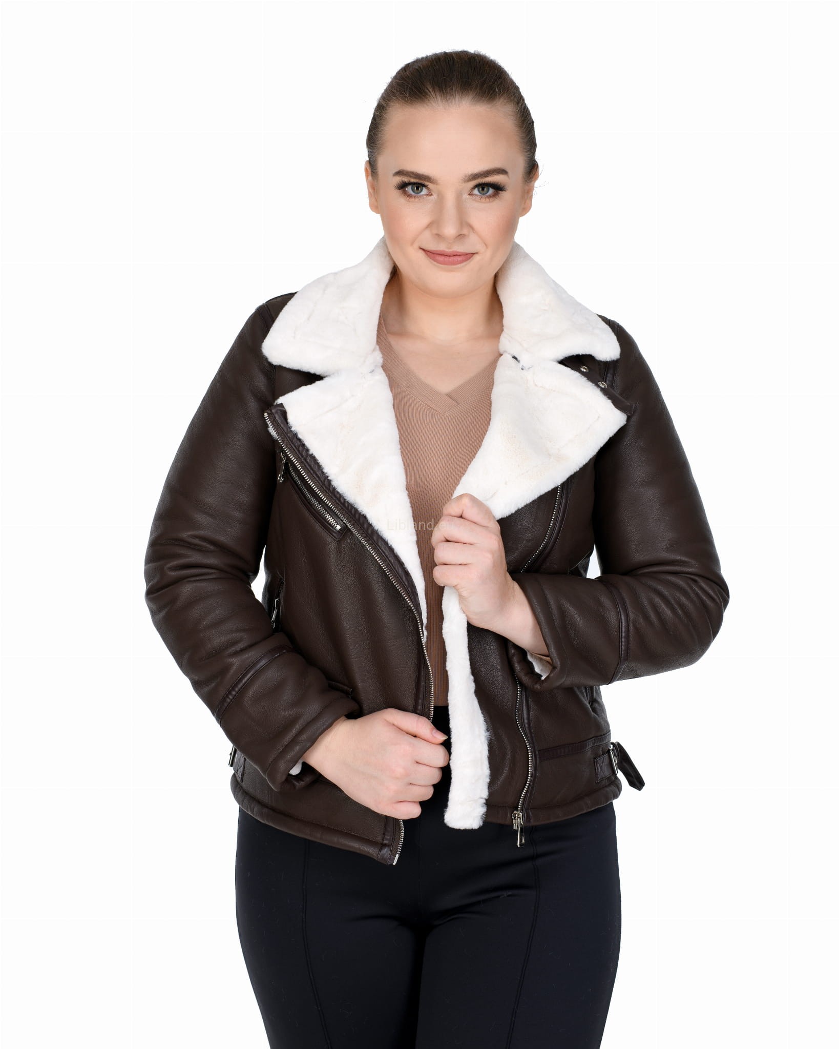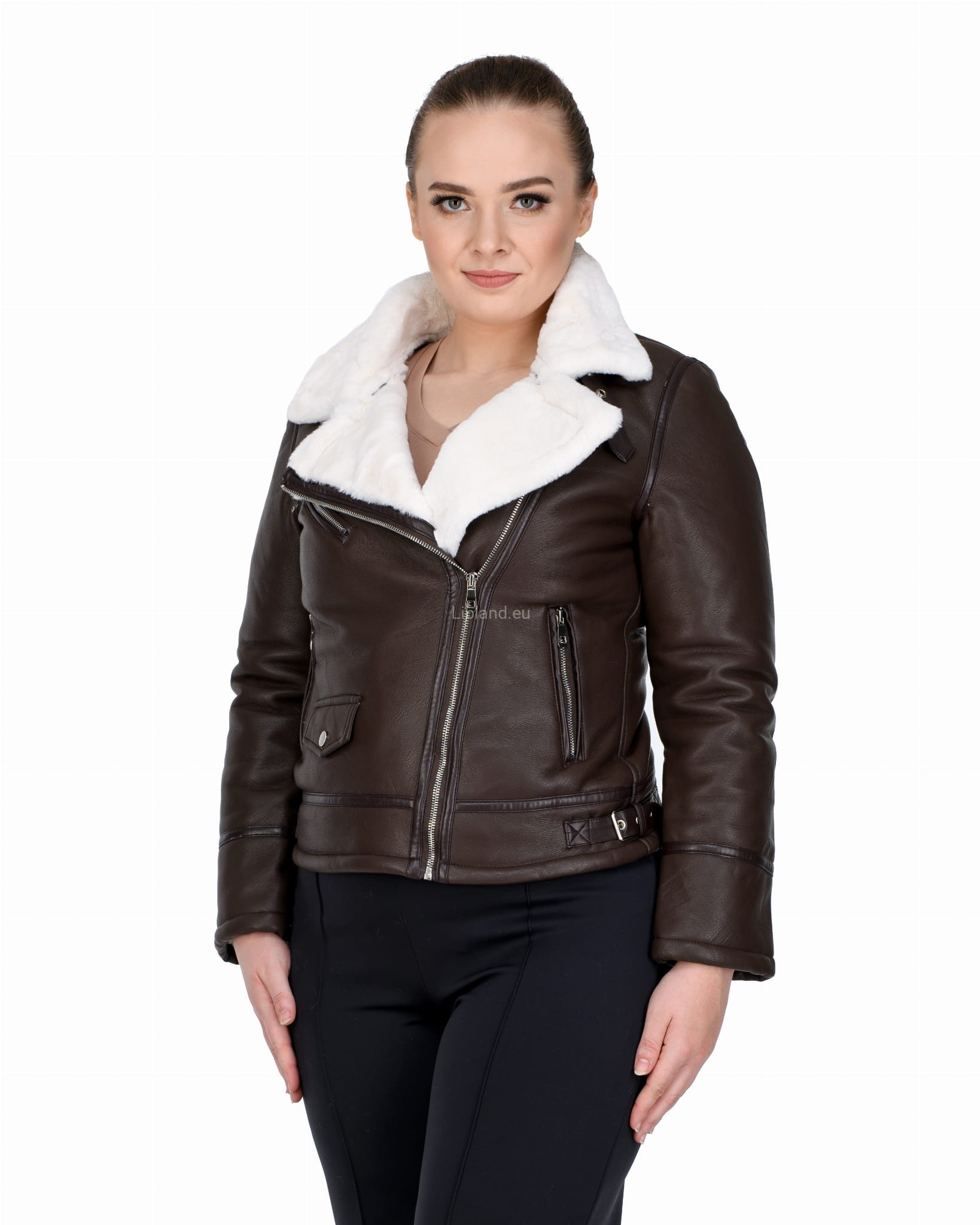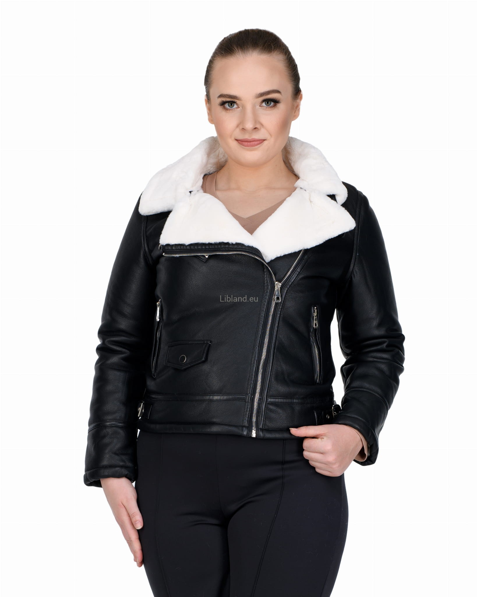 Krótki damski kożuszek z wykładanym futrzanym kołnierzem i błyszczącymi suwakami: