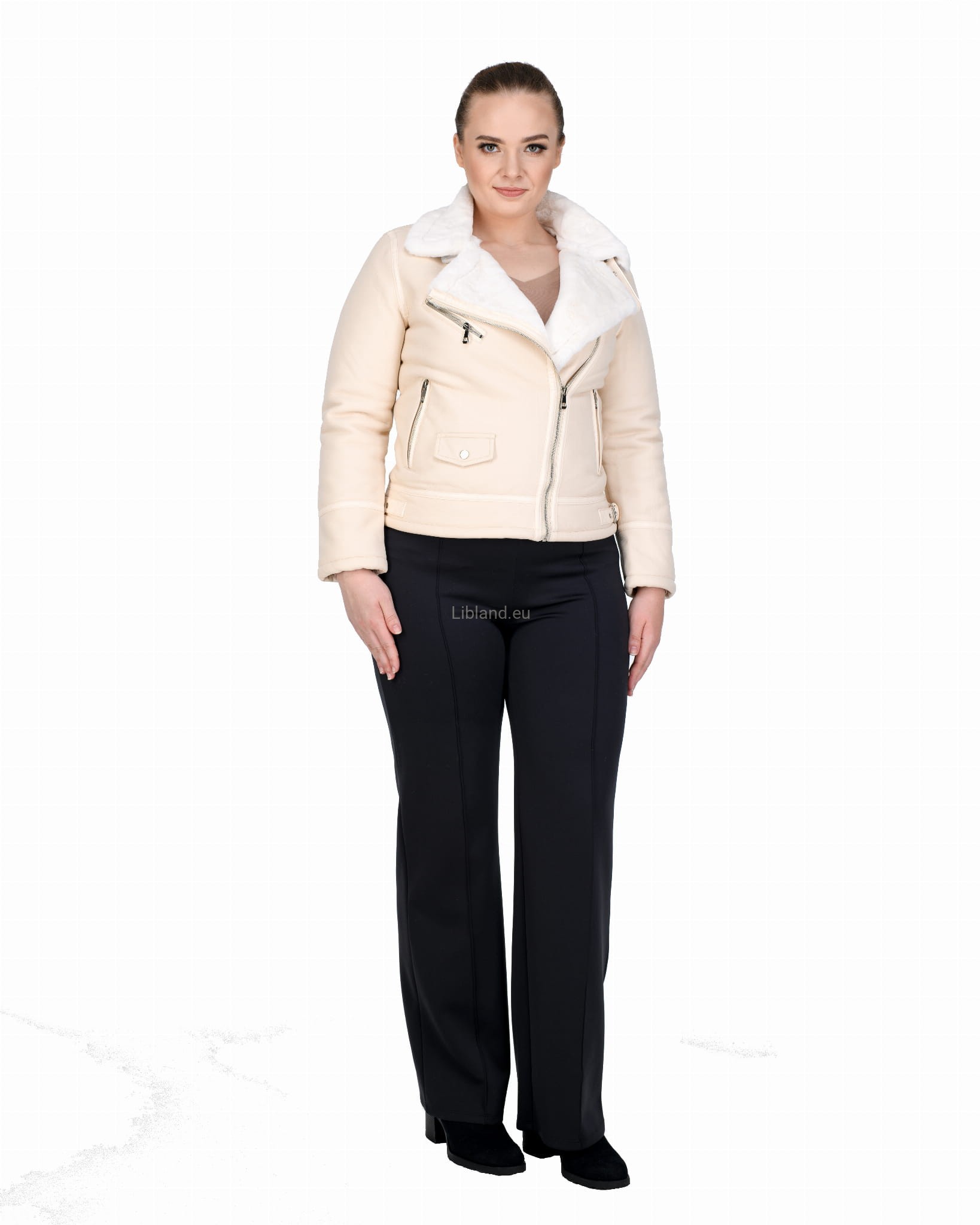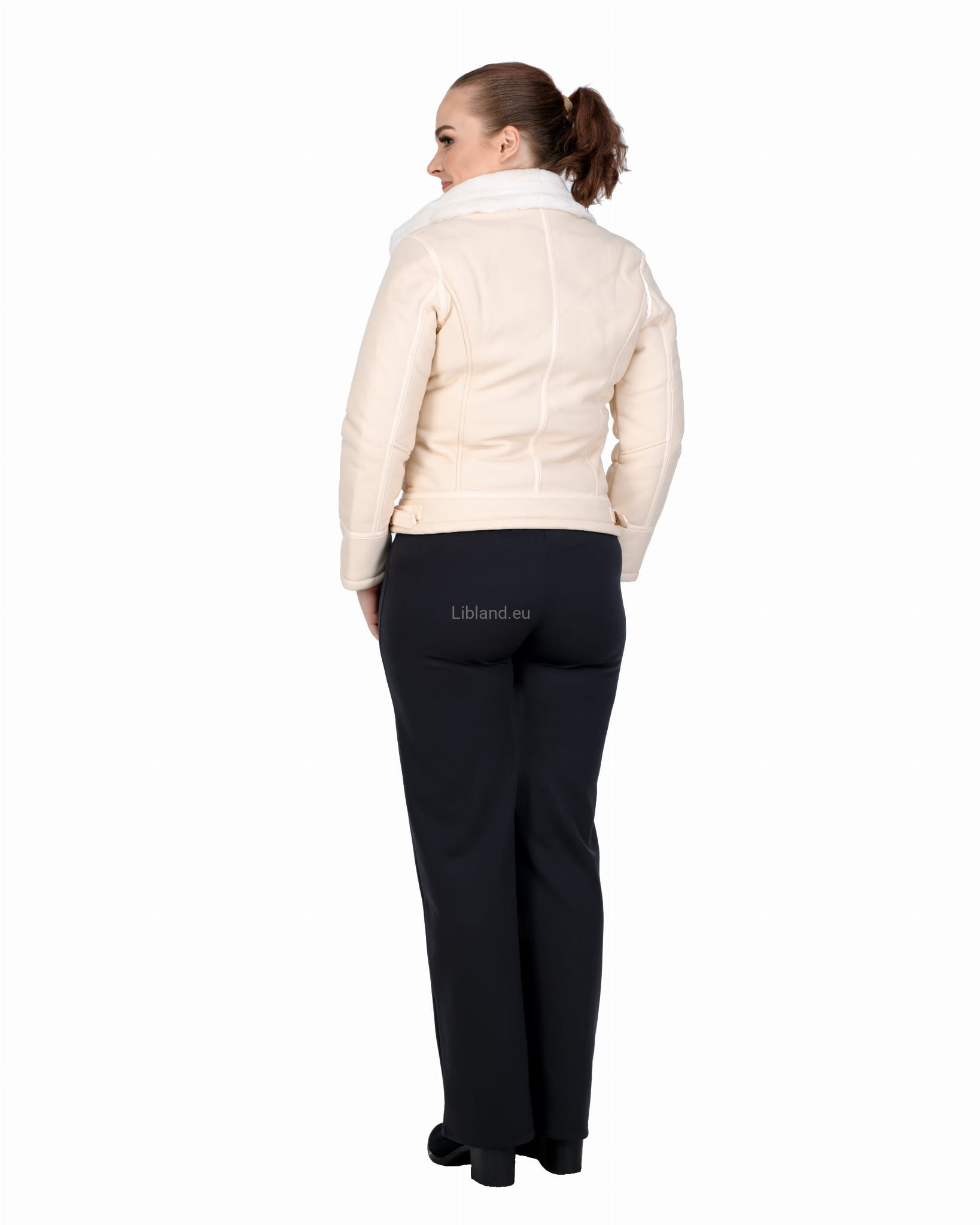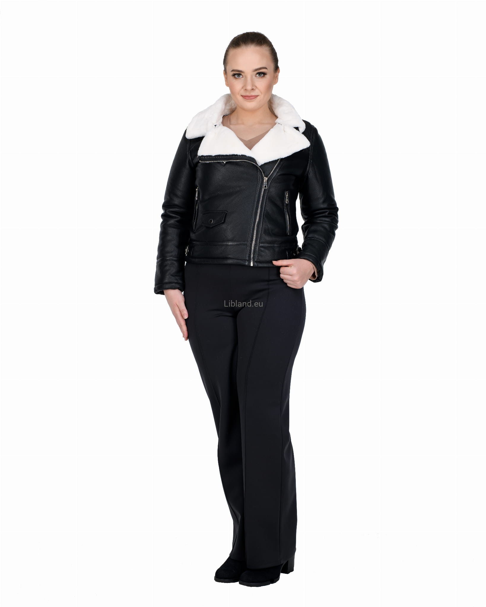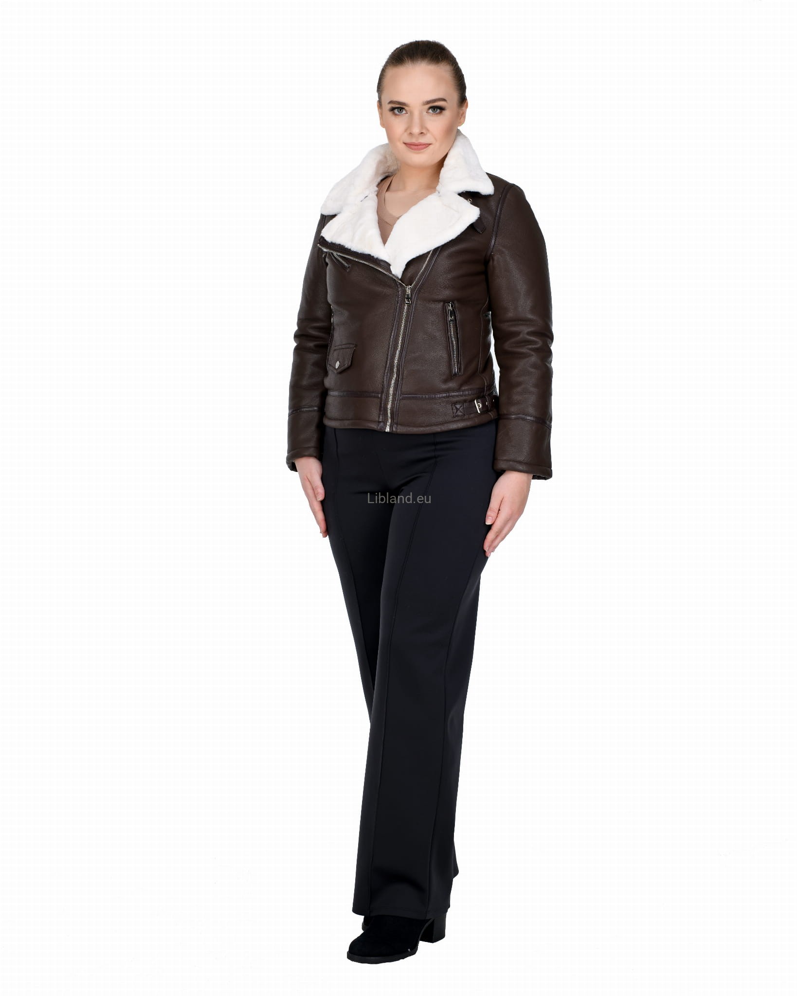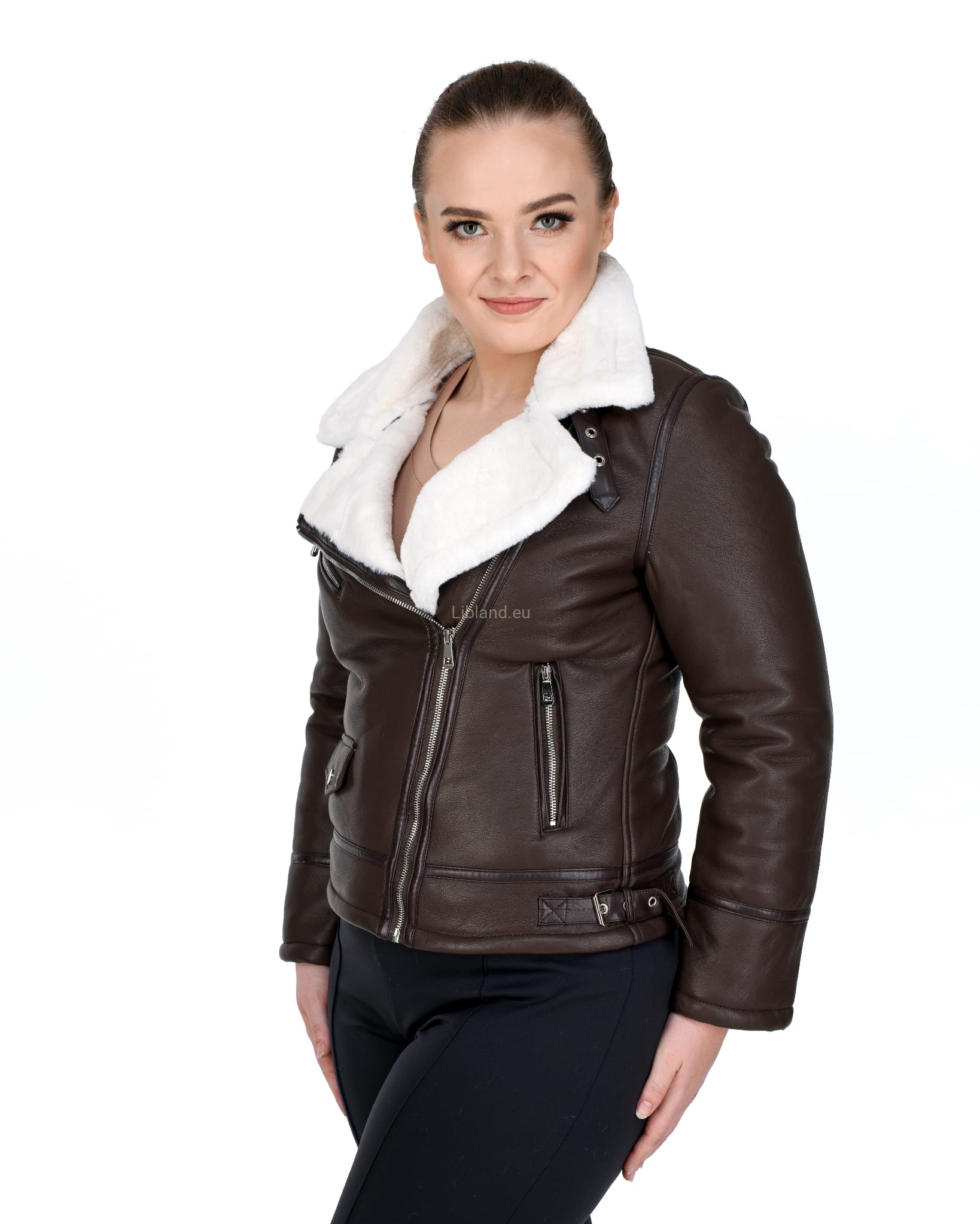 Krótki damski kożuszek z wykładanym futrzanym kołnierzem i błyszczącymi suwakami: