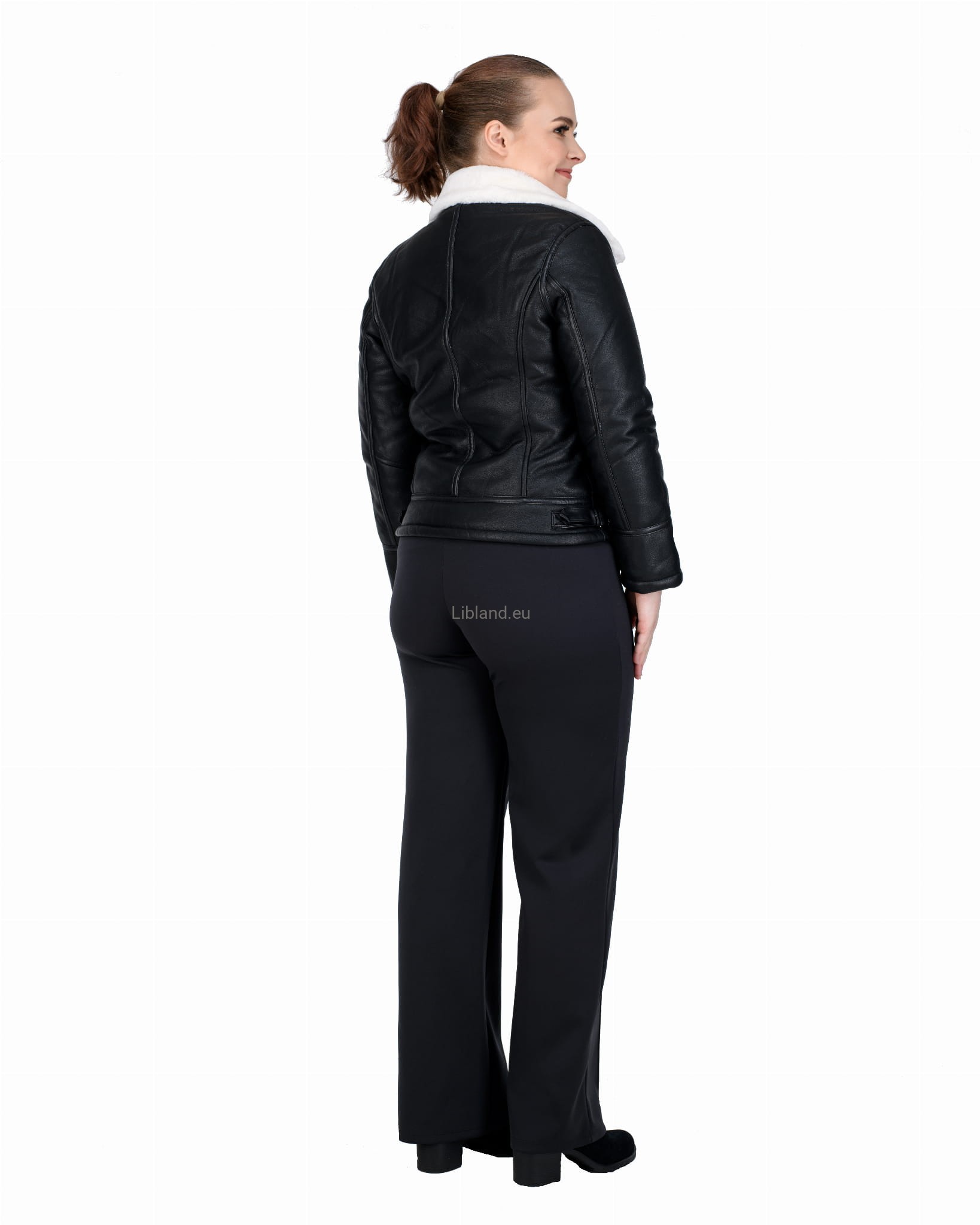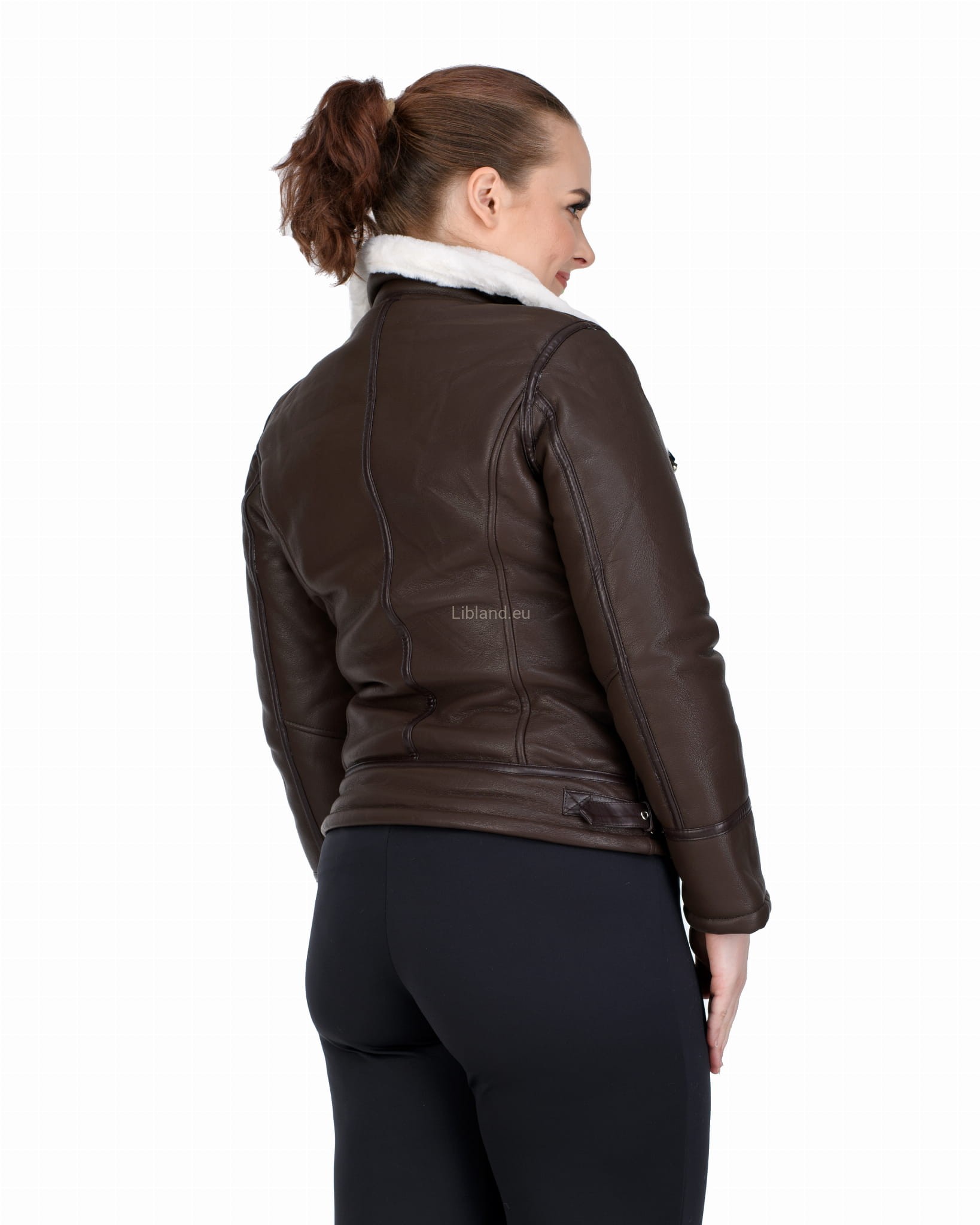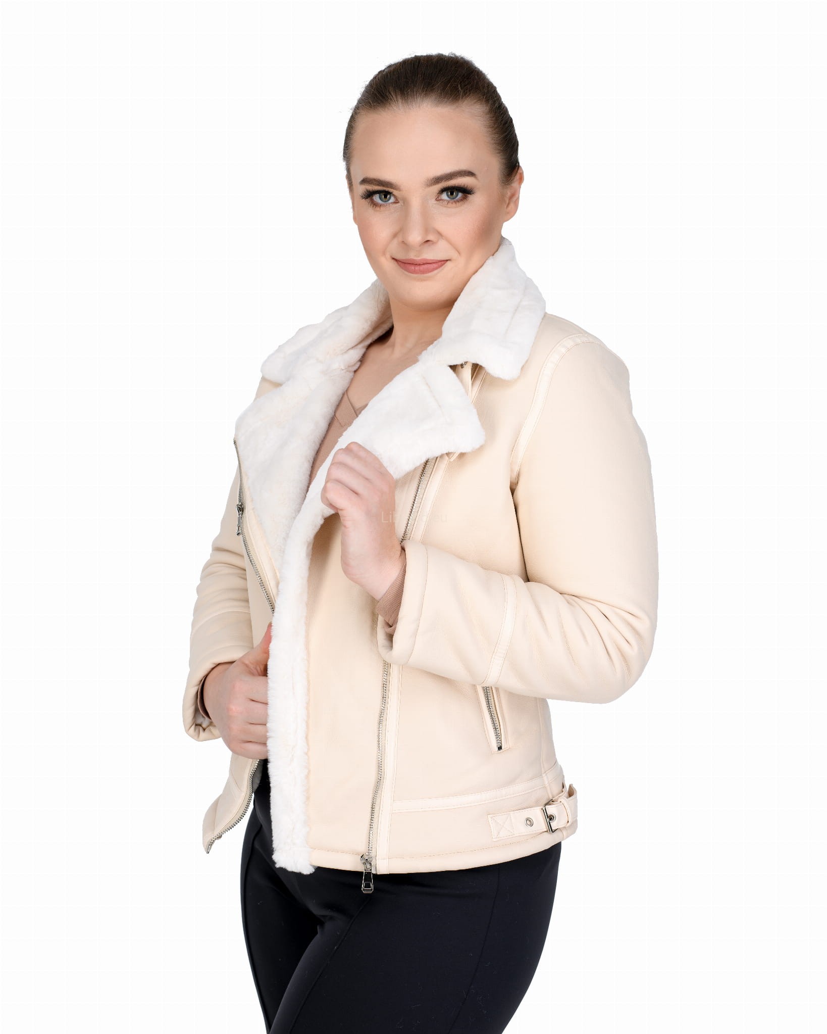 Krótki damski kożuszek z wykładanym futrzanym kołnierzem i błyszczącymi suwakami.