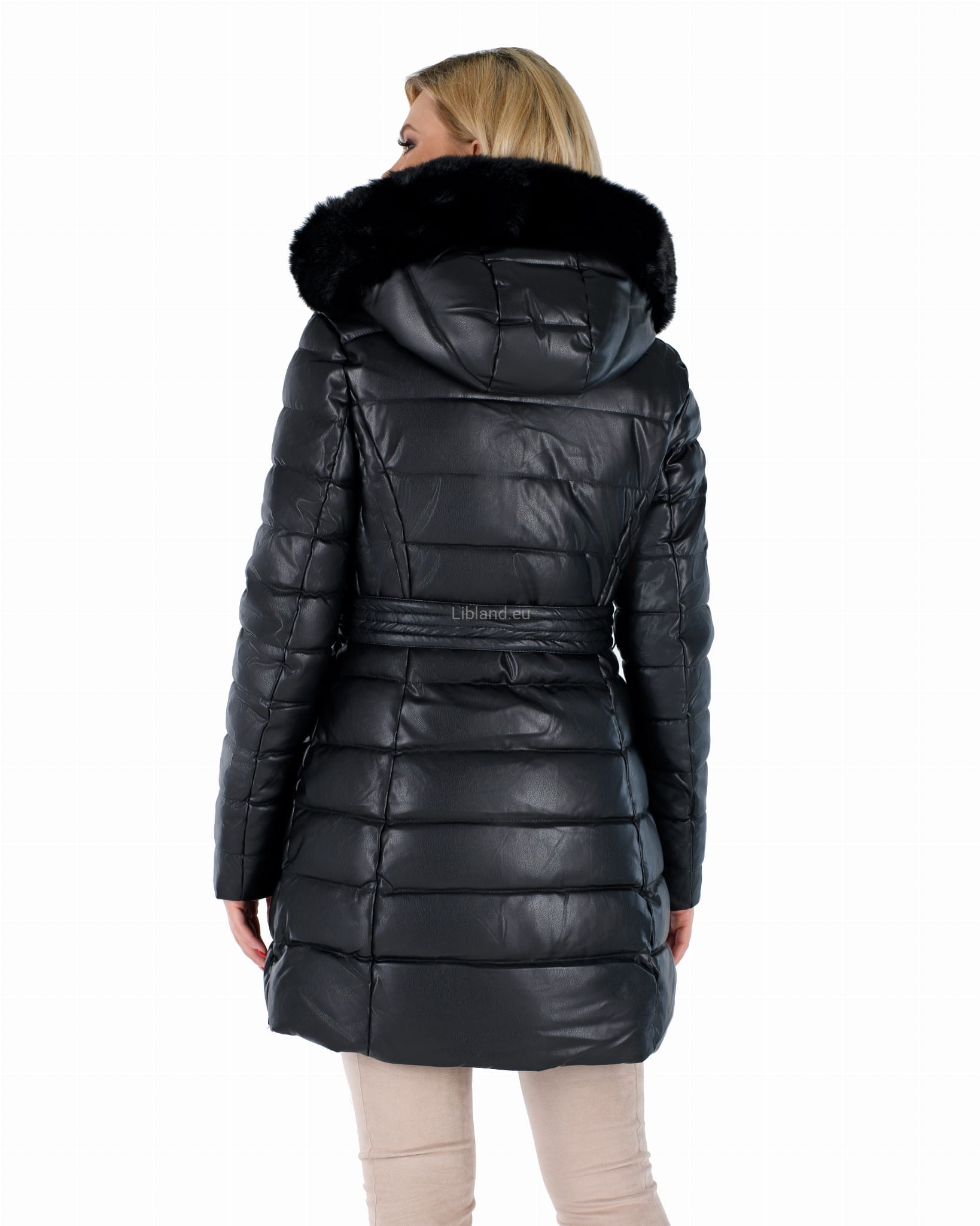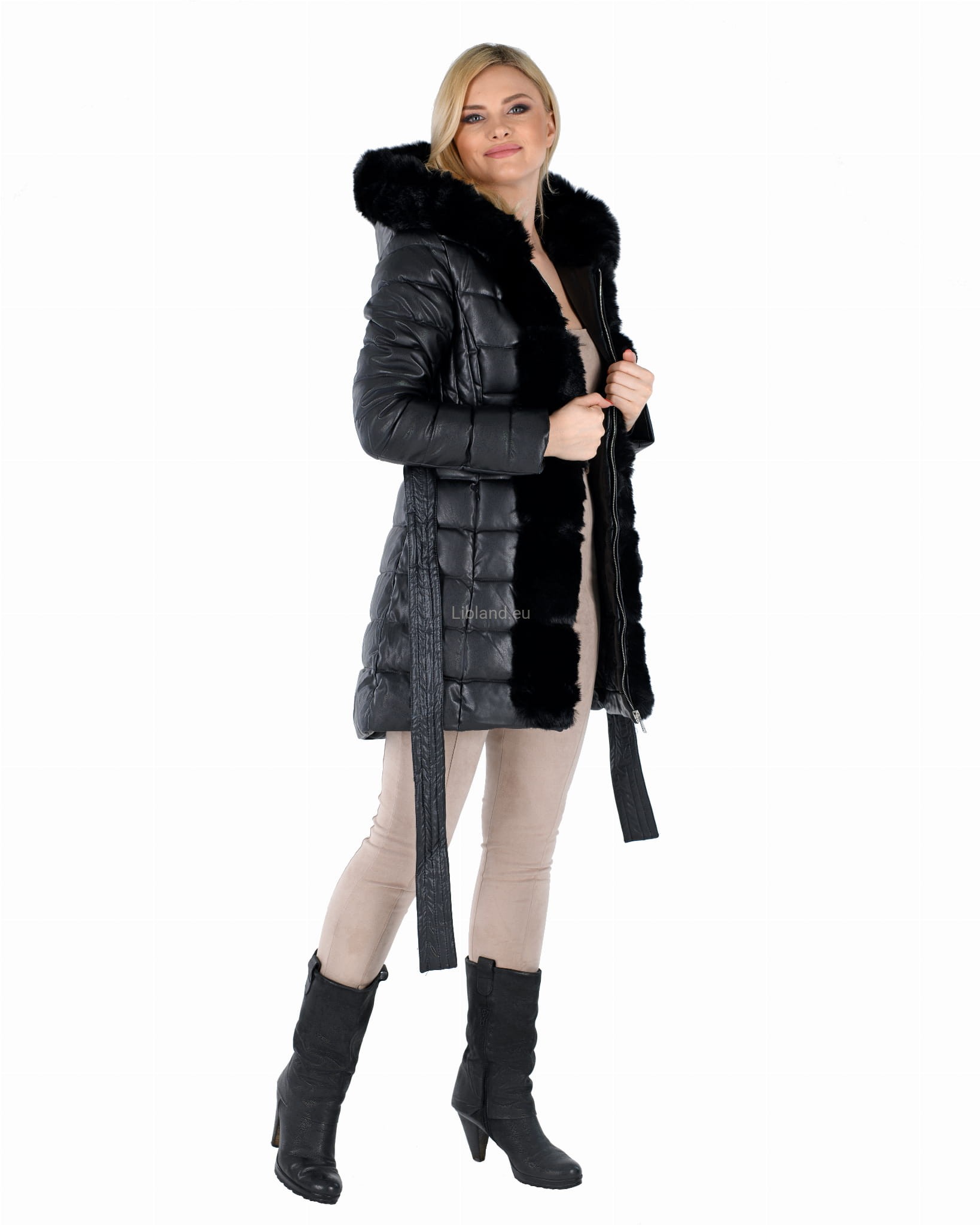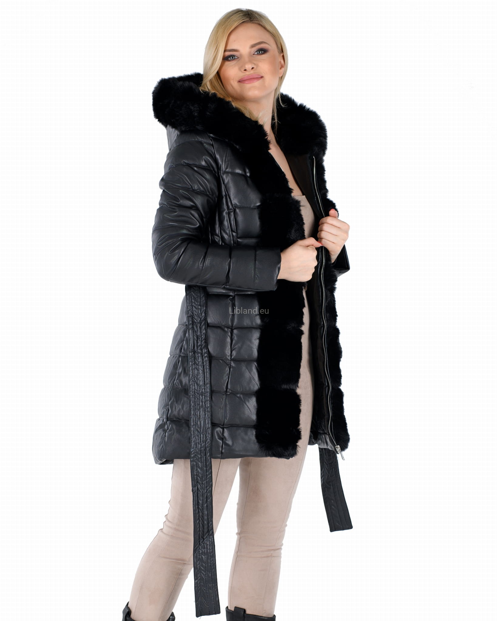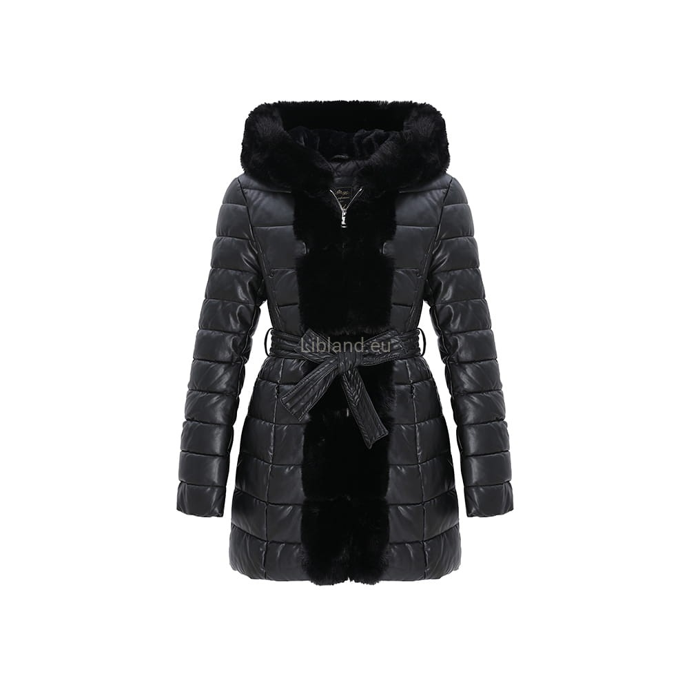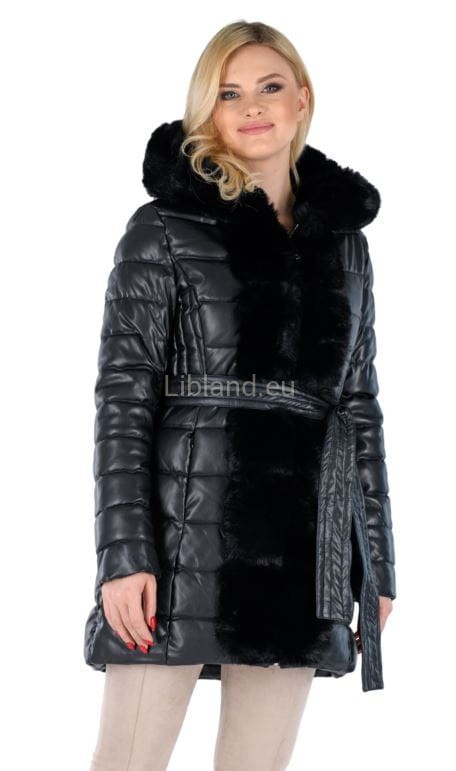 Zimowa, pikowana kurtka damska z eko-skóry z futrzanym kapturem i futerkiem na przodzie.