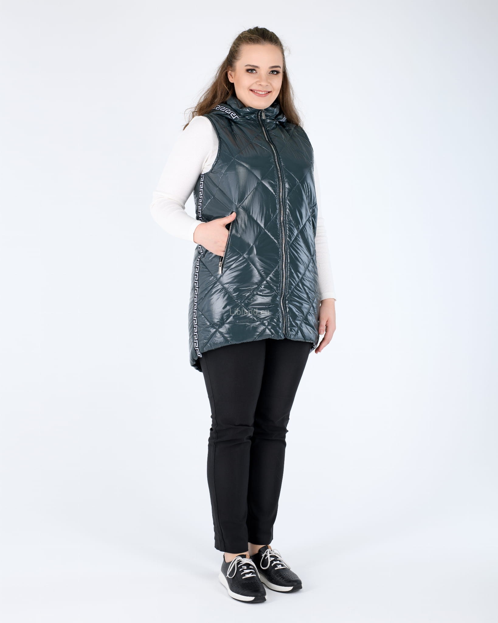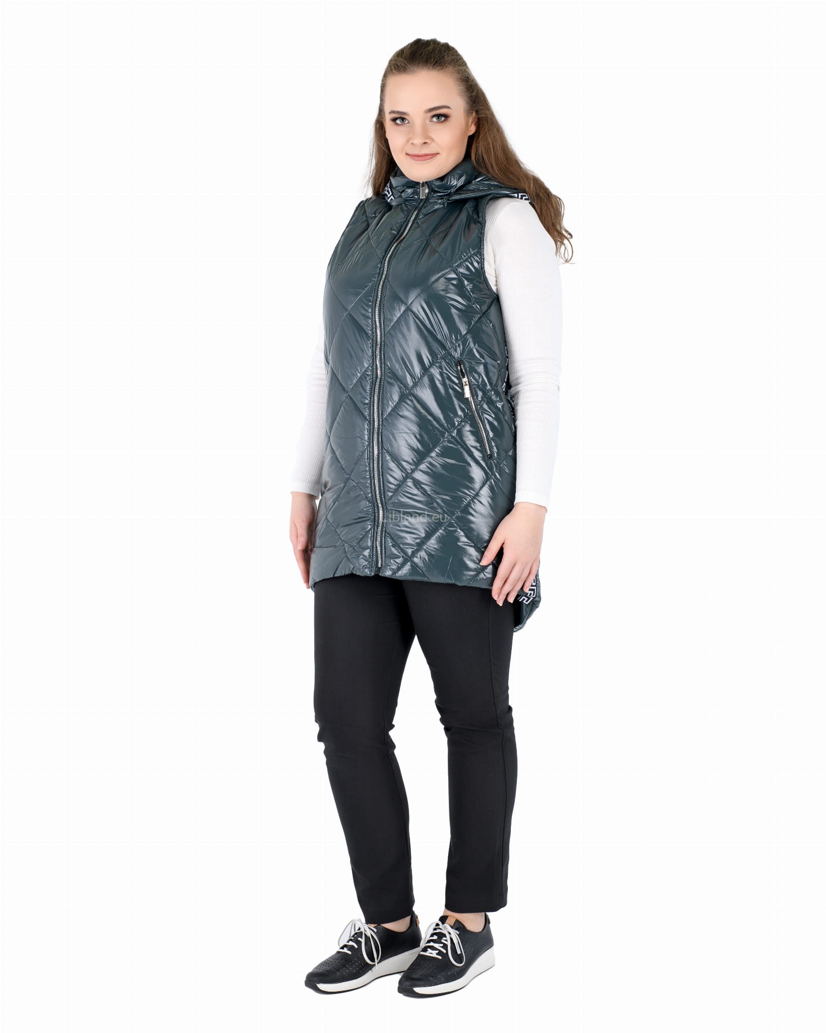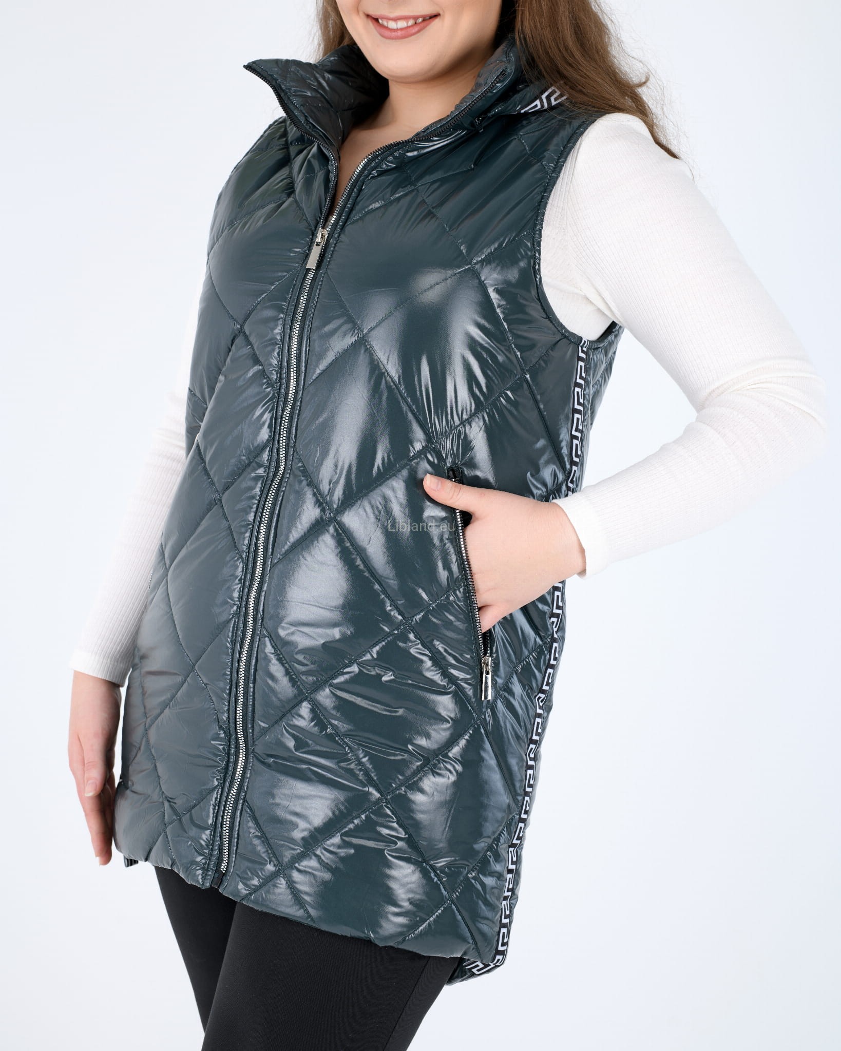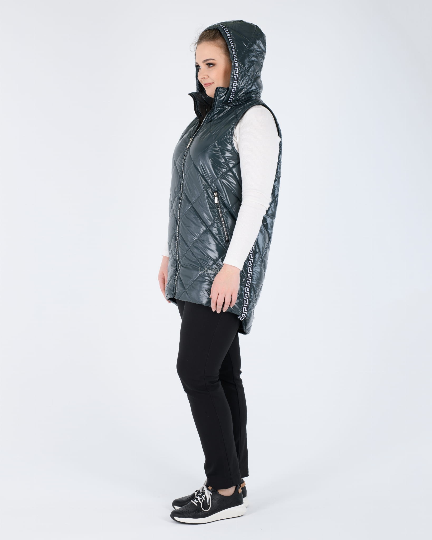 Damska kamizelka pikowany bezrękawnik z błyszczącej tkaniny z metalowym suwakiem i odpinanym kapturem.