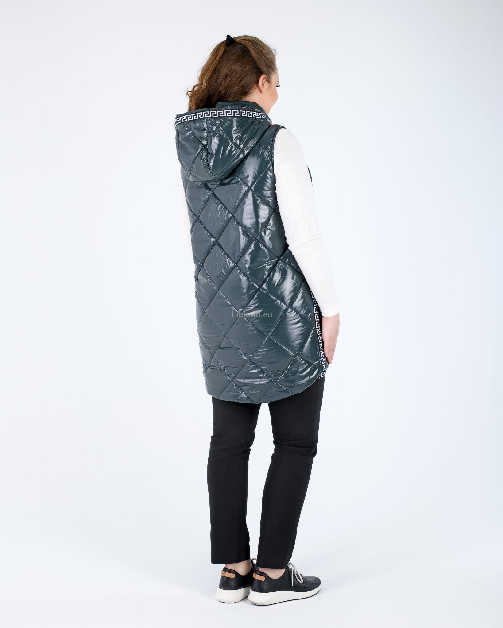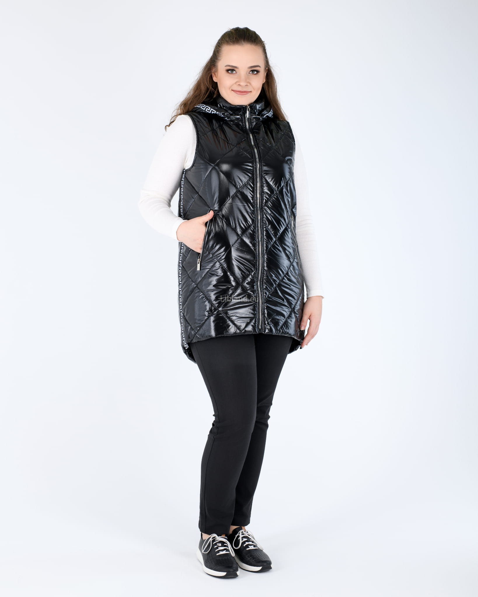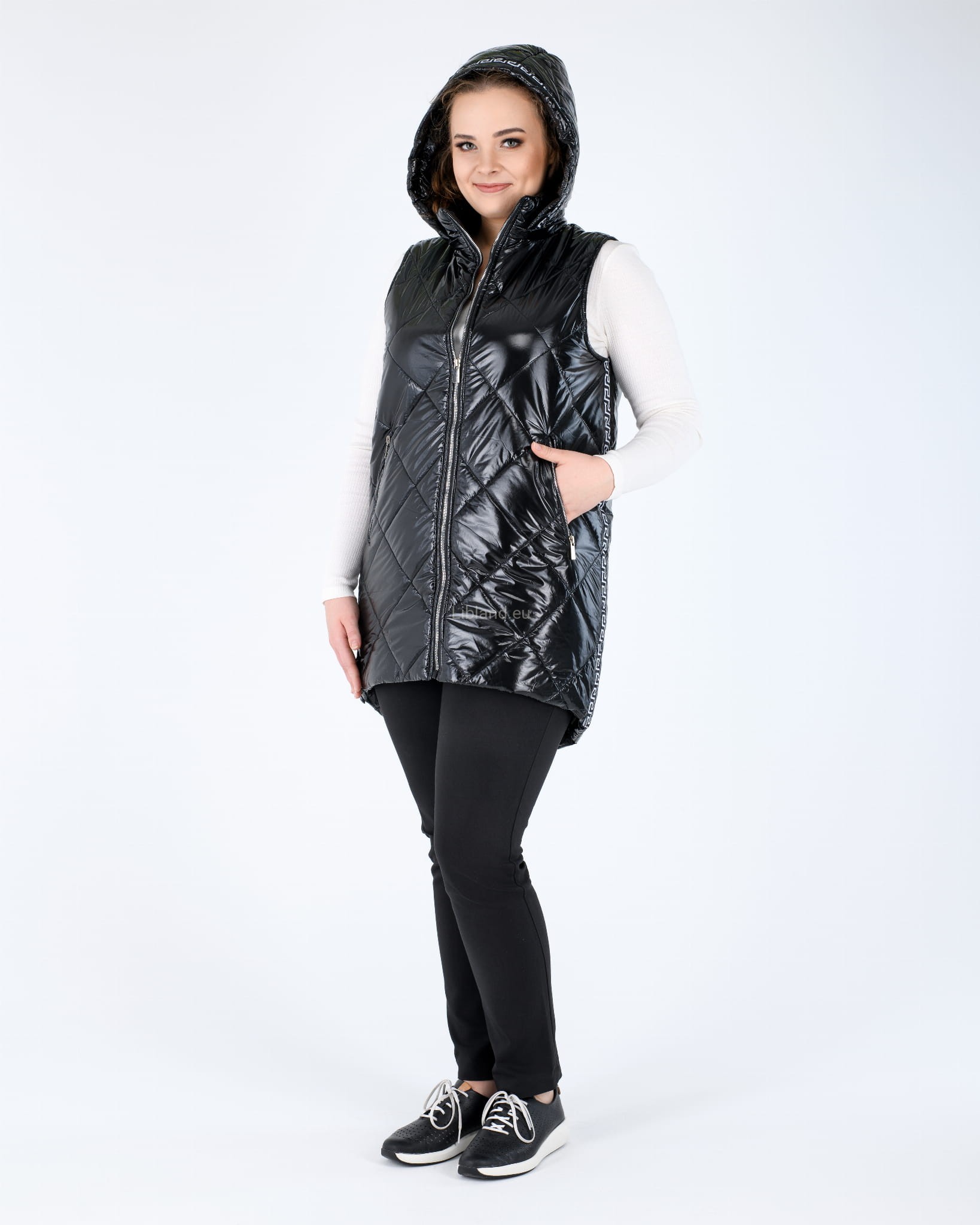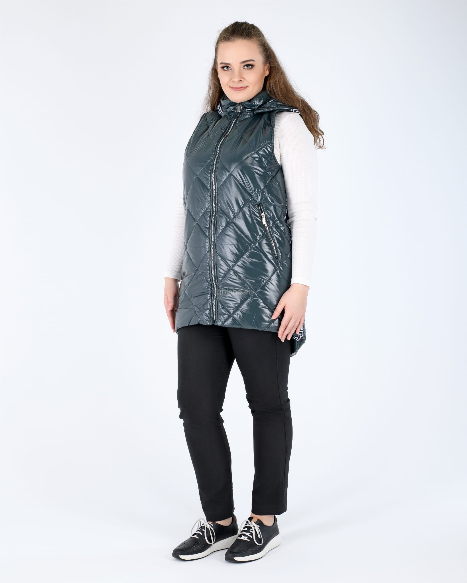 Damska kamizelka pikowany bezrękawnik z błyszczącej tkaniny z metalowym suwakiem i odpinanym kapturem.