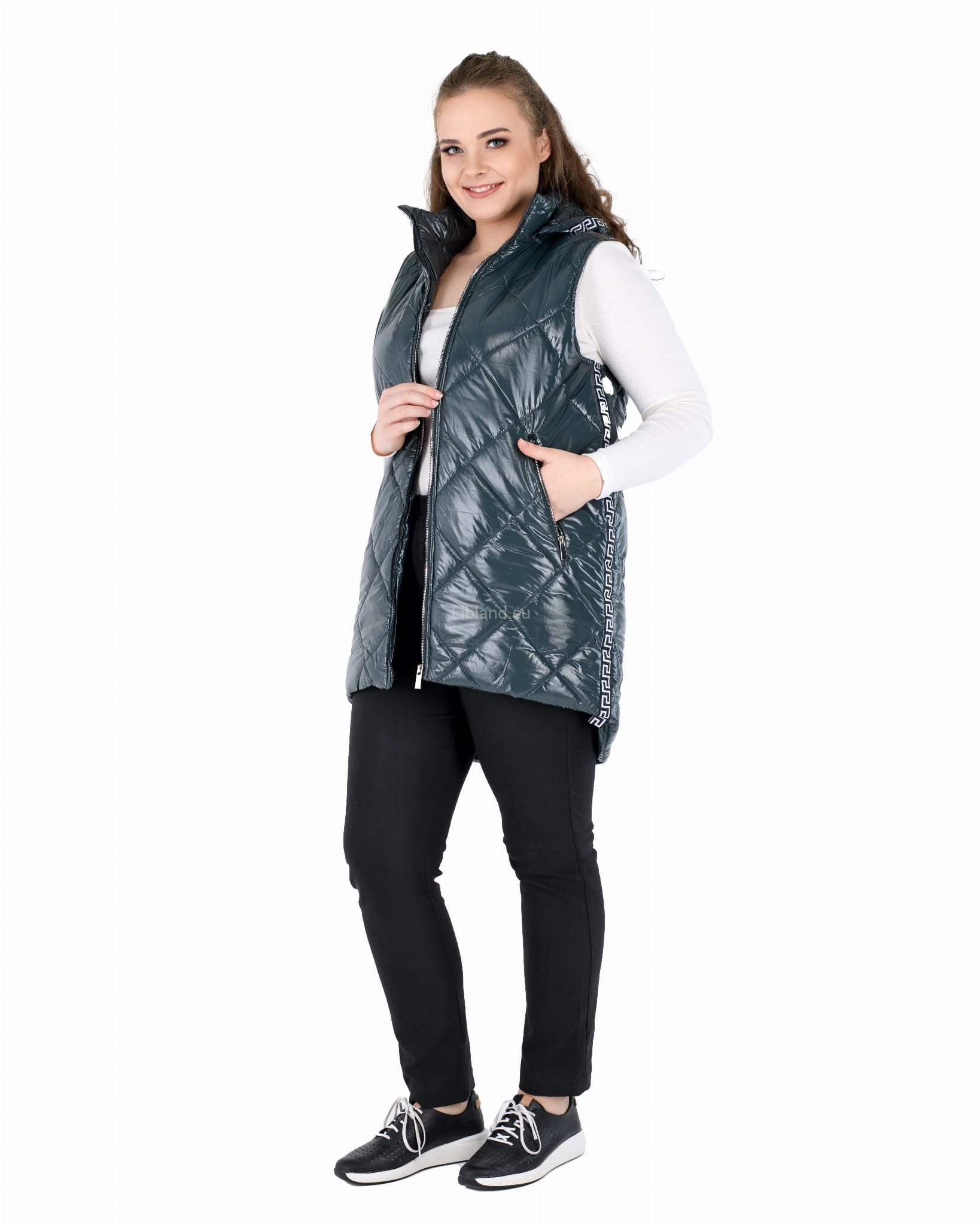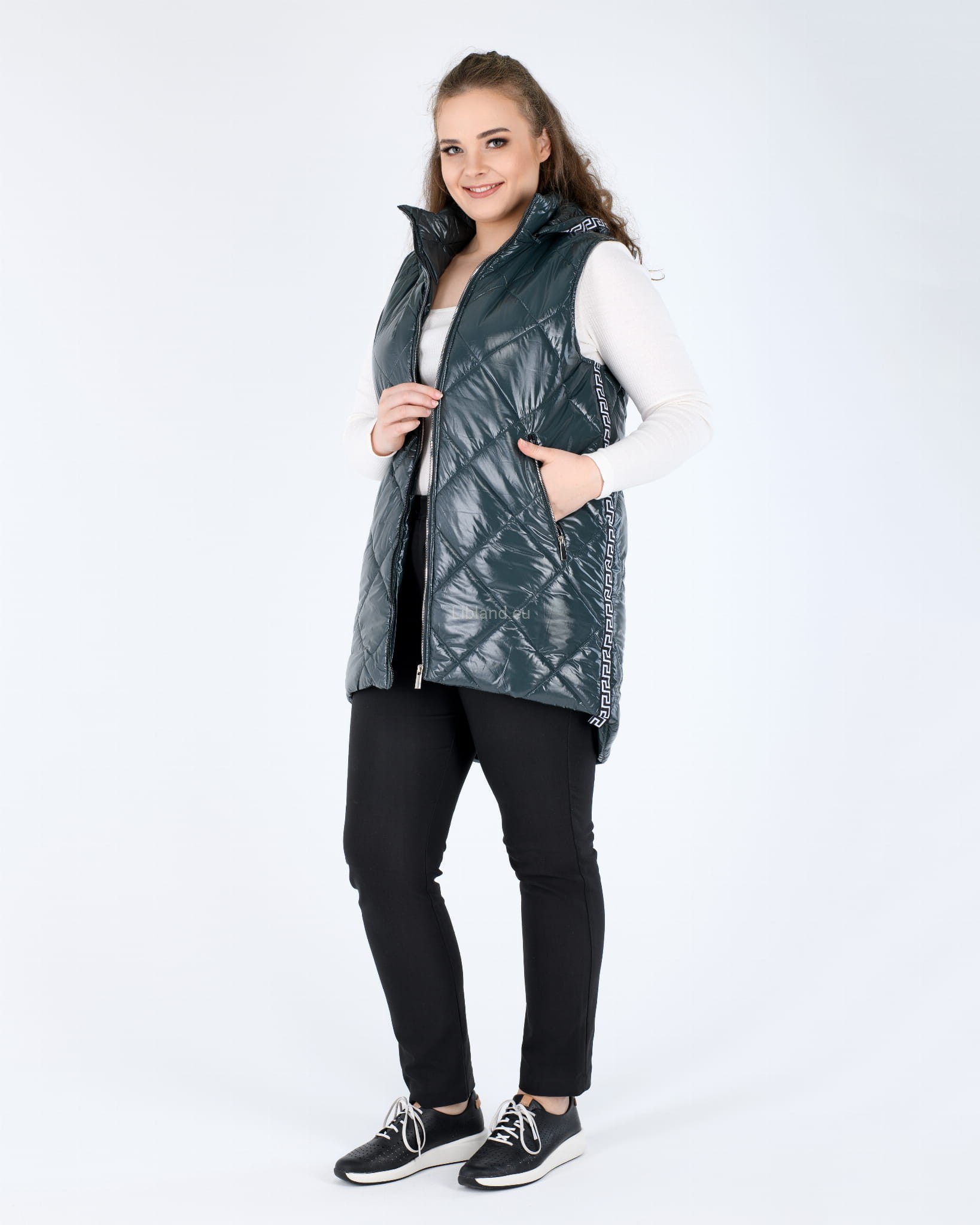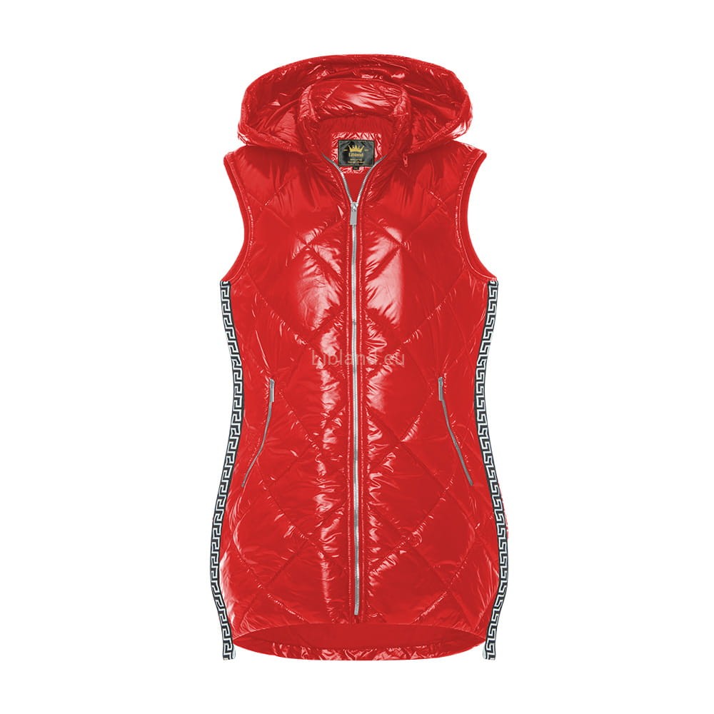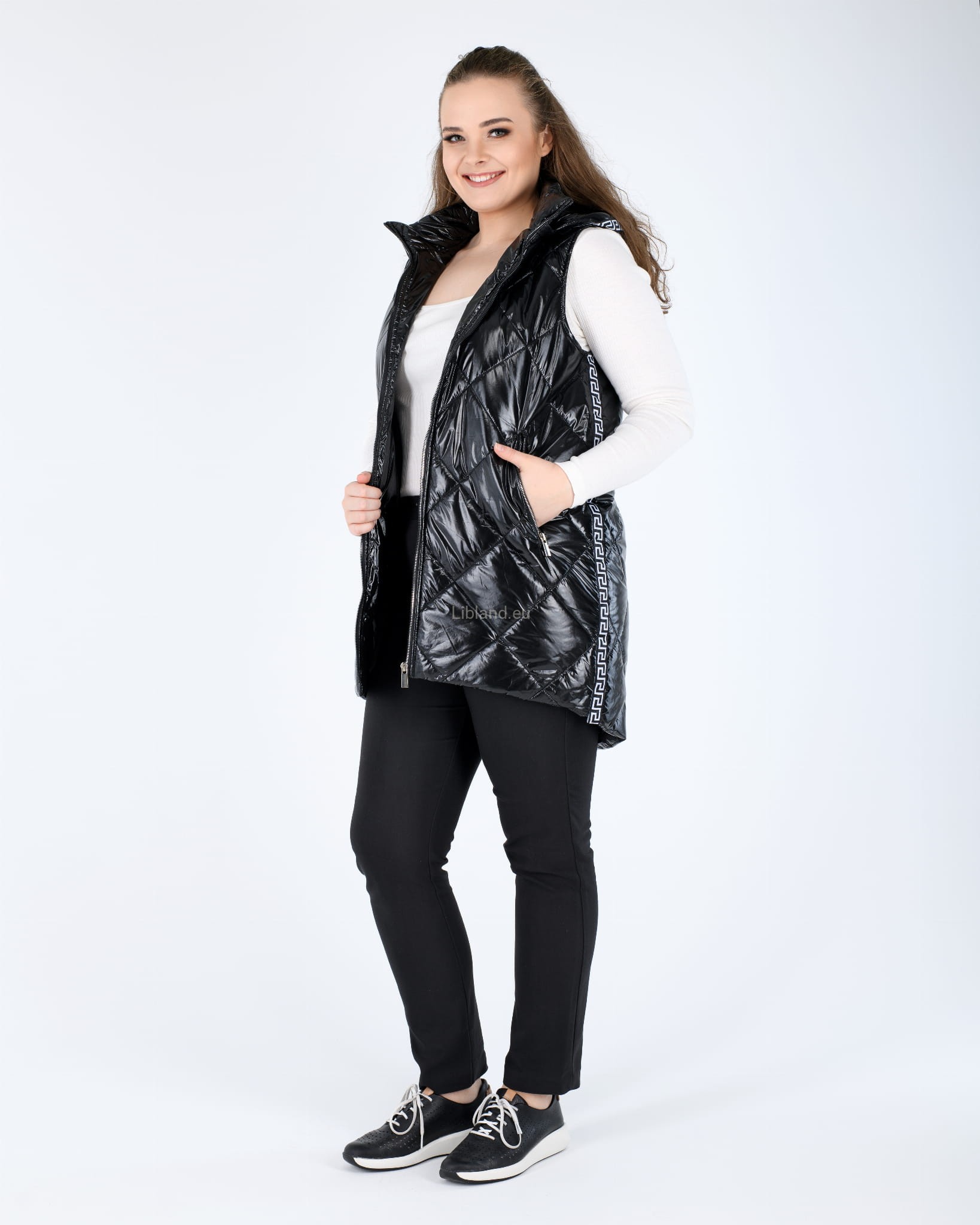 Damska kamizelka pikowany bezrękawnik z błyszczącej tkaniny z metalowym suwakiem i odpinanym kapturem.