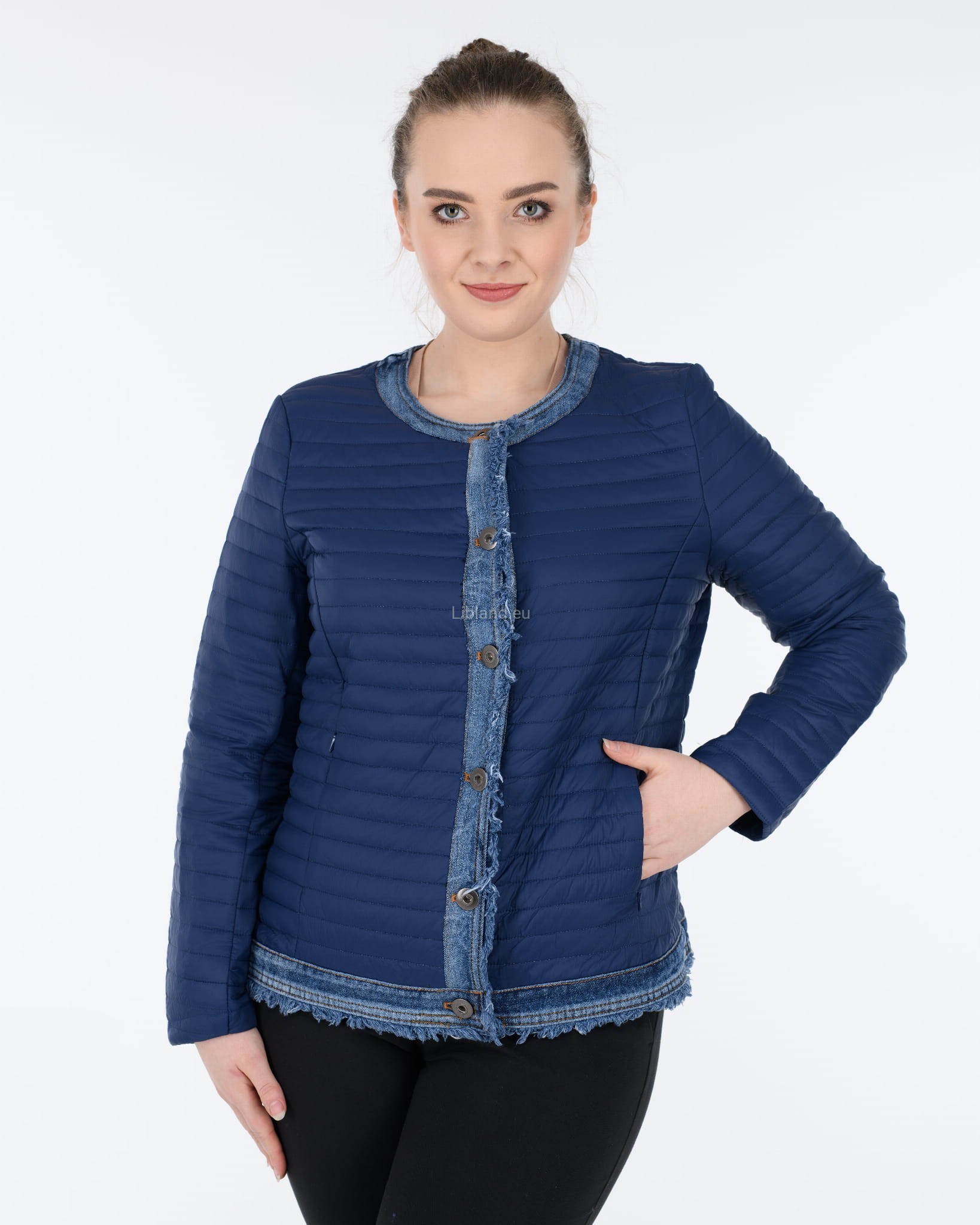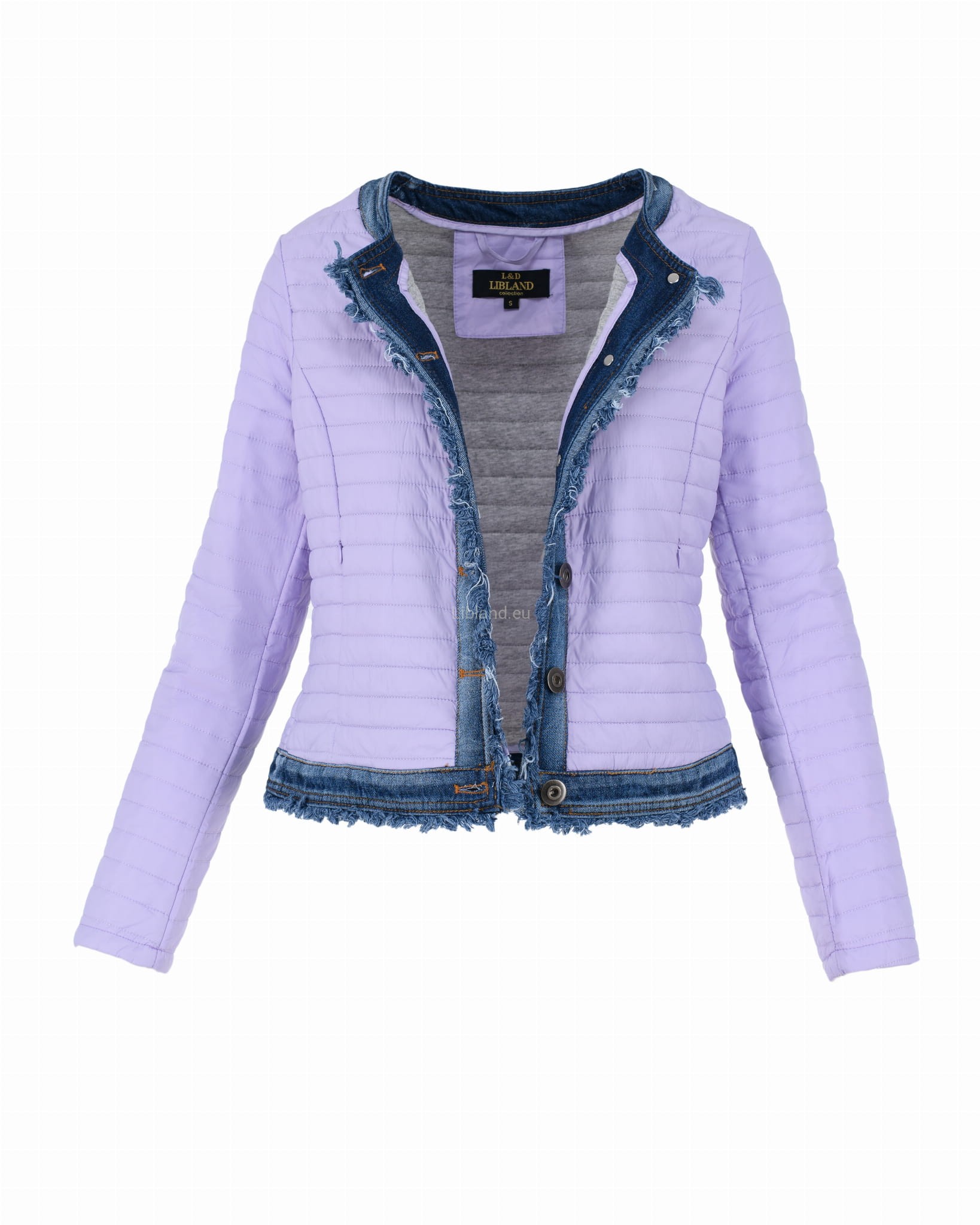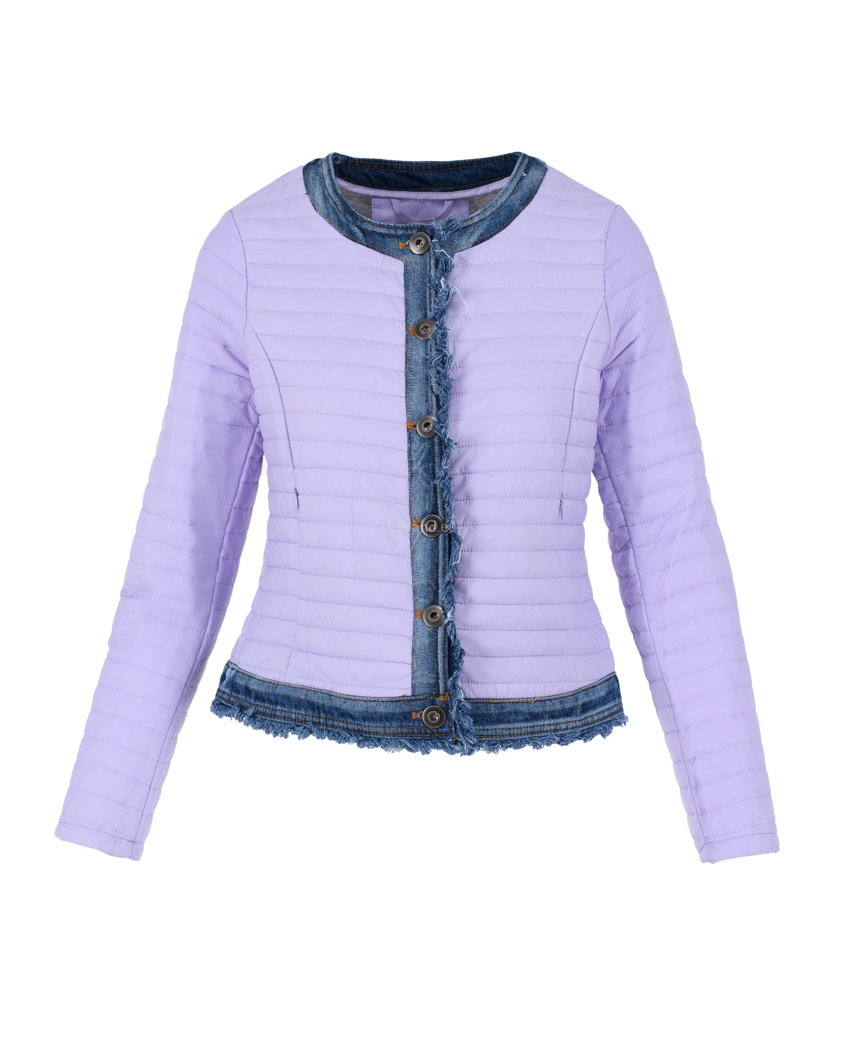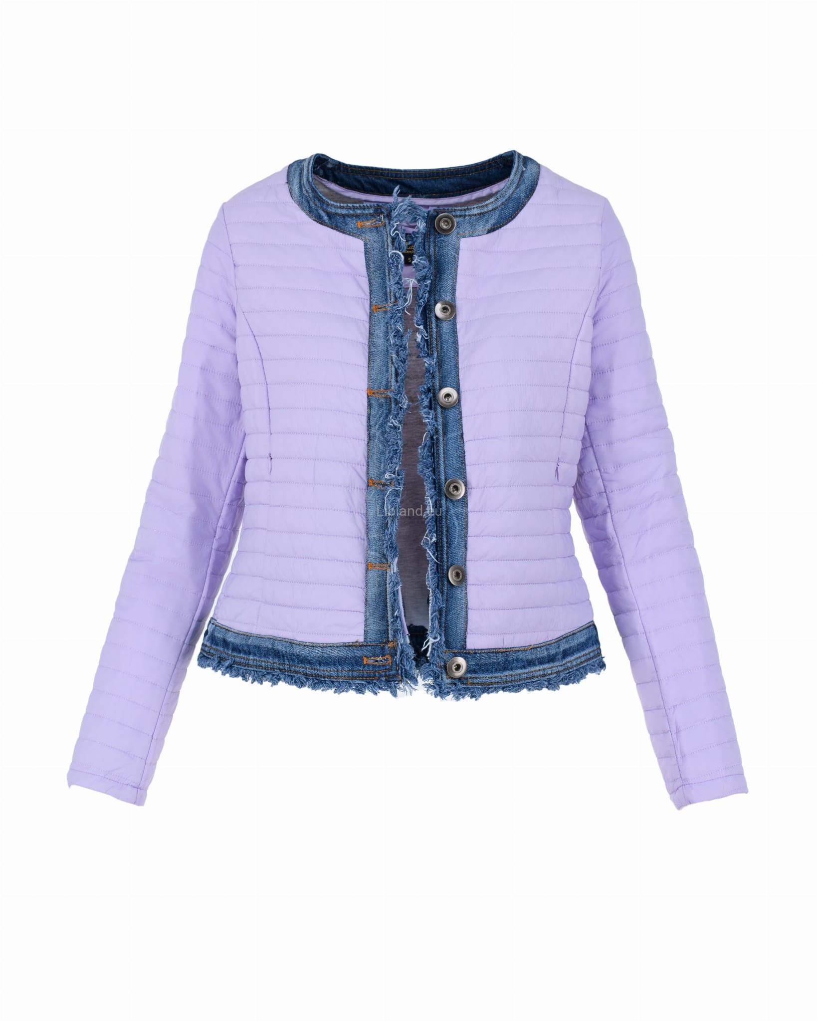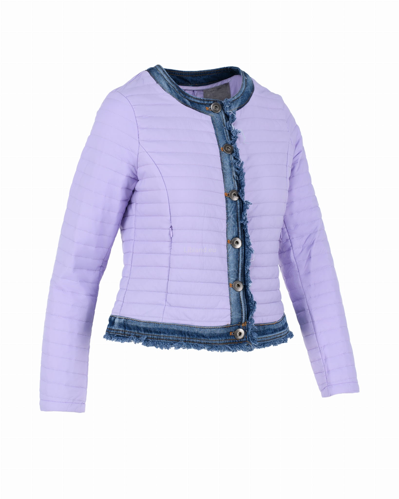 Krótka kurtka pikowana z wykończeniem w kolorze jeansu zapinana na metalowe guziki.