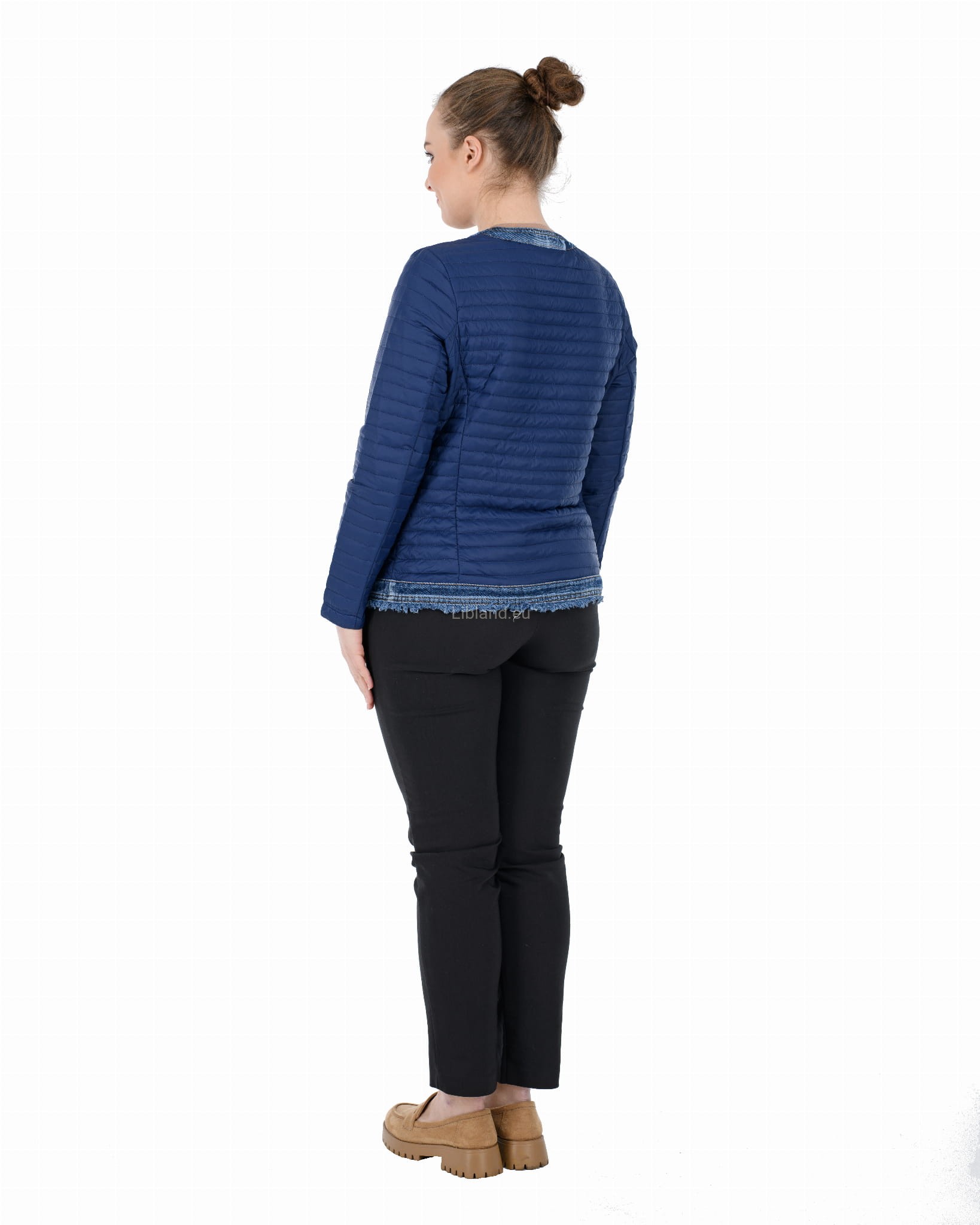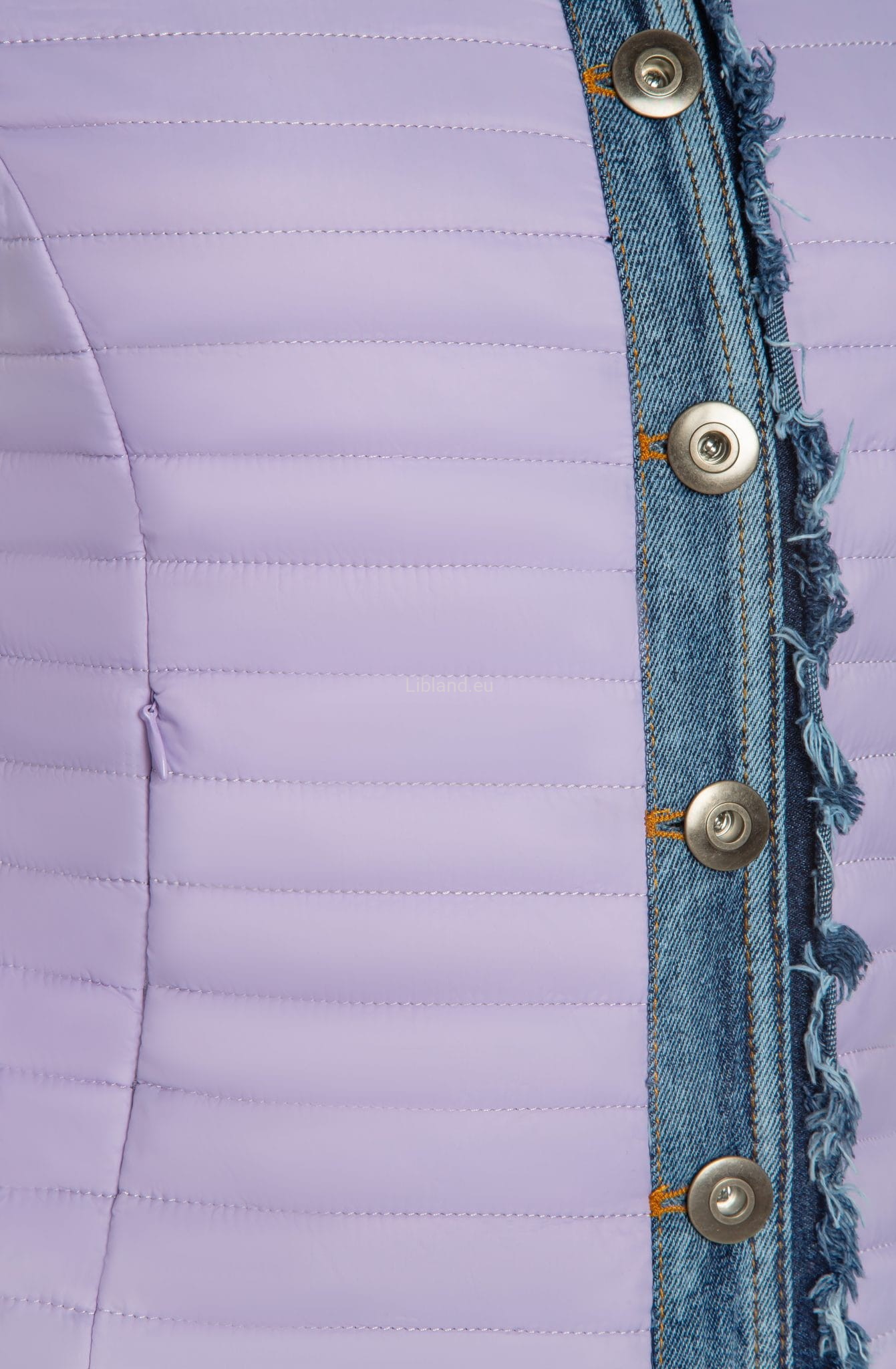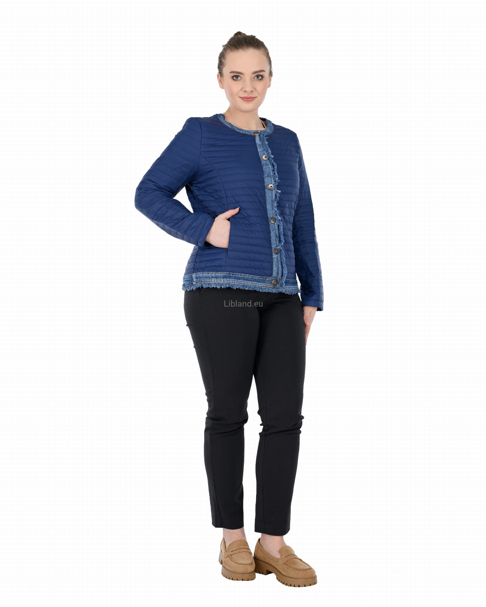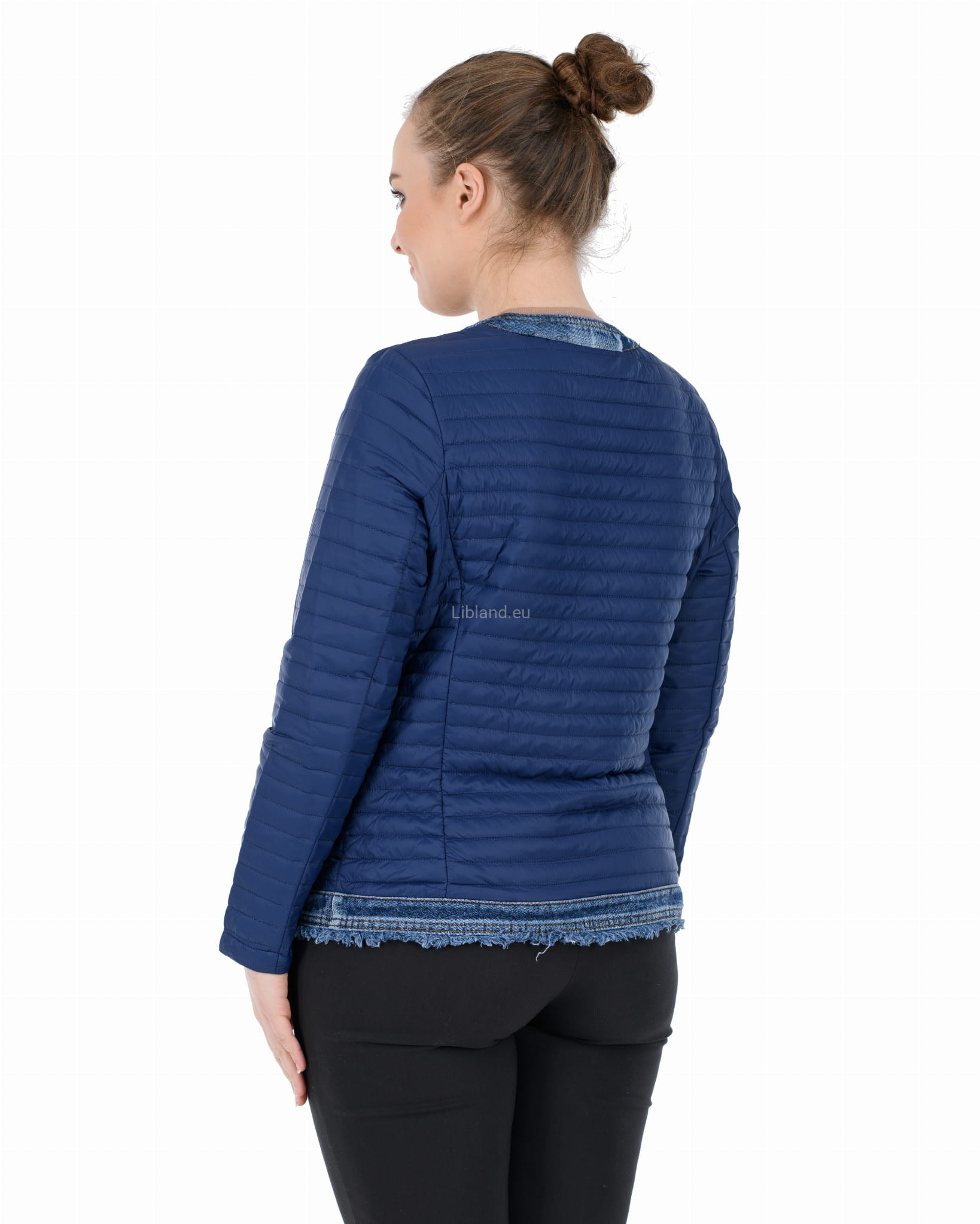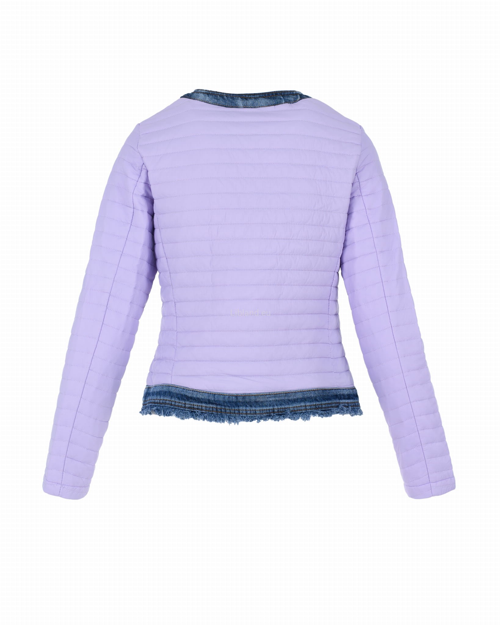 Krótka kurtka pikowana z wykończeniem w kolorze jeansu zapinana na metalowe guziki.