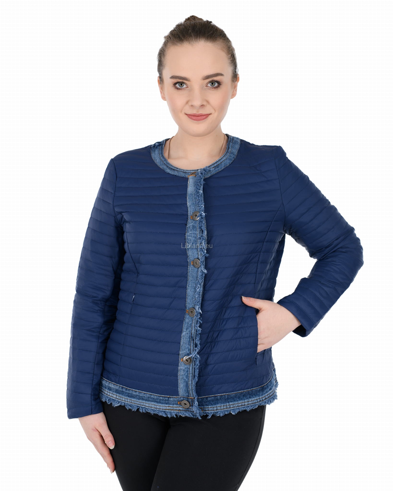 Krótka damska kurtka pikowana z wykończeniem w kolorze jeansu zapinana na metalowe guziki.