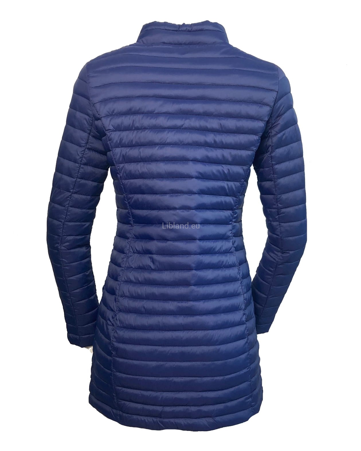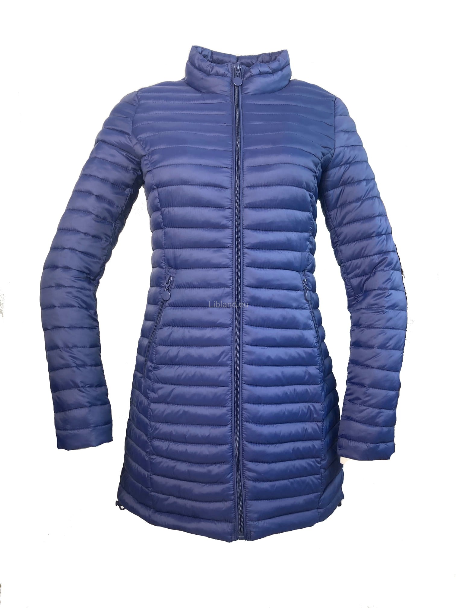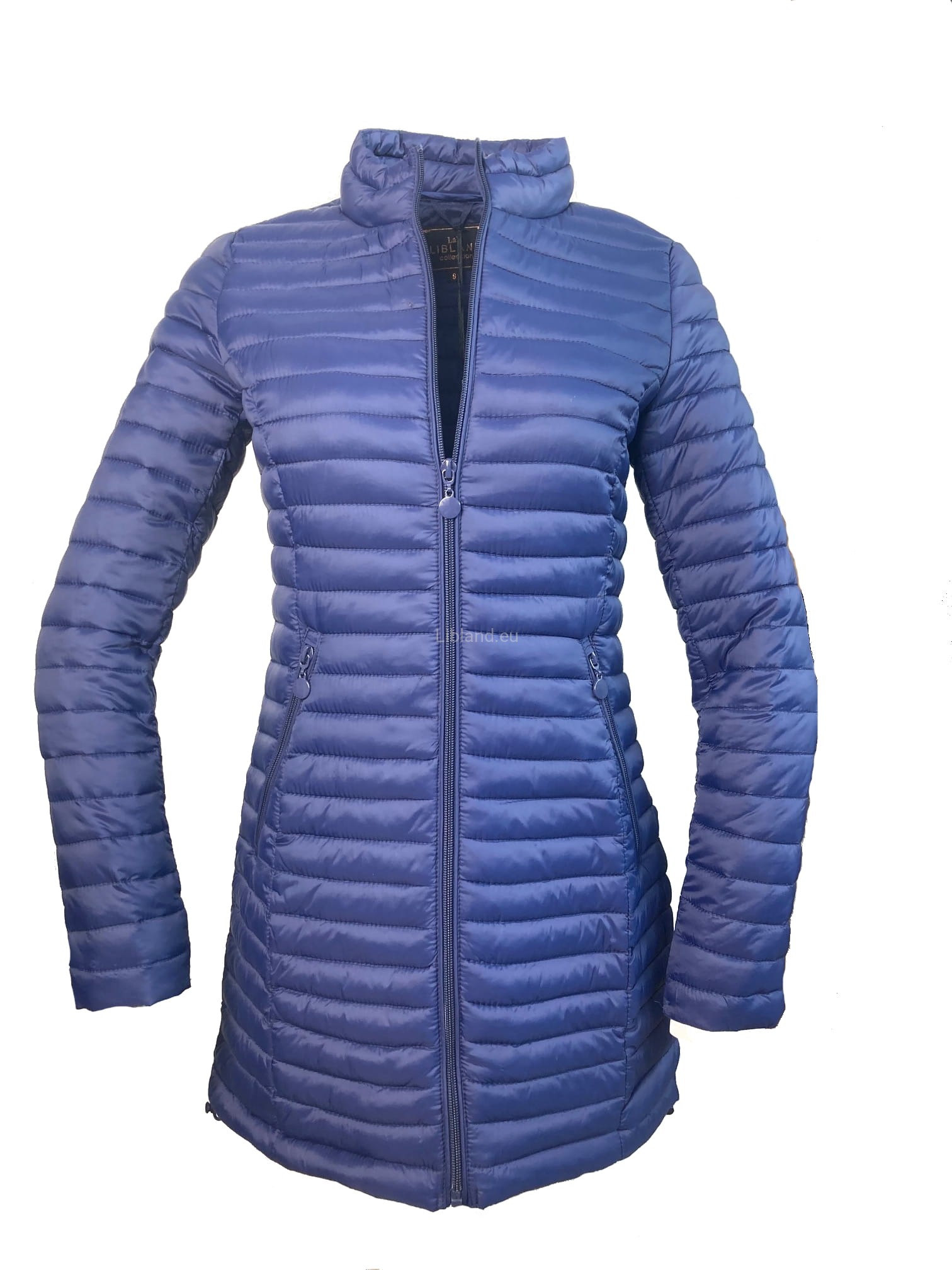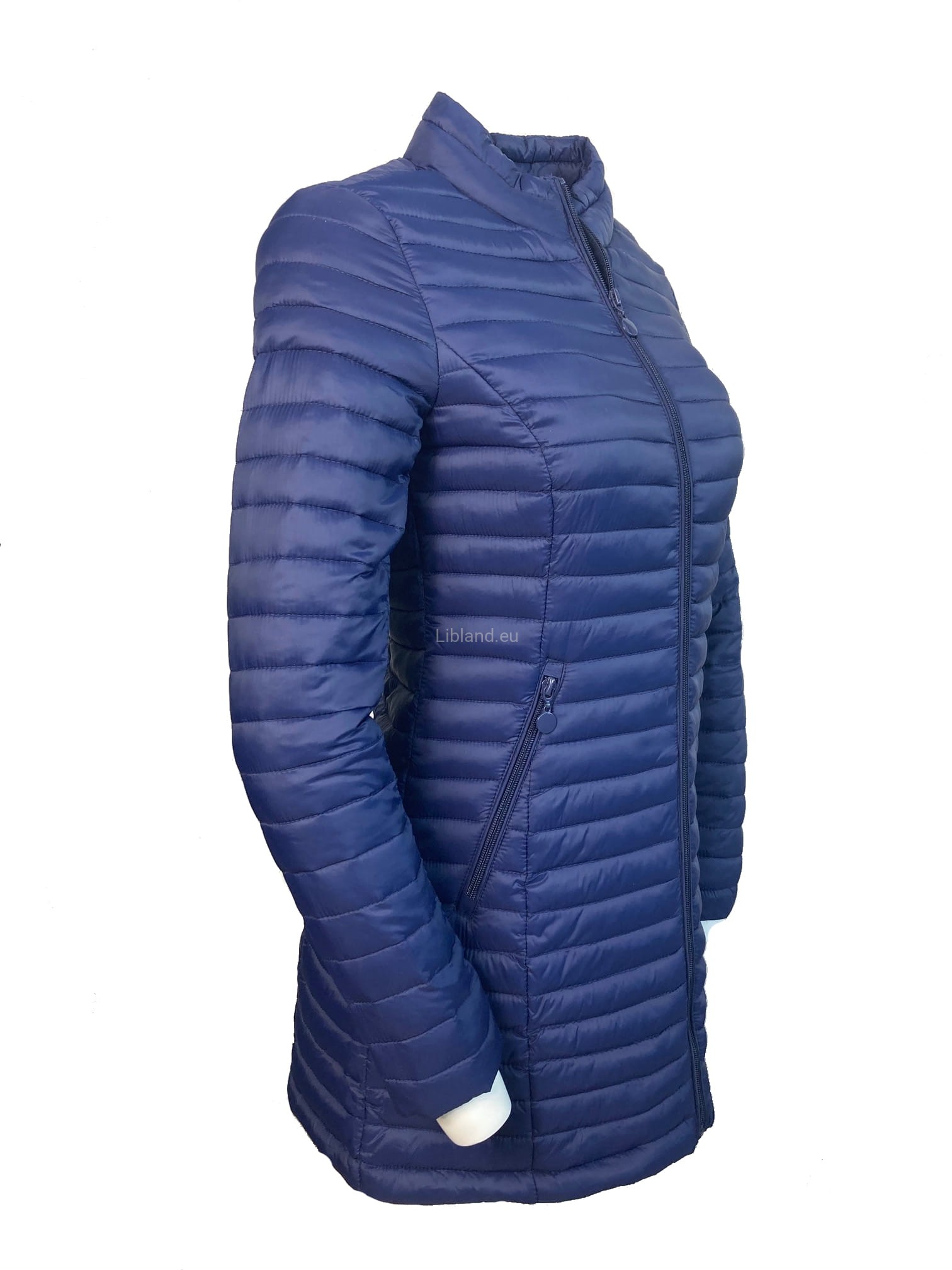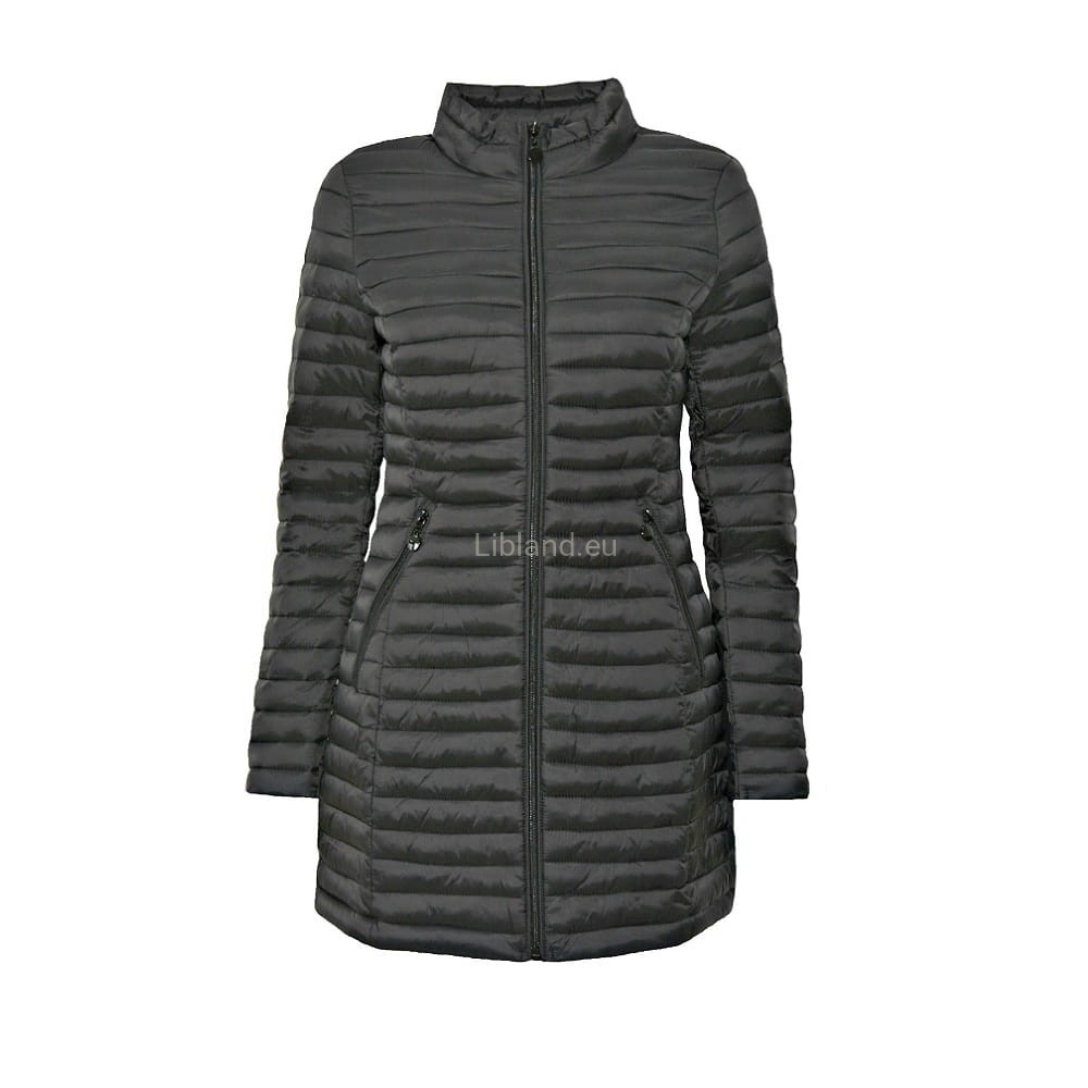 Pikowana, dłuższa kurtka damska ze stójką i krytymi suwakami.