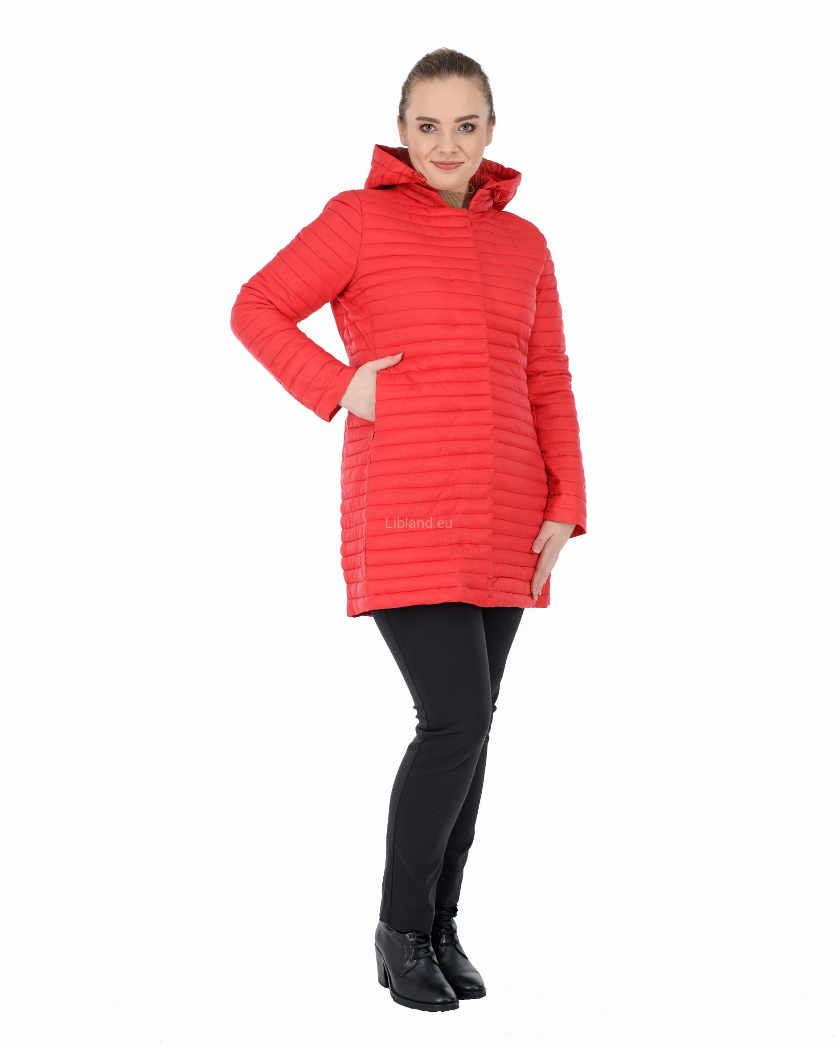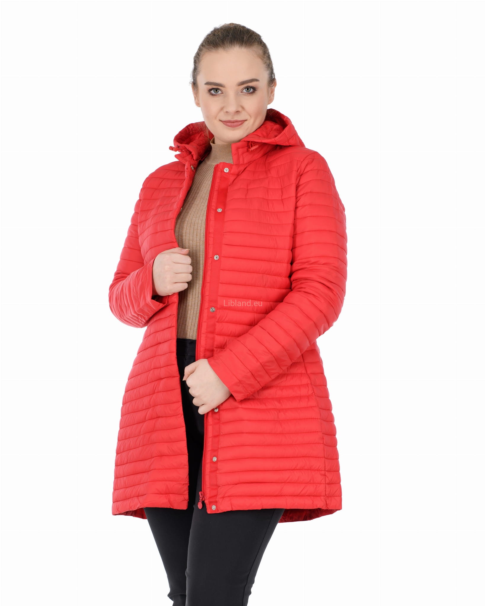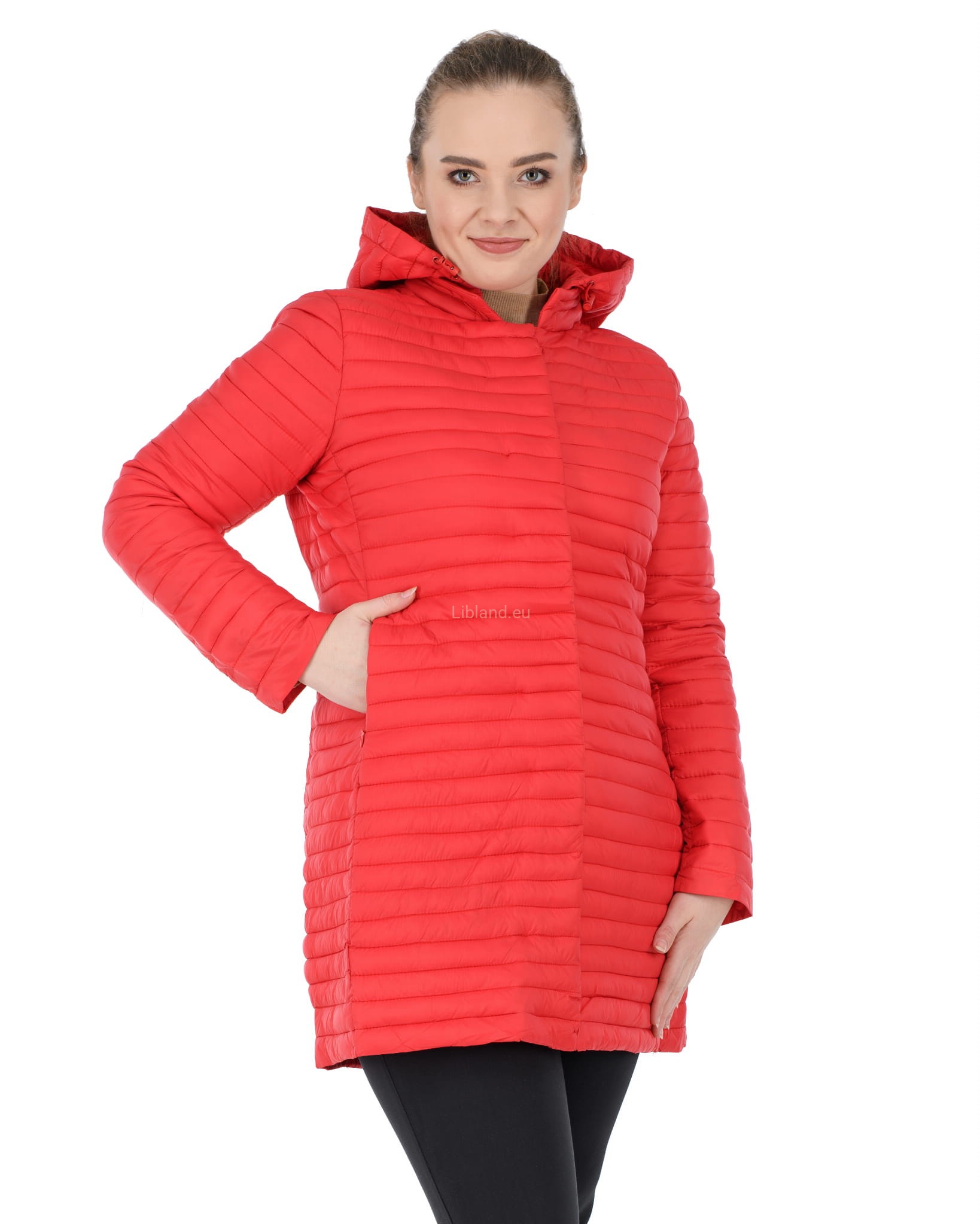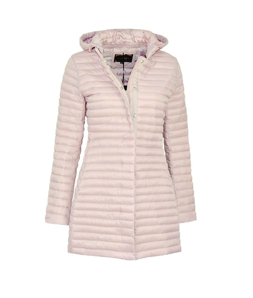 Pikowana w wąskie poziome pasy dłuższa kurtka z kapturem i krytymi suwakami: