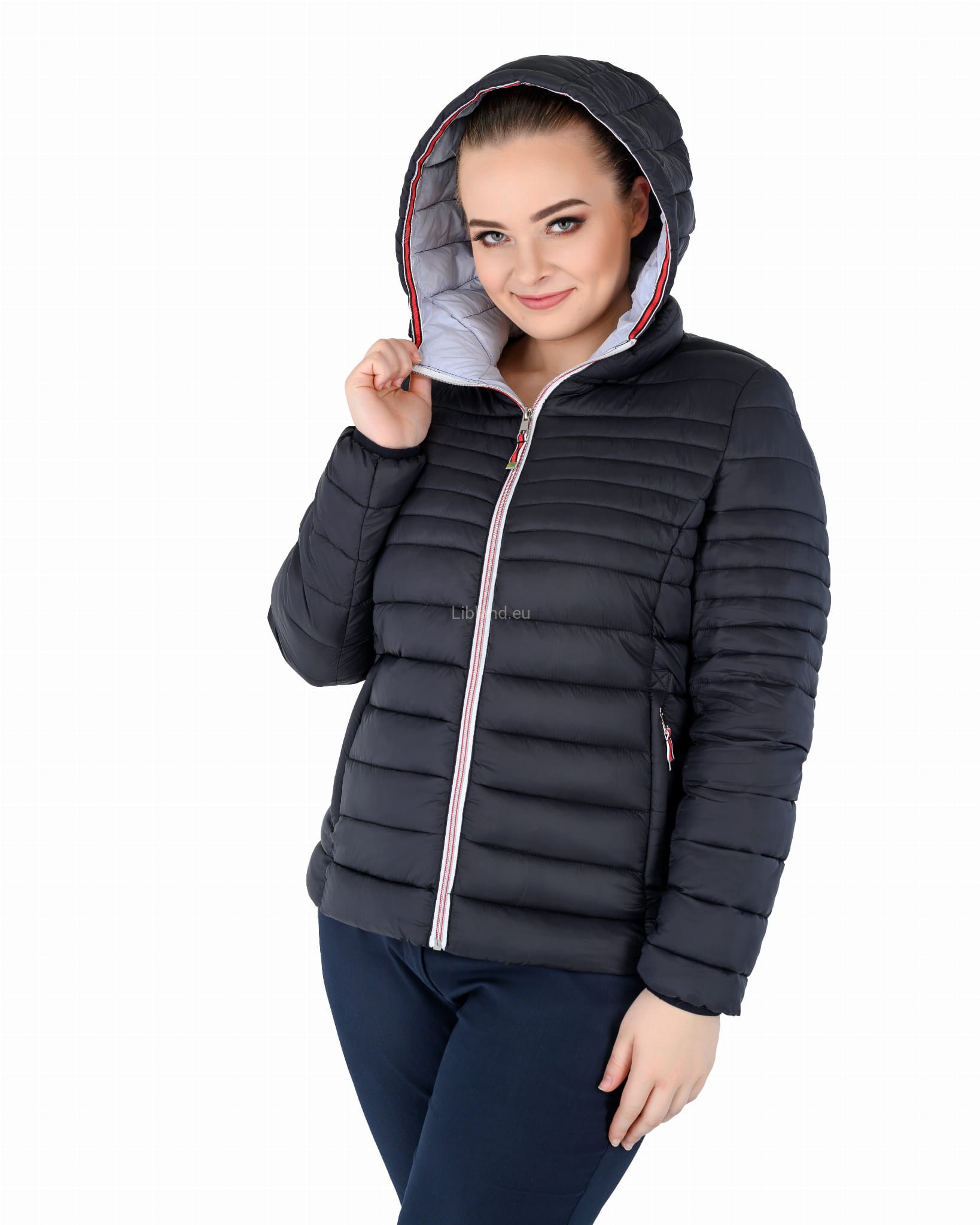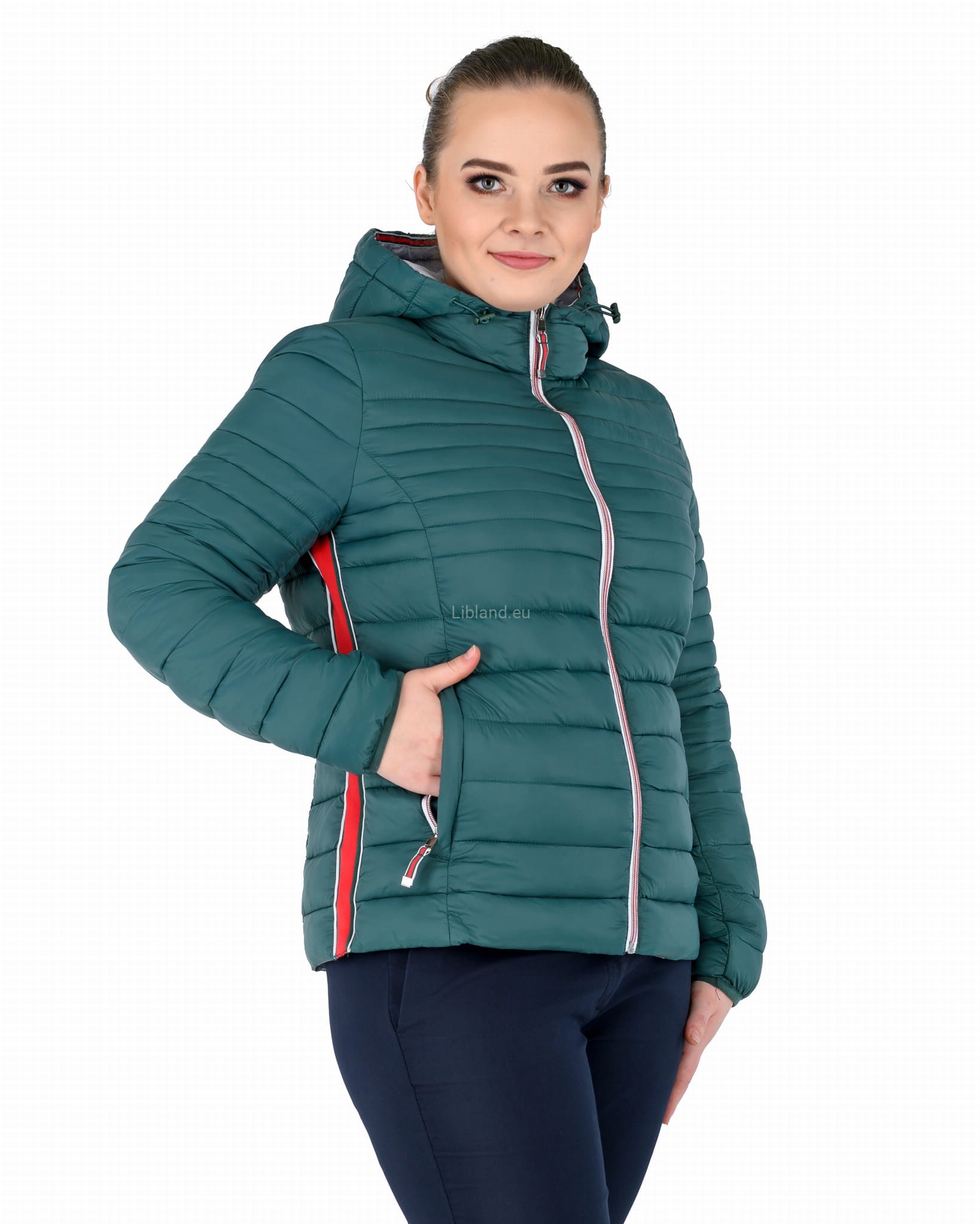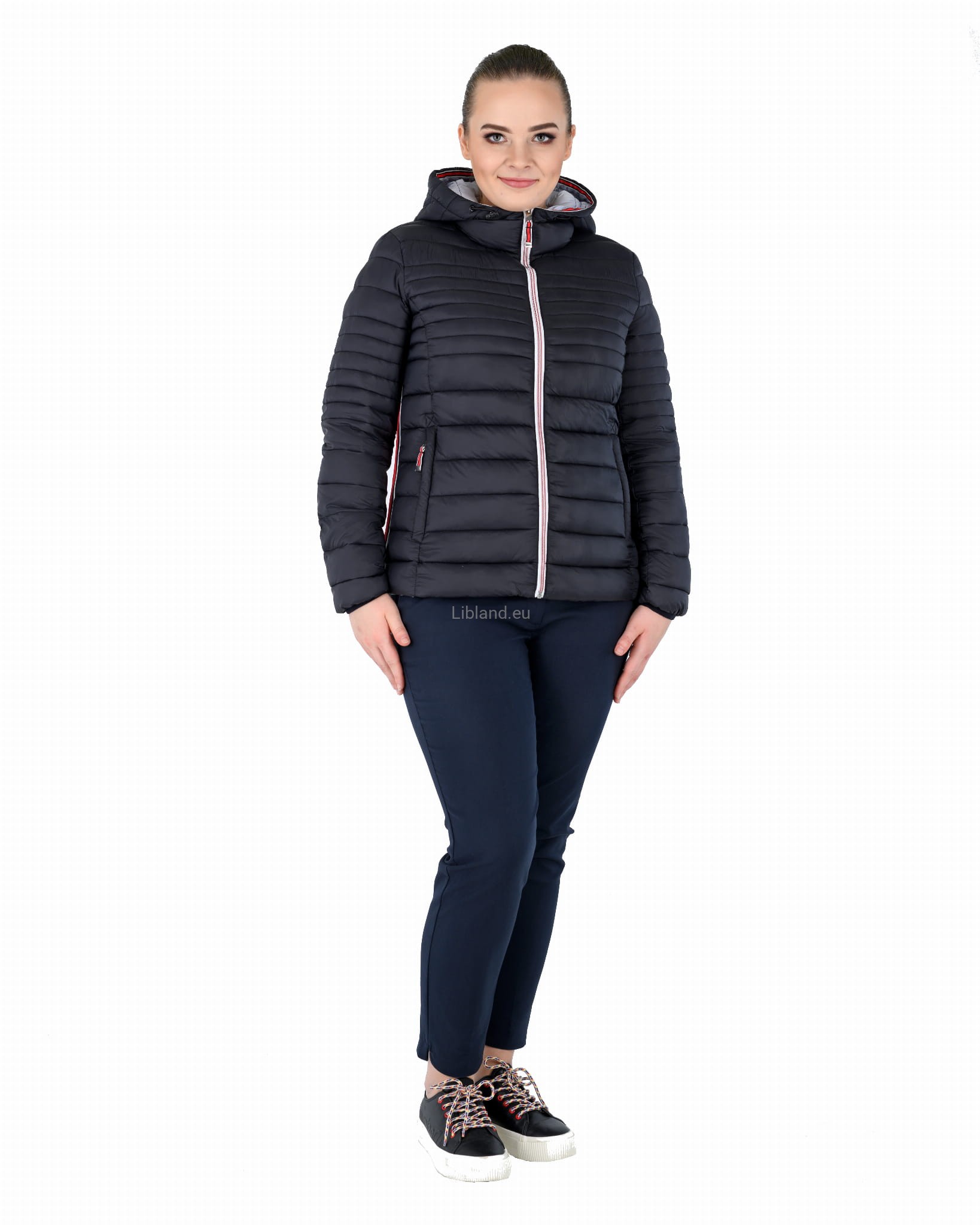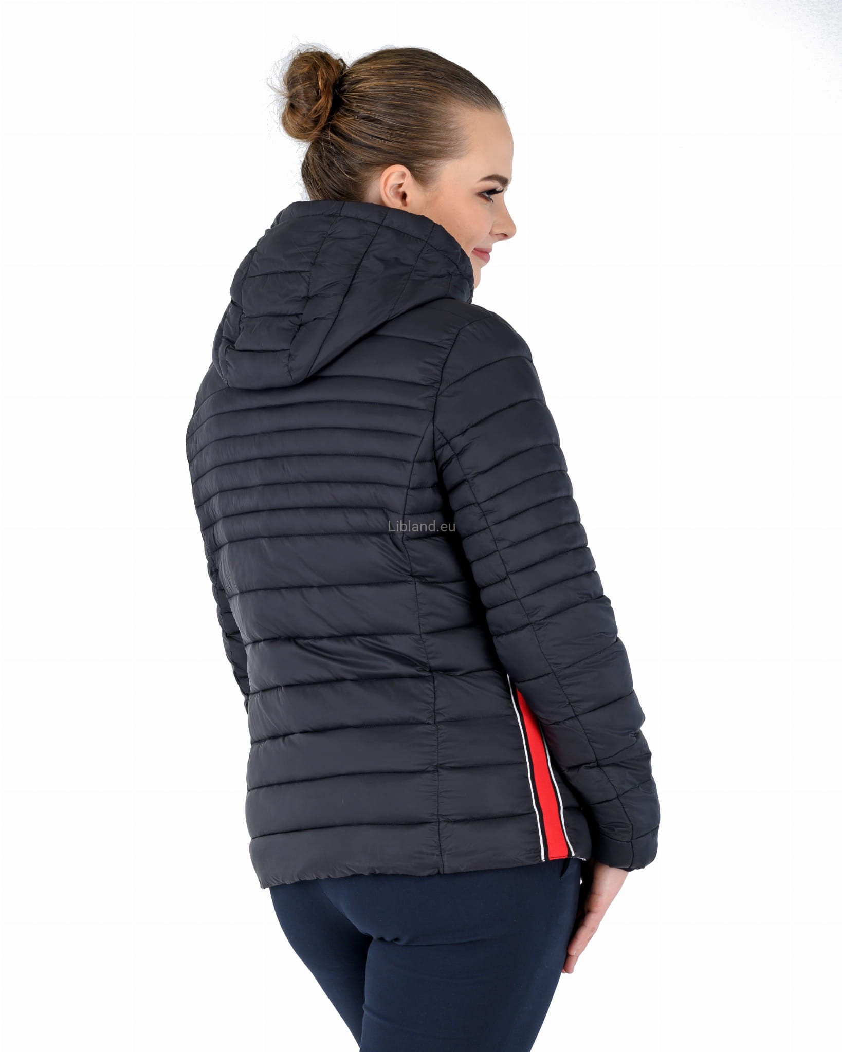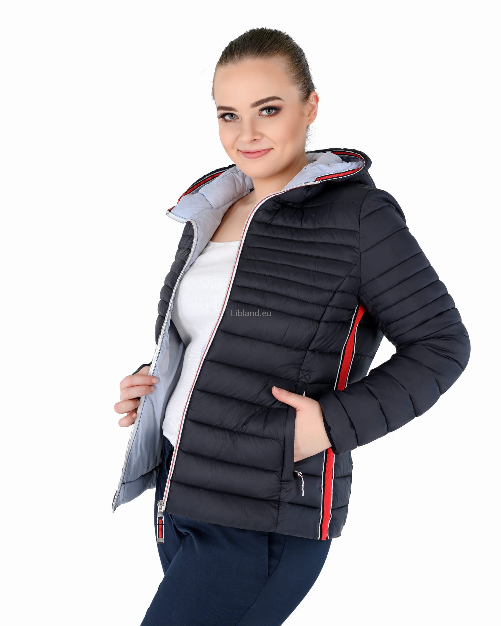 Pikowana kurtka damska z kapturem ze wstawkami z pięknie kontrastującej czerwonej taśmy.